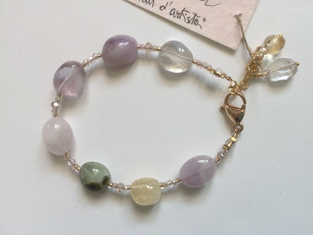 Il bracciale Arc-en-ciel è composto da luminose e trasparenti pietre dure: ametista, prehnite, quarzo rosa, citrino, cristallo di rocca, olivina. L’effetto che ne risulta è particolare ed elegante. Data la sua varietà di colori, si presta con naturalezza a moltissimi abbinamenti. La sua lunghezza è di circa 18 cm, ma una catenina dorata ne permette l’allungo.