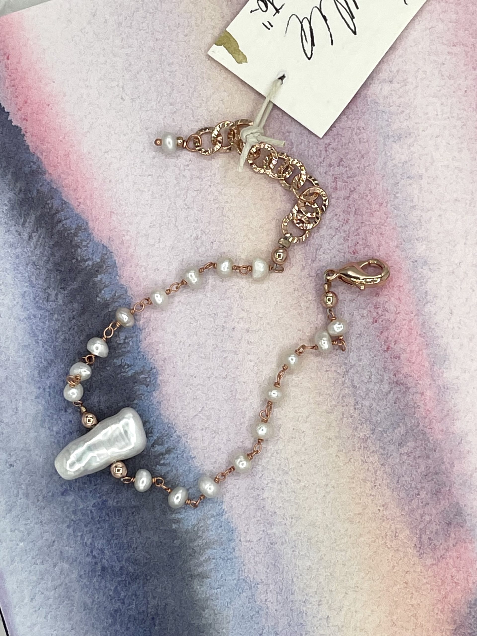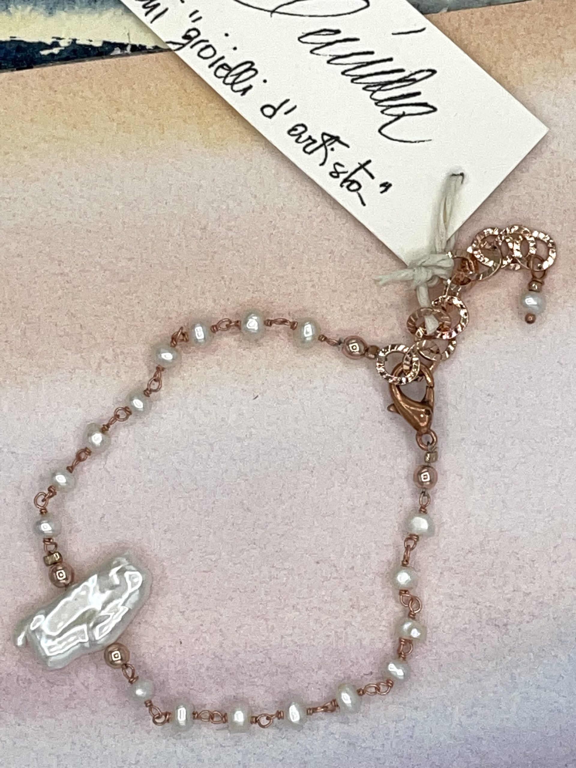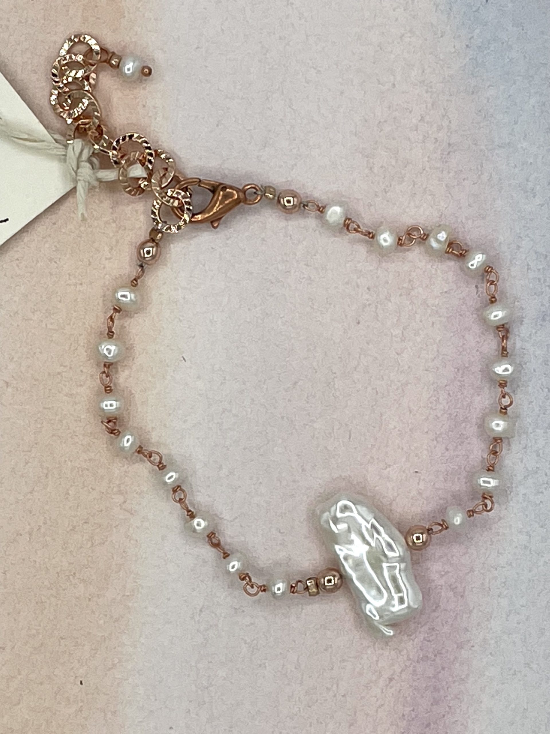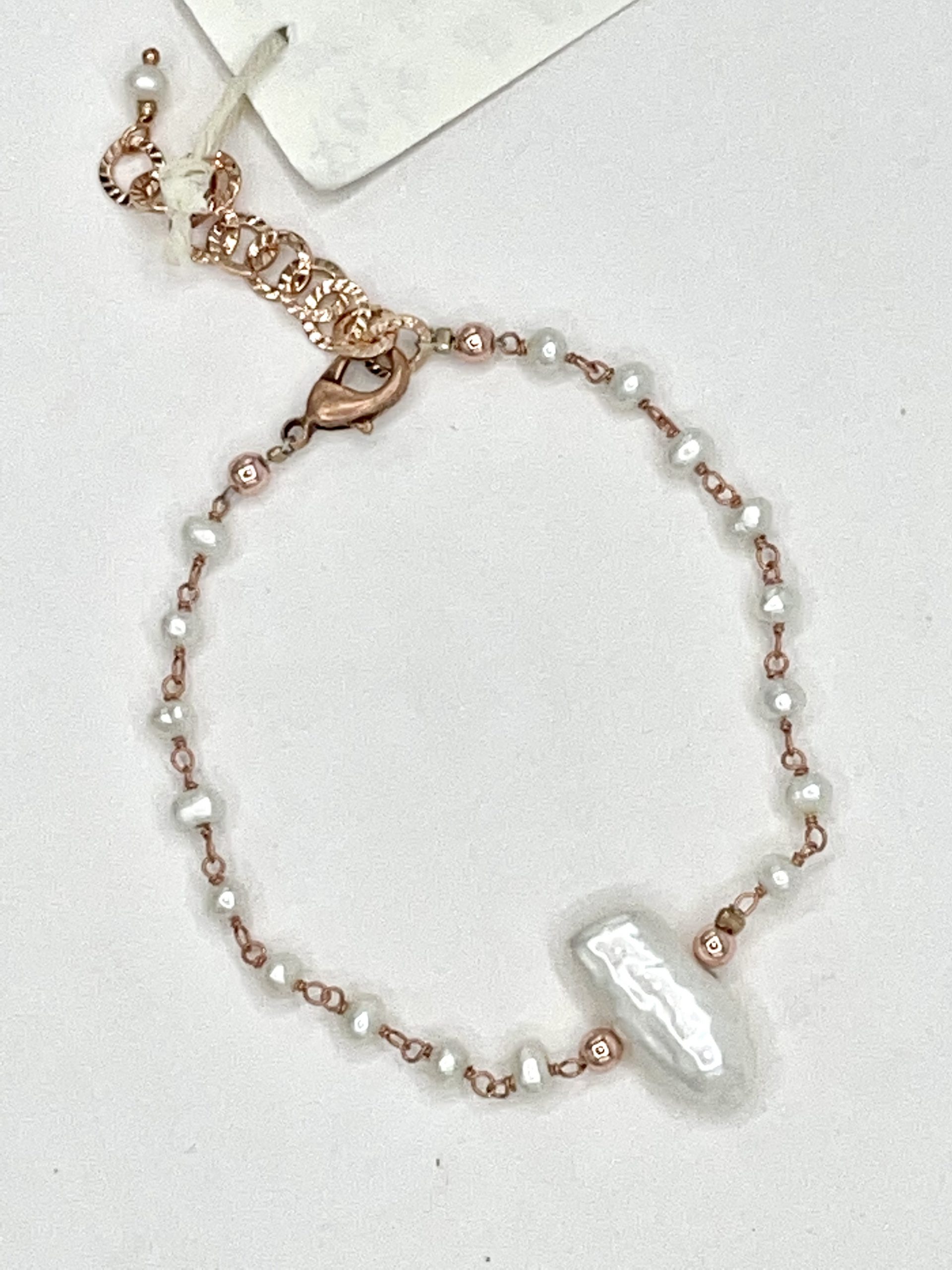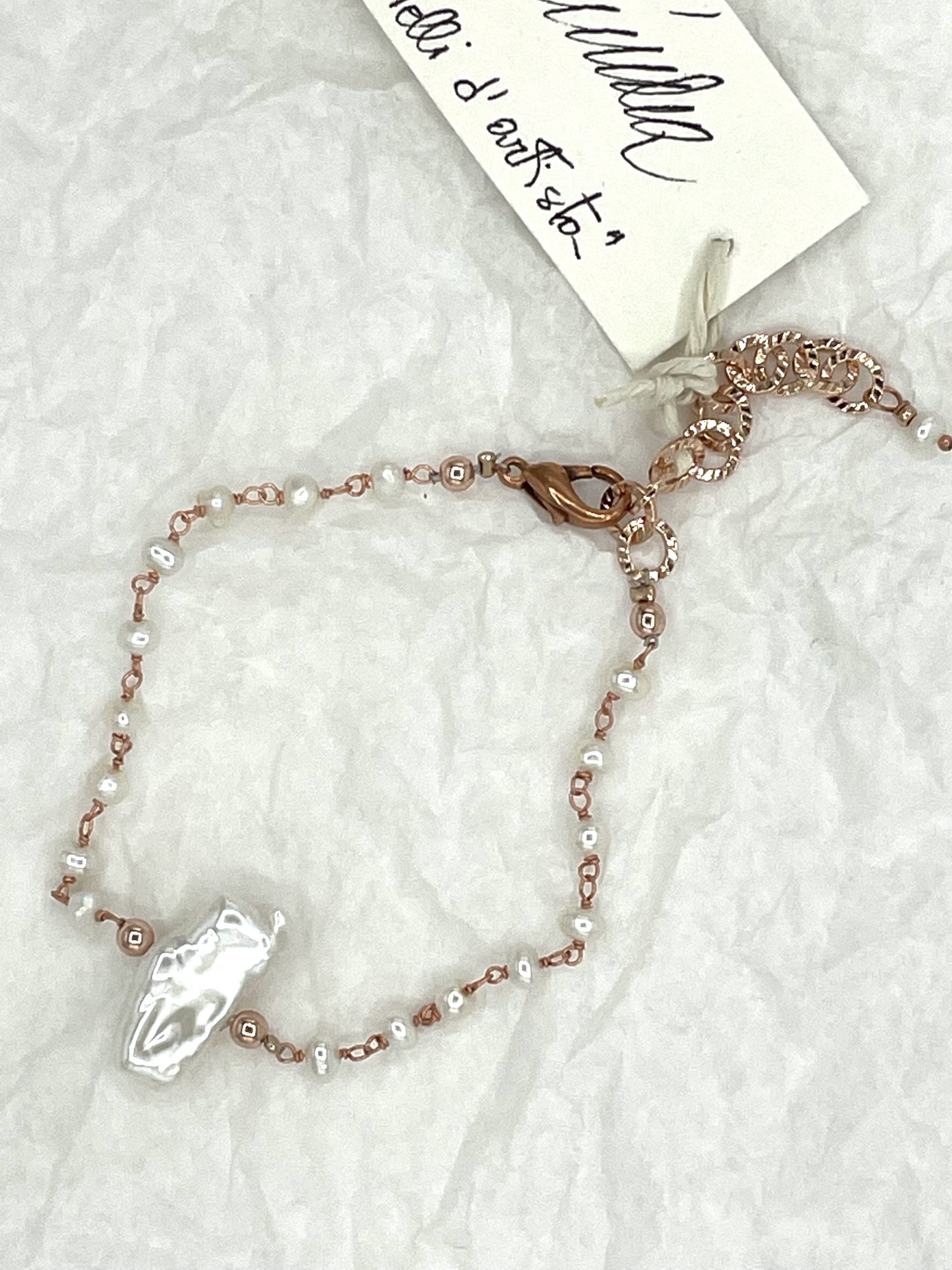 Raffinato bracciale in perle di fiume bianche incatenate in argento rosa, con grande perla barocca centrale. Il risalto è dato dalla bellissima luce della perla e dalla sua forma piuttosto rettangolare.