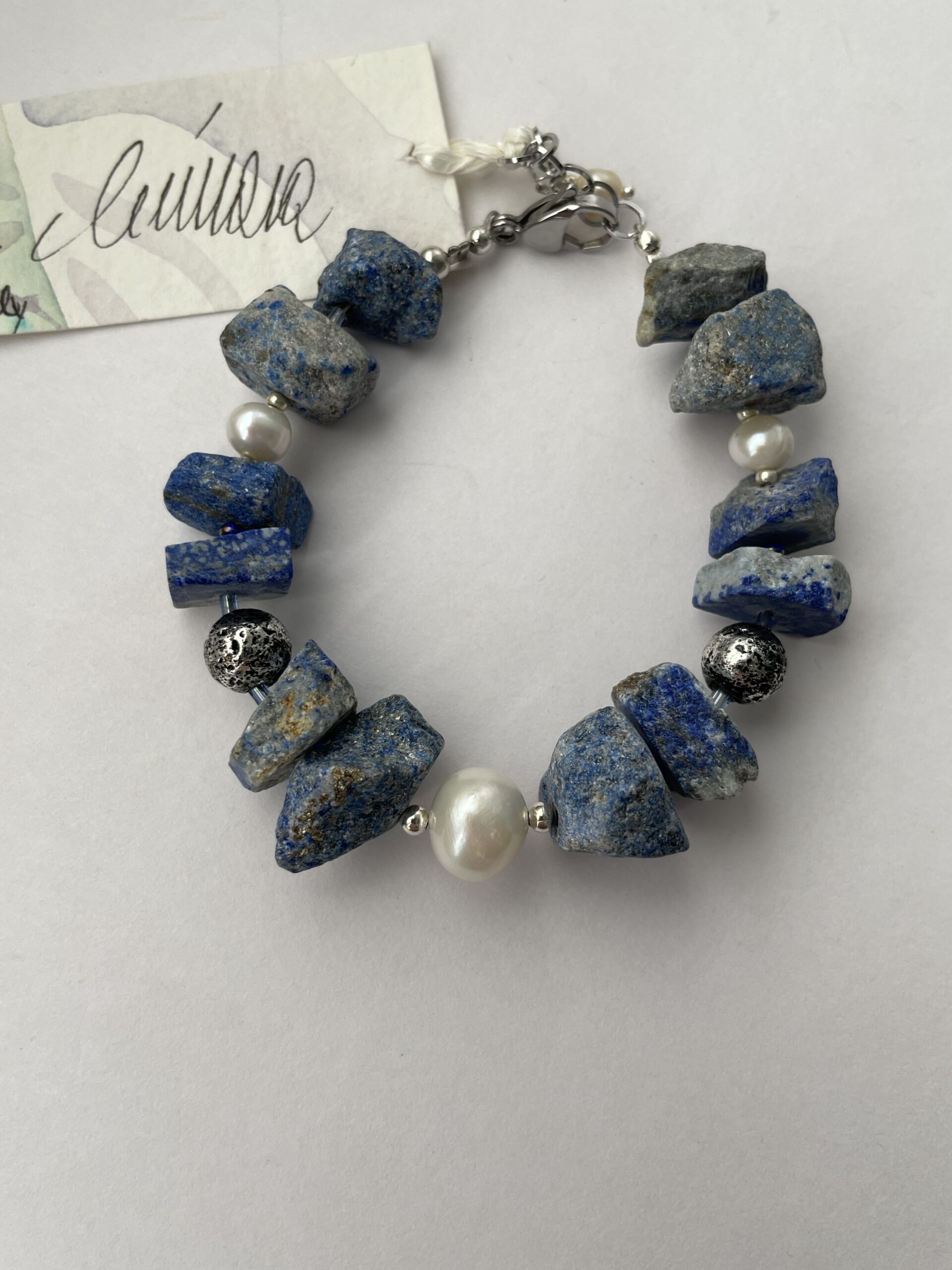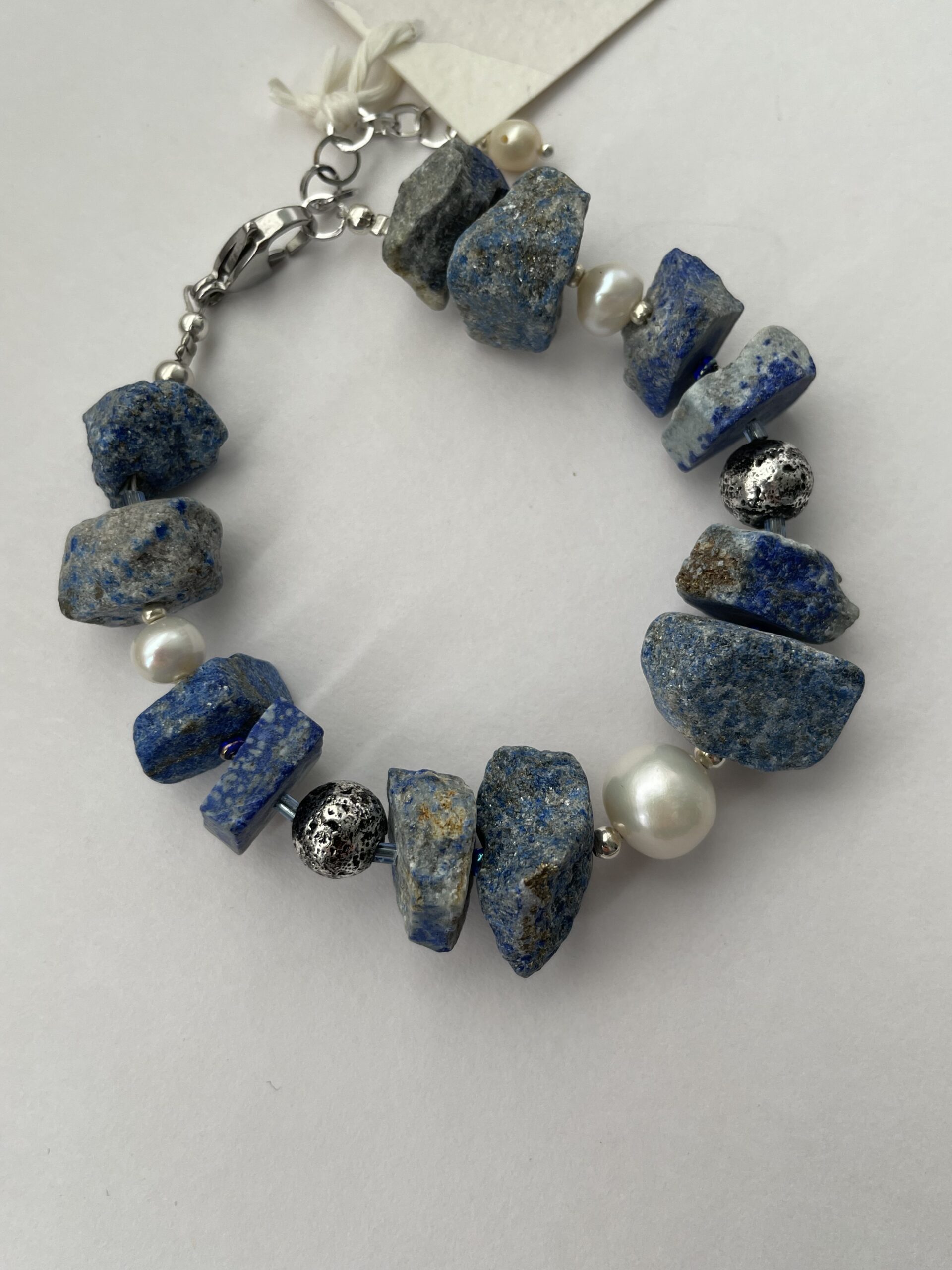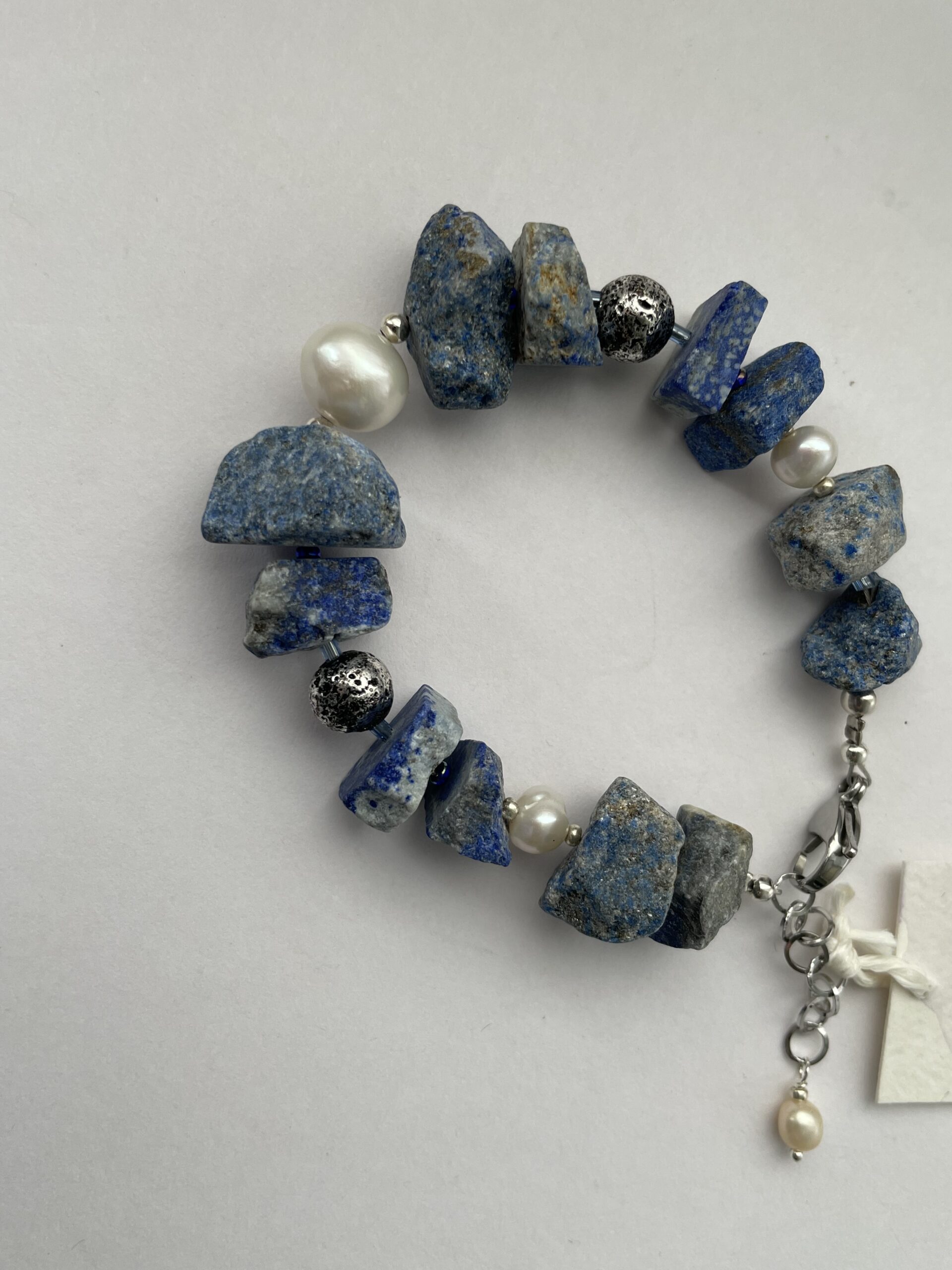 Bracciale in Lapislazzuli grezzi e perle, regolabile. Pezzo unico