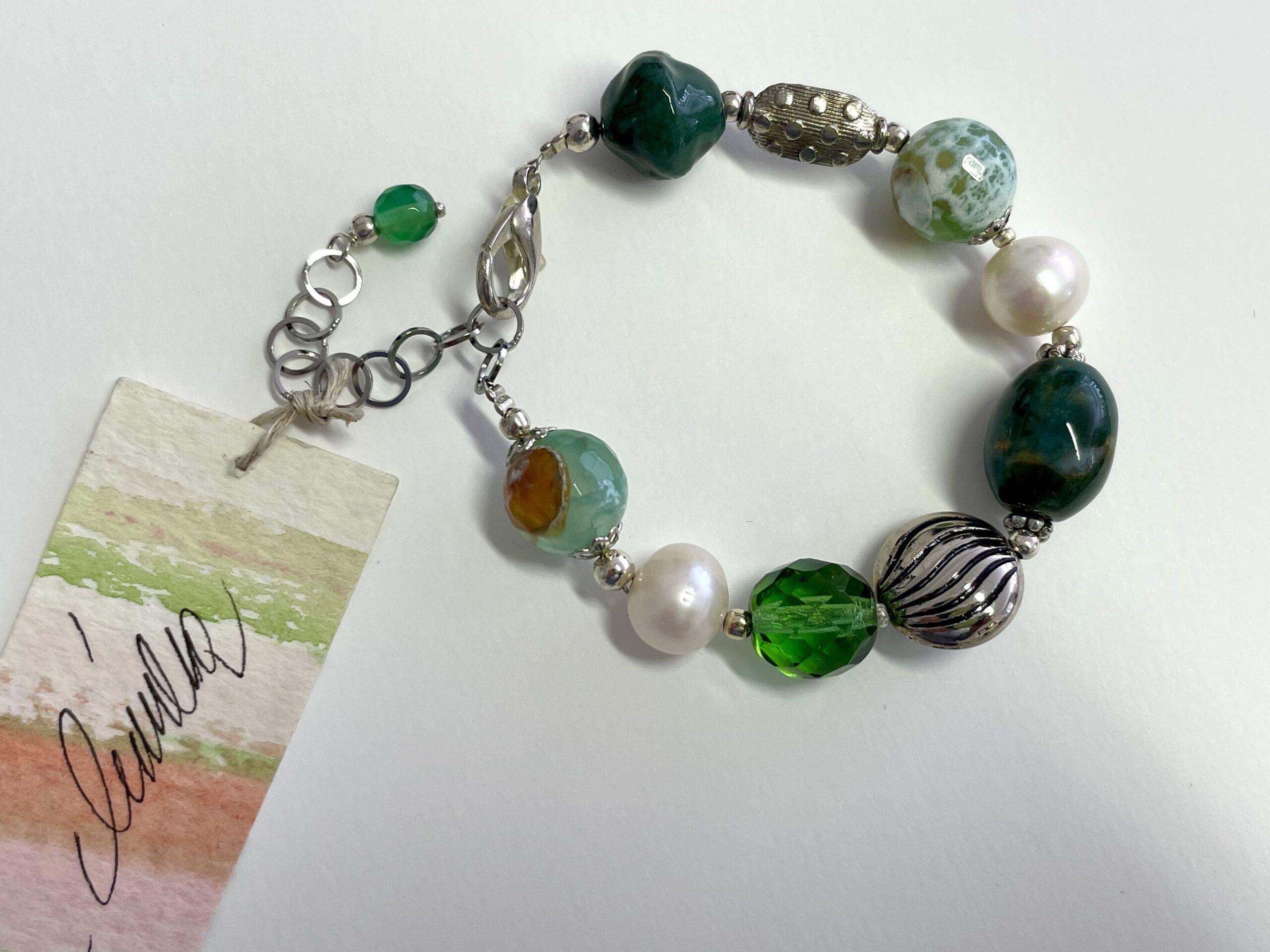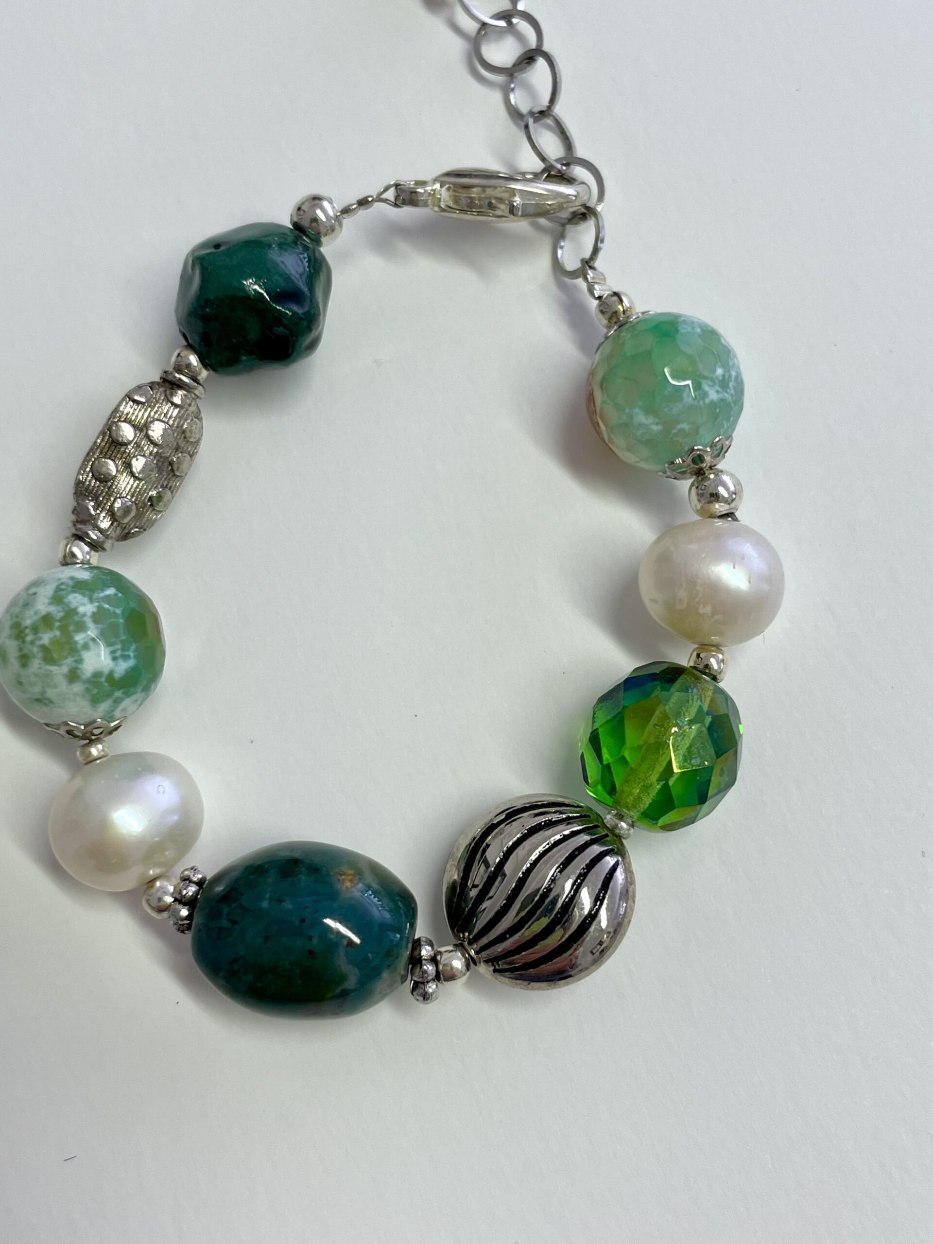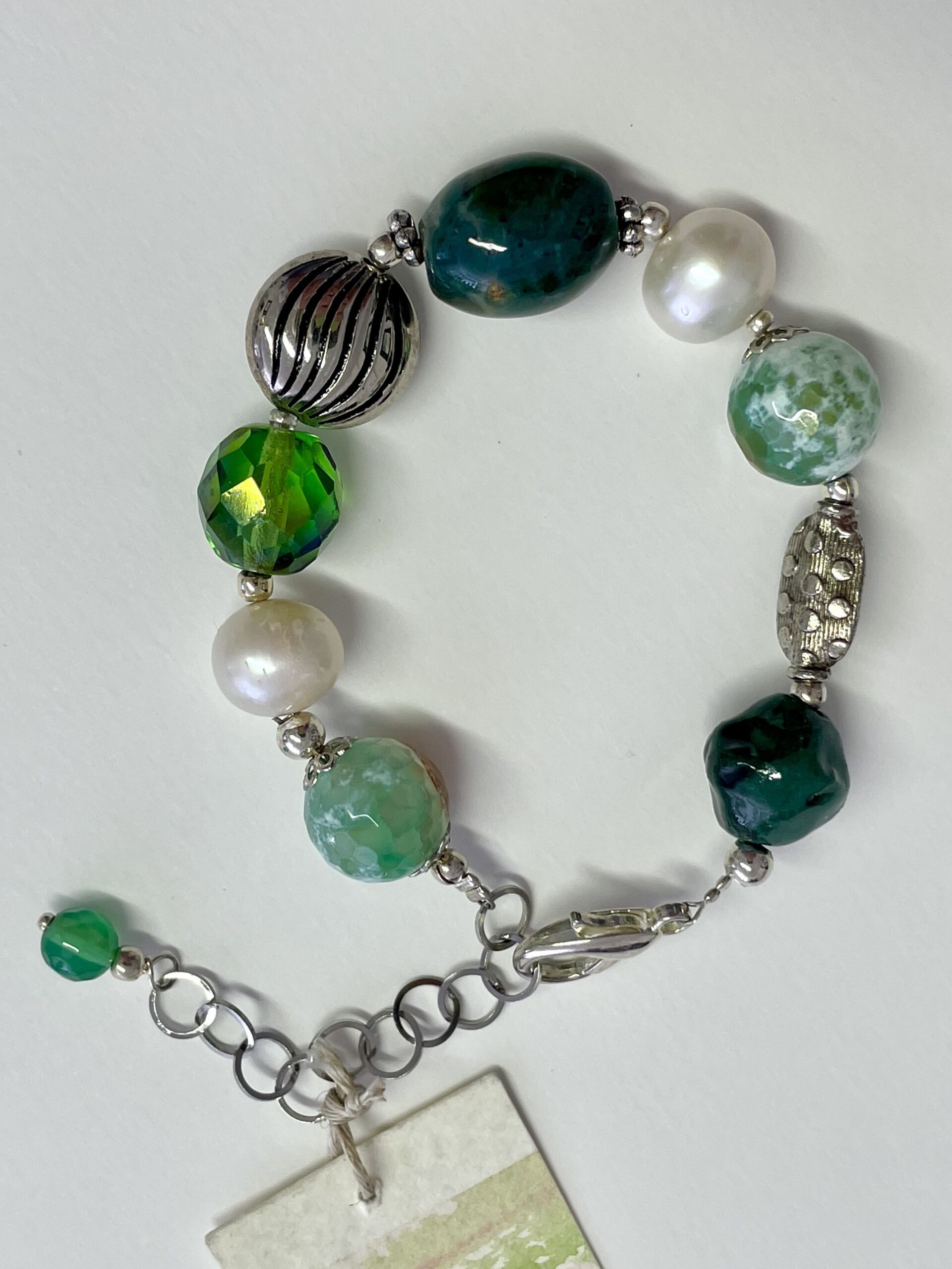Una grande pietra ovale in Agata muschiata, Agata verde Fire, boule in ceramica lavorata a mano. È poi ancora un grande cristallo di Boemia e due perle di fiume. Una comoda catenina in acciaio (come il moschettone) lo rende regolabile da 16,5 fino a 21 centimetri.