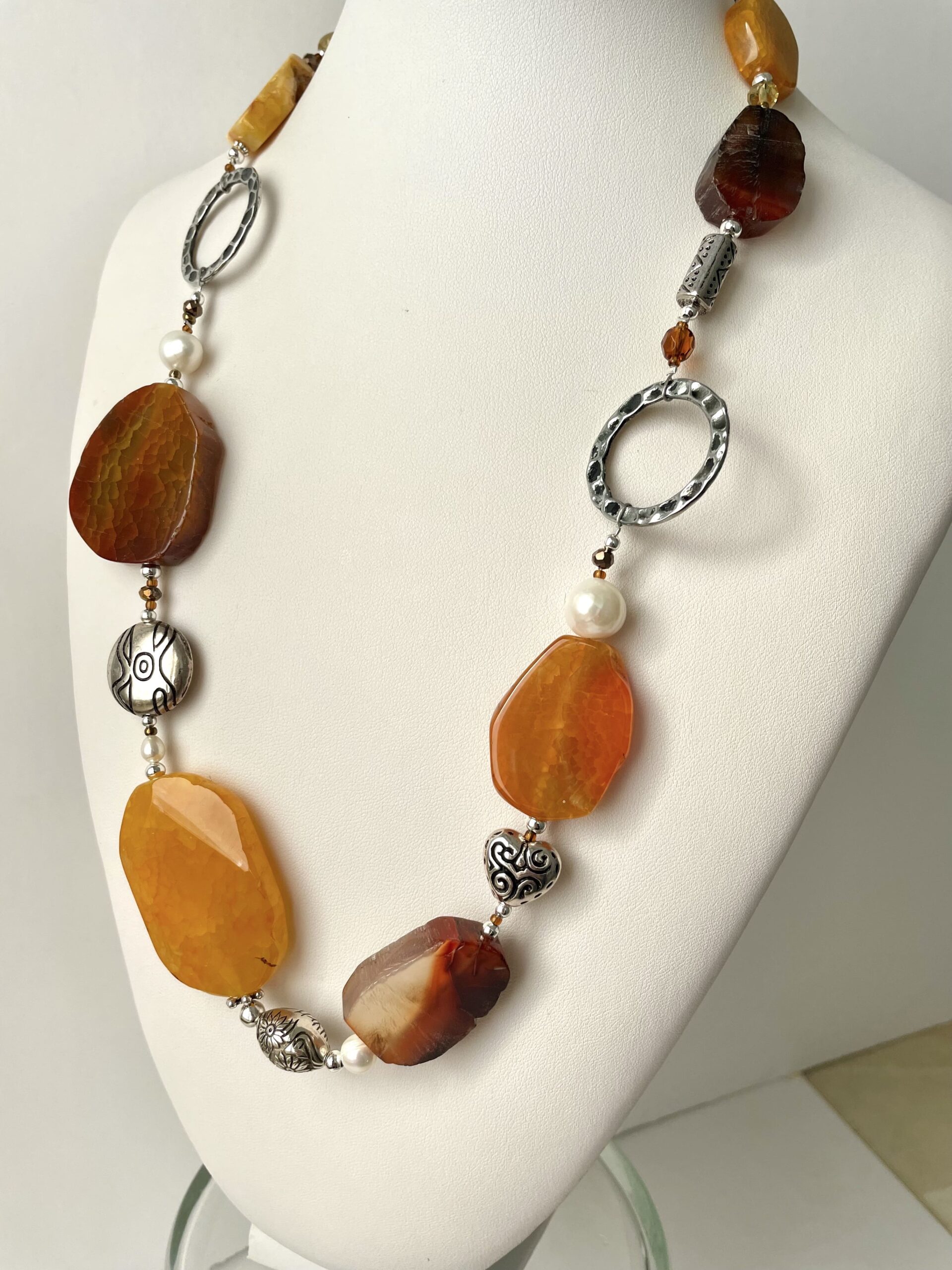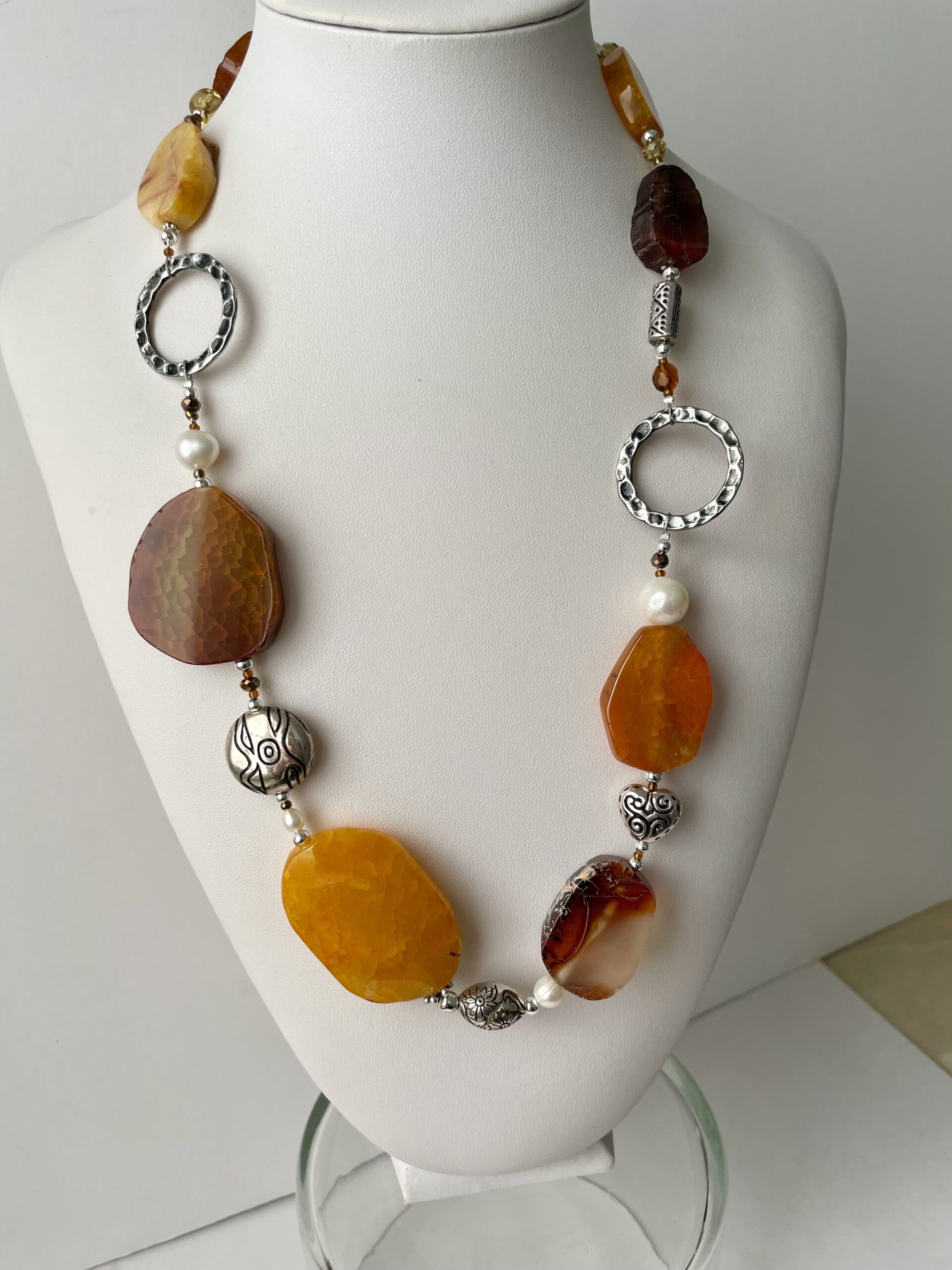 I toni caldi dell’ocra e dei bruni caratterizzano Zafferana, una collana dalla forte personalità. Le grandi, piatte pietre dure che la compongono sono in agata “Tranche” dalle forme irregolari. Ogni pietra presenta sfumature uniche e irripetibili. Troviamo inoltre perle di fiume bianche di diverse dimensioni e cristalli di Boemia. Alcuni elementi tondi in metallo martellato e leggermente brunito (nickel free) illuminano e ritmano il gioiello. Un comodo tratto finale di catena in acciaio la rende regolabile da 60 fino a 68 centimetri circa. Di grande impatto, Zafferana risalterà su ogni vostro outfit sportivo od elegante. Sicuramente sarà di grande effetto indossata su un capo nero. La stessa collana viene proposta da Chiara Bo anche in pietre dure di altri colori: “Deep Ice” nei toni del turchese, “Irlanda!” sui verdi brillanti, “Jaipur” sui rosa accesi, “Ireos” sui viola, “Morgana” sul nero e bruni.