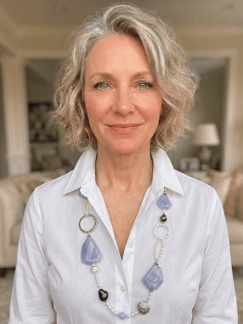 Ogni particolare è studiato con grande cura: gli elementi in argento italiano 925 le donano ritmo e l’impreziosiscono. Le perle di fiume bianche la illuminano, quelle grandi grigie sottolineano la sua asimmetria. Da notare in particolare il motivo ad asola formato dalle perle a chicco di riso e dai cerchi in argento in cui si inseriscono.