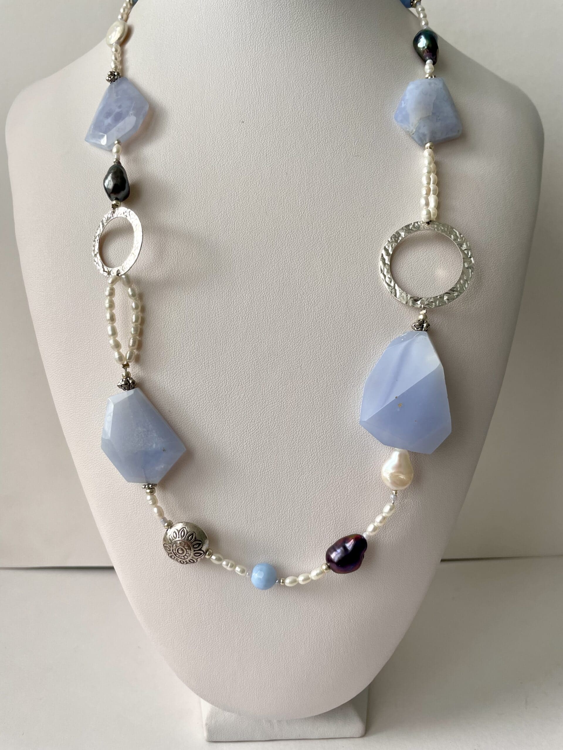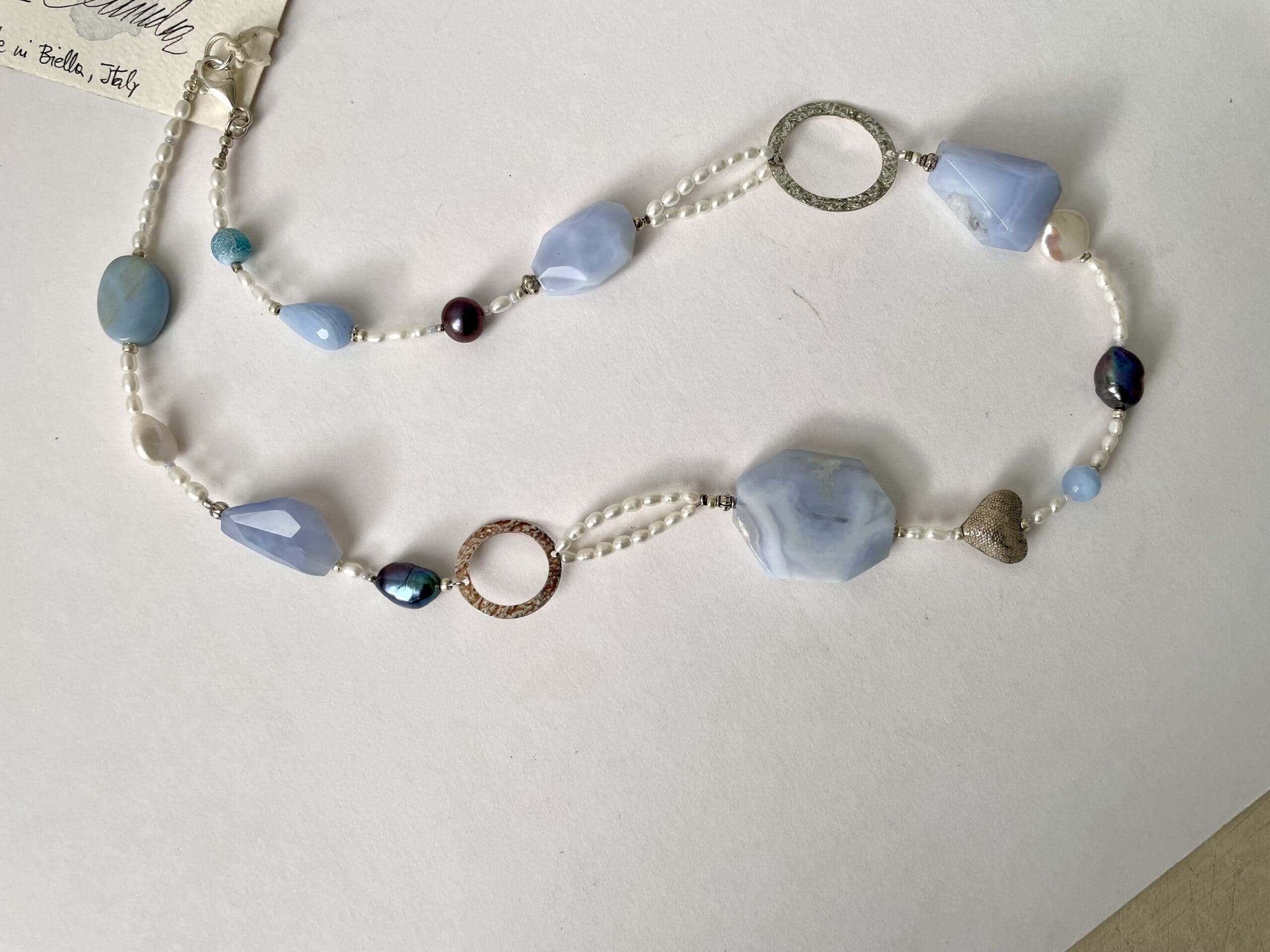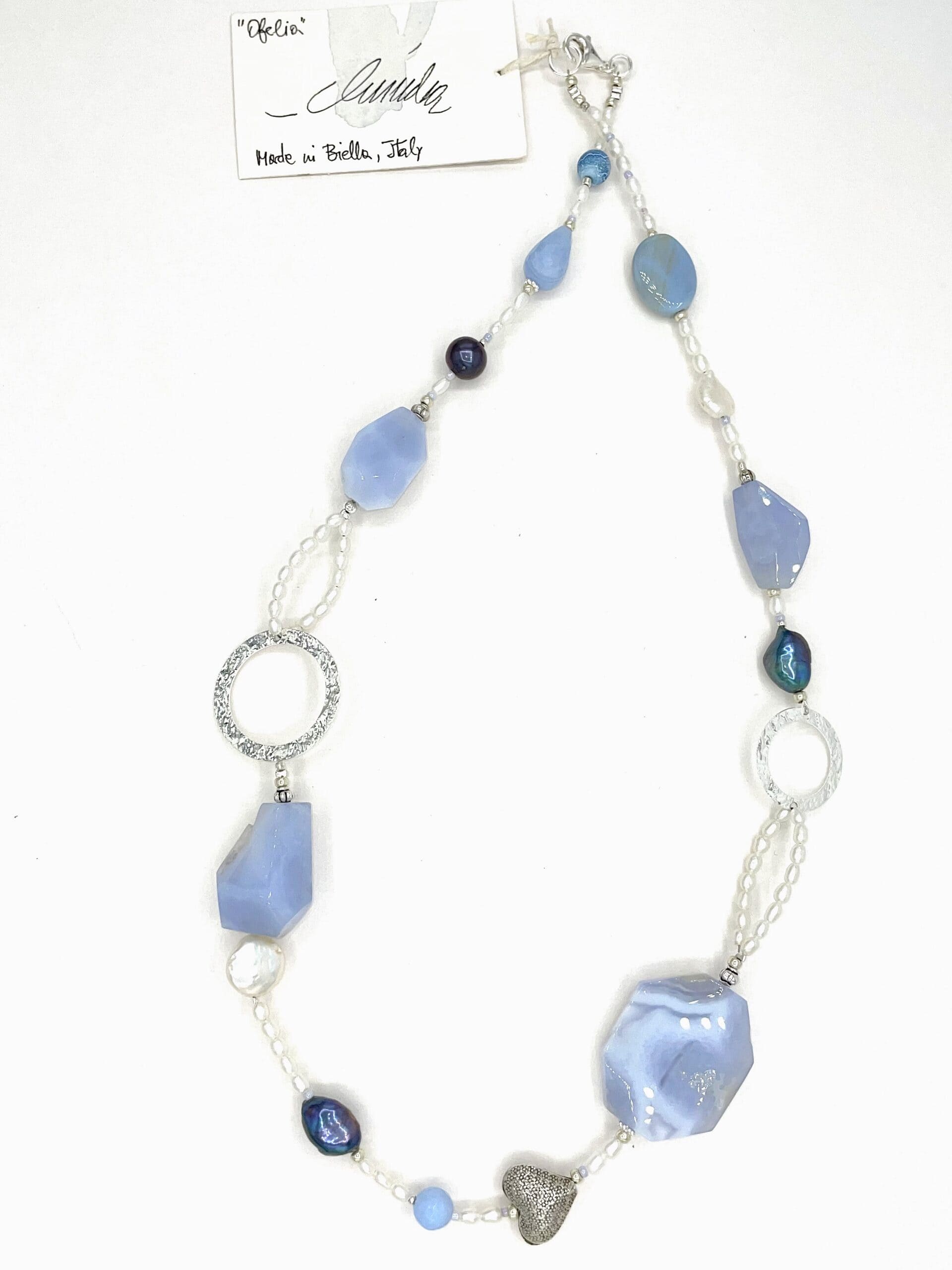 Azzurri nordici delicati e sognanti come l’eroina shakespeariana caratterizzano la collana OFELIA, realizzata con bellissimo calcedonio di grandi dimensioni. Le pietre naturali sono sfaccettate a larghe facce e presentano suggestive forme irregolari.