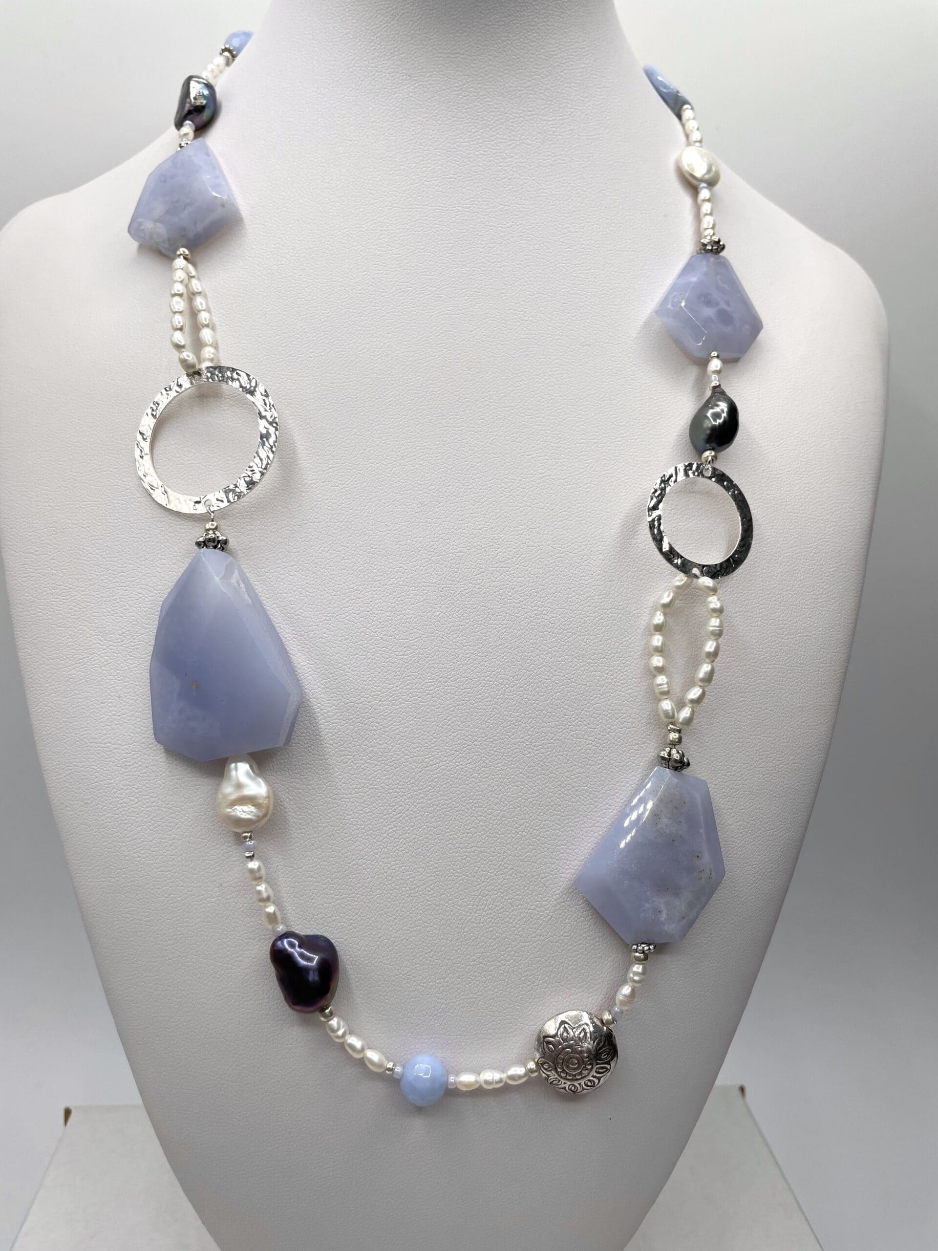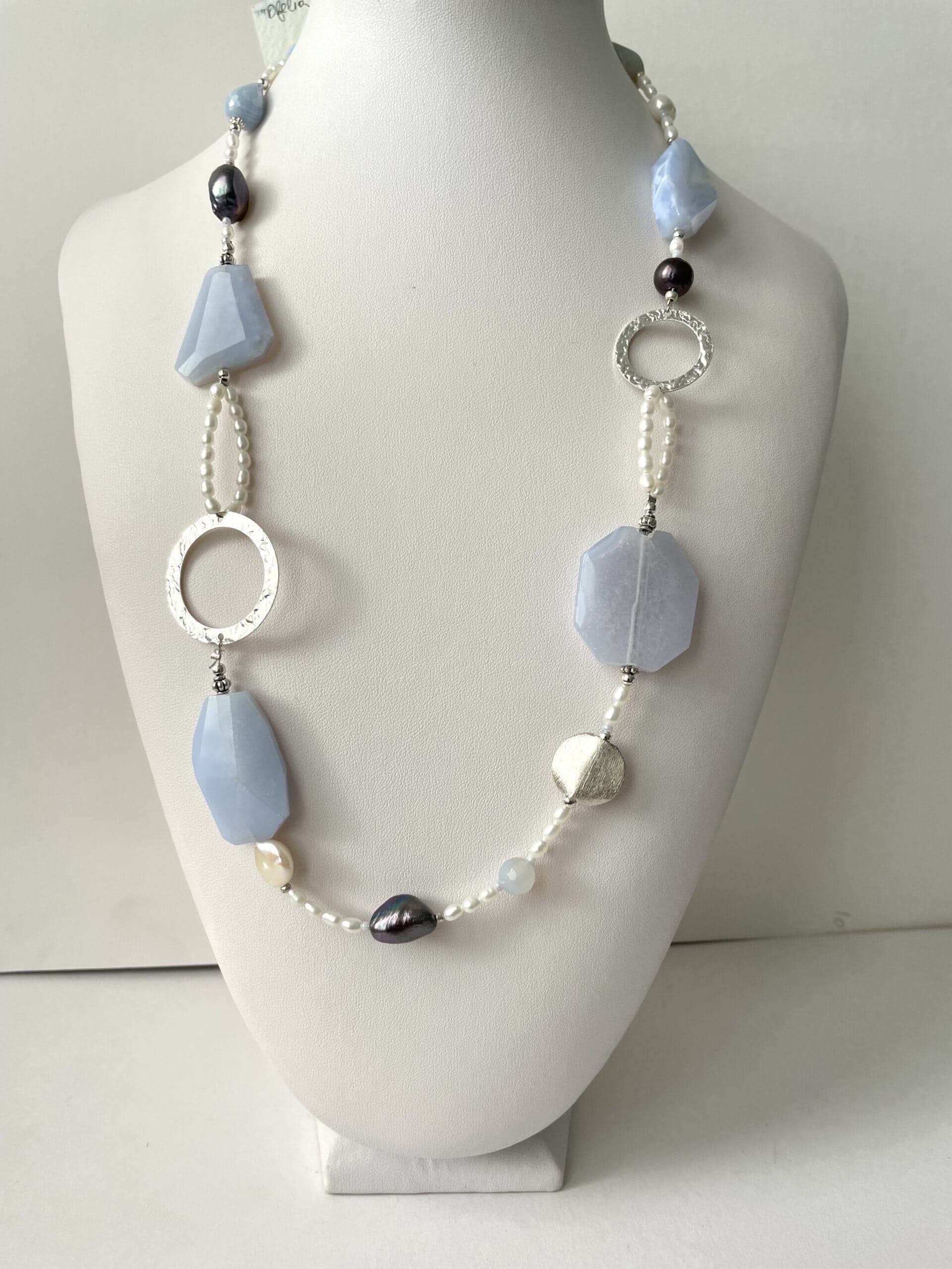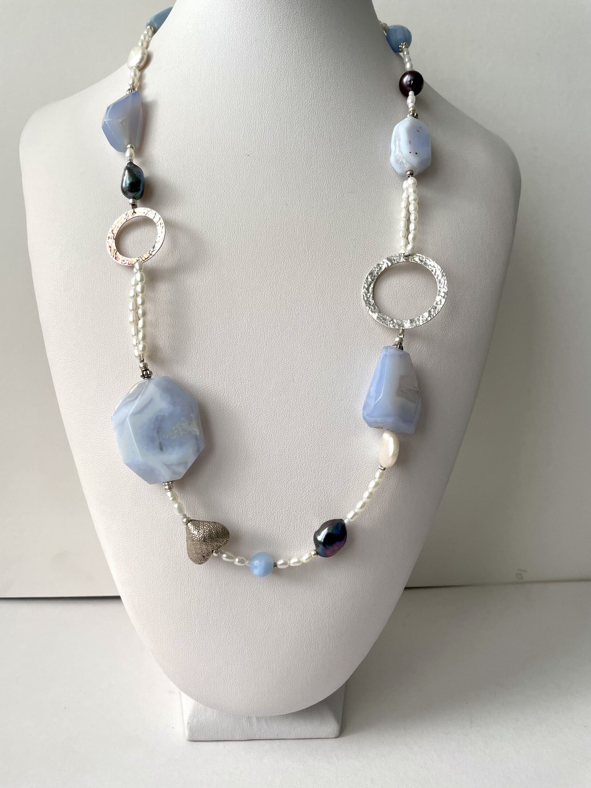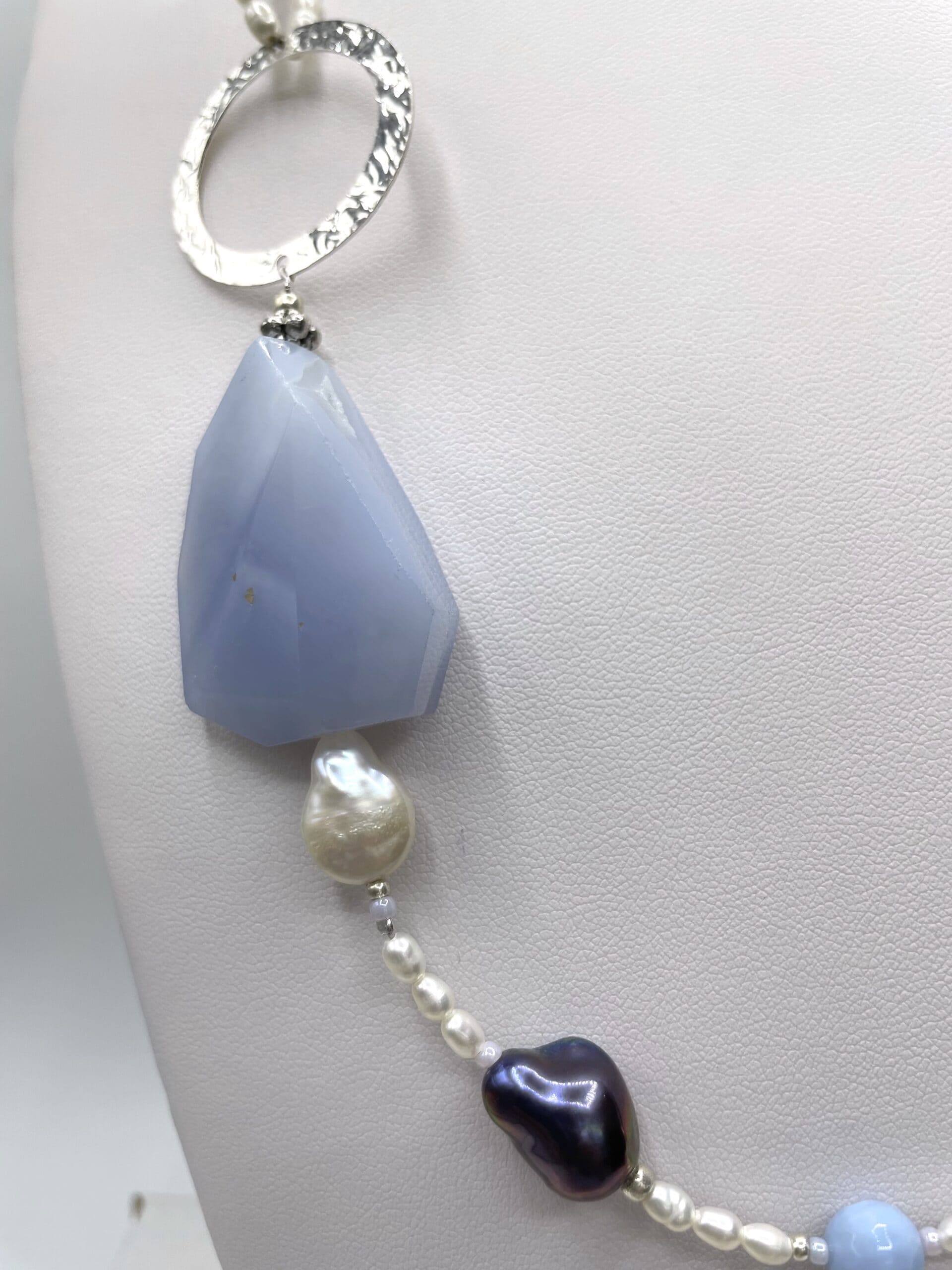 Azzurri nordici delicati e sognanti come l’eroina shakespeariana caratterizzano la collana OFELIA, realizzata con bellissimo calcedonio di grandi dimensioni. Le pietre naturali sono sfaccettate a larghe facce e presentano suggestive forme irregolari.