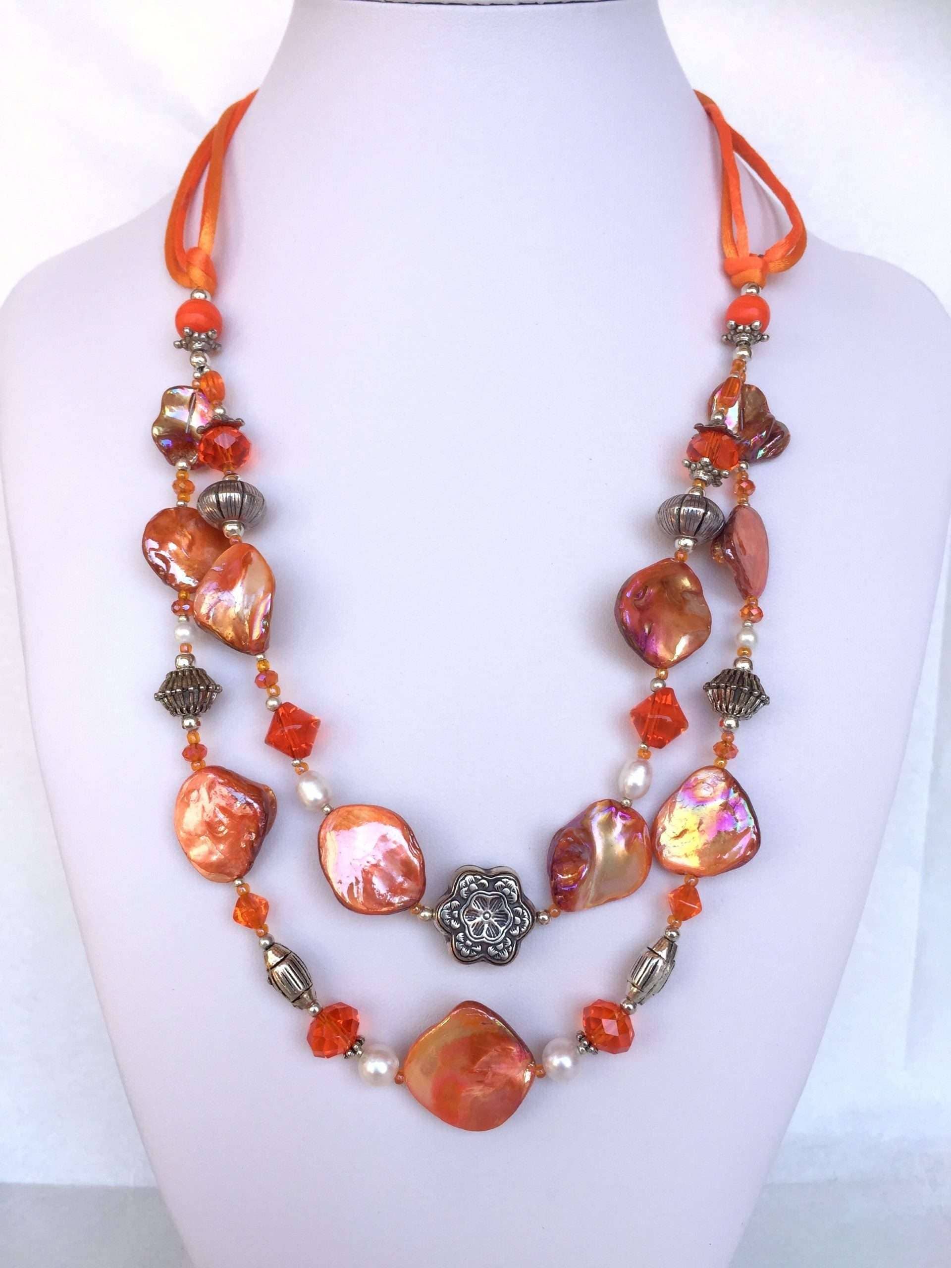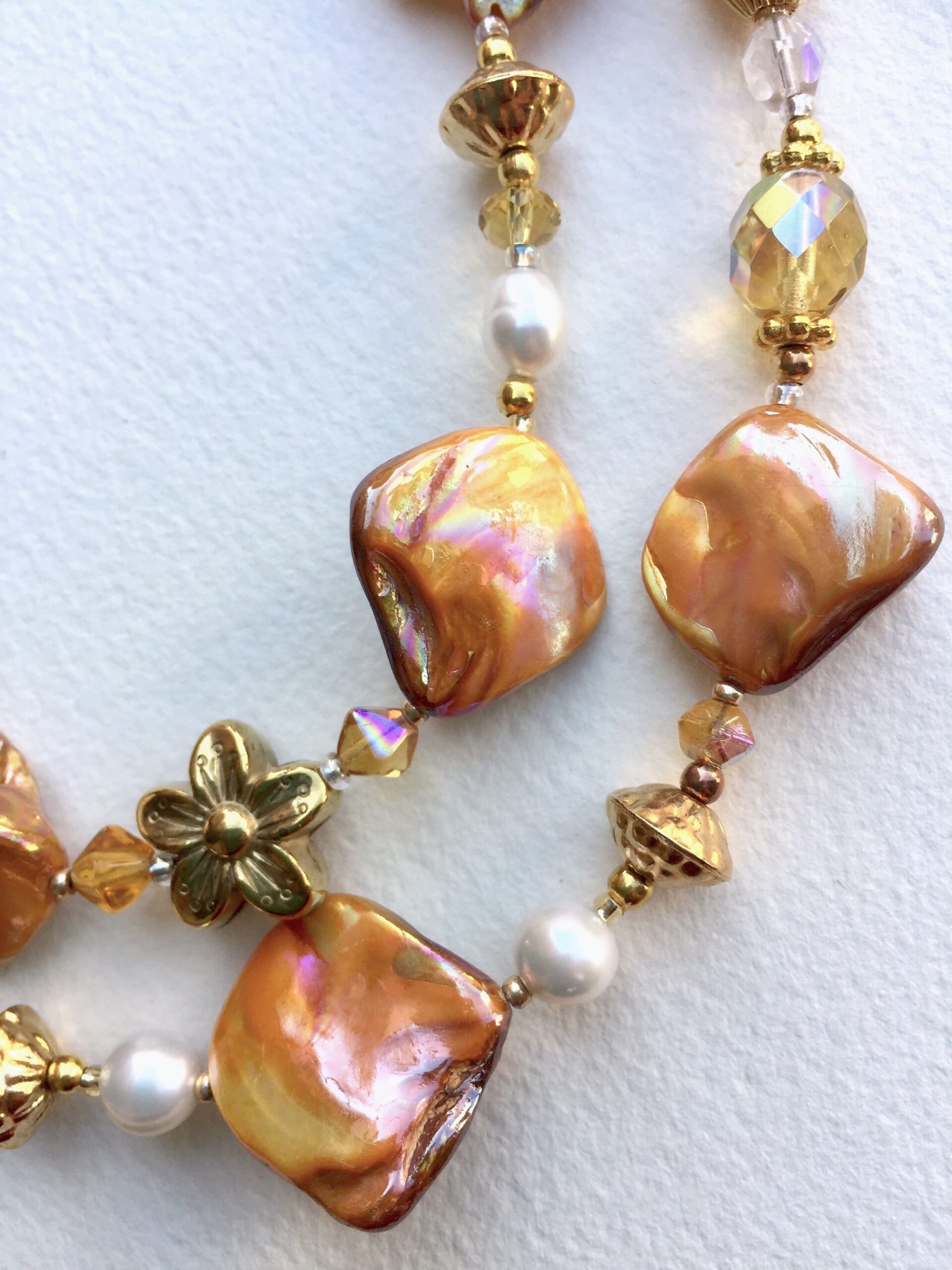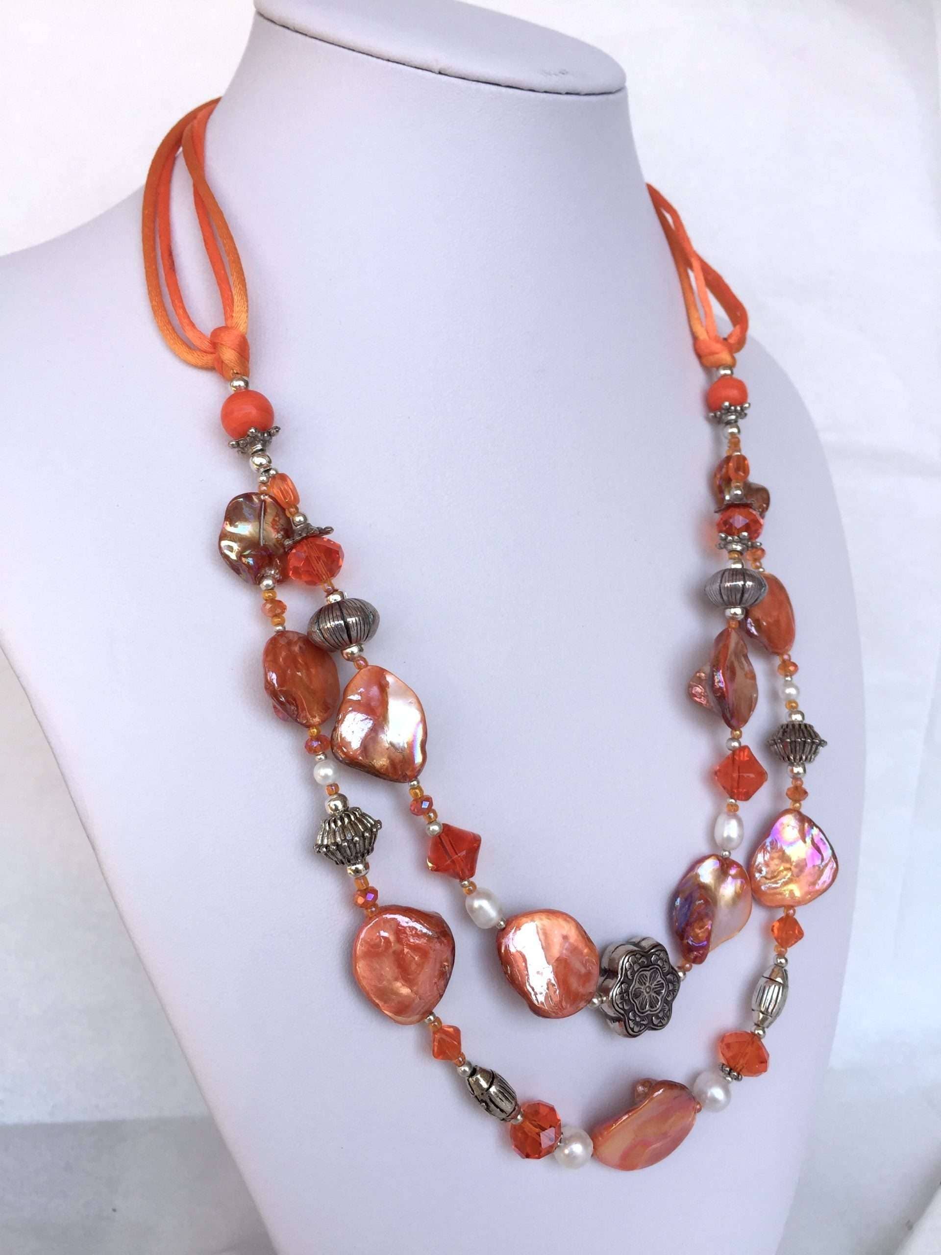 Il nome indica la sua caratteristica : una collana luminosa e iridescente che farà risaltare il fascino di ogni donna. Con i suoi due fili di madreperla, cristalli di Boemia, pietre dure, perle di fiume e metallo nichel free decora con brio.