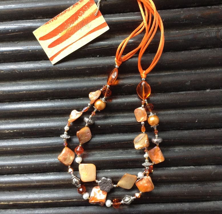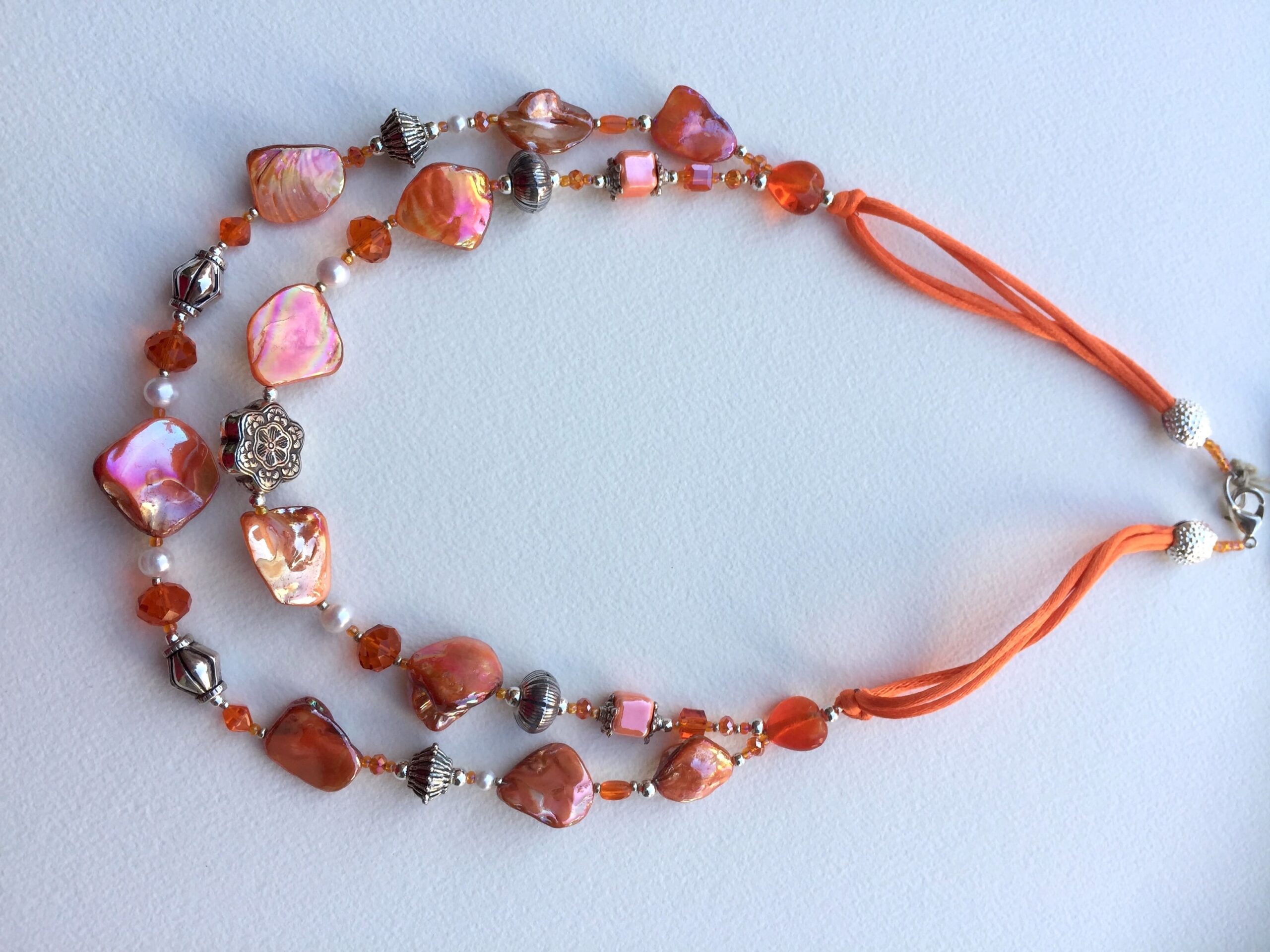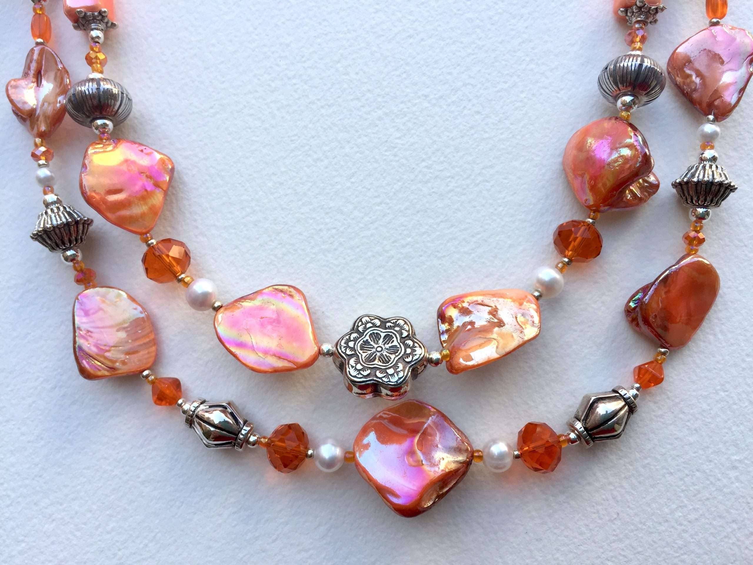 Il nome indica la sua caratteristica : una collana luminosa e iridescente che farà risaltare il fascino di ogni donna. Con i suoi due fili di madreperla, cristalli di Boemia, pietre dure, perle di fiume e metallo nichel free decora con brio.