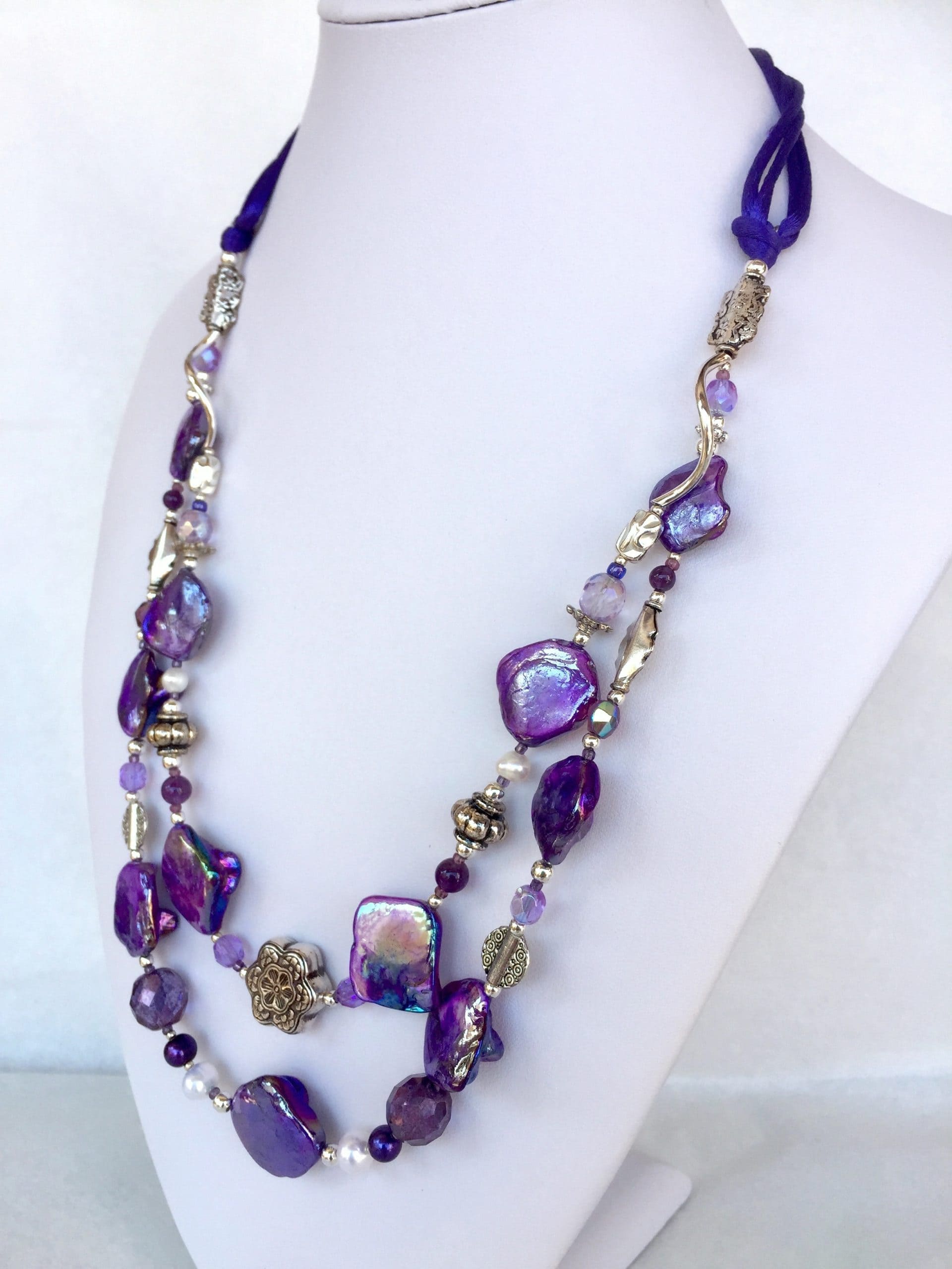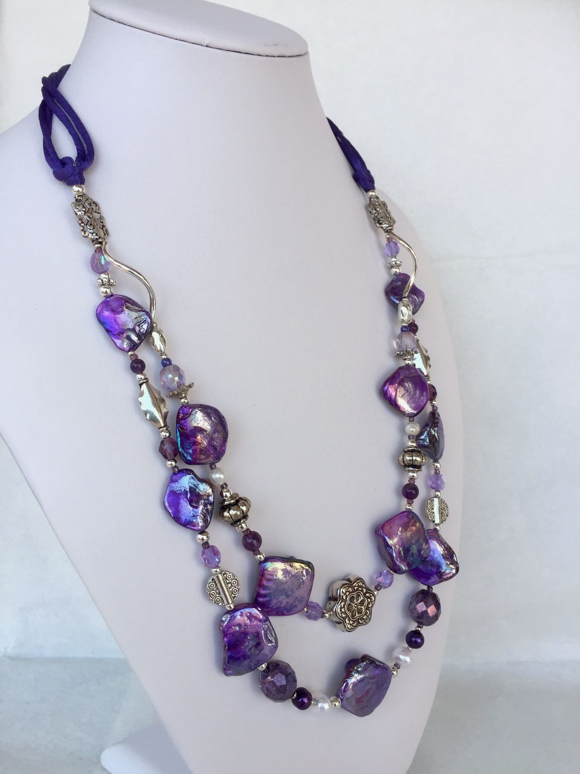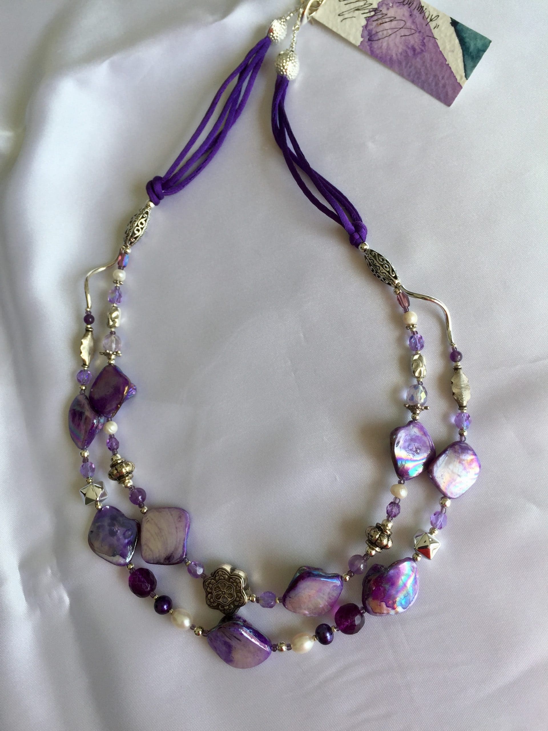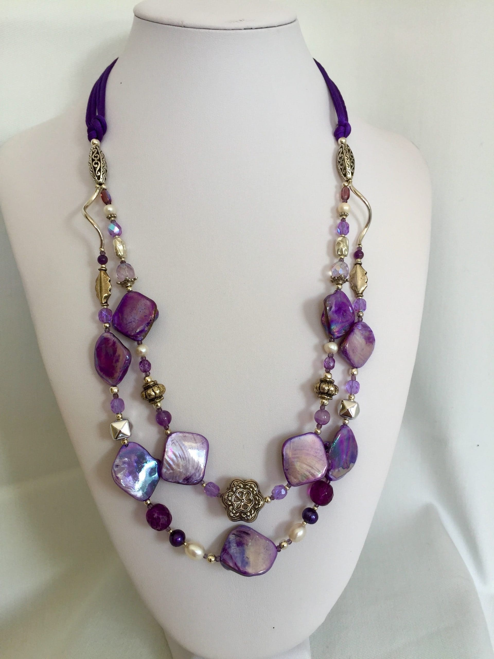 A due fili in madreperla viola con ametista, cristalli di Boemia, perle di fiume bianche e violette, cordoncini in seta.