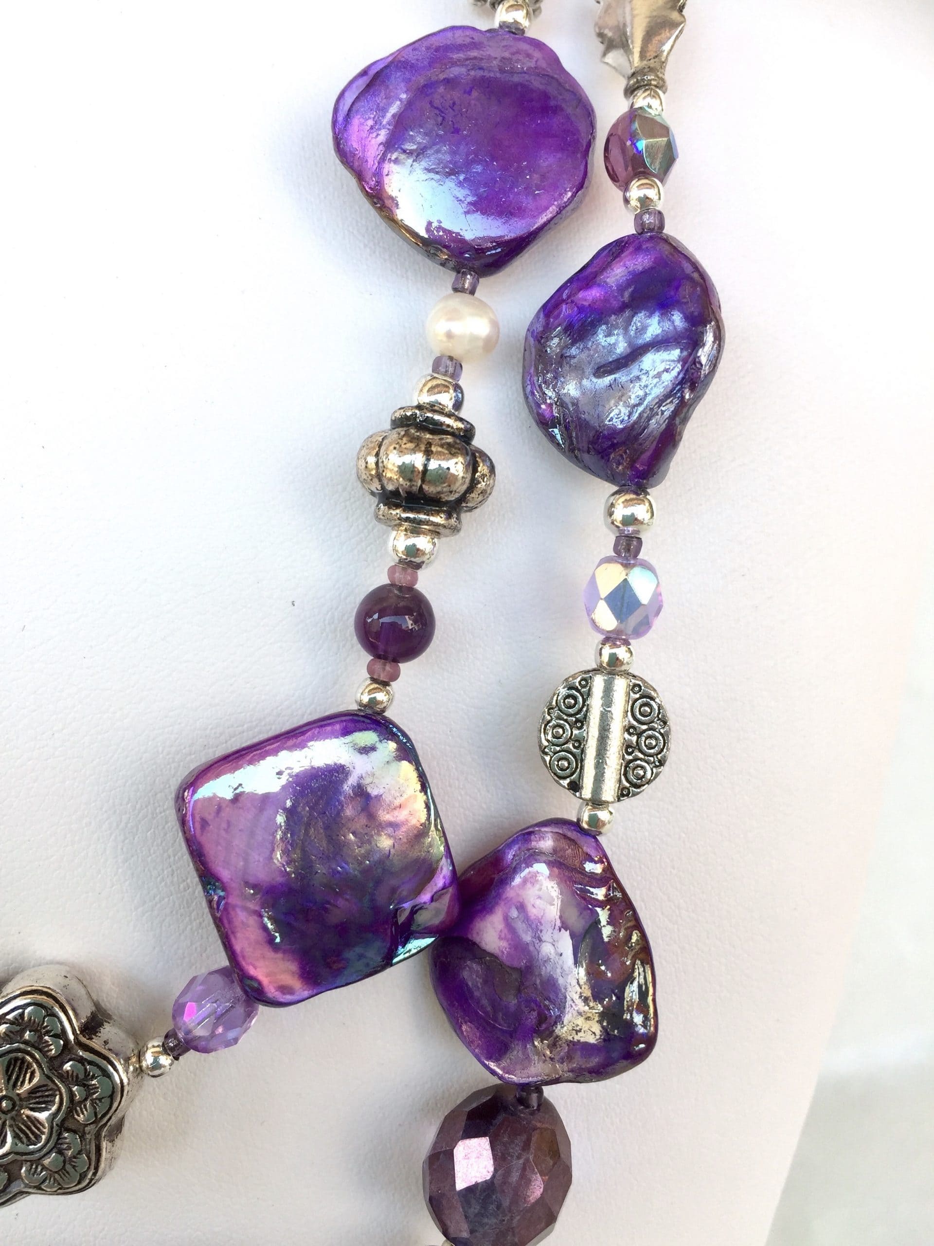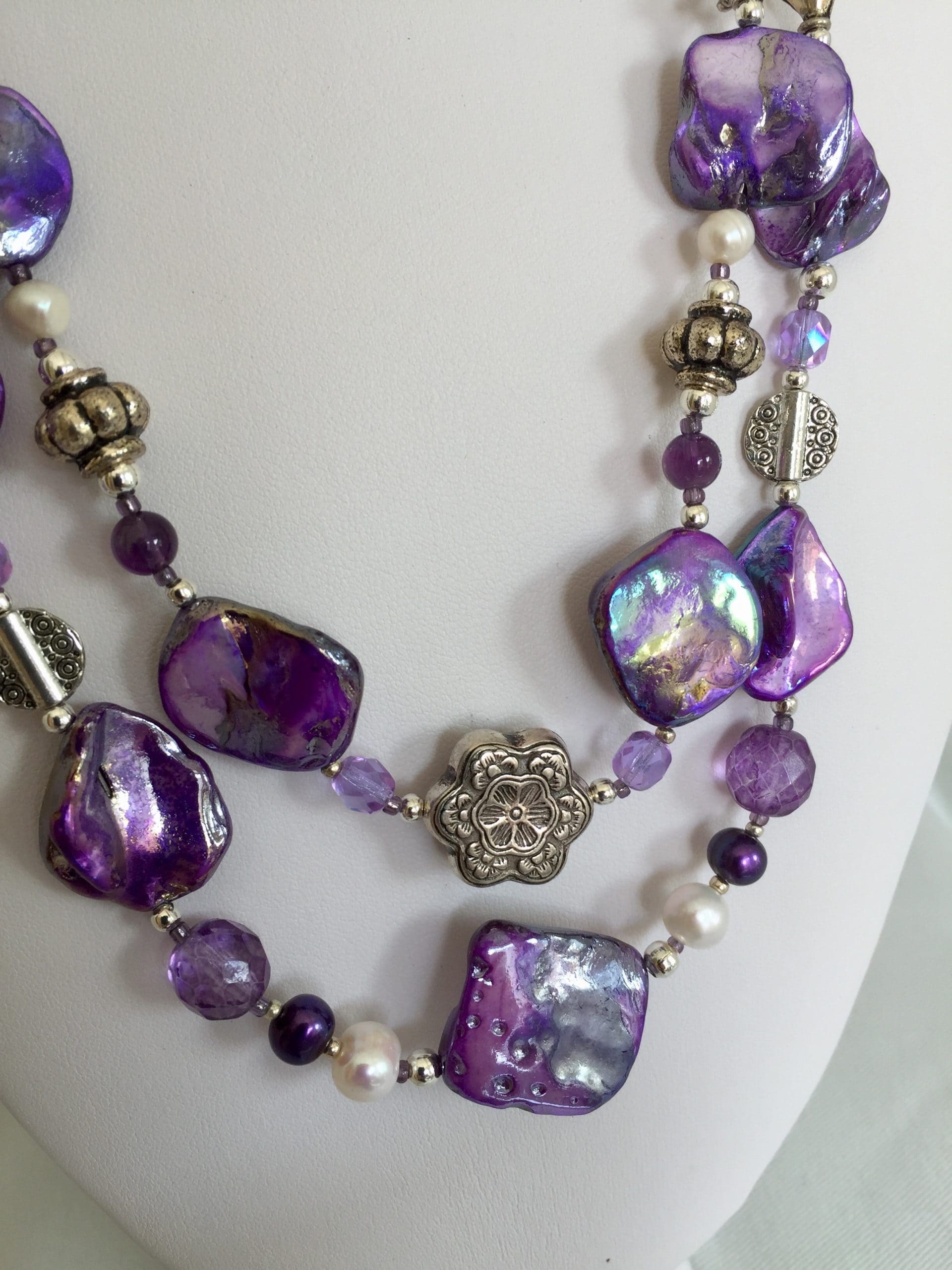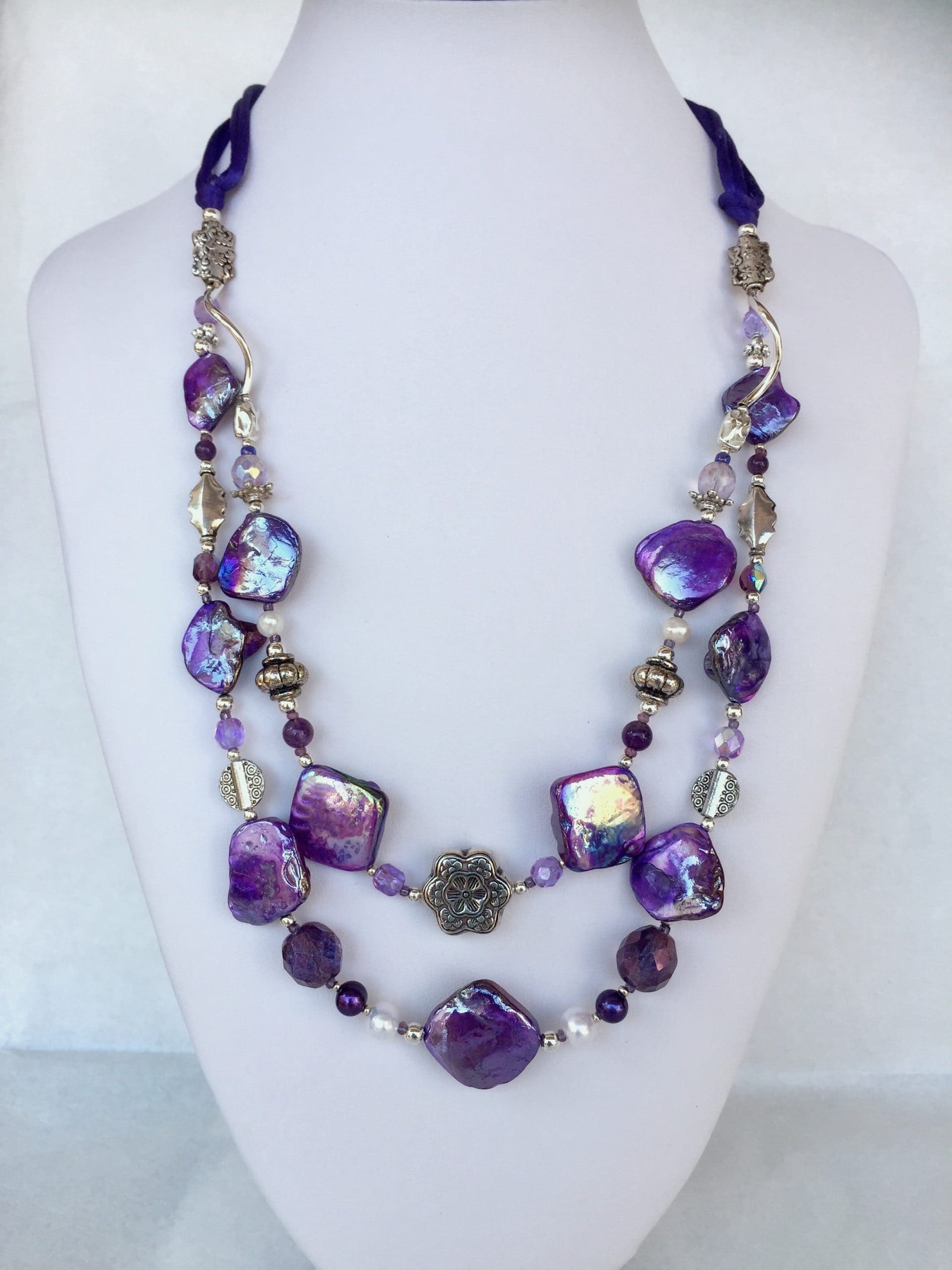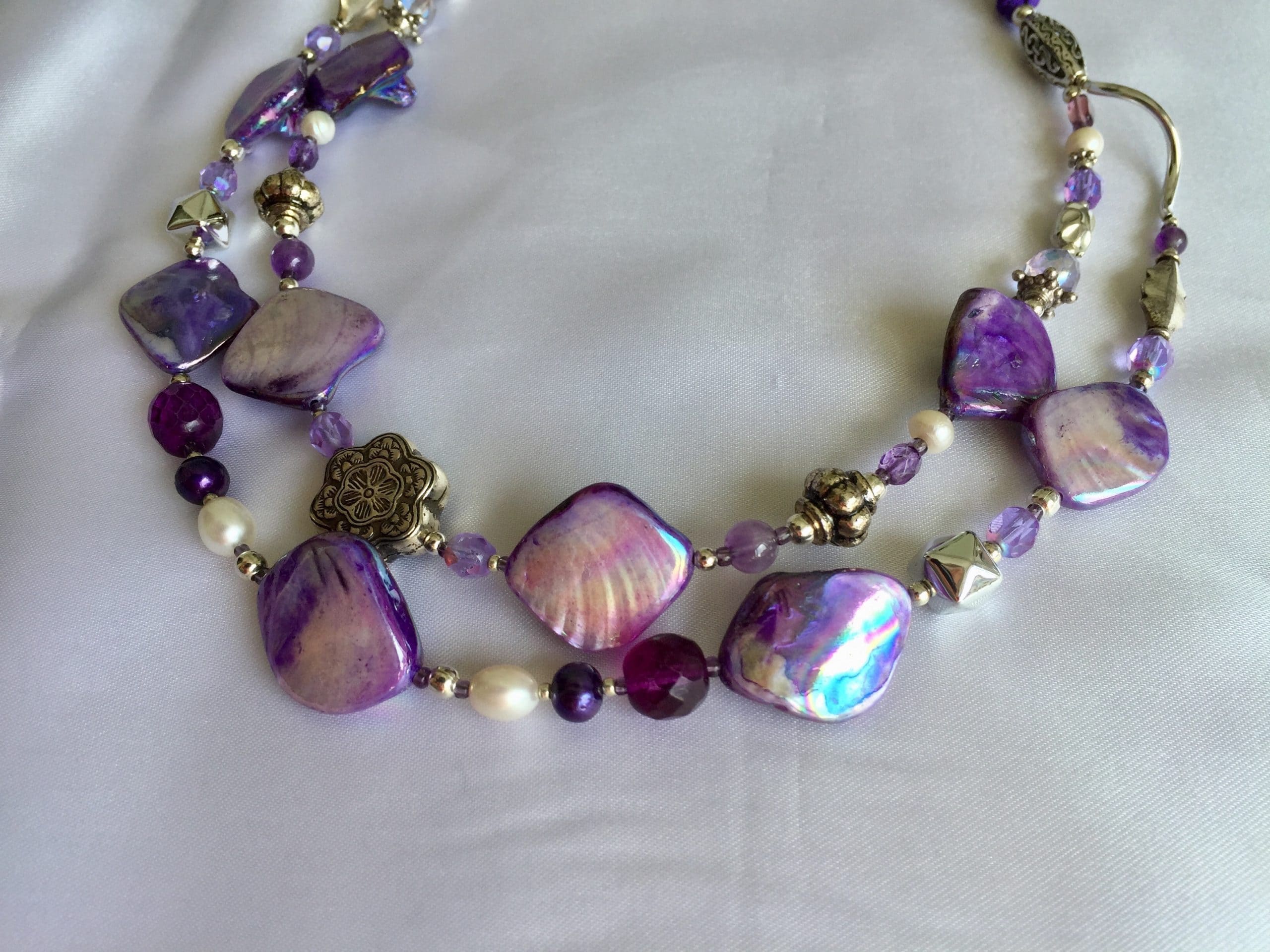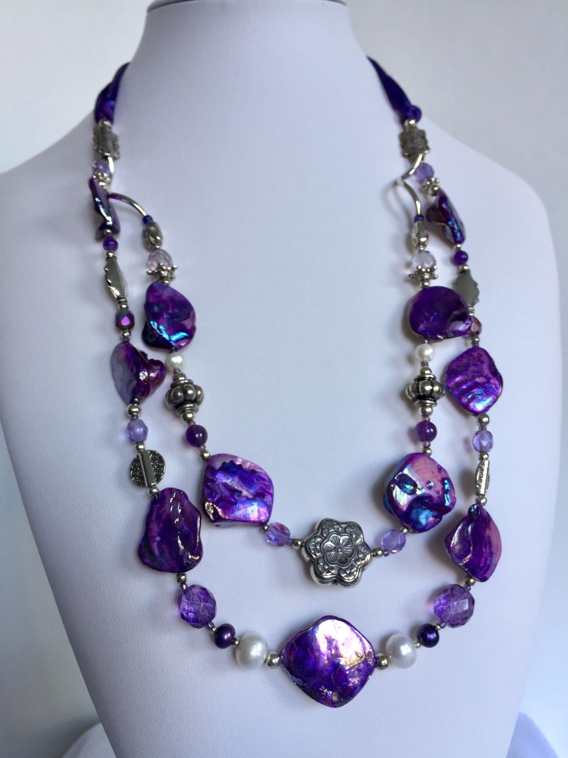 A due fili in madreperla viola con ametista, cristalli di Boemia, perle di fiume bianche e violette, cordoncini in seta.
