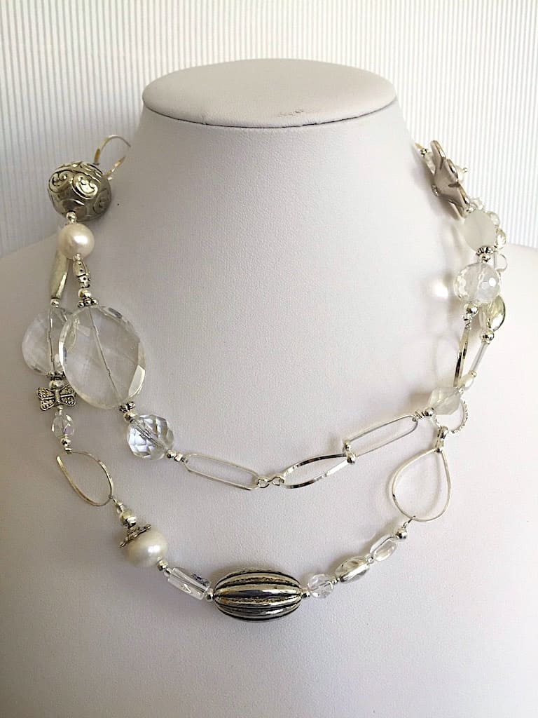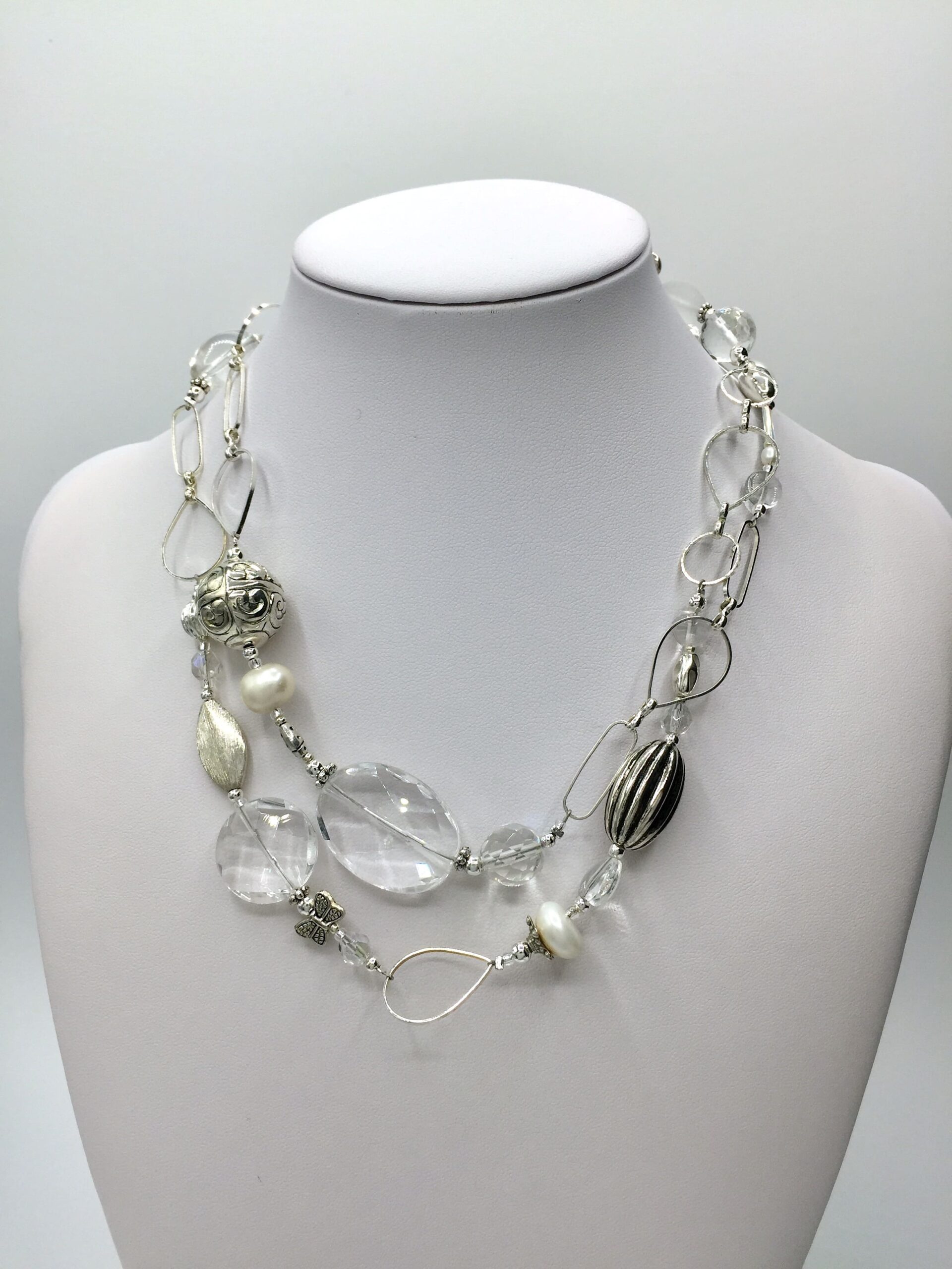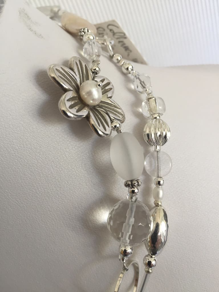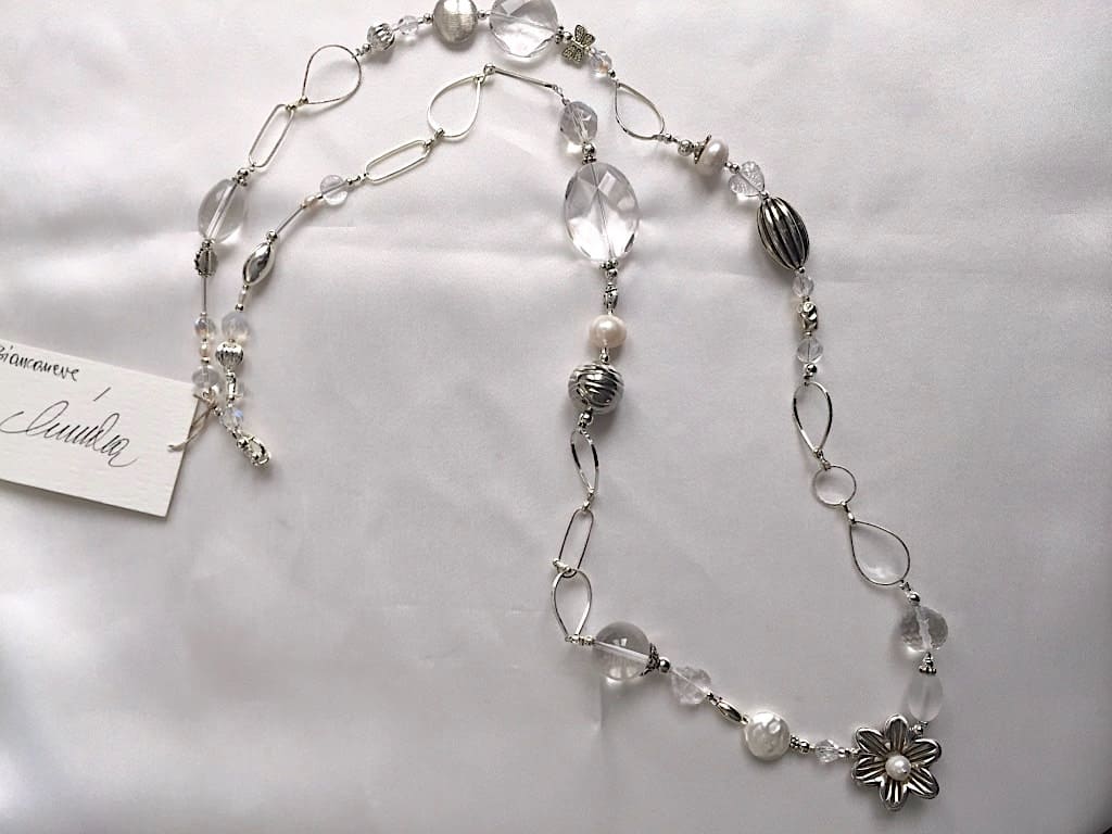 Una romantica e preziosa collana in cristallo di rocca, pietra dura scintillante grazie alle sue sfaccettature. La trasparenza di questo materiale la rende un accessorio in grado di risaltare su qualsiasi colore chiaro o scuro, vivace o spento. Rappresenta il complemento ideale per donare un tocco di eleganza e raffinatezza ad ogni vostro outfit. Oltre al cristallo di rocca di dimensioni importanti, troviamo cristalli di Boemia e pasta di vetro. Le luminose perle d’acqua dolce bianche hanno forme e dimensioni differenti.Le parti in metallo sono placcate argento, completamente senza nichel. Alcuni tratti di catena alleggeriscono visivamente il gioiello e guidano lo sguardo verso il fiore centrale, ingentilito da una perla. La lunghezza di circa 90 cm consente di indossare Biancaneve in due differenti modi. Oltre che lunga infatti la si può utilizzare doppia come uno scintillante girocollo. La accompagna un’ elegante confezione regalo.