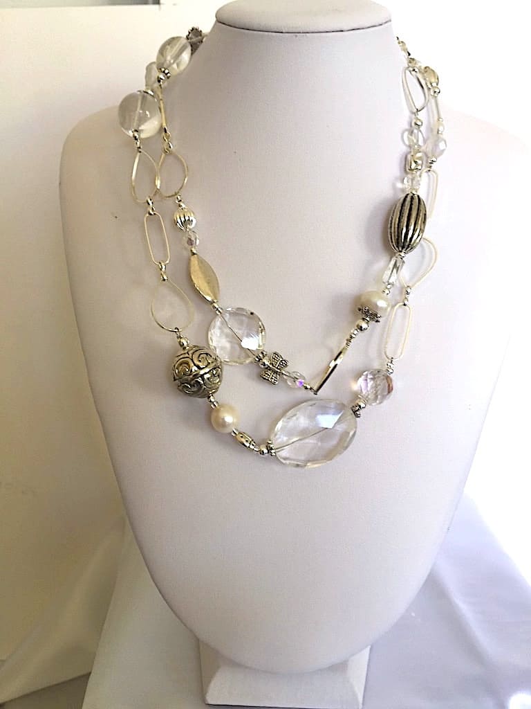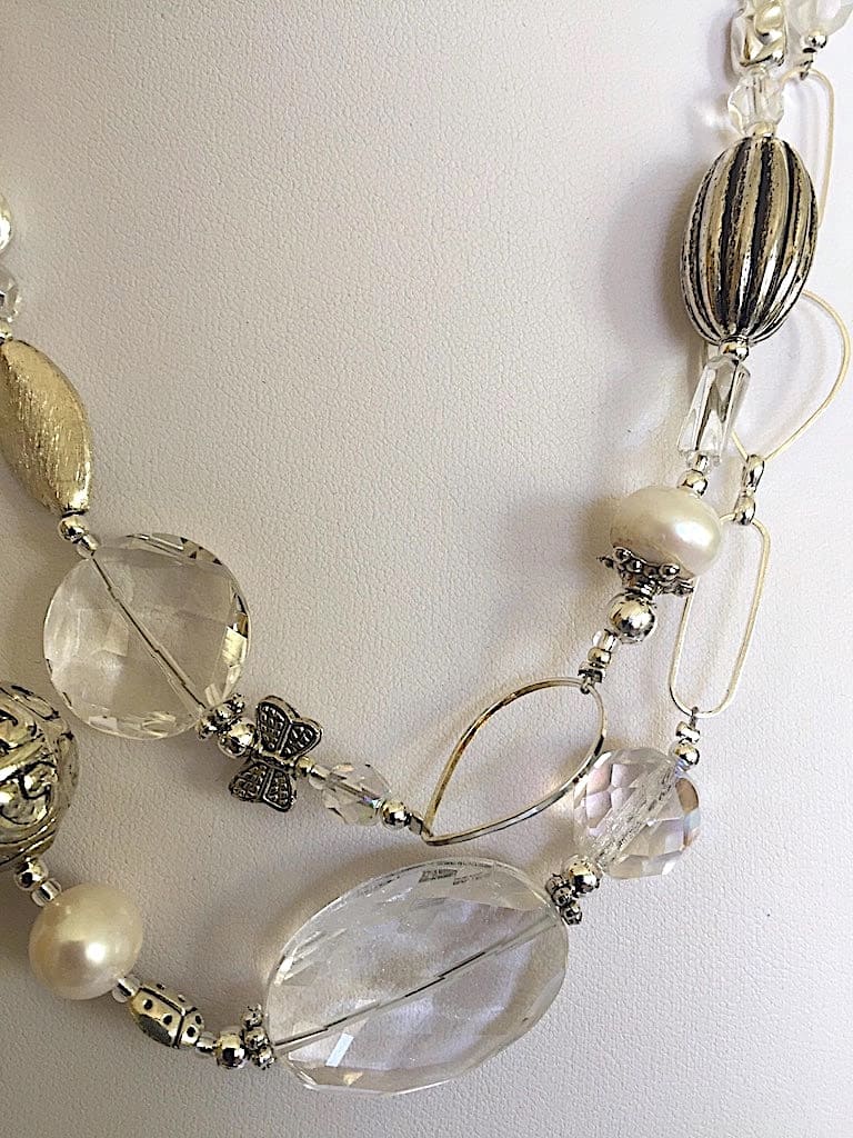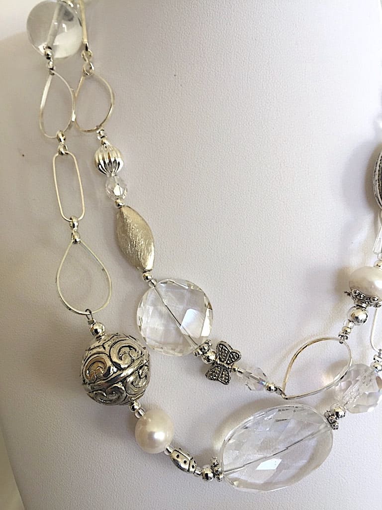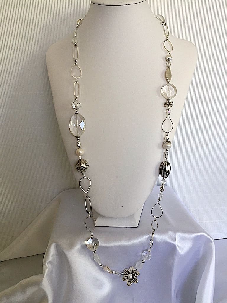 Una romantica e preziosa collana in cristallo di rocca, pietra dura scintillante grazie alle sue sfaccettature. La trasparenza di questo materiale la rende un accessorio in grado di risaltare su qualsiasi colore chiaro o scuro, vivace o spento. Rappresenta il complemento ideale per donare un tocco di eleganza e raffinatezza ad ogni vostro outfit. Oltre al cristallo di rocca di dimensioni importanti, troviamo cristalli di Boemia e pasta di vetro. Le luminose perle d’acqua dolce bianche hanno forme e dimensioni differenti.Le parti in metallo sono placcate argento, completamente senza nichel. Alcuni tratti di catena alleggeriscono visivamente il gioiello e guidano lo sguardo verso il fiore centrale, ingentilito da una perla. La lunghezza di circa 90 cm consente di indossare Biancaneve in due differenti modi. Oltre che lunga infatti la si può utilizzare doppia come uno scintillante girocollo. La accompagna un’ elegante confezione regalo.