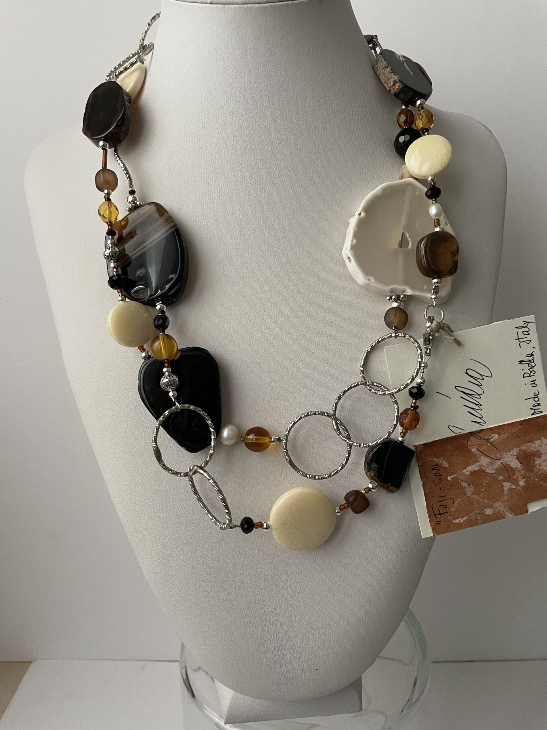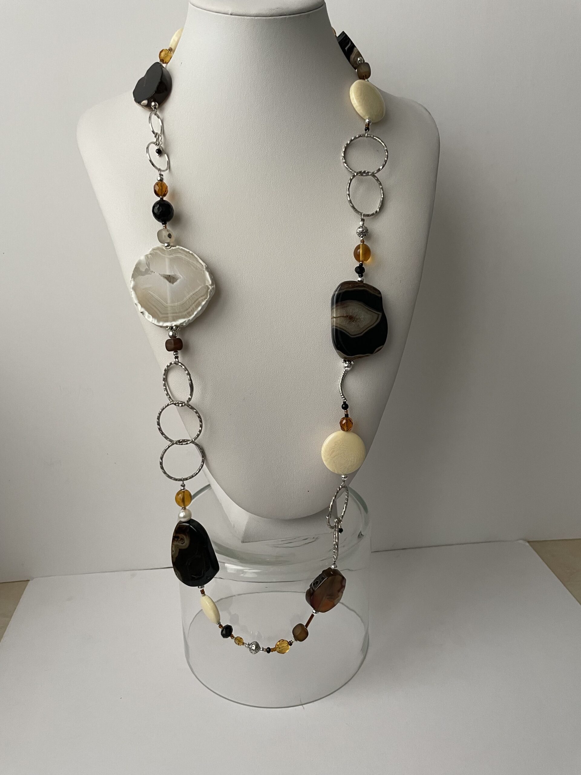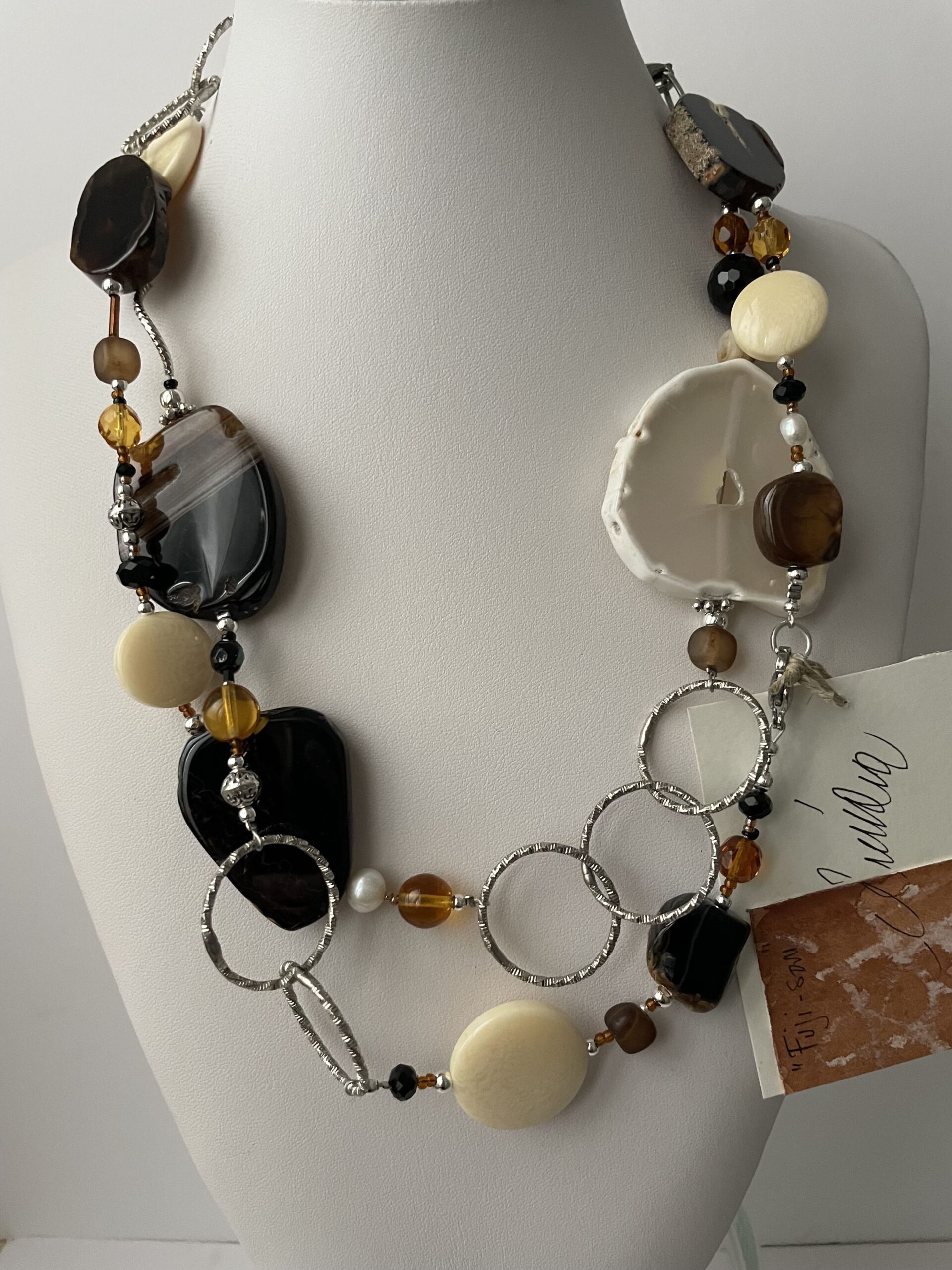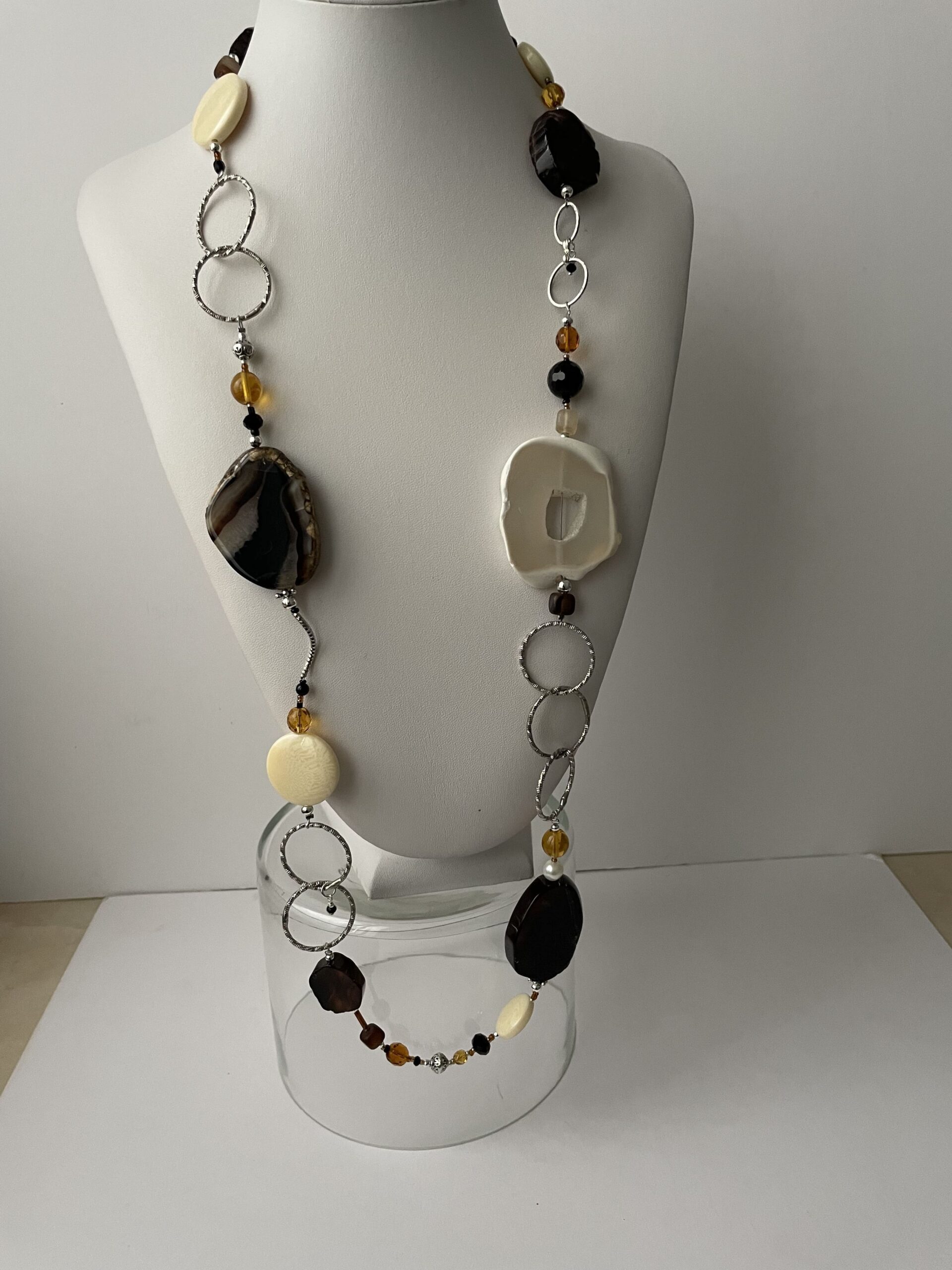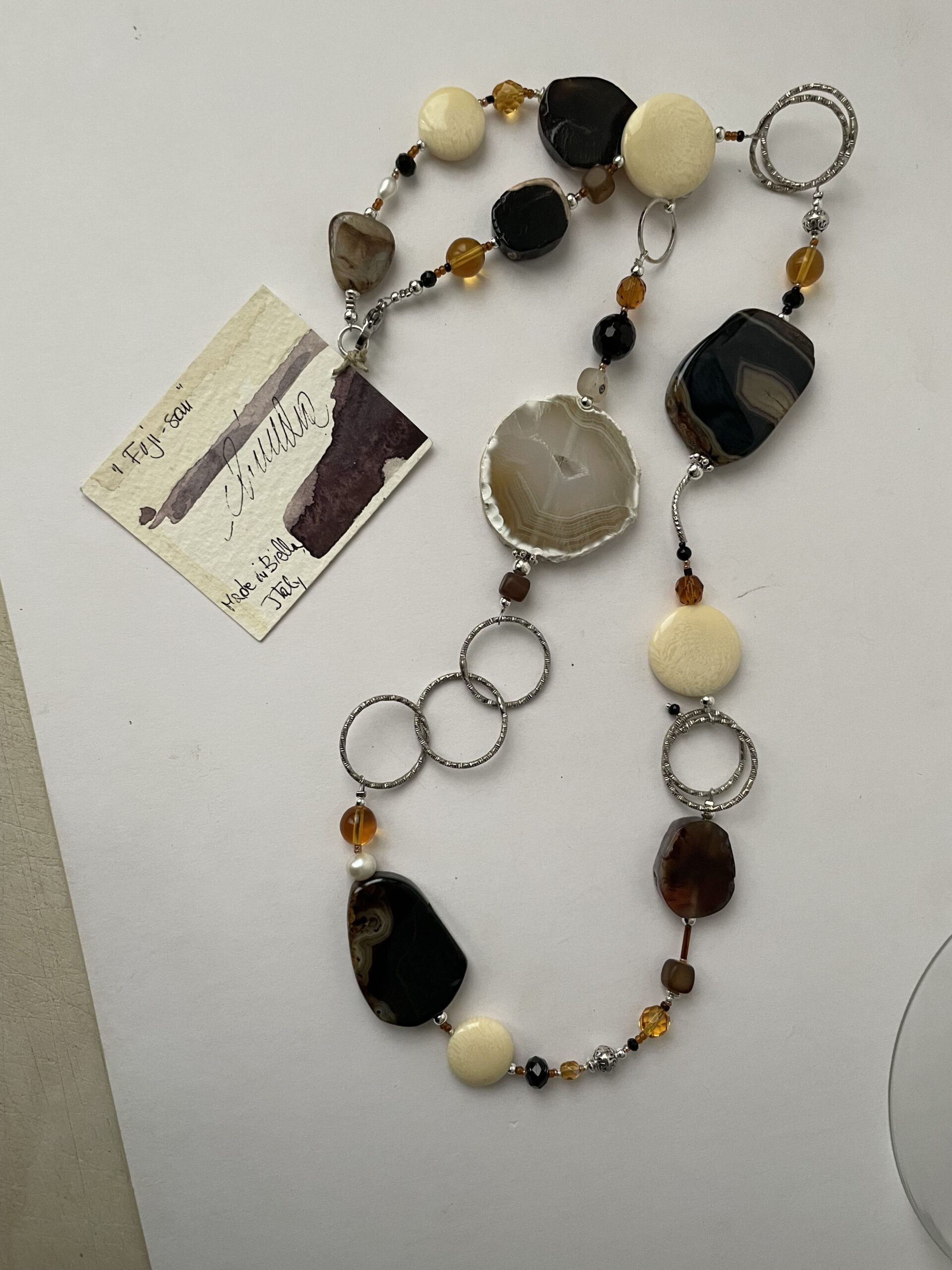 Alcuni tondi piccoli e grandi in osso creano pause di luce e rendono più varia Fuji-san. Troviamo inoltre perle di fiume bianche , cristalli di Boemia marrone dorato. Tratti di catena in acciaio a grandi cerchi ritmano l’alternarsi delle pietre .