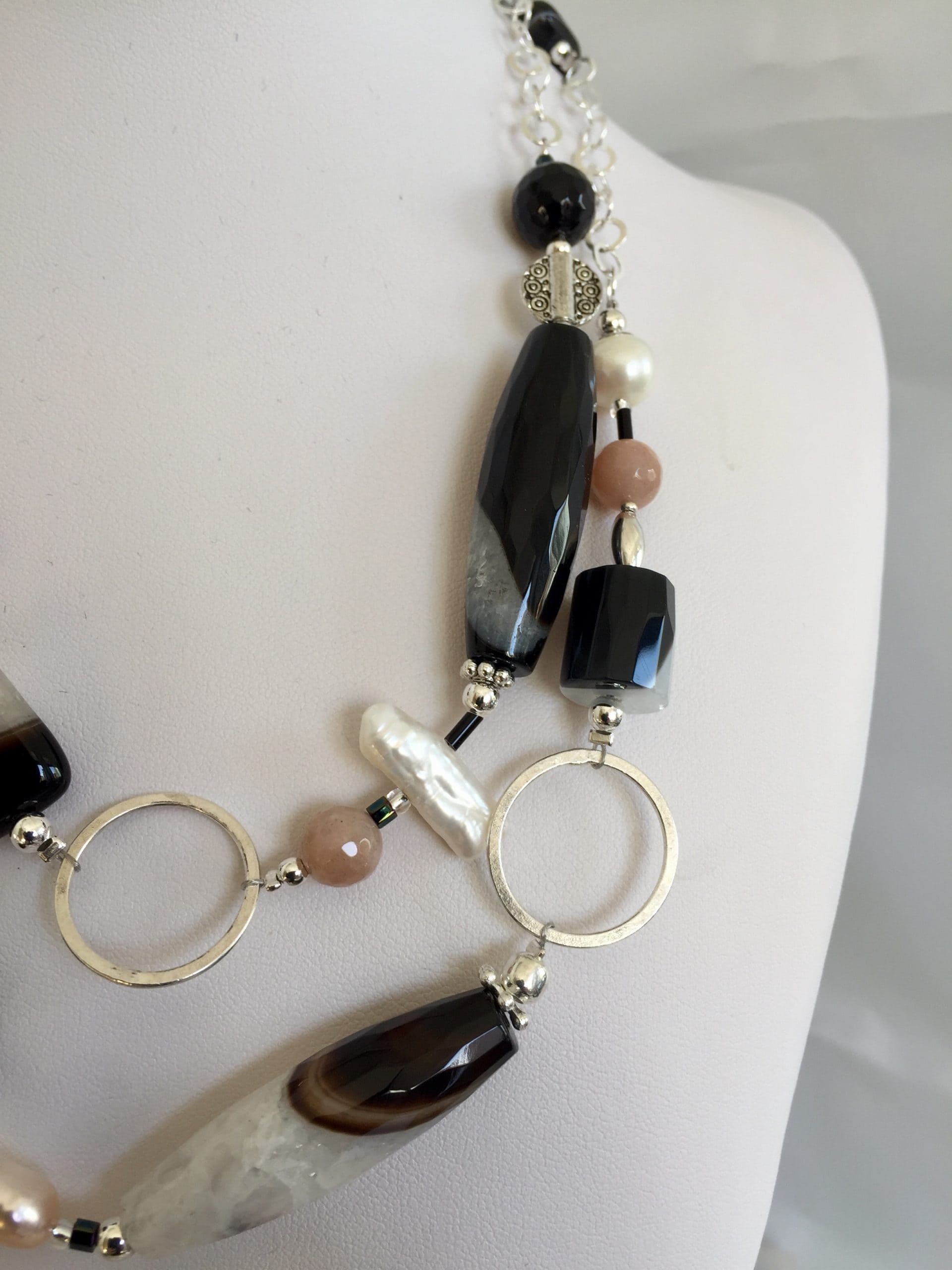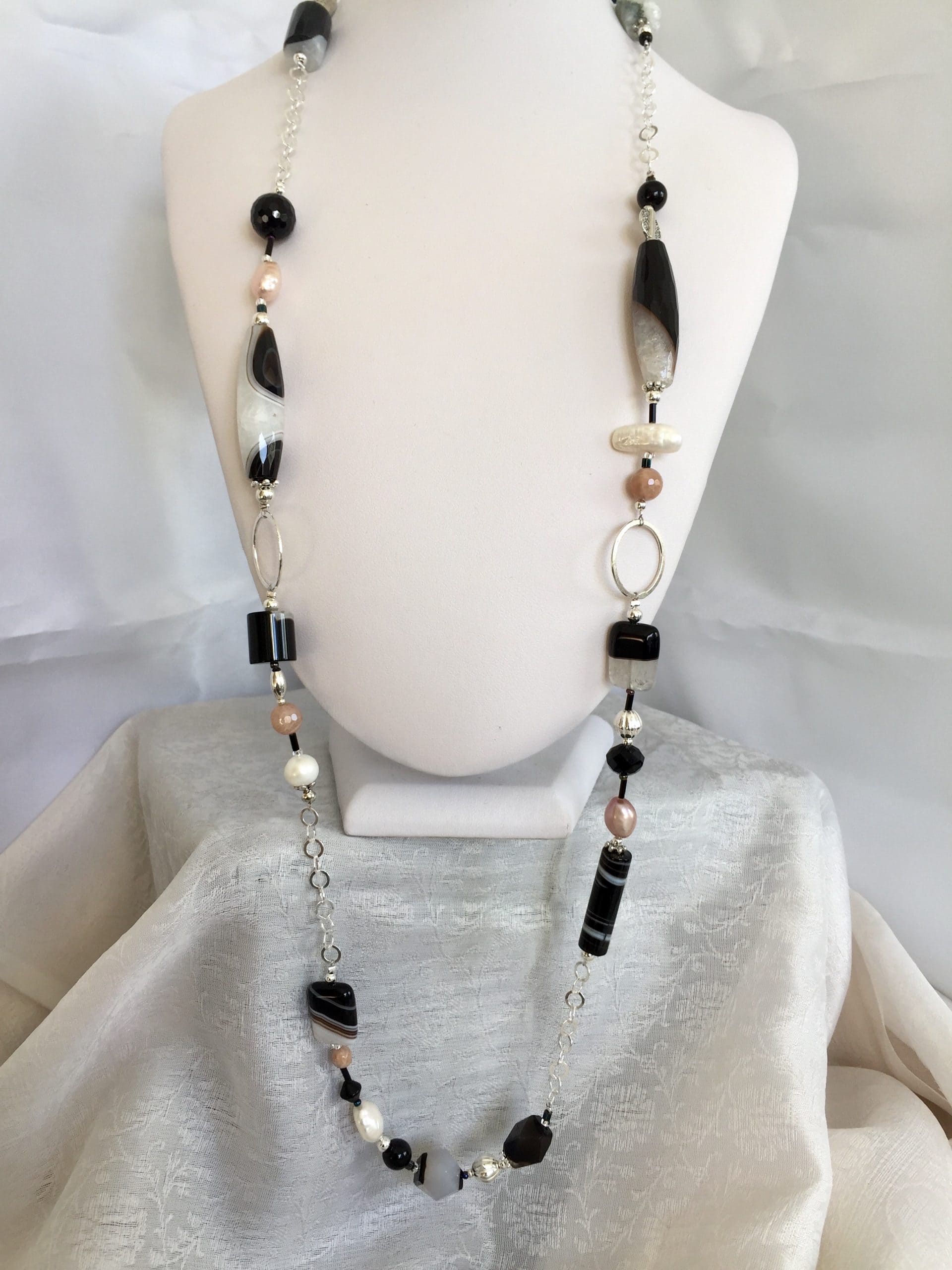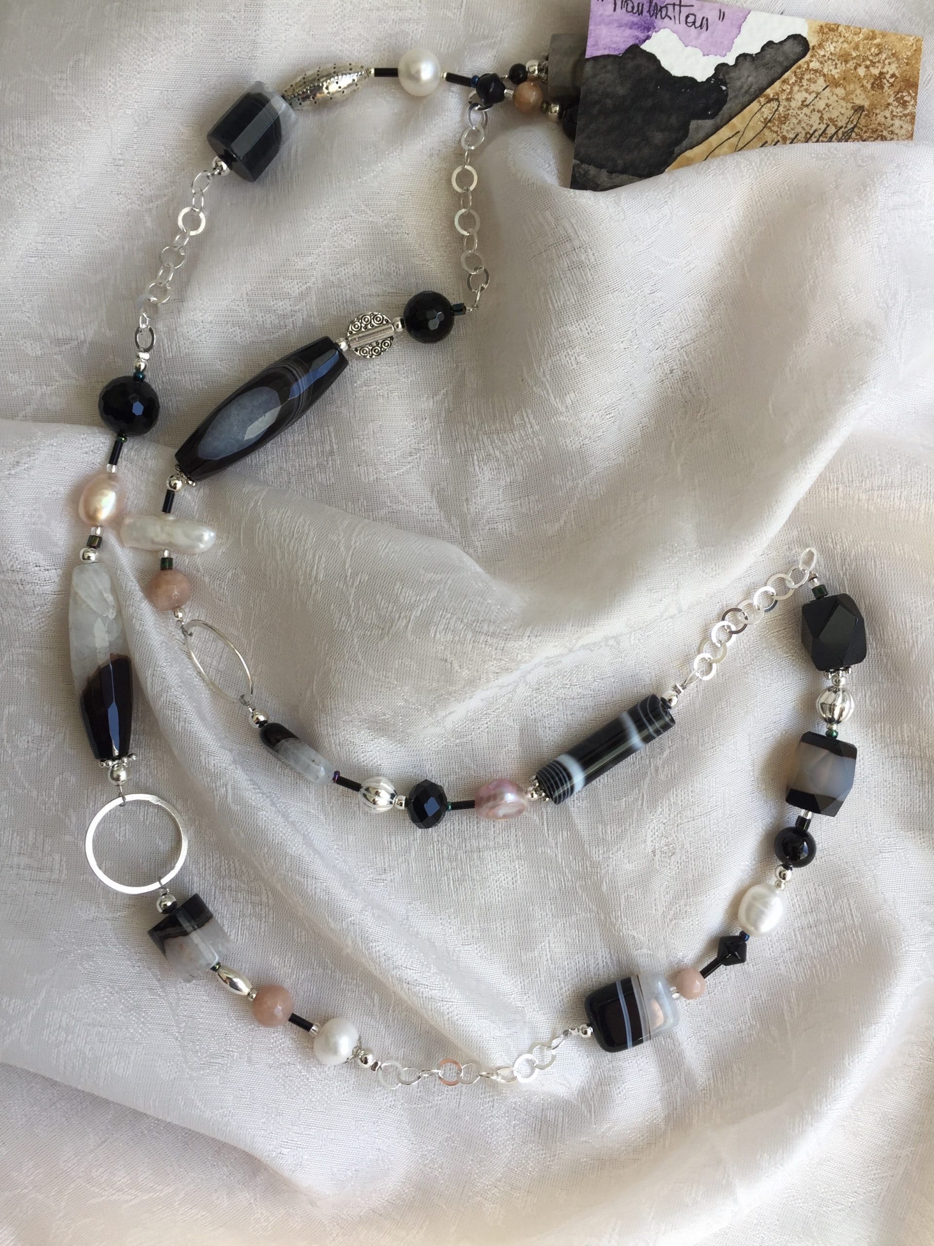 Manhattan è la collana realizzata con onice, agata e pietra di luna, abbinate a perle di fiume bianche e rosa dalle diverse forme; il fascino intramontabile del bianco e nero è sottolineato dalla catena e dagli anelli in argento italiano, così come il moschettone di chiusura. L’accostamento delle belle pietre dure naturali si arricchisce di forme sempre diverse caratterizzate dalla particolare colorazione. La sua lunghezza (89 cm circa) le consente un duplice utilizzo: oltre che lunga, si può indossare a due giri come un girocollo di grande effetto ed eleganza.