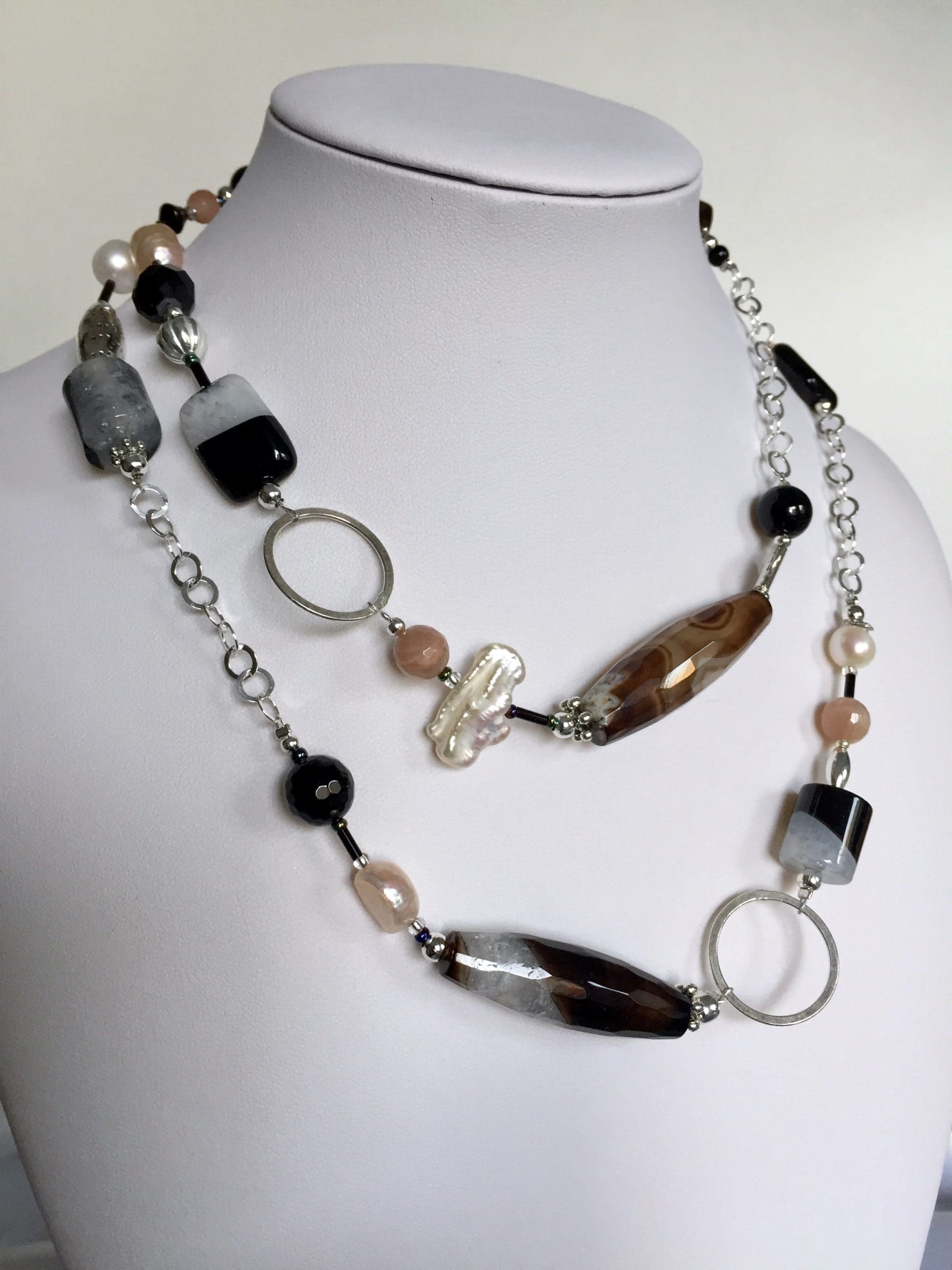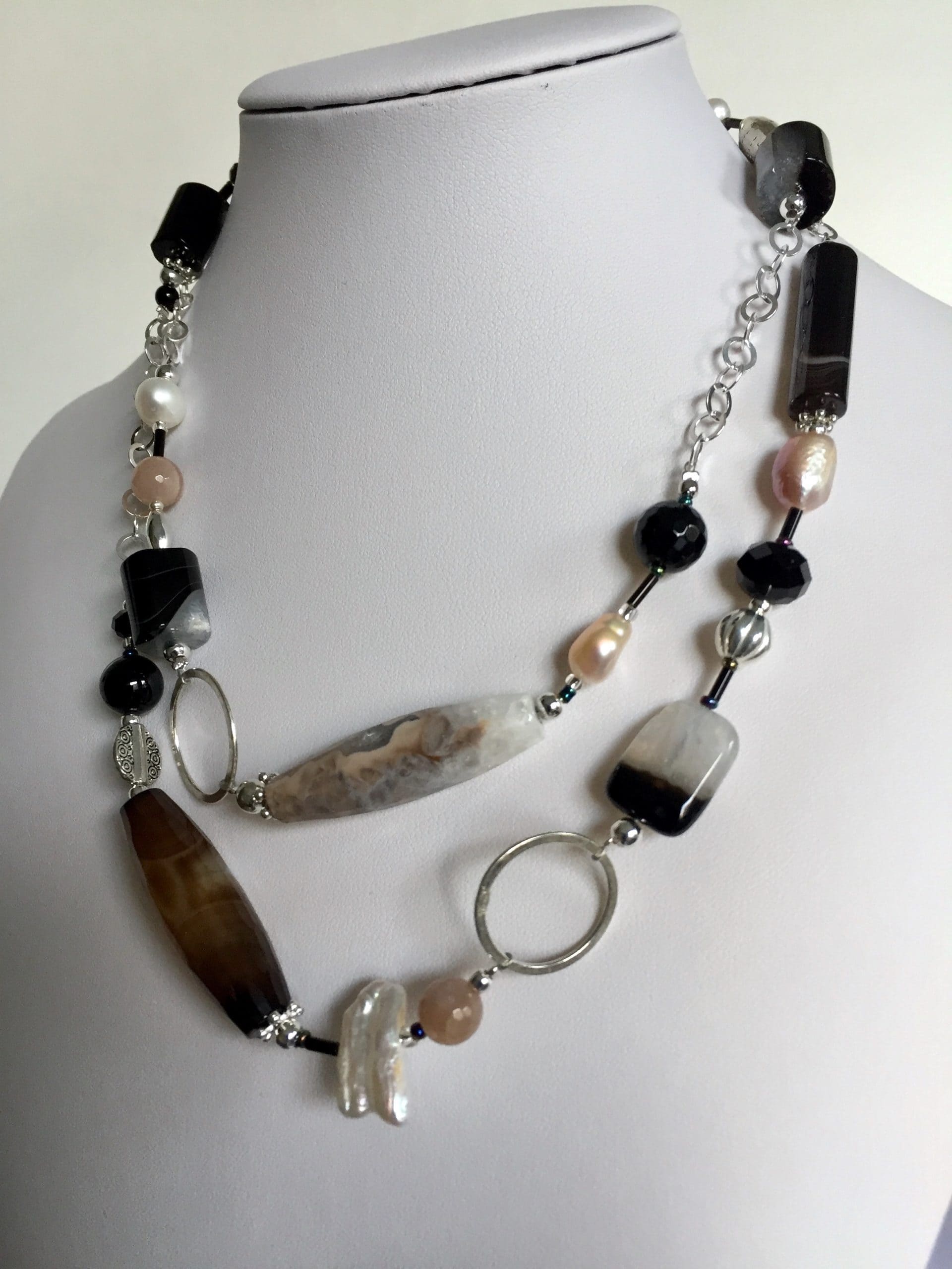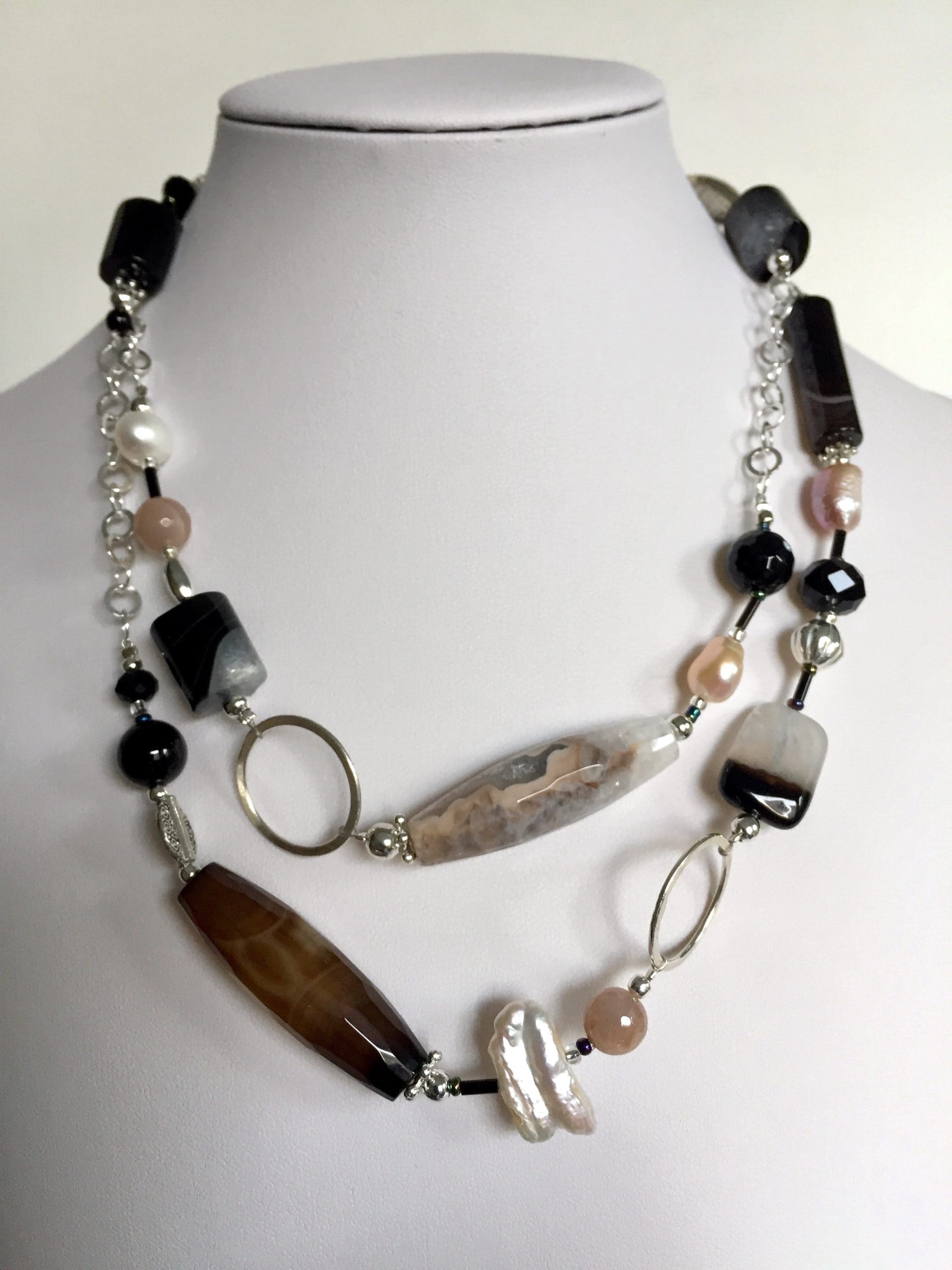 Manhattan è la collana realizzata con onice, agata e pietra di luna, abbinate a perle di fiume bianche e rosa dalle diverse forme; il fascino intramontabile del bianco e nero è sottolineato dalla catena e dagli anelli in argento italiano, così come il moschettone di chiusura. L’accostamento delle belle pietre dure naturali si arricchisce di forme sempre diverse caratterizzate dalla particolare colorazione. La sua lunghezza (89 cm circa) le consente un duplice utilizzo: oltre che lunga, si può indossare a due giri come un girocollo di grande effetto ed eleganza.