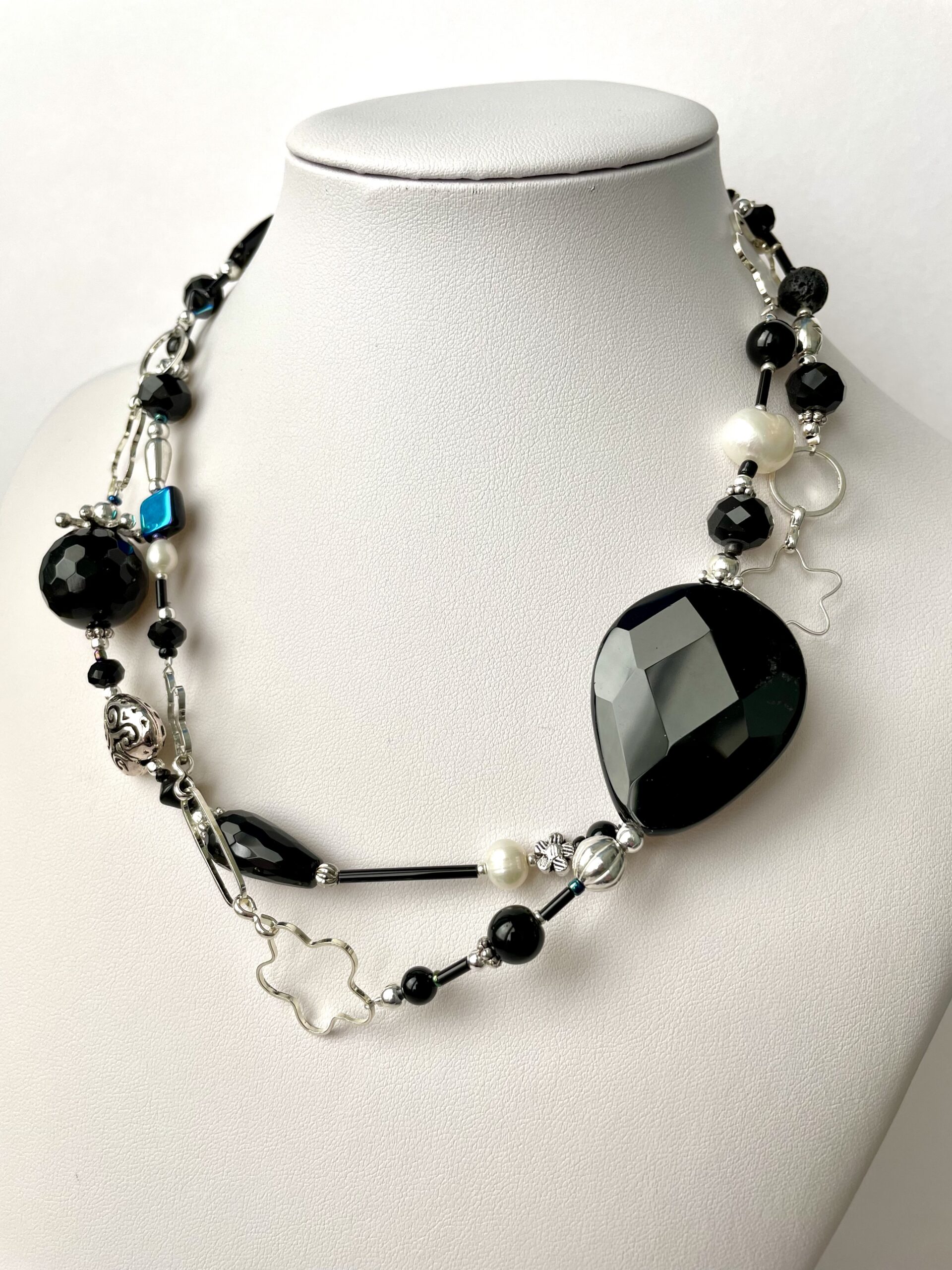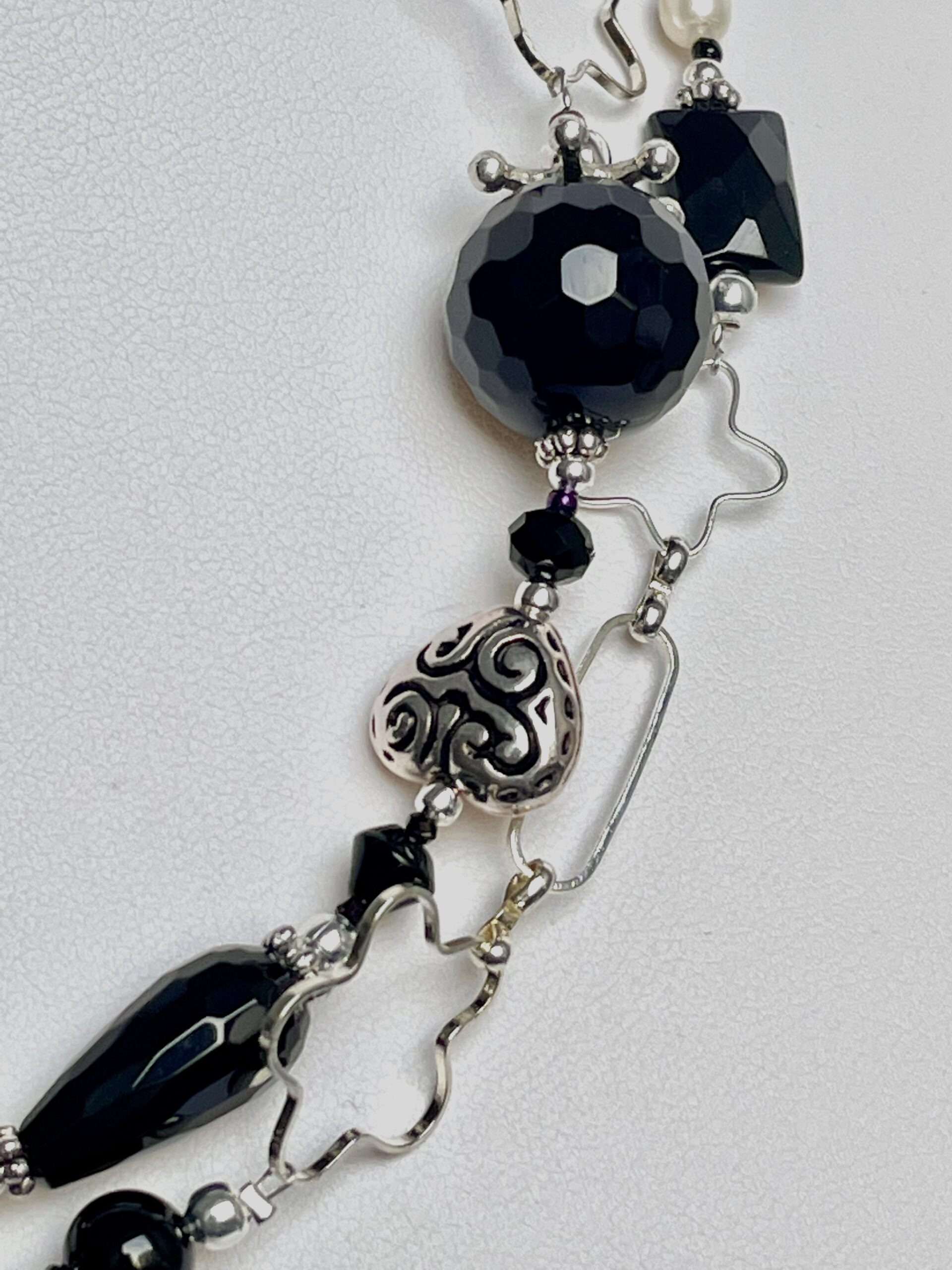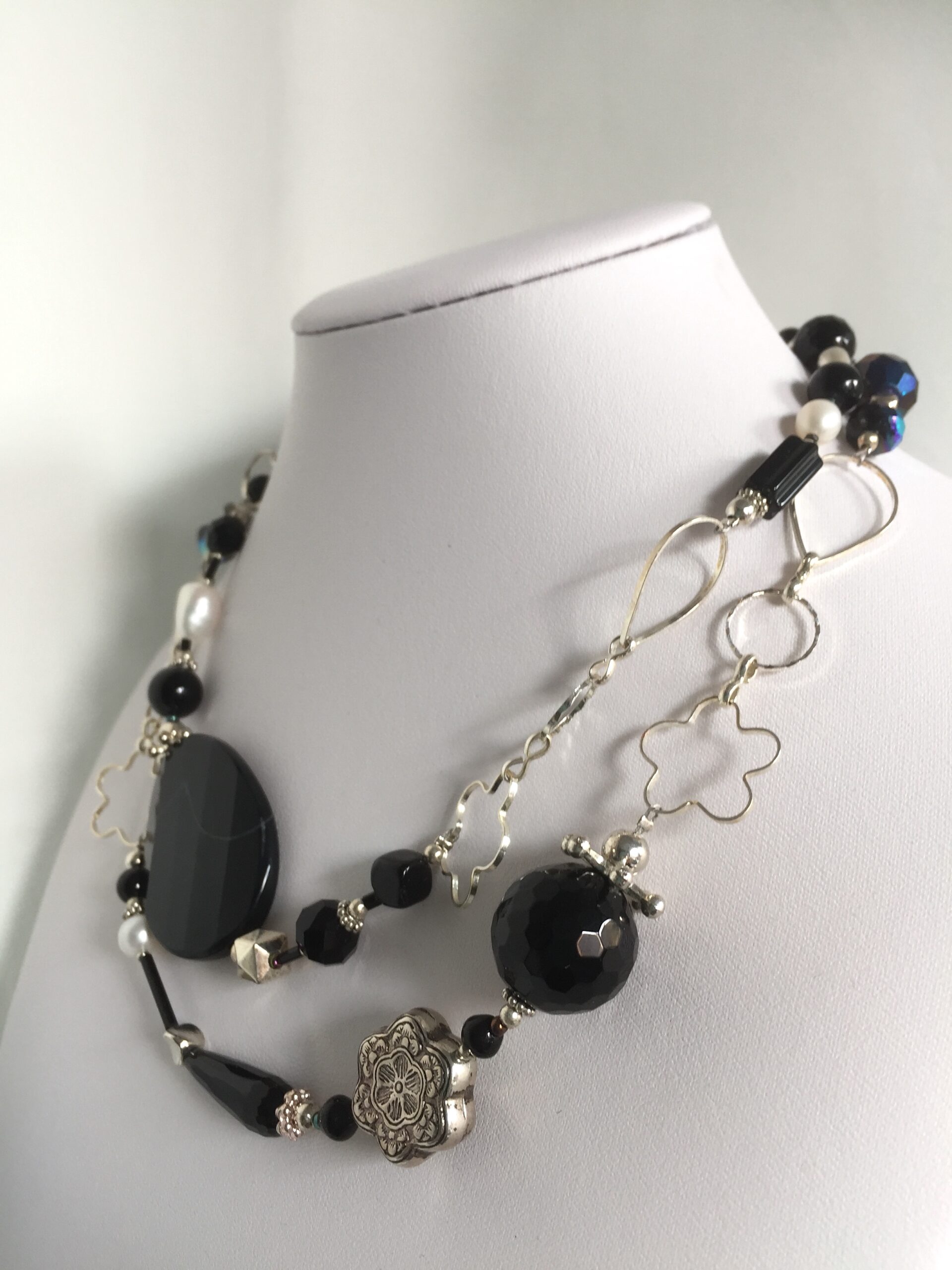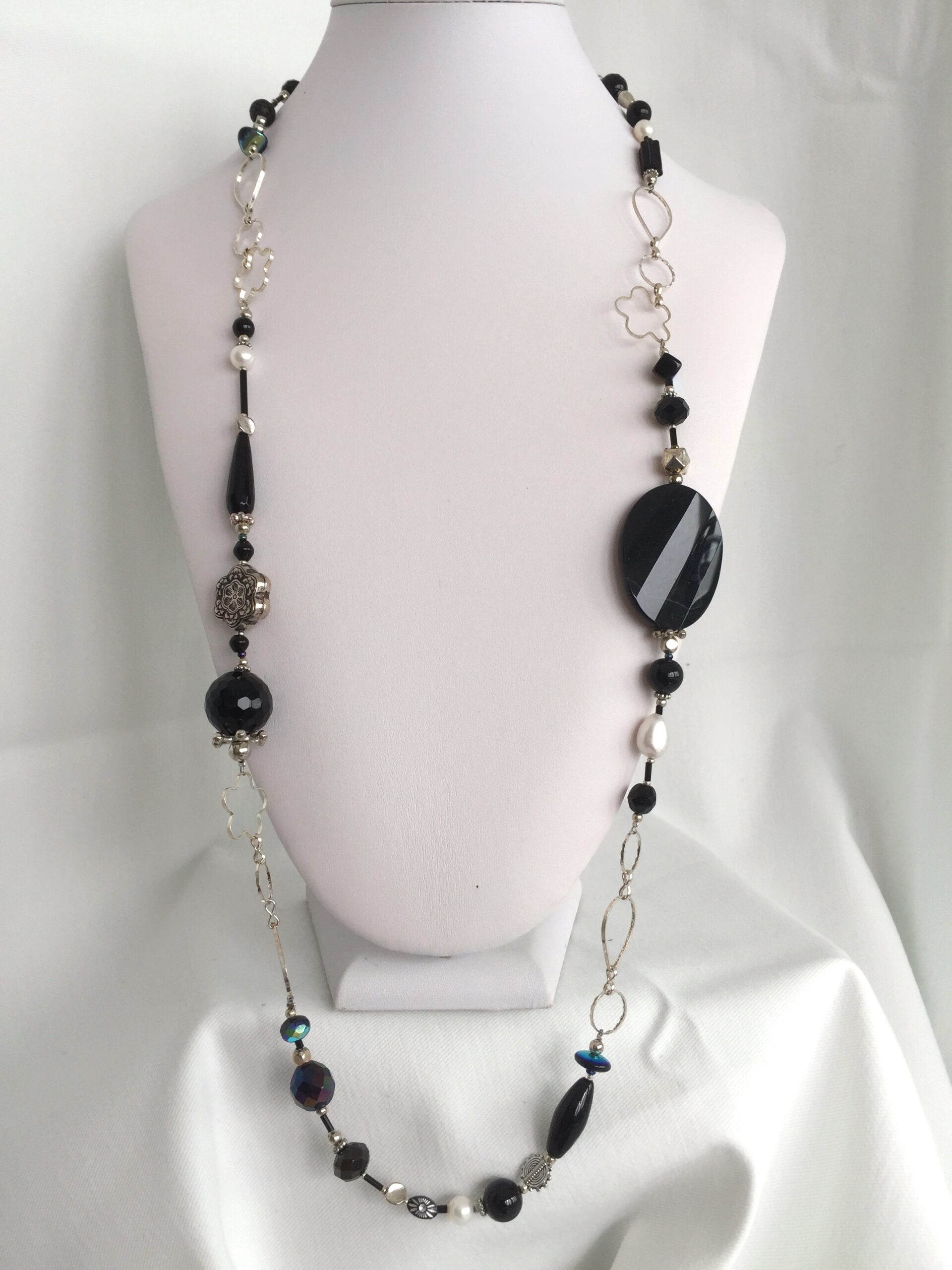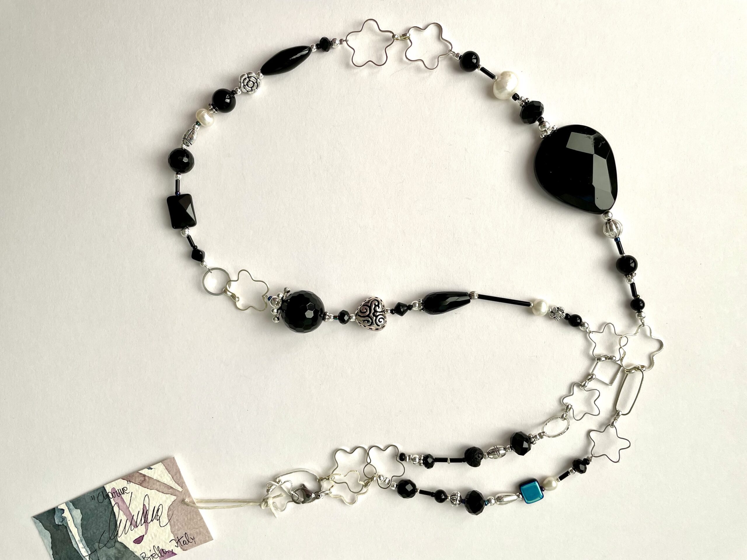 Collana lunga in onice. I materiali che la compongono sono, oltre all’onice, agata, perle di fiume dalla morbida luce, cristalli e pasta di vetro. L’alternarsi delle pietre lisce e sfaccettate con la luminosa catena argentata la rendono un gioiello scintillante e magico. I materiali che la compongono sono, oltre all’onice, agata, perle di fiume dalla morbida luce, cristalli e pasta di vetro.