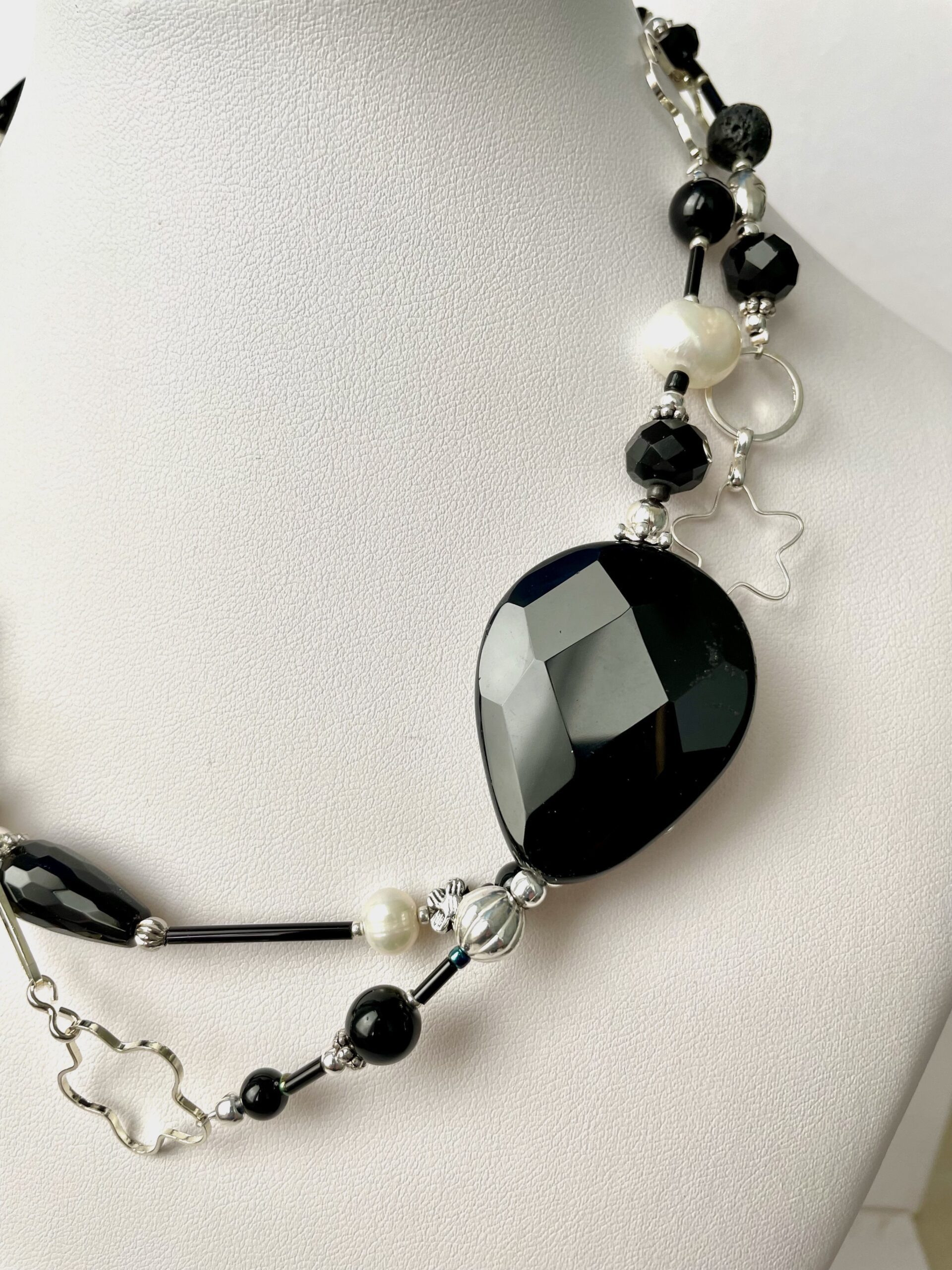 Charme è un gioiello completamente artigianale e unico, come le pietre che lo costituiscono. E’ possibile portarla lunga per un uso più quotidiano e metropolitano, o doppia come un elegante e luminoso girocollo. Il nero assoluto dell’onice ne fa un vero passe-partout su capi di qualsia colore. Ogni parte in metallo è nichel free.