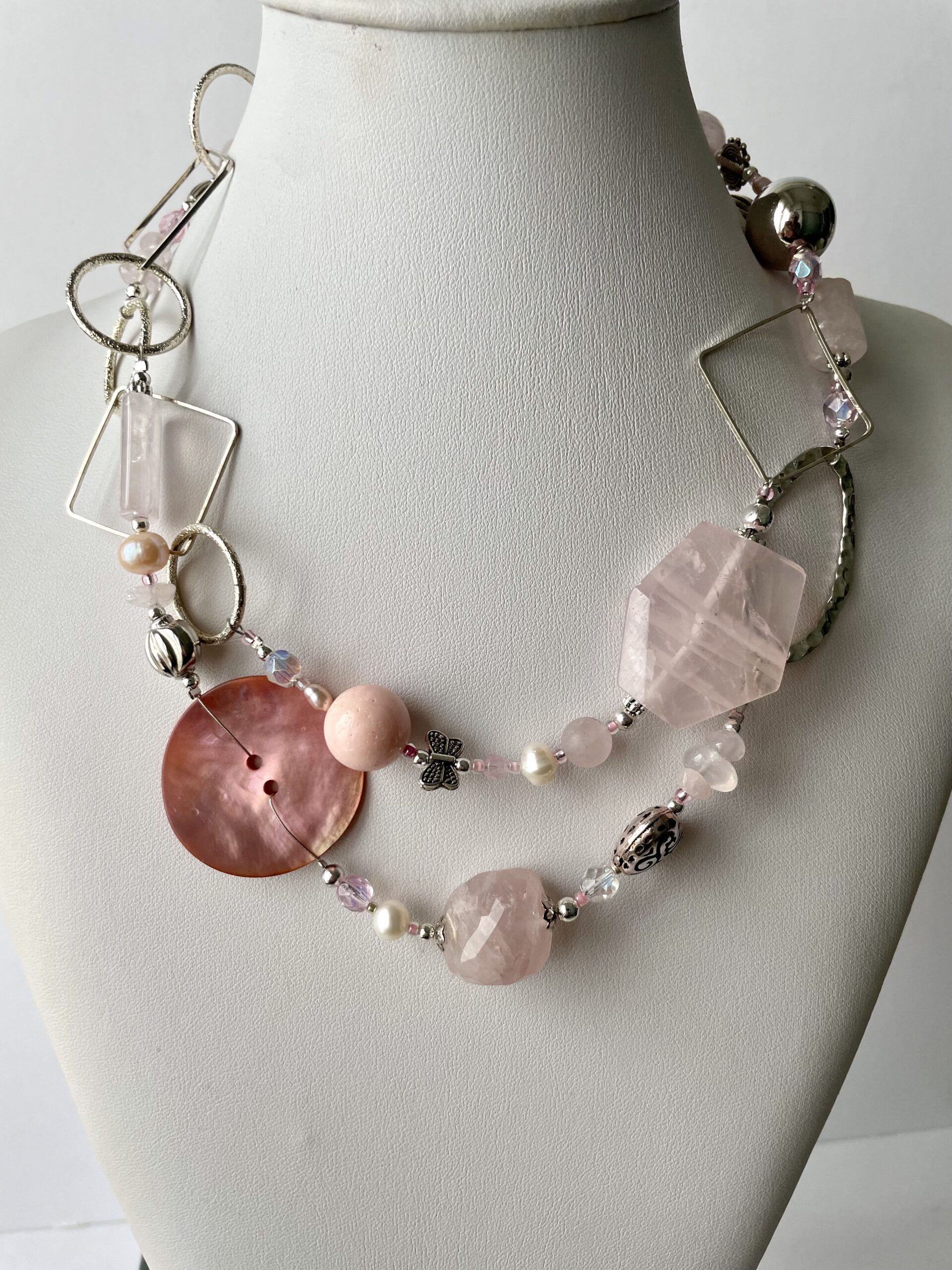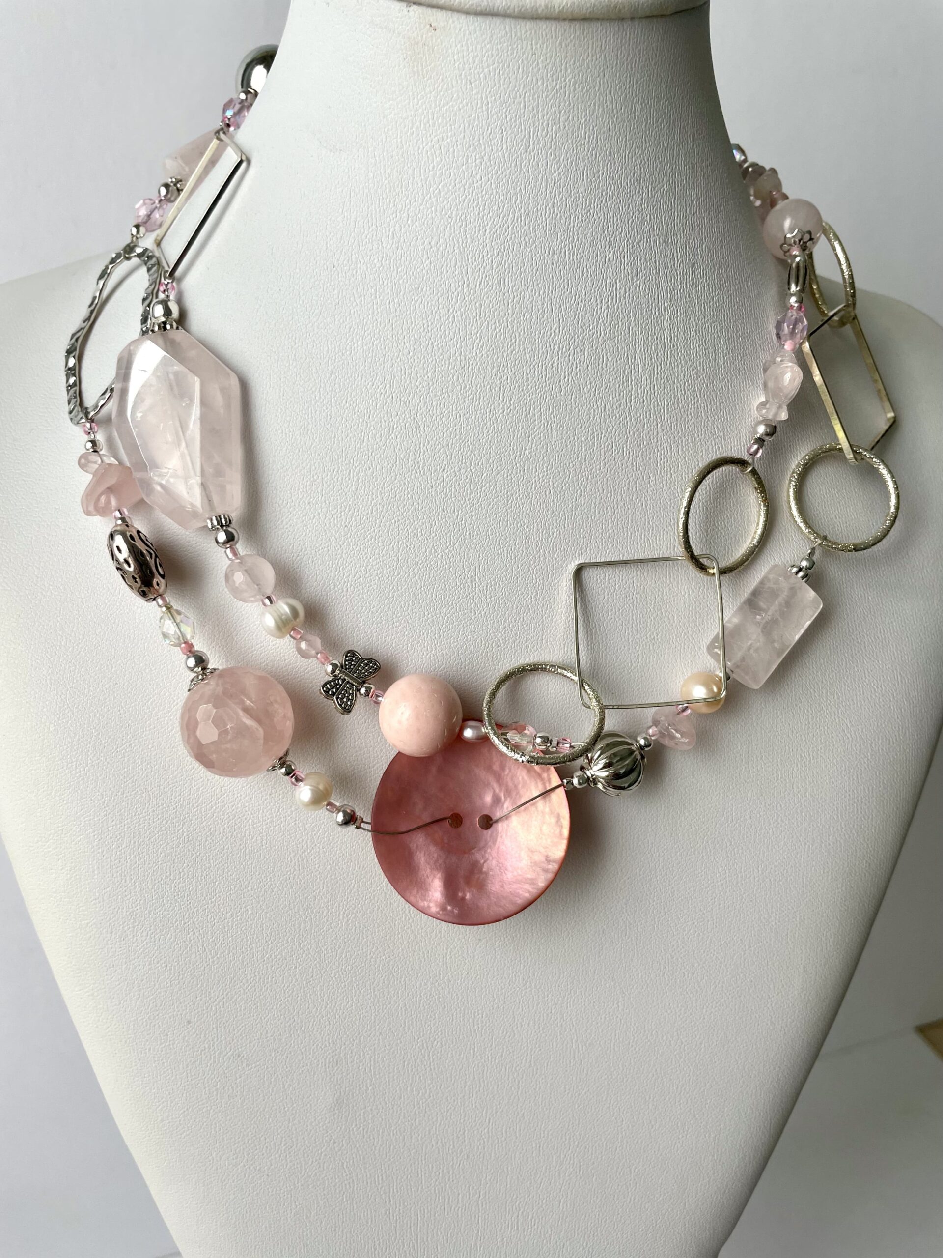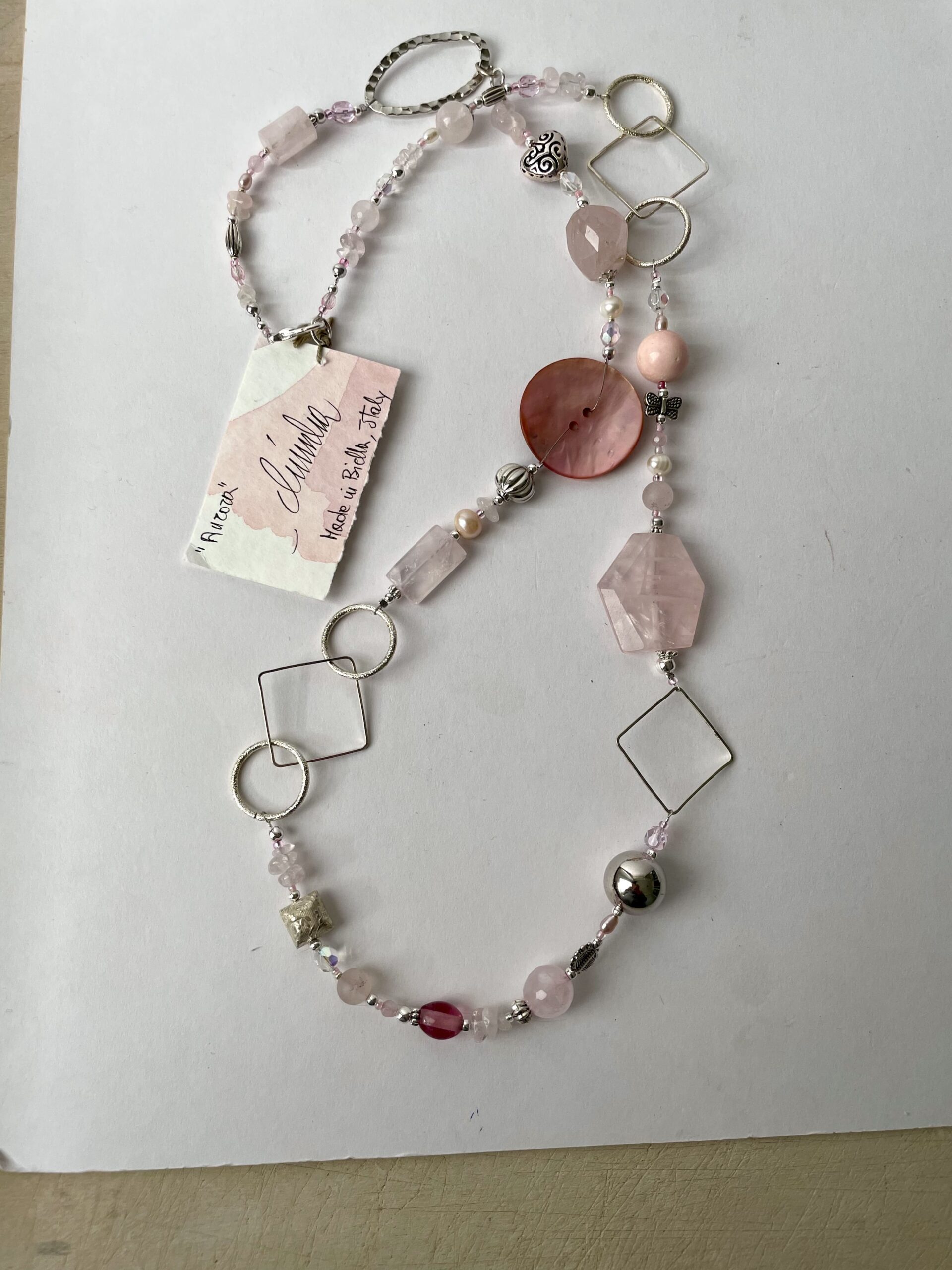 AURORA è la romantica collana realizzata in elegante quarzo rosa liscio e sfaccettato. Alle pietre dure vengono accostati altri materiali di pregio come cristalli di Boemia, perle di fiume bianche e rosate, pasta di vetro. Alcuni tratti in catena ritmano il gioiello e sono tutti in metallo placcato argento nickel free.