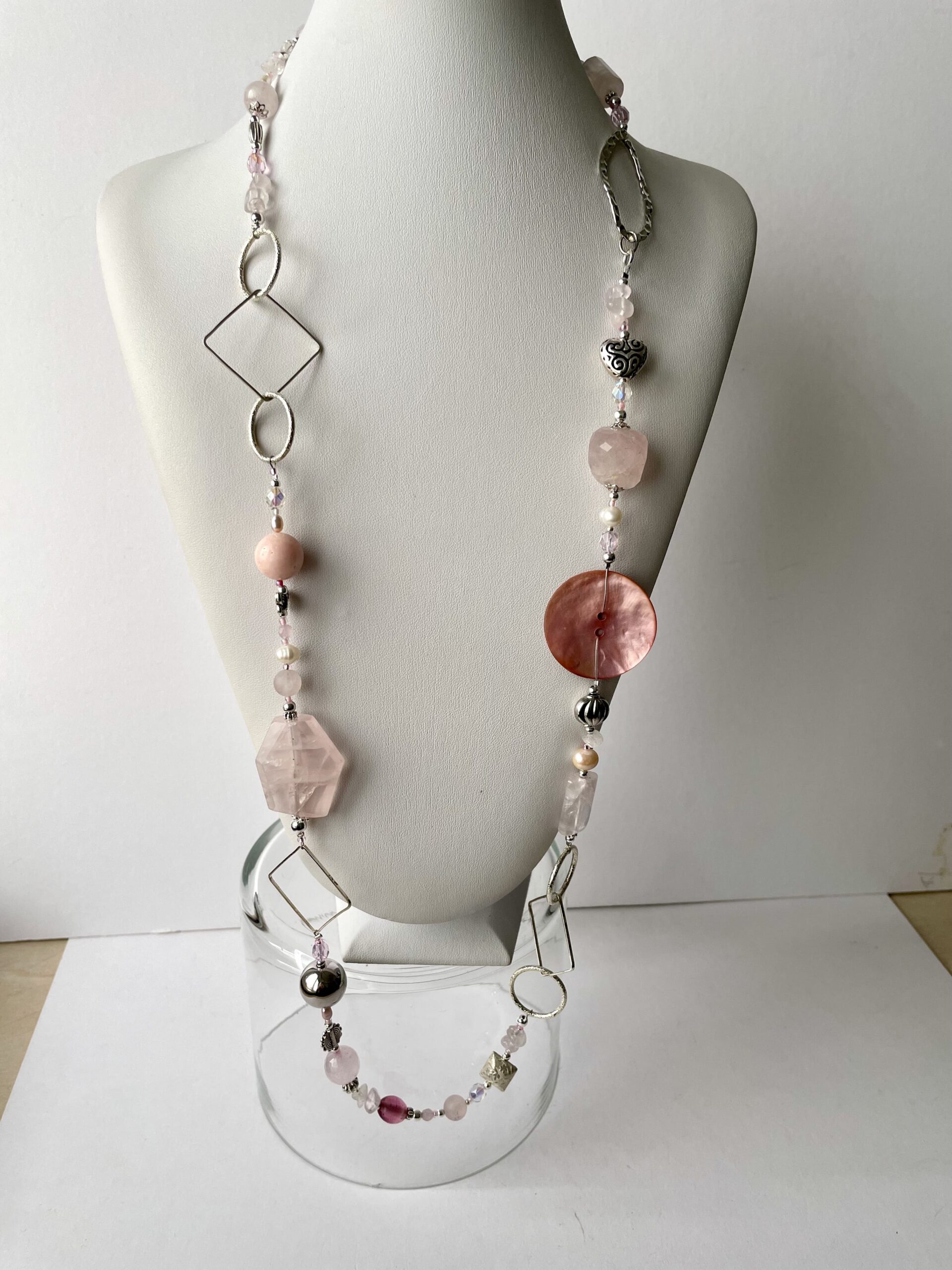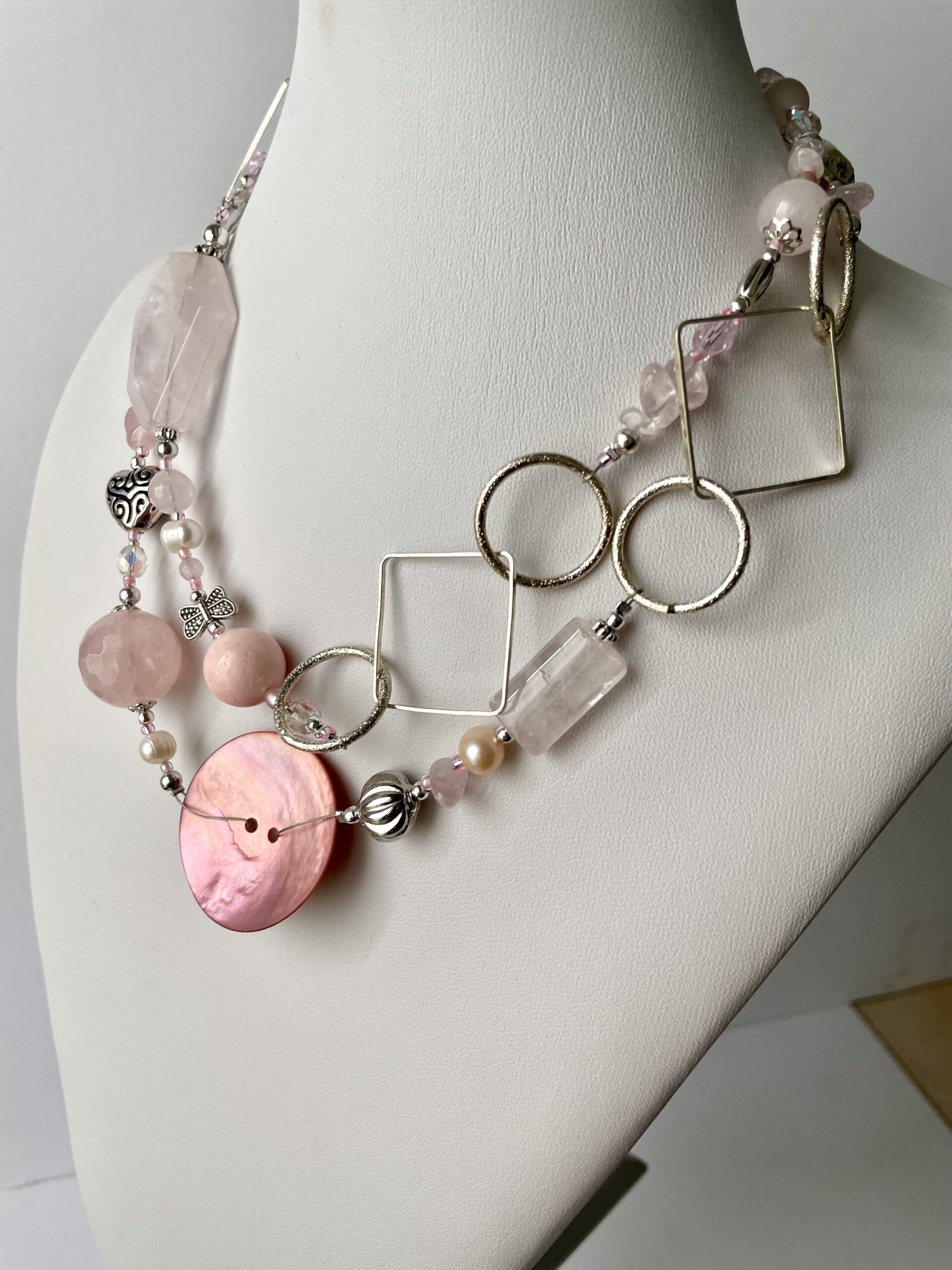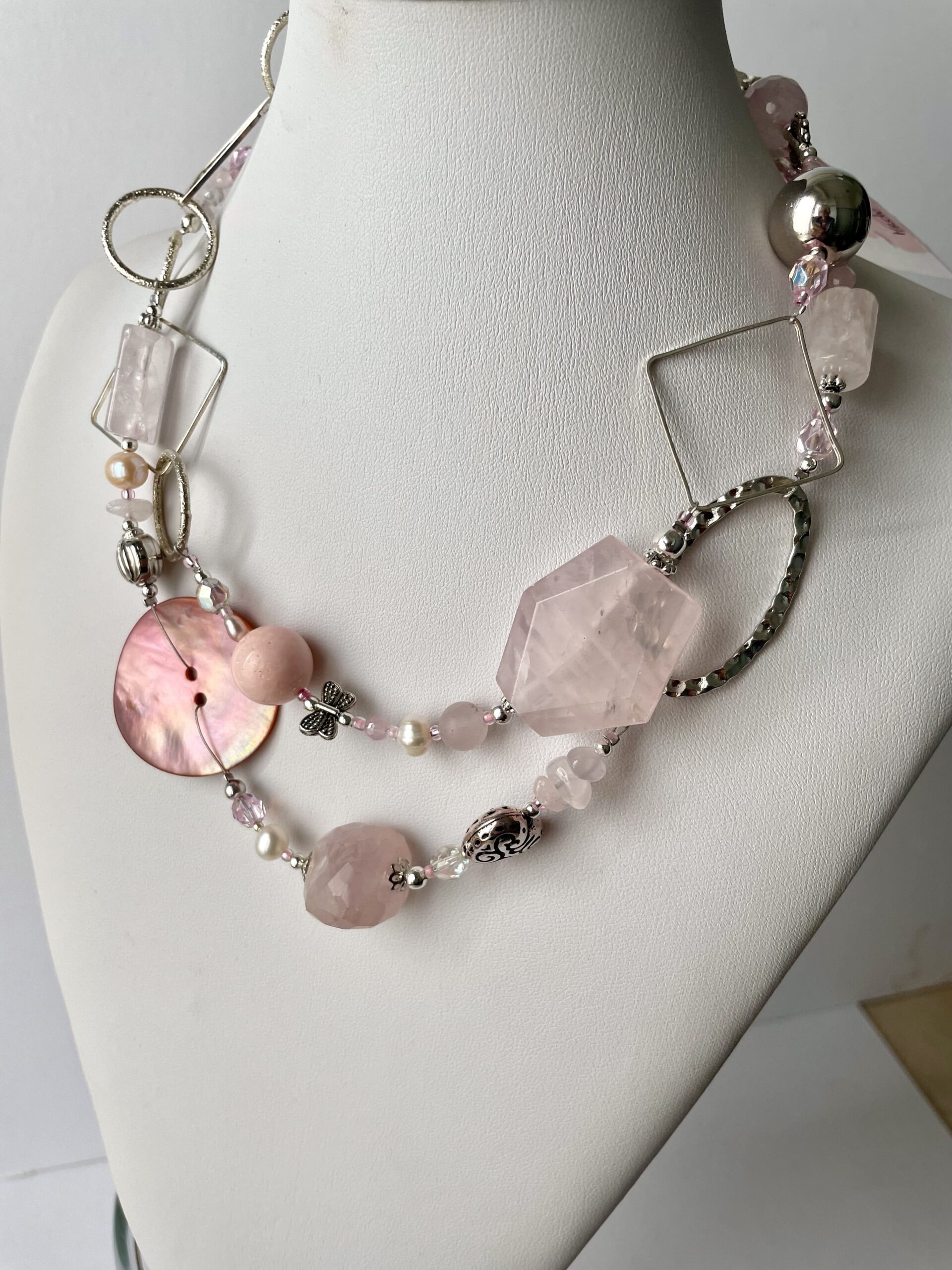 AURORA è la romantica collana realizzata in elegante quarzo rosa liscio e sfaccettato. Alle pietre dure vengono accostati altri materiali di pregio come cristalli di Boemia, perle di fiume bianche e rosate, pasta di vetro. Alcuni tratti in catena ritmano il gioiello e sono tutti in metallo placcato argento nickel free.