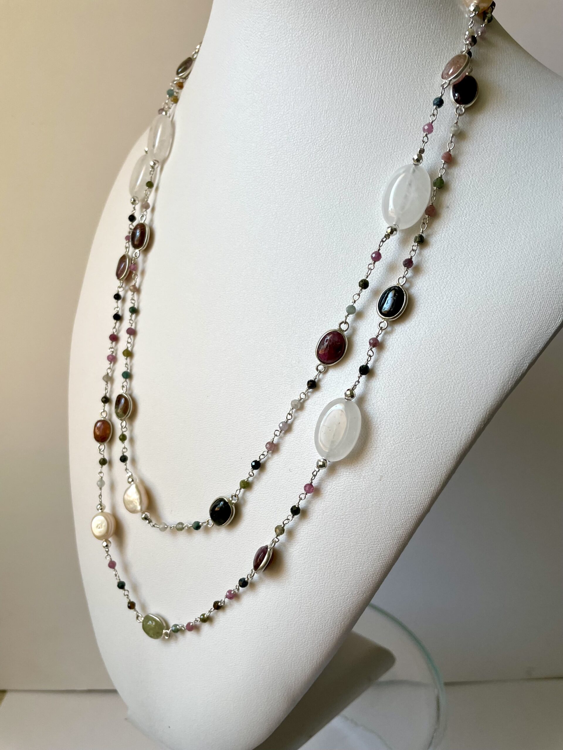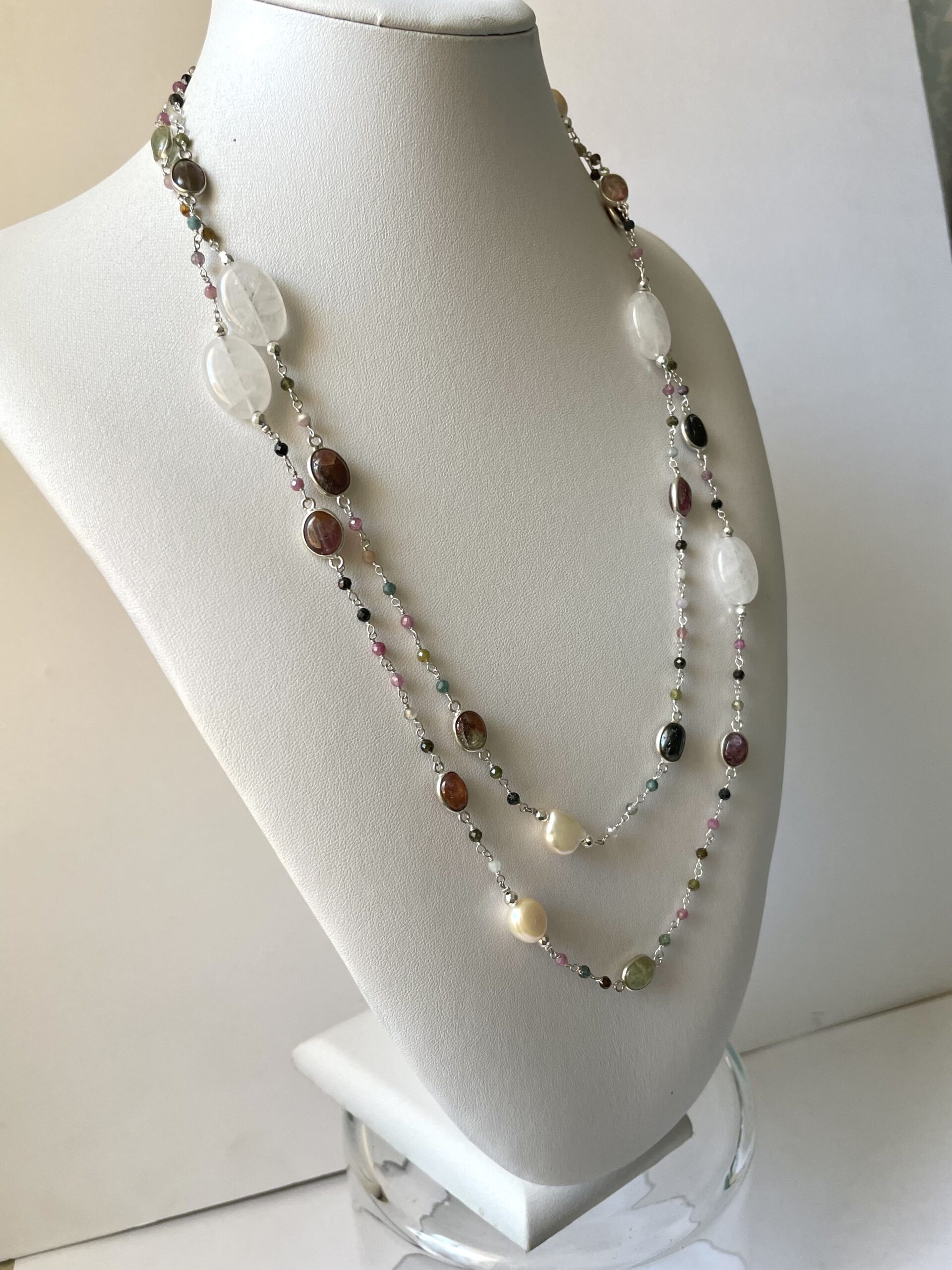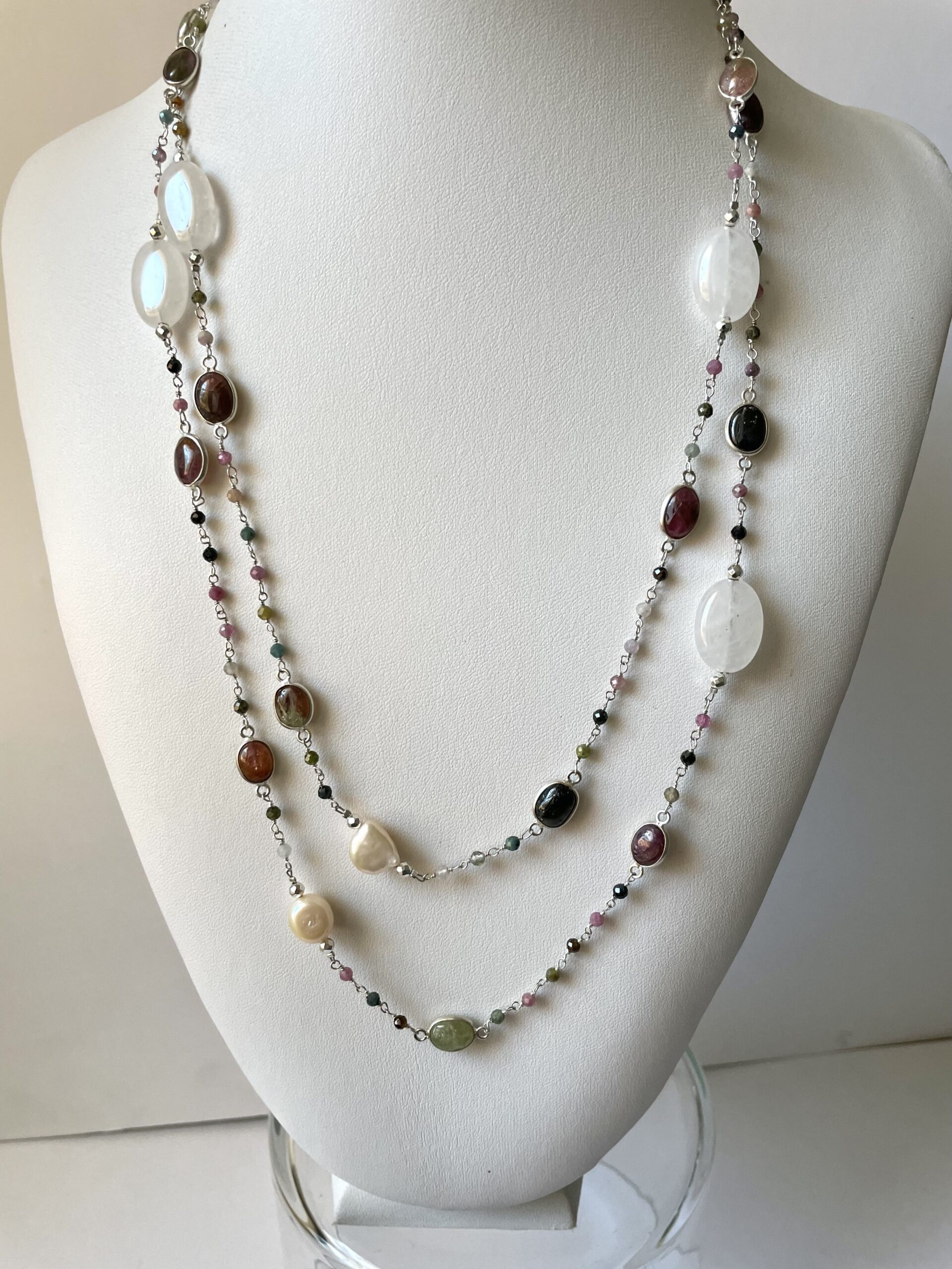 Preziosa tormalina in formato piccolo e grande incorniciato in argento, quarzo rosa dal colore delicato, grandi perle barocche rosa. Il tutto incatenato in argento 925, come anche il moschettone di chiusura.