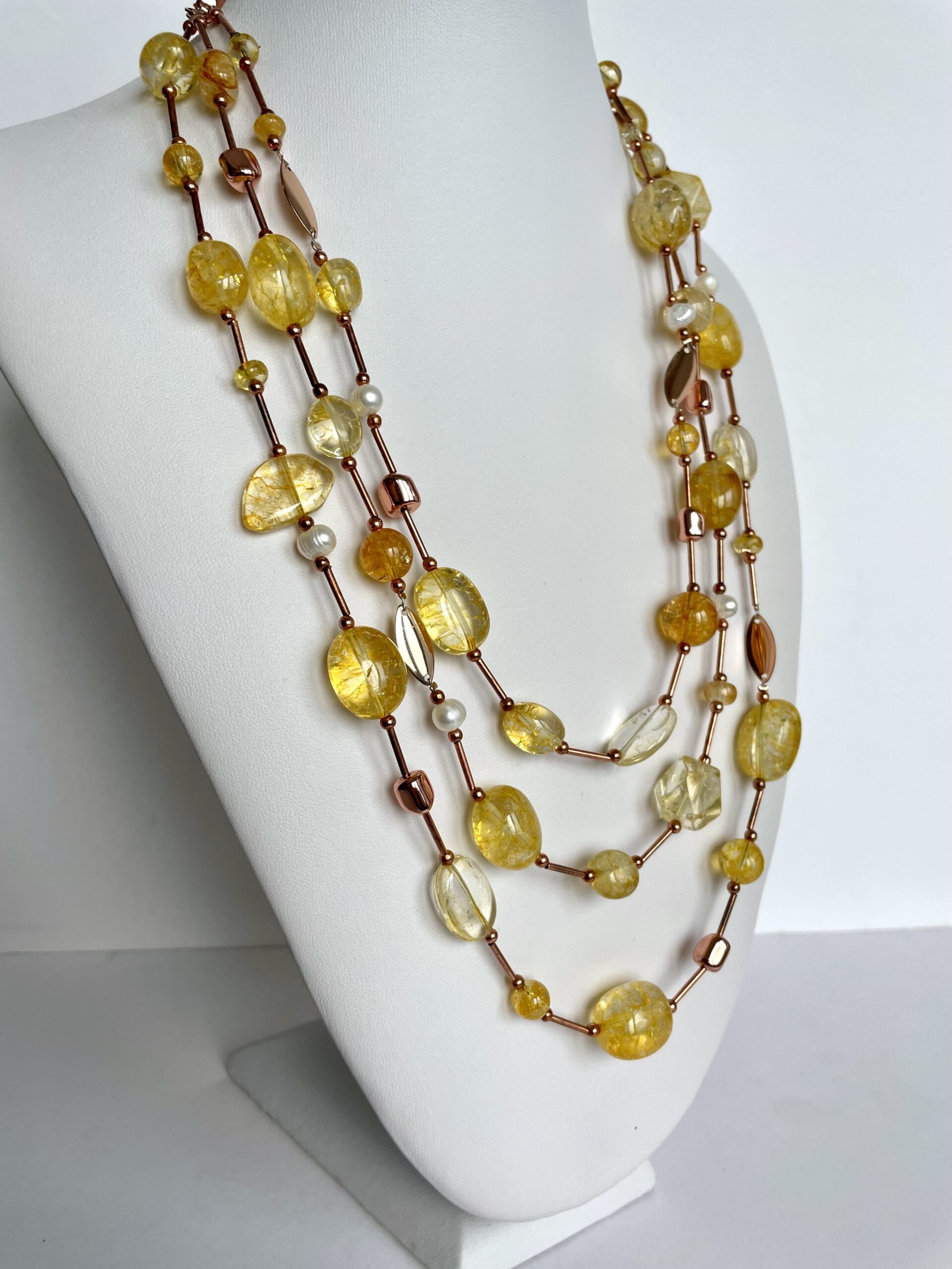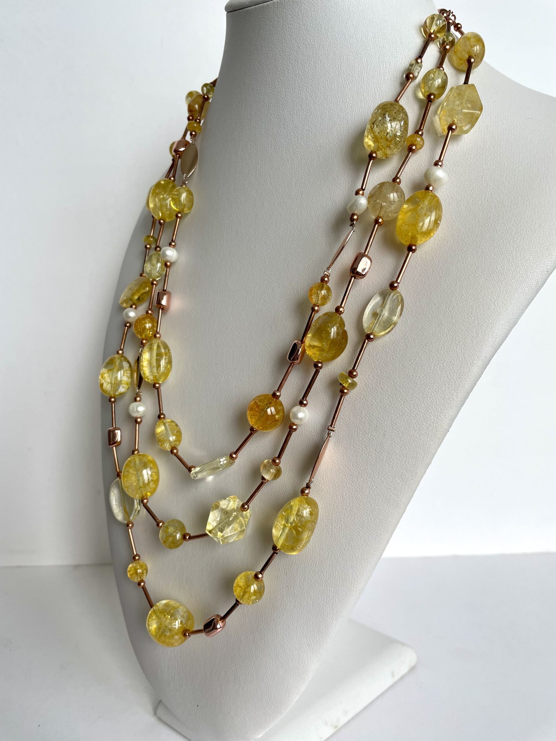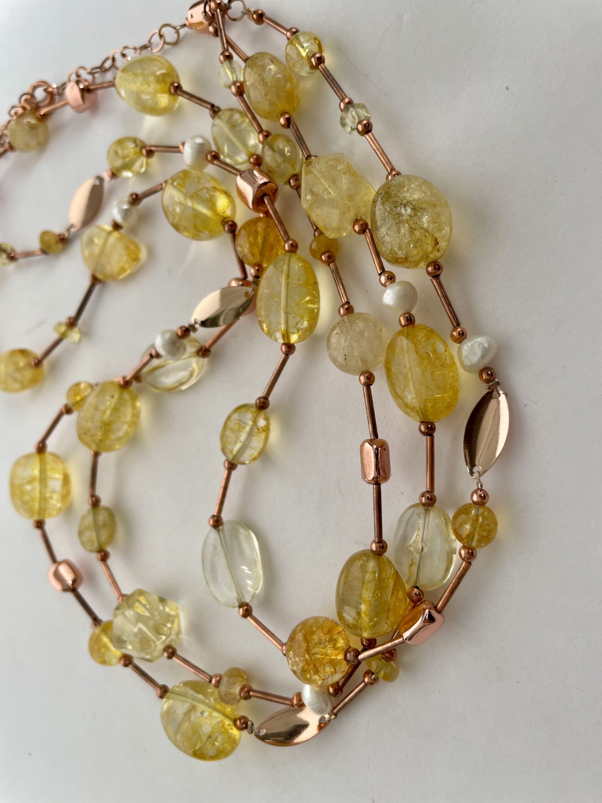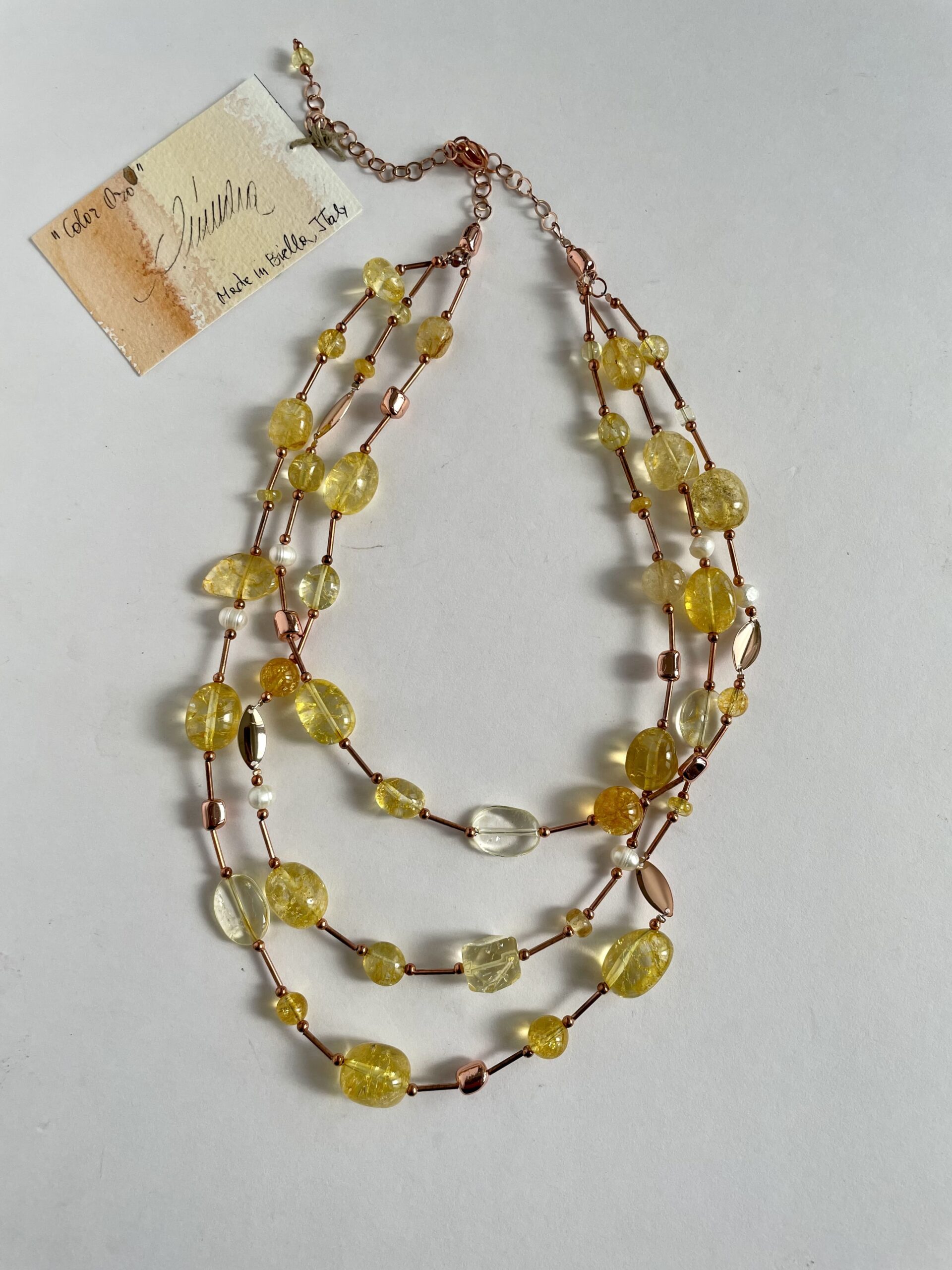 Una cascata di Pietre dure in pepite di quarzo cristallo. Straordinaria la luminosità regalata dal colore giallo oro e dalla trasparenza delle pietre dalla forma arrotondata e morbida. Le pietre Color Oro sono alternate e valorizzate da astine e piccole sfere in metallo color rame, con perle di fiume tonde bianche.