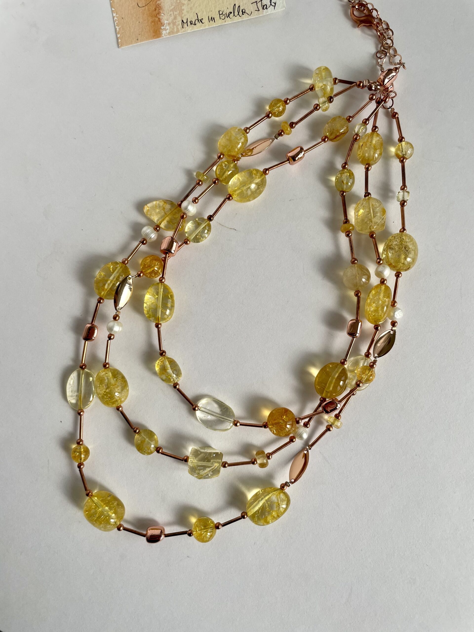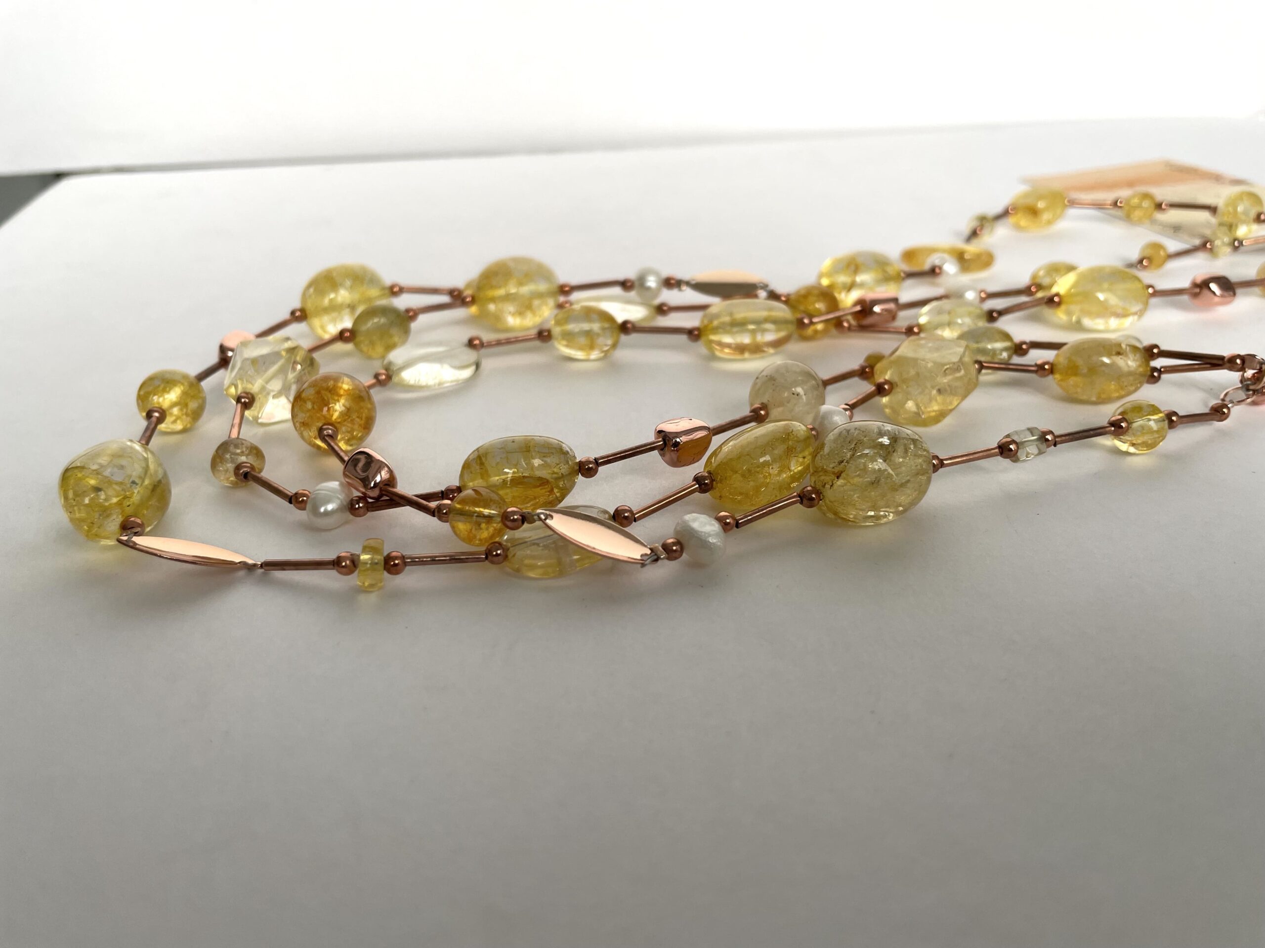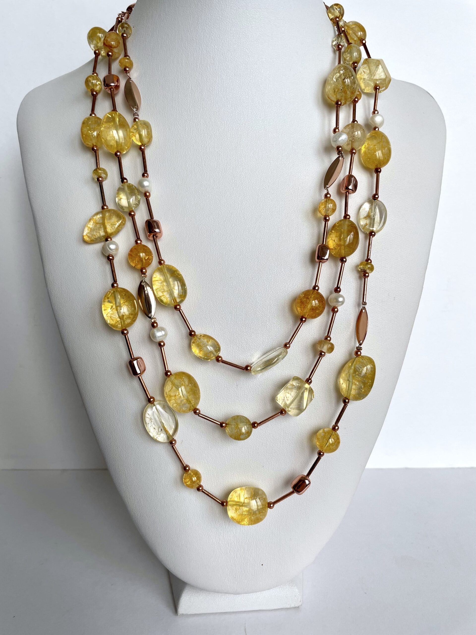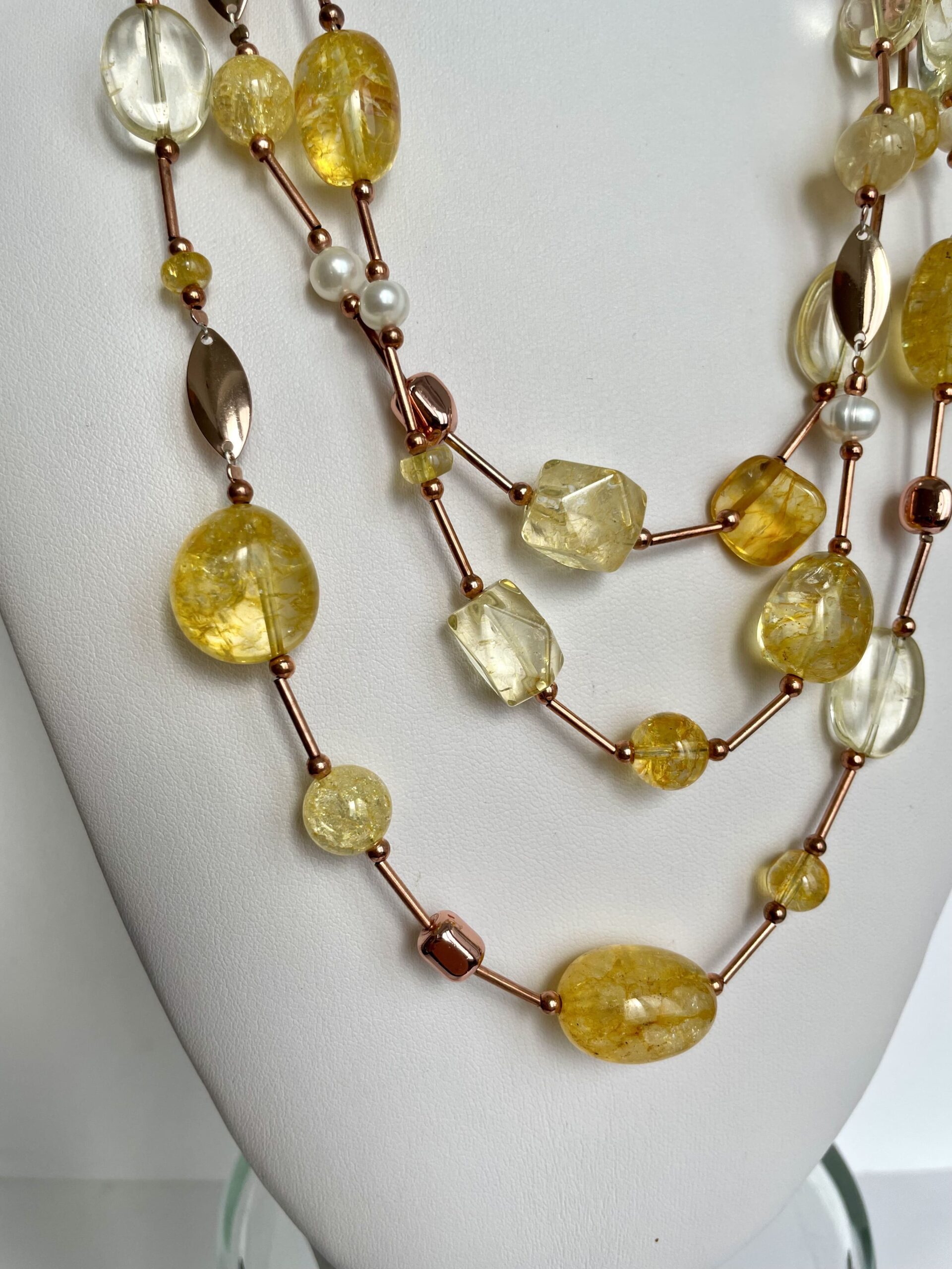 Una cascata di Pietre dure in pepite di quarzo cristallo. Straordinaria la luminosità regalata dal colore giallo oro e dalla trasparenza delle pietre dalla forma arrotondata e morbida. Le pietre Color Oro sono alternate e valorizzate da astine e piccole sfere in metallo color rame, con perle di fiume tonde bianche.