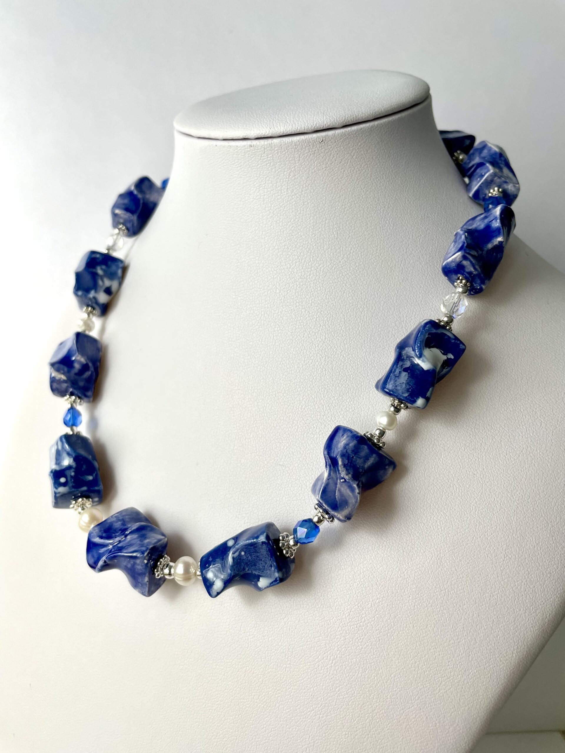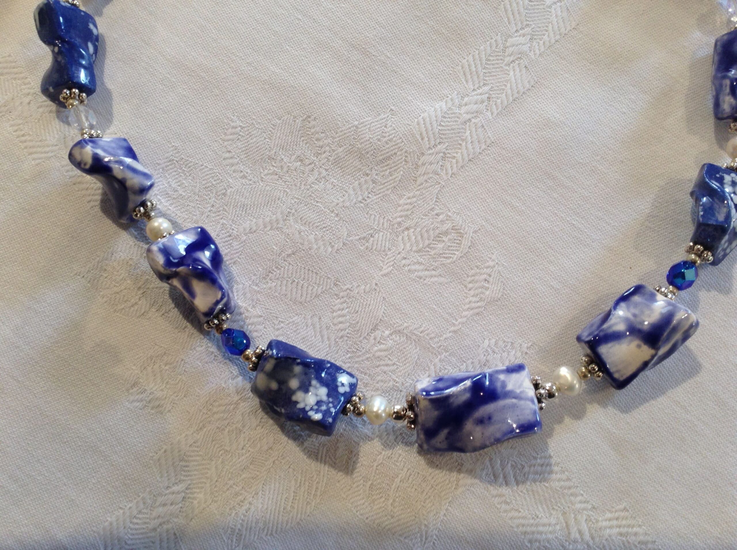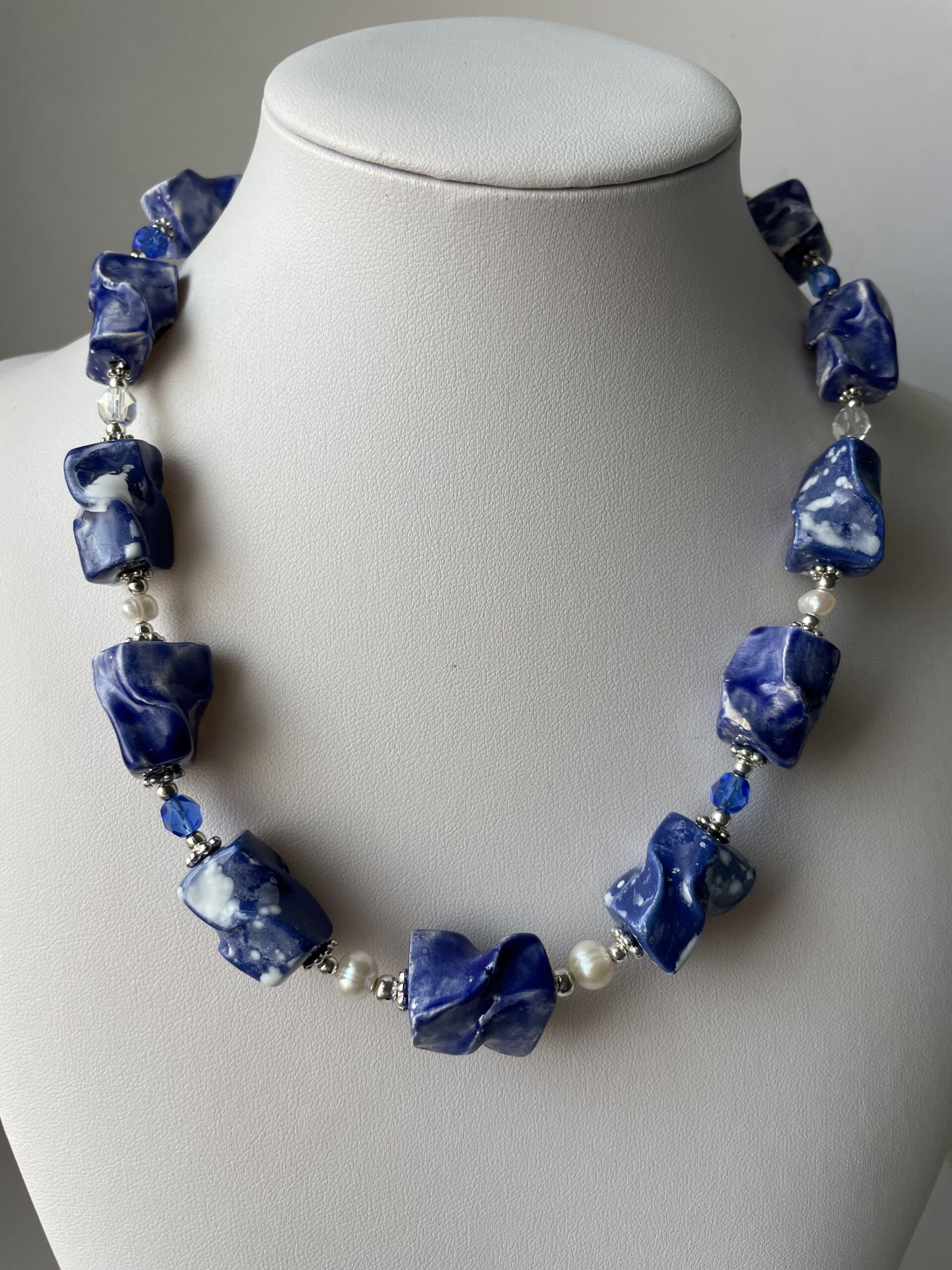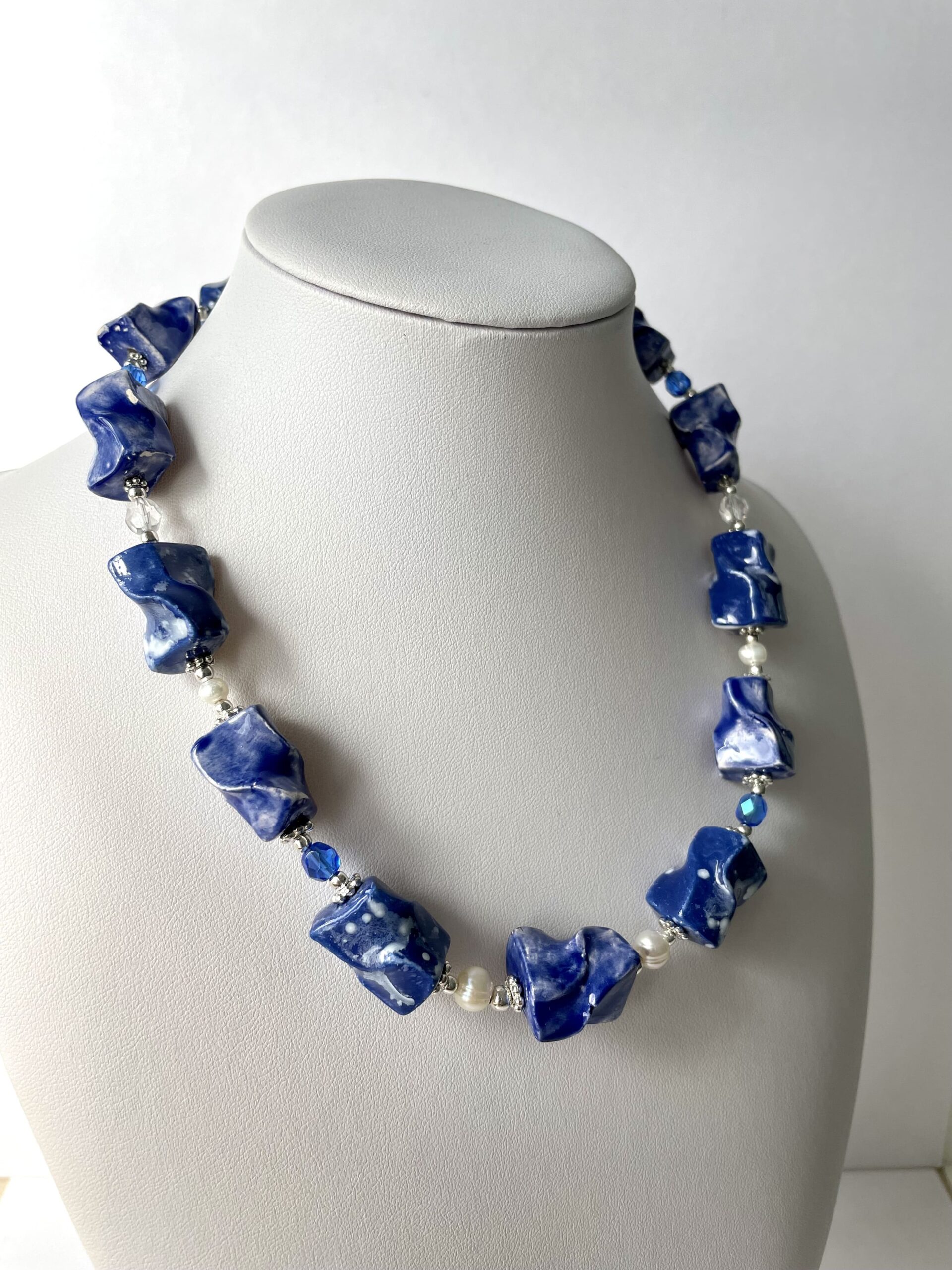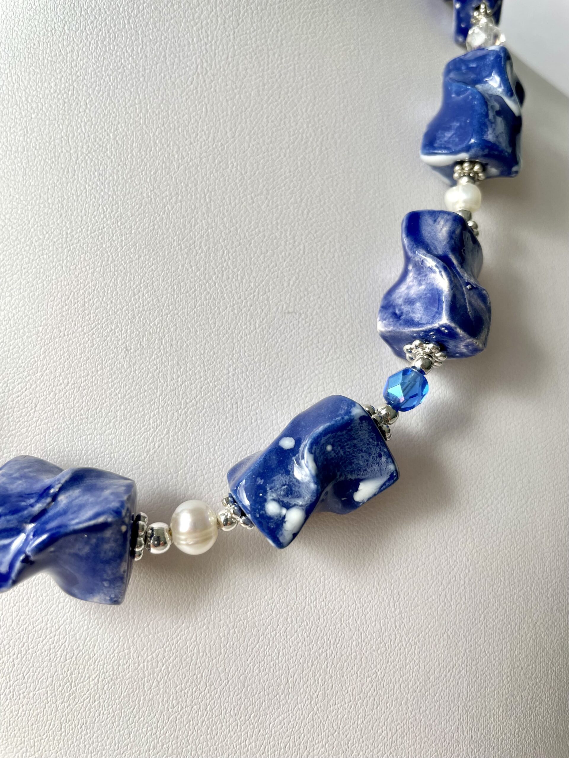 È briosa e divertente la collana in ceramica lavorata a mano a partire dalla terra. Di un bel blu luminoso mosso da effetti e sfumature ottenute con le diverse smaltature a forno.