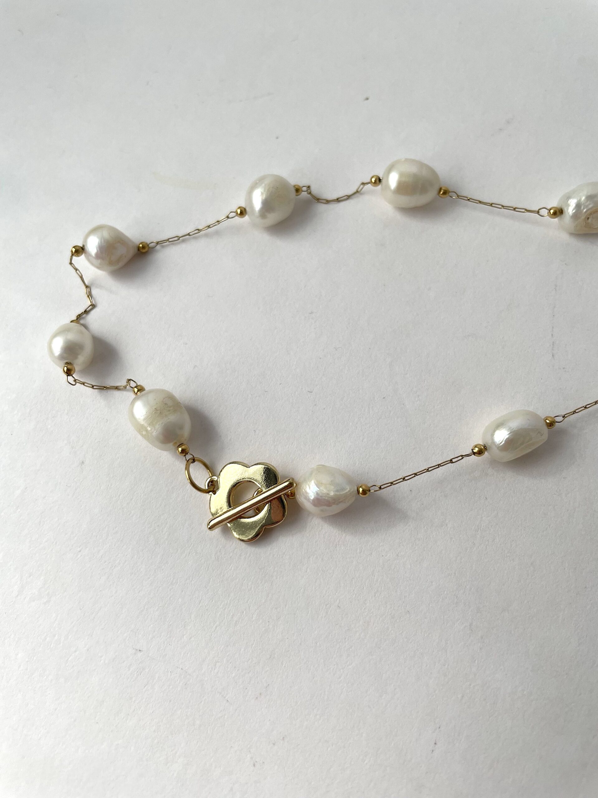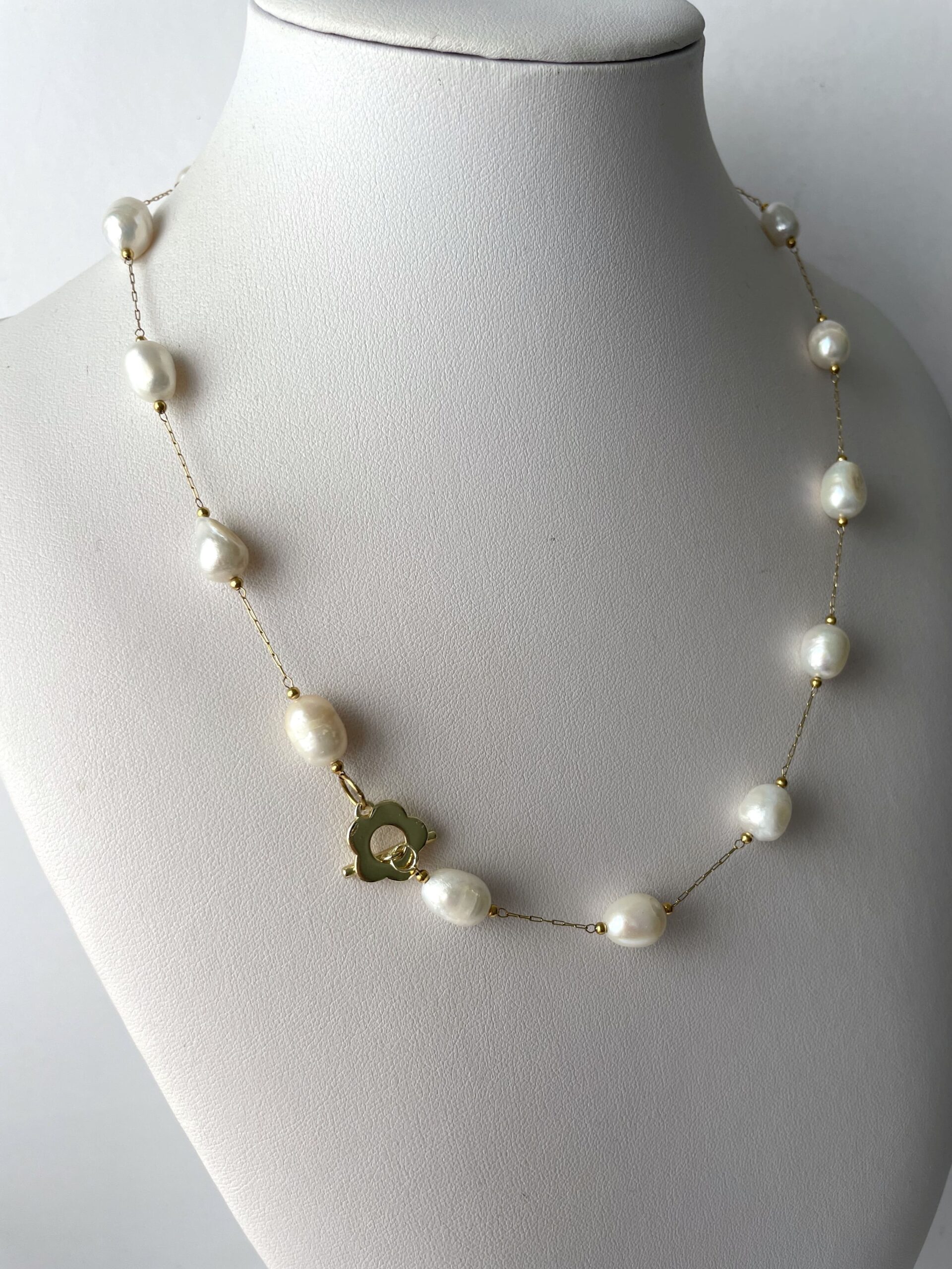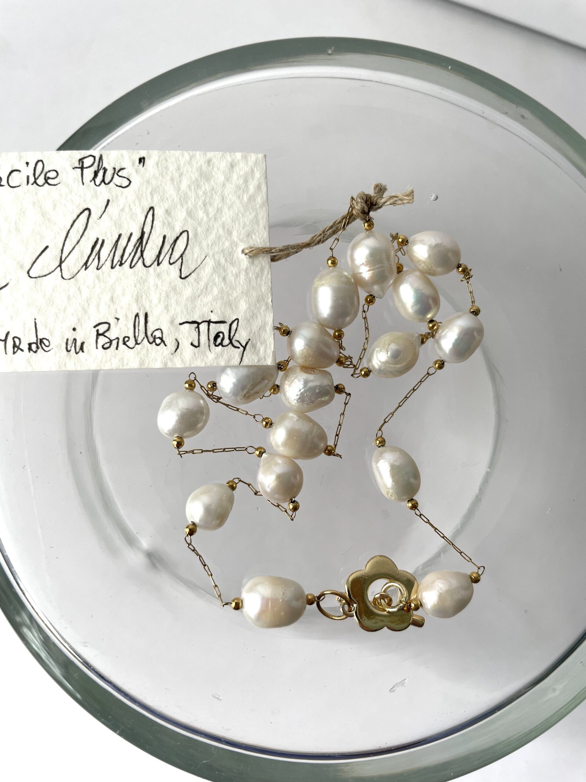 Nel nuovo modello PLUS troviamo perle di fiume bianche più grandi, collegate tra loro da una sottile catenina in acciaio dorato. La chiusura a forma di romantico fiore è in metallo placcato oro 18 K. Vista la sua particolare forma, Chiara Bo consiglia di tenerla su un lato, ben in vista.