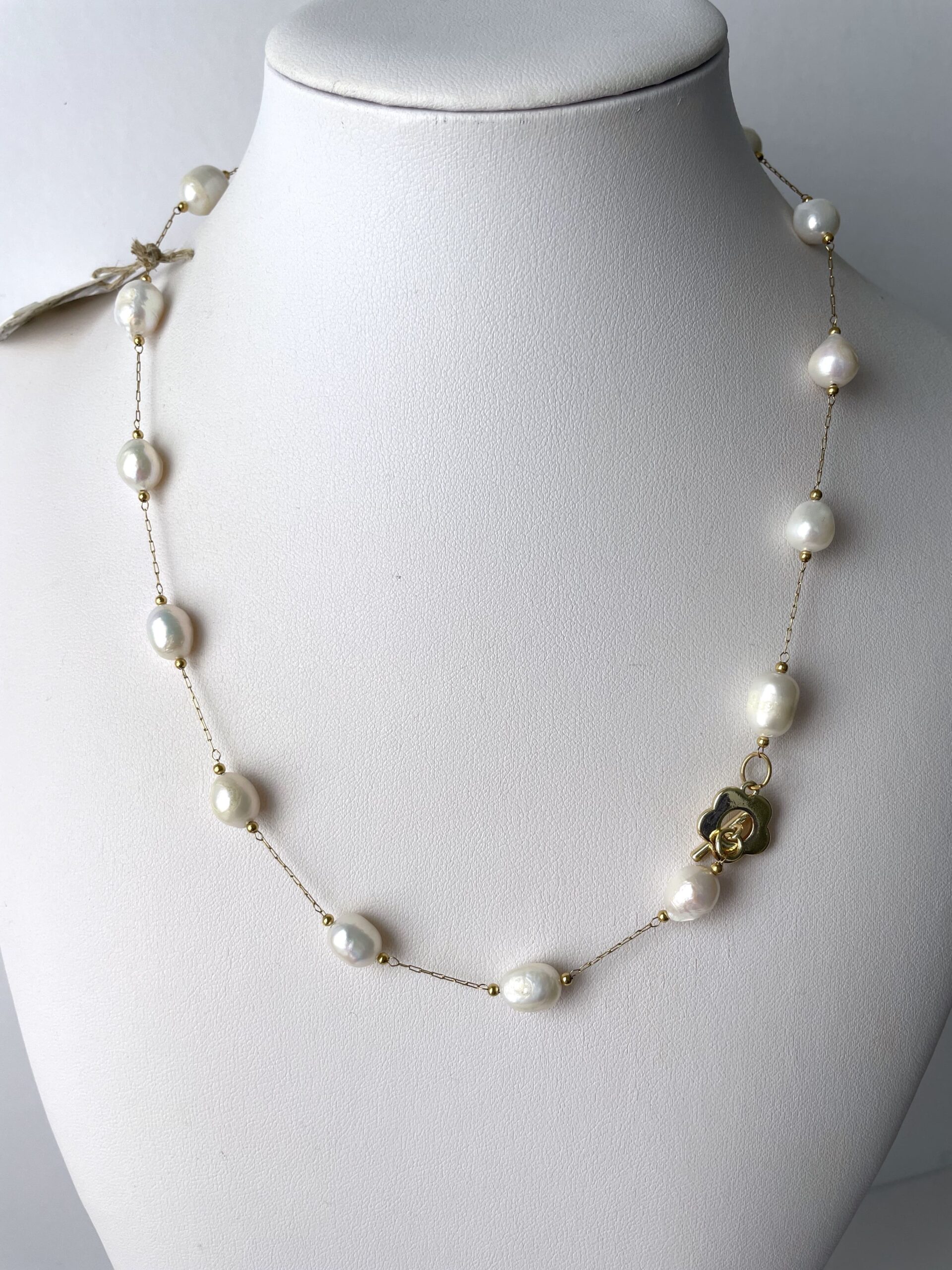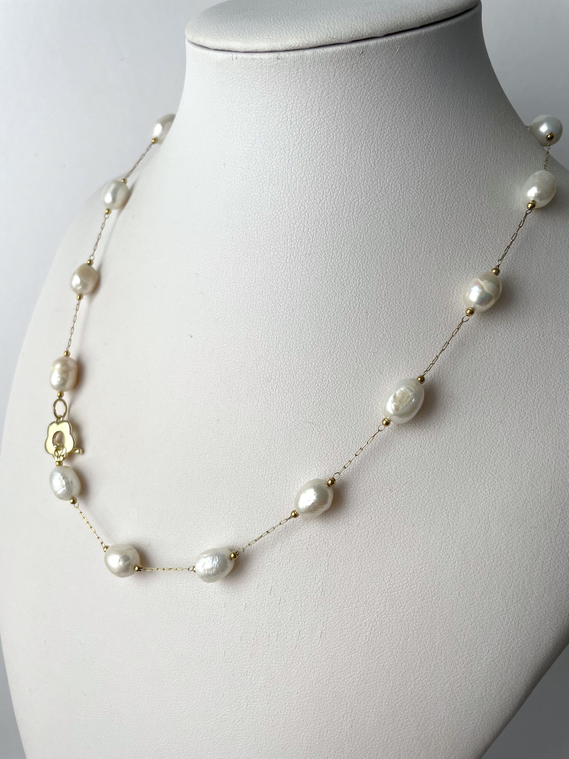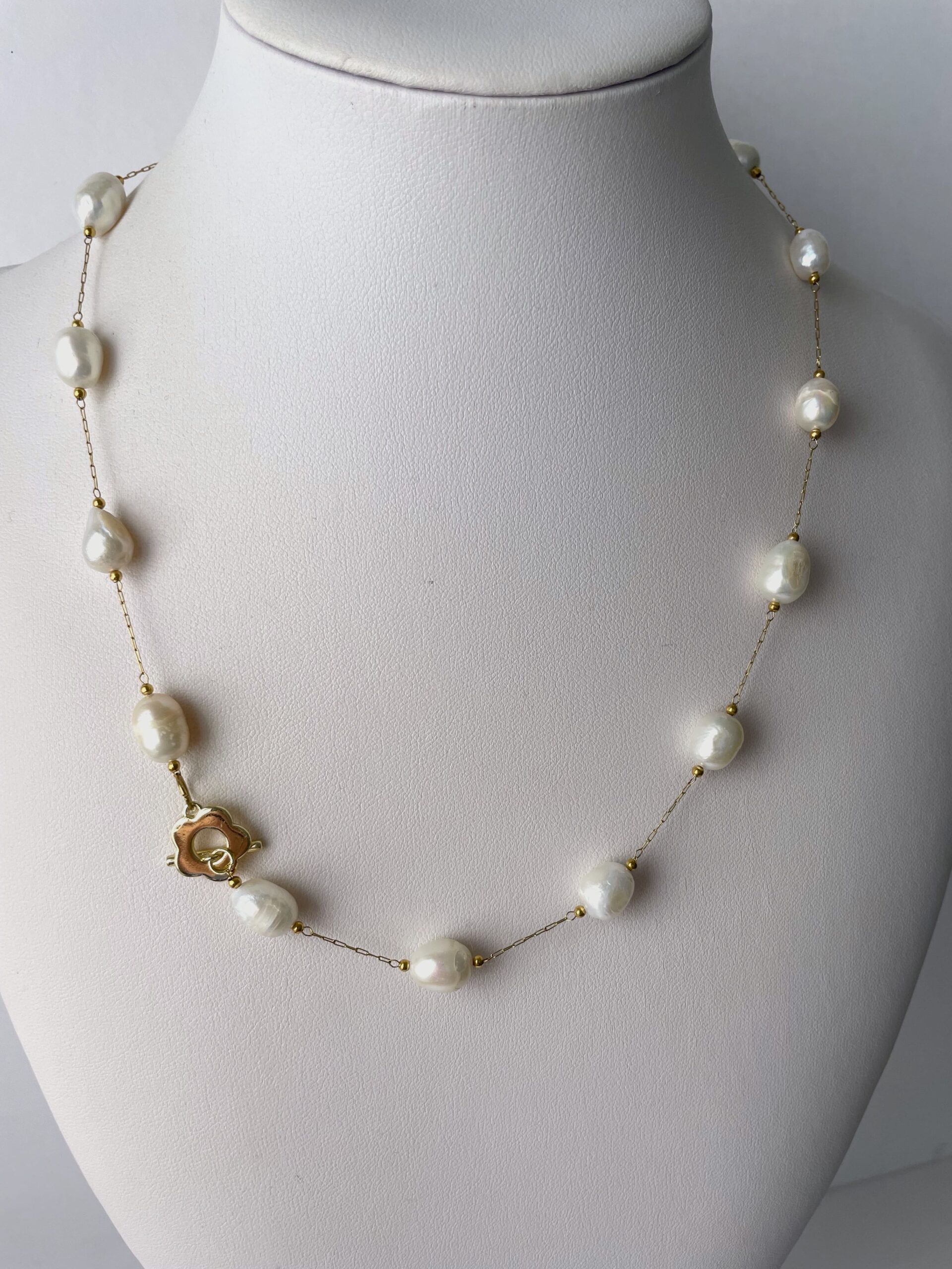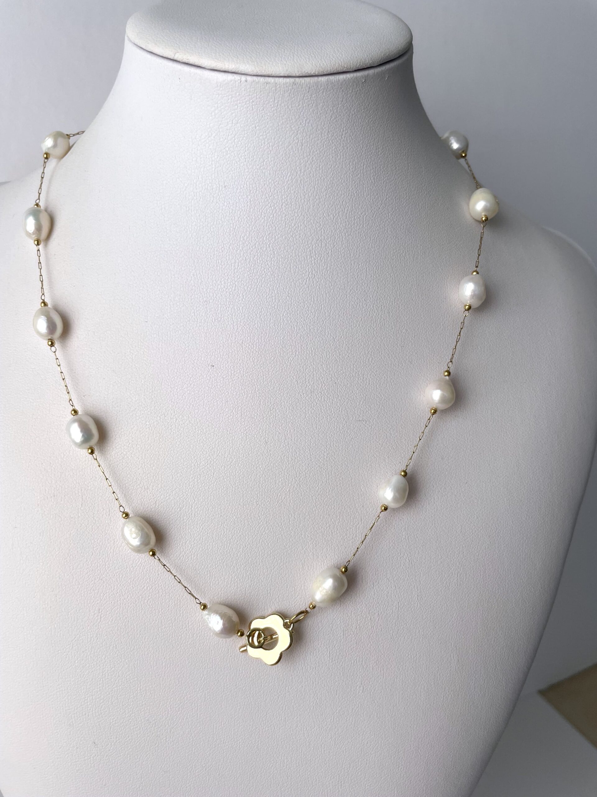 Nel nuovo modello PLUS troviamo perle di fiume bianche più grandi, collegate tra loro da una sottile catenina in acciaio dorato. La chiusura a forma di romantico fiore è in metallo placcato oro 18 K. Vista la sua particolare forma, Chiara Bo consiglia di tenerla su un lato, ben in vista.
