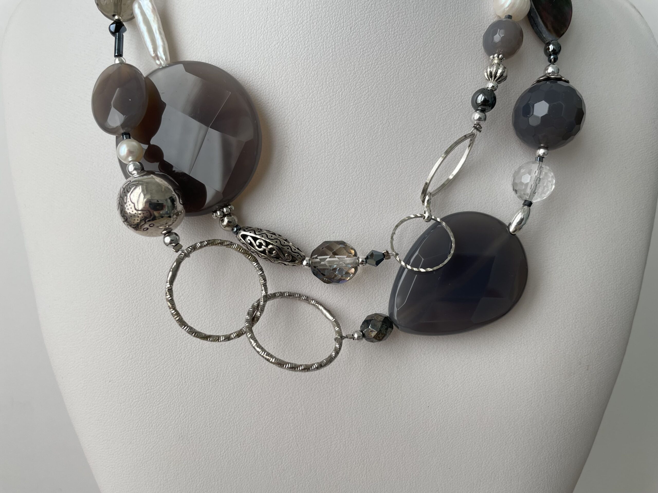 Grandi Pietre dure grigie caratterizzano la bella collana Nuvola. In agata nuvolata sfaccettata: ecco spiegato il nome di questo gioiello.