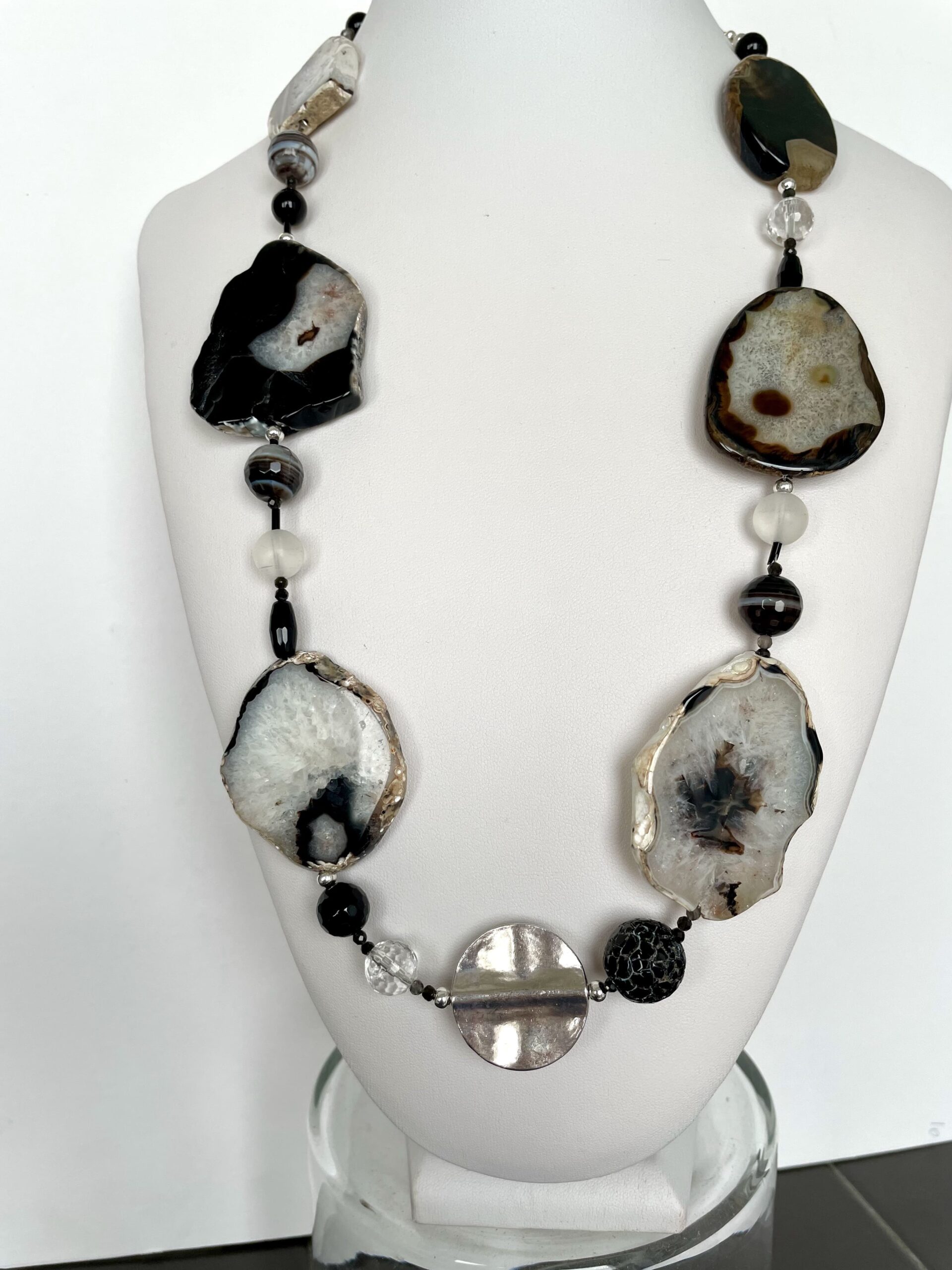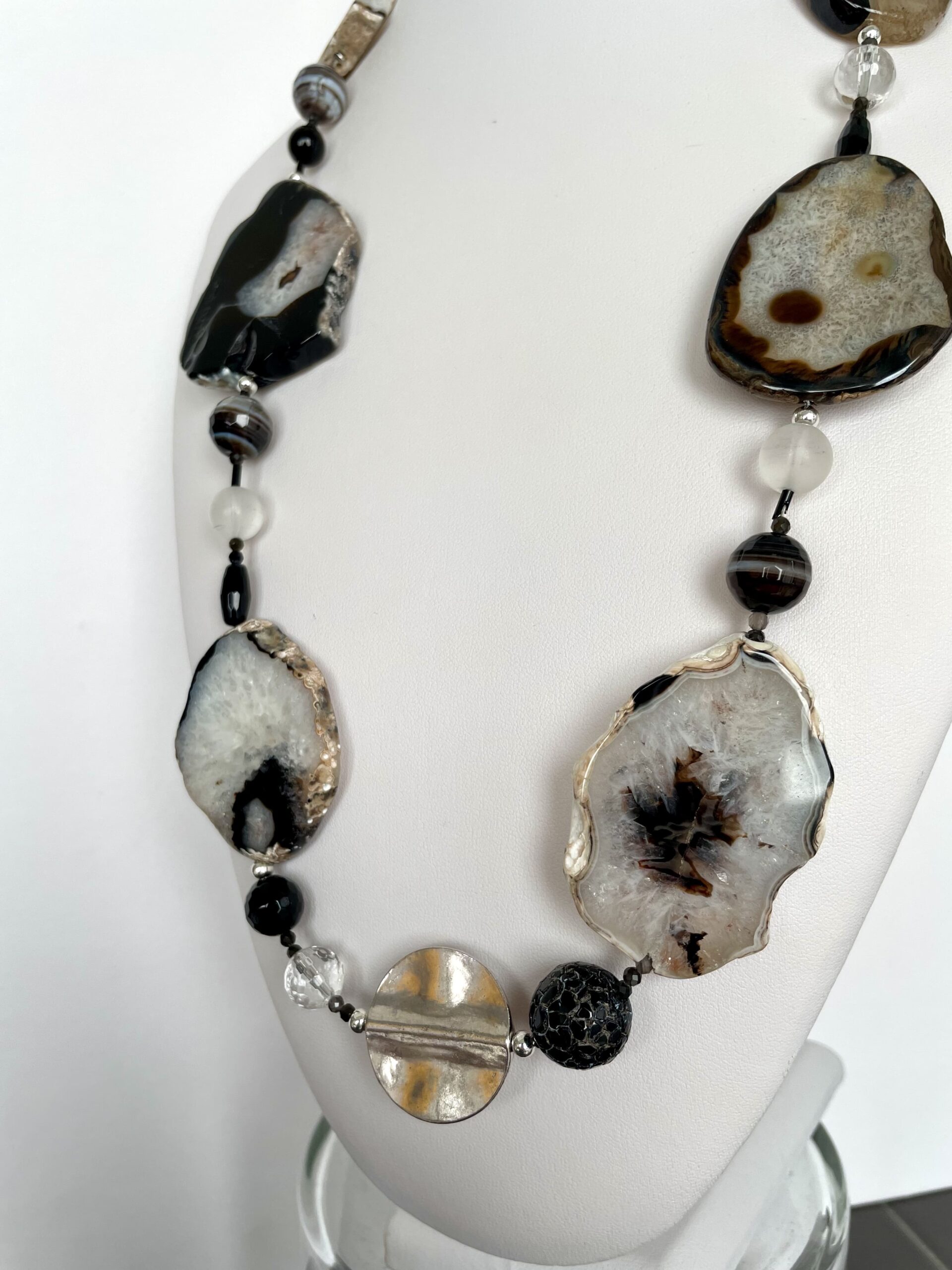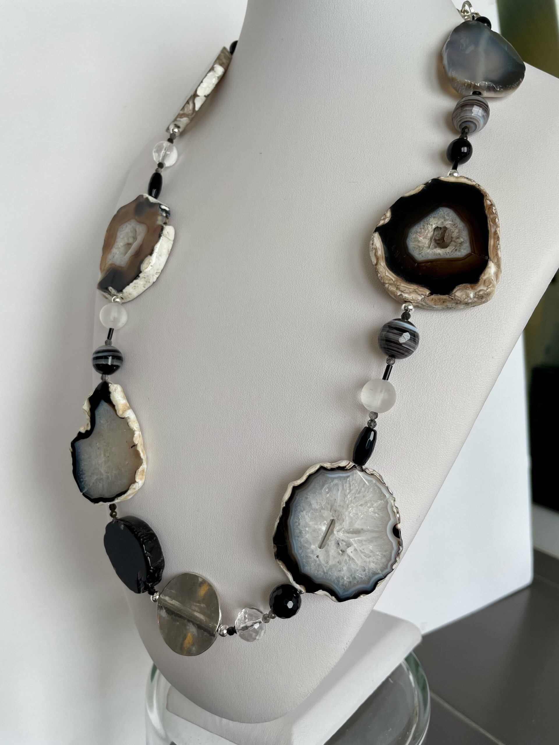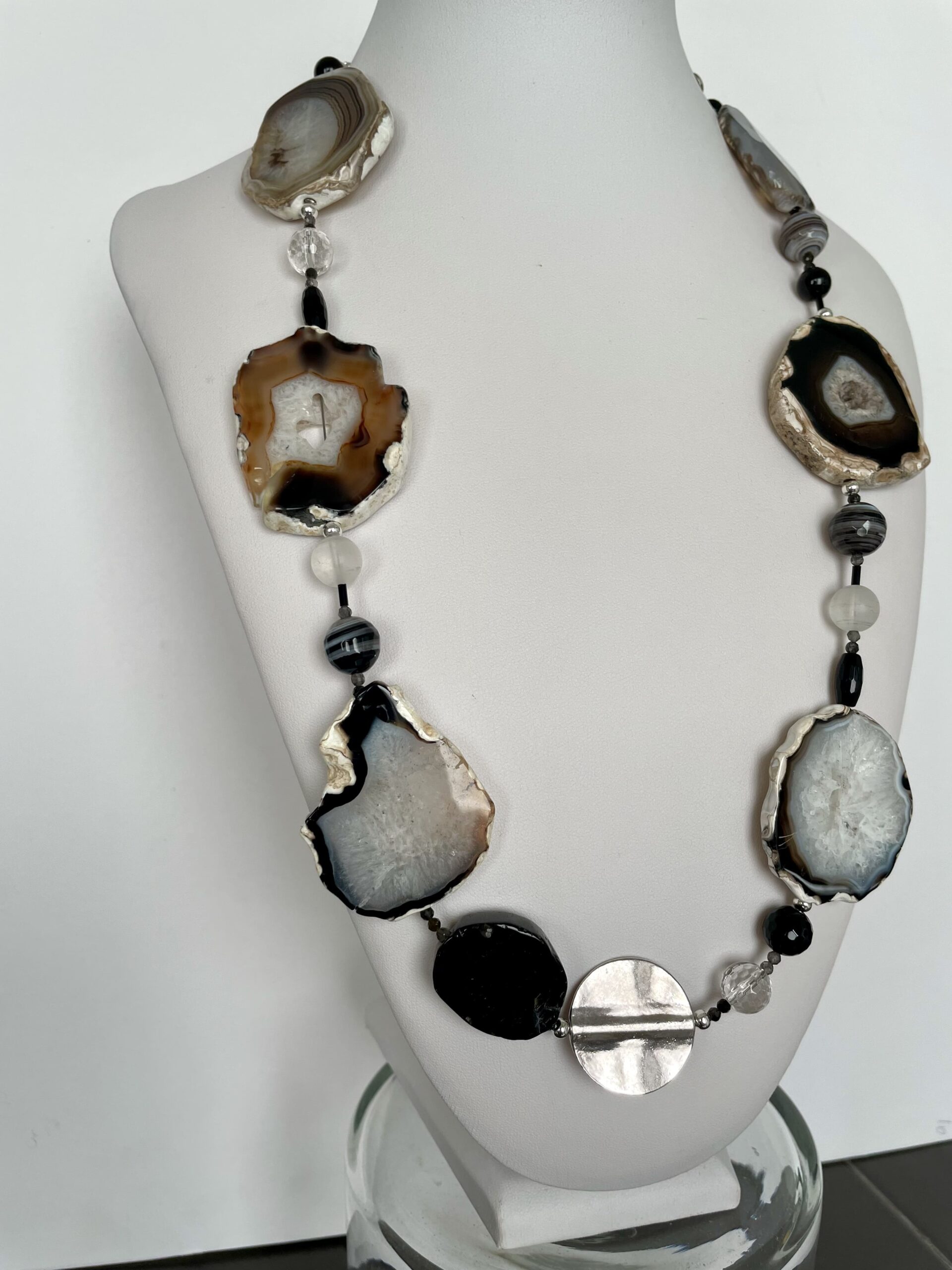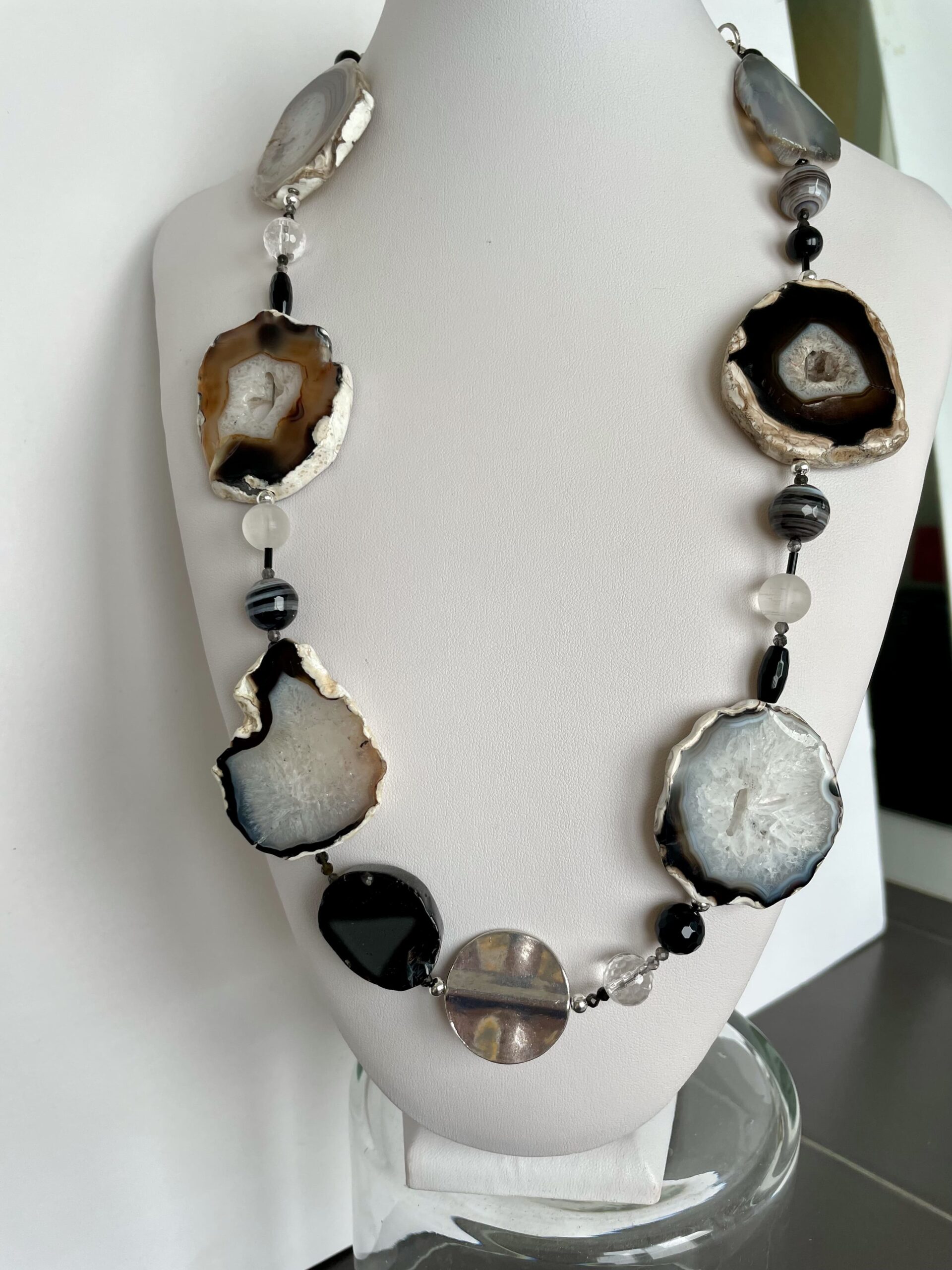 Bordi irregolari, buchi e “finte crepe” fanno parte della loro specificità. Alternate ad agata Botswana, onice e cristallo di rocca sia lucido che opaco, creano un ritmo affascinante, dove ogni elemento costituisce un punto di interesse.