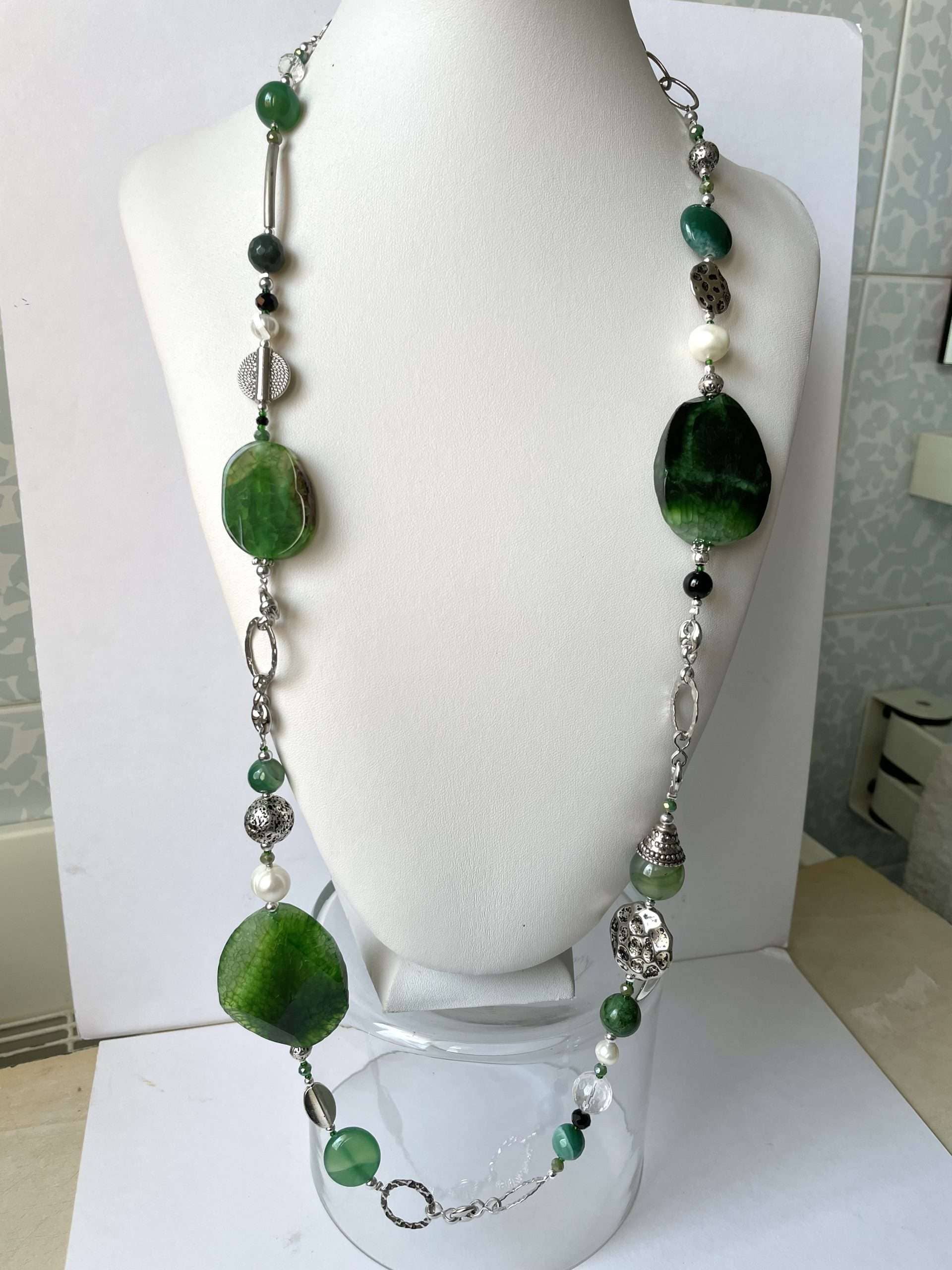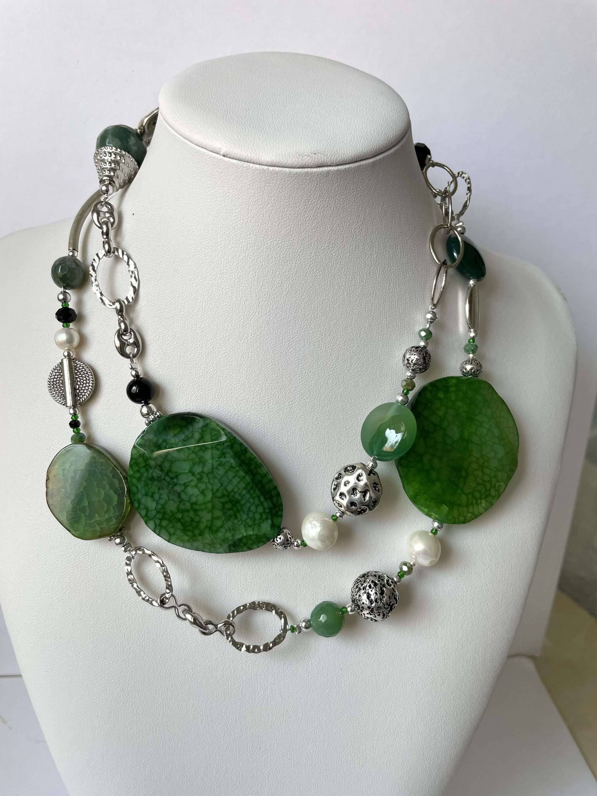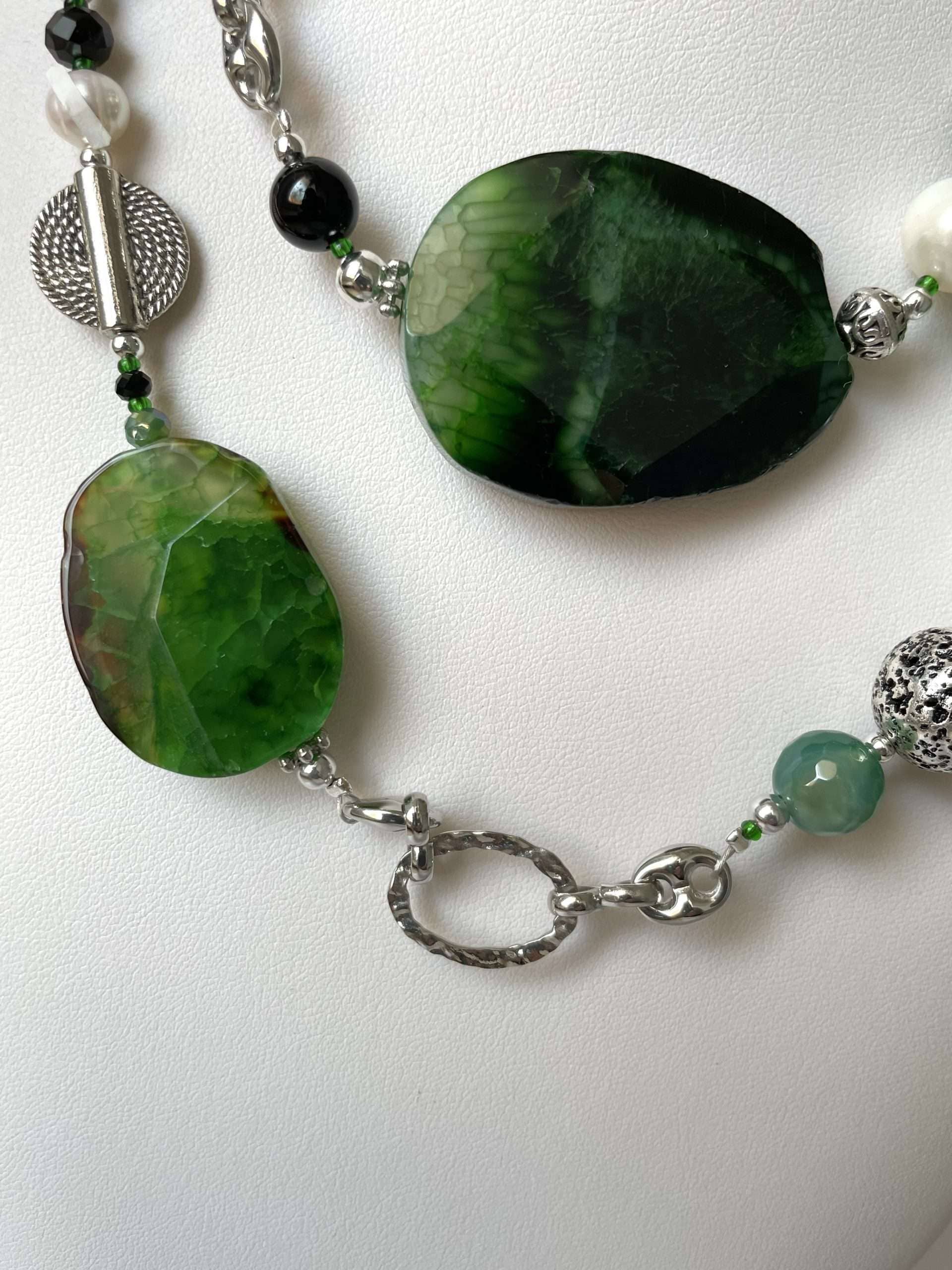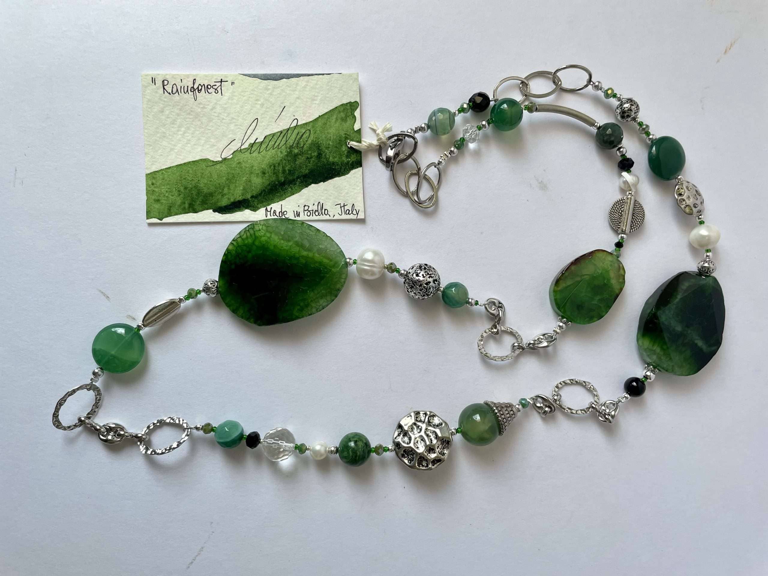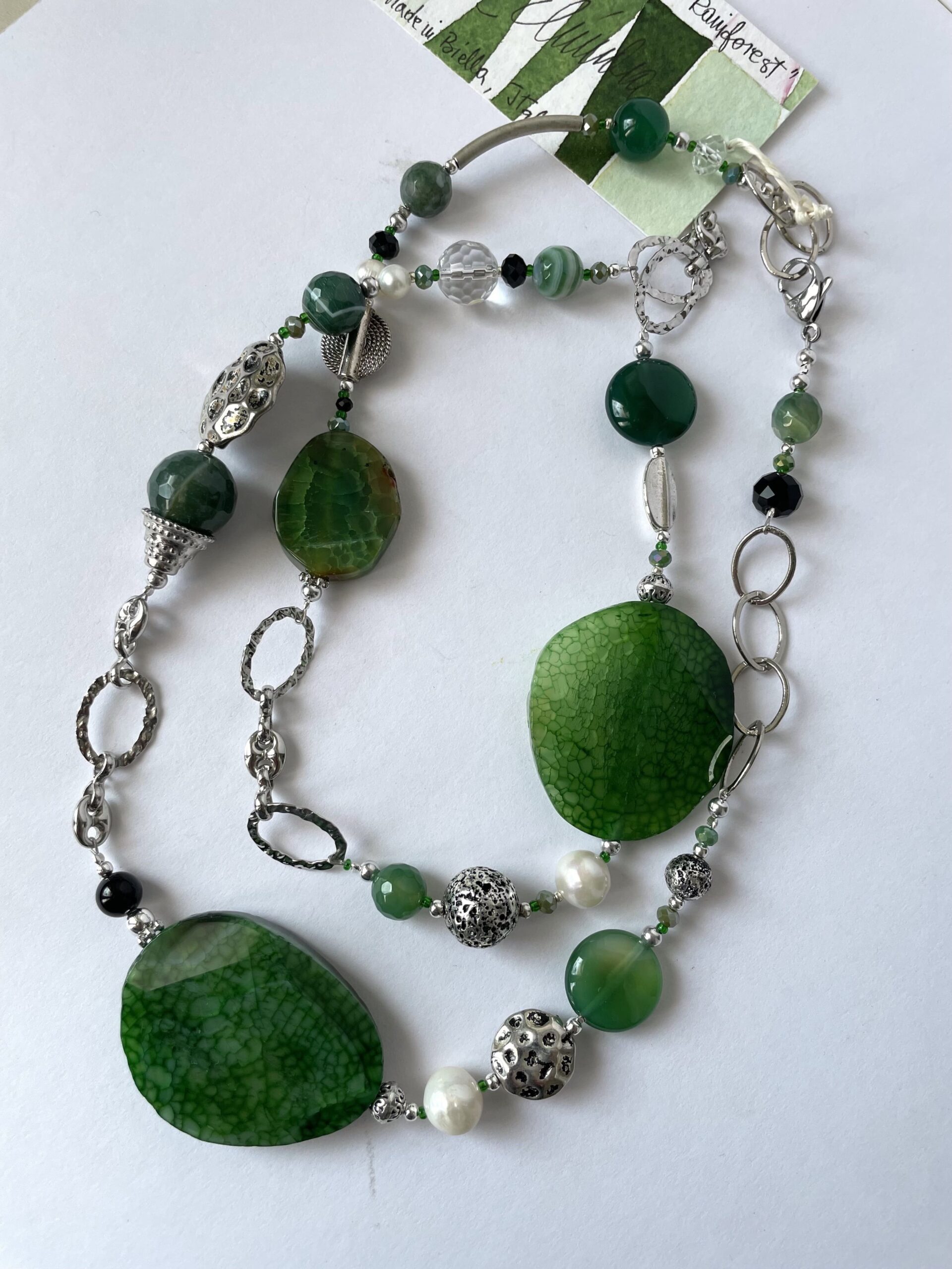 Collana “Rainforest” in agata verde, un modello che trae ispirazione dai verdi mutevoli e profondi della foresta pluviale. Le pietre di cui si compone sono agate dalle mille sfumature, che si alternano a tratti di catena, ora in acciaio ora in metallo placcato argento (naturalmente nickel free). La collana è impreziosita dai tocchi neri dell’onice, dalle trasparenze del cristallo di rocca, dalle note profonde dell’agata muschiata e dai colpi di luce delle perle di fiume bianche.