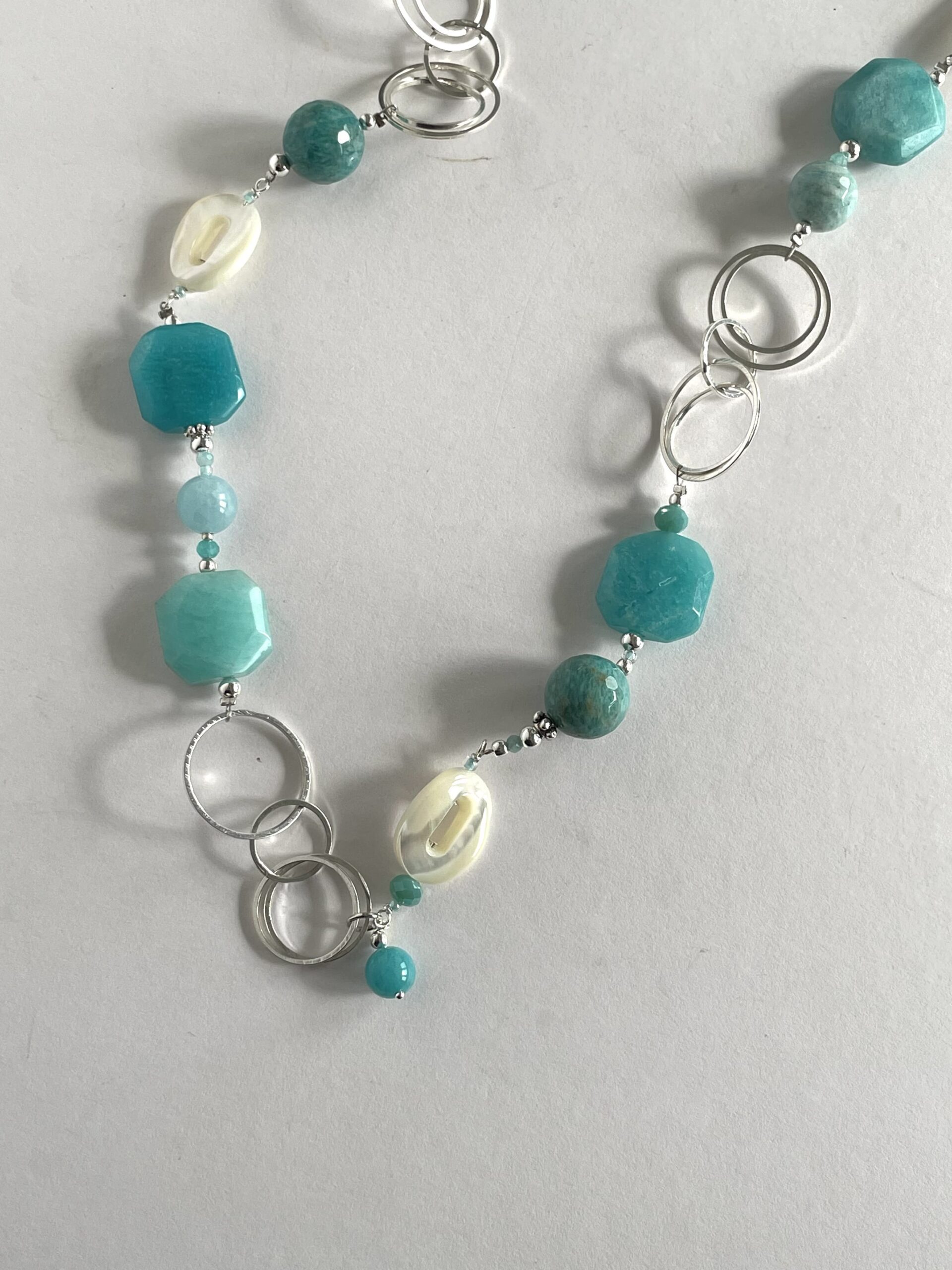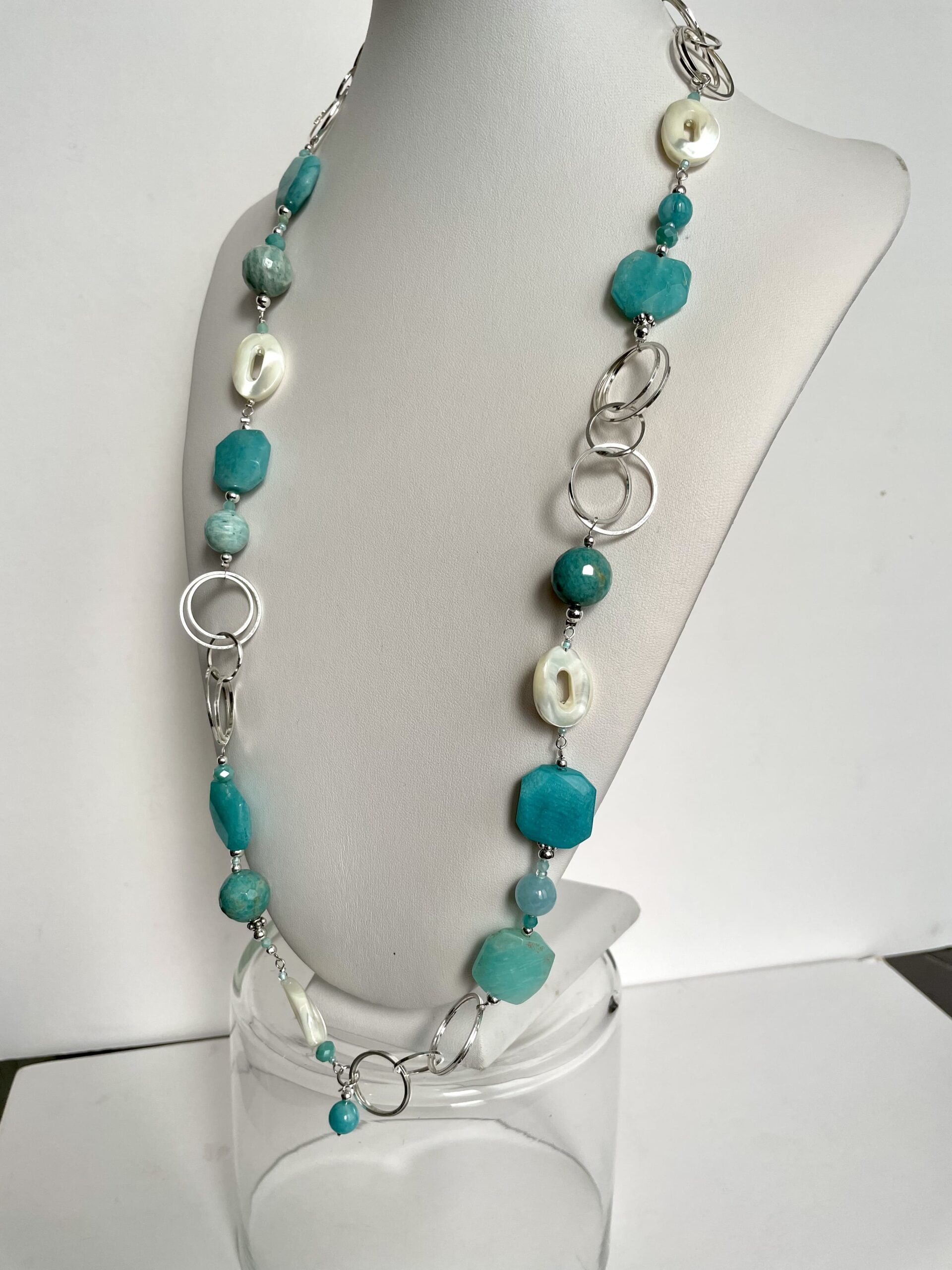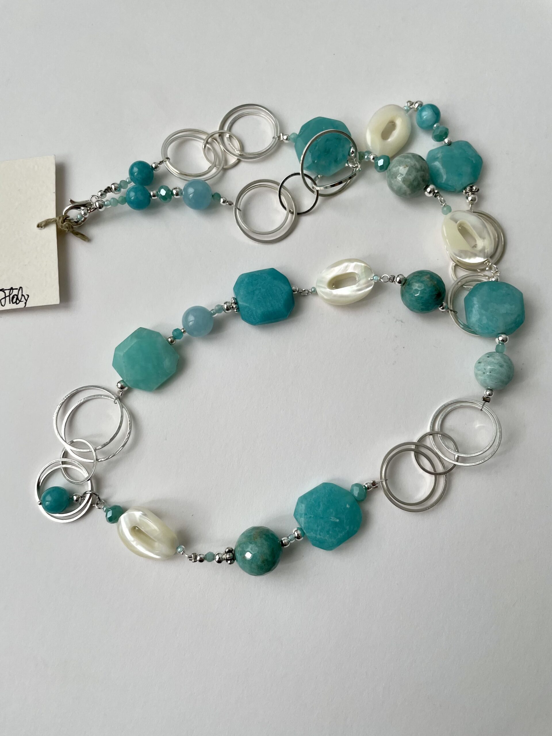 Fresca e luminosa, di un bel tono vivace di turchese, la collana Camogli è realizzata in amazzonite, una pregiata pietra dura. Troviamo anche lucente madreperla bianca e alcune palline di agata in tinta. Ad aggiungere dinamismo vi sono poi tratti di una briosa catena placcata argento, nickel free.