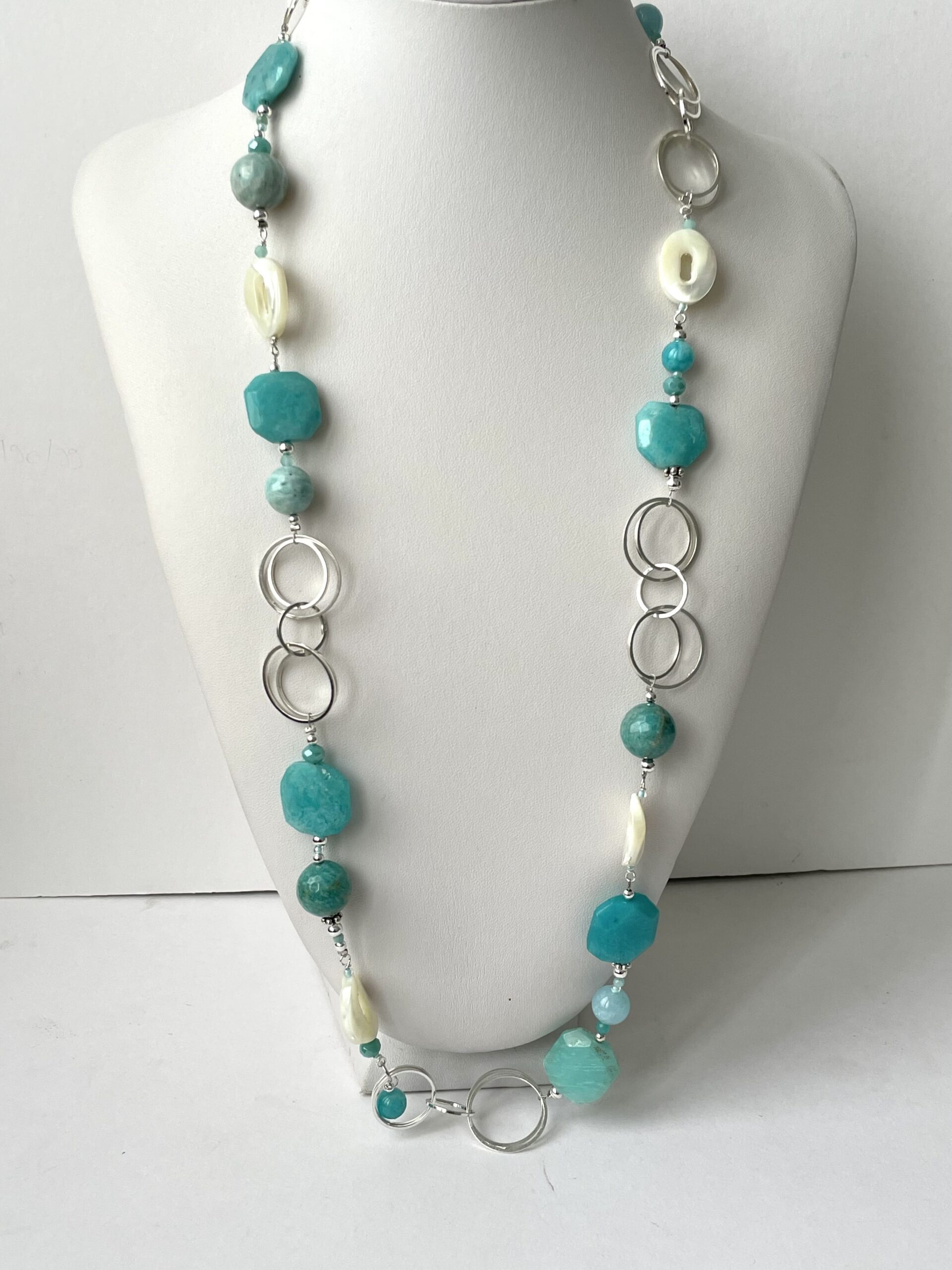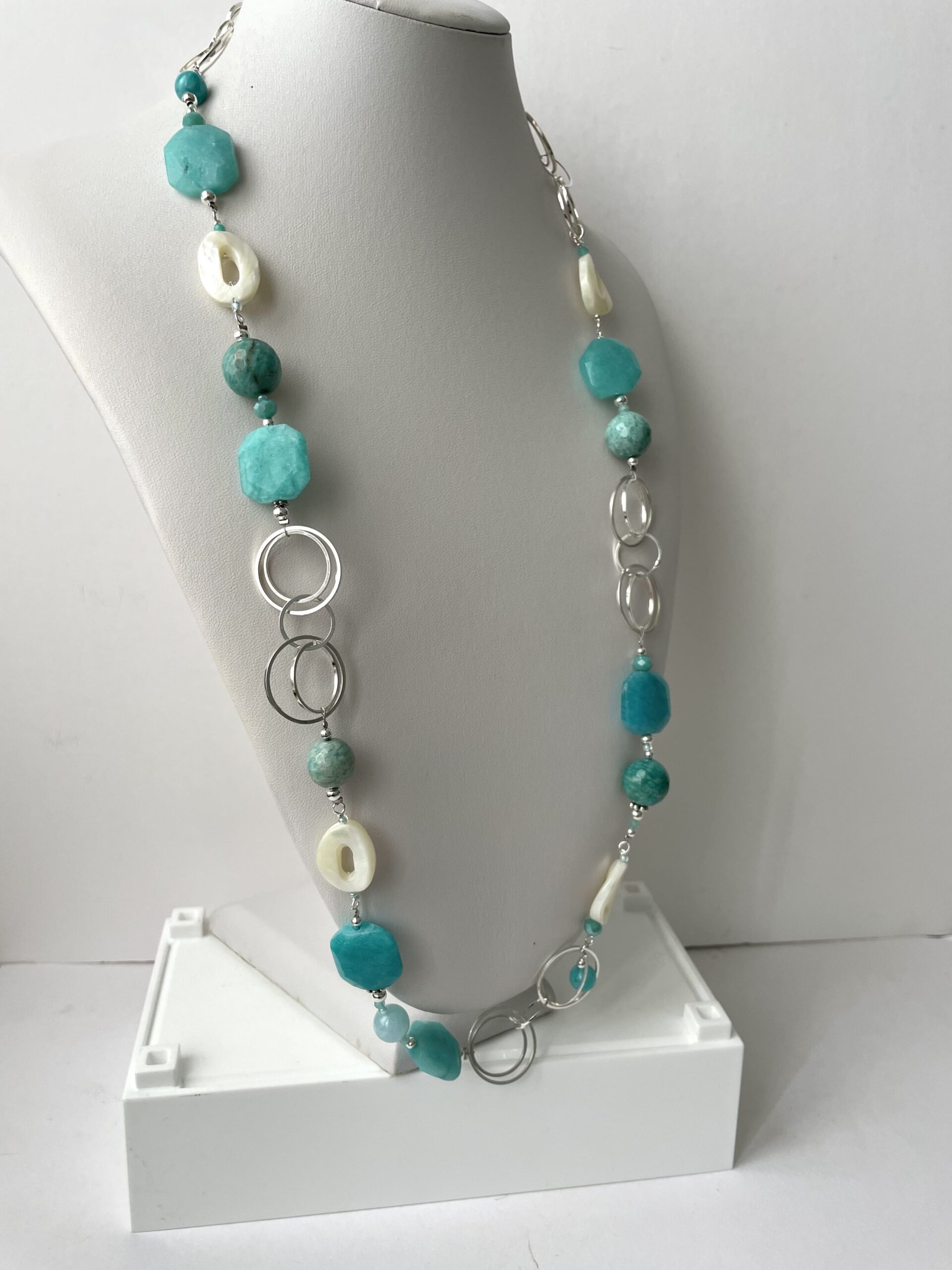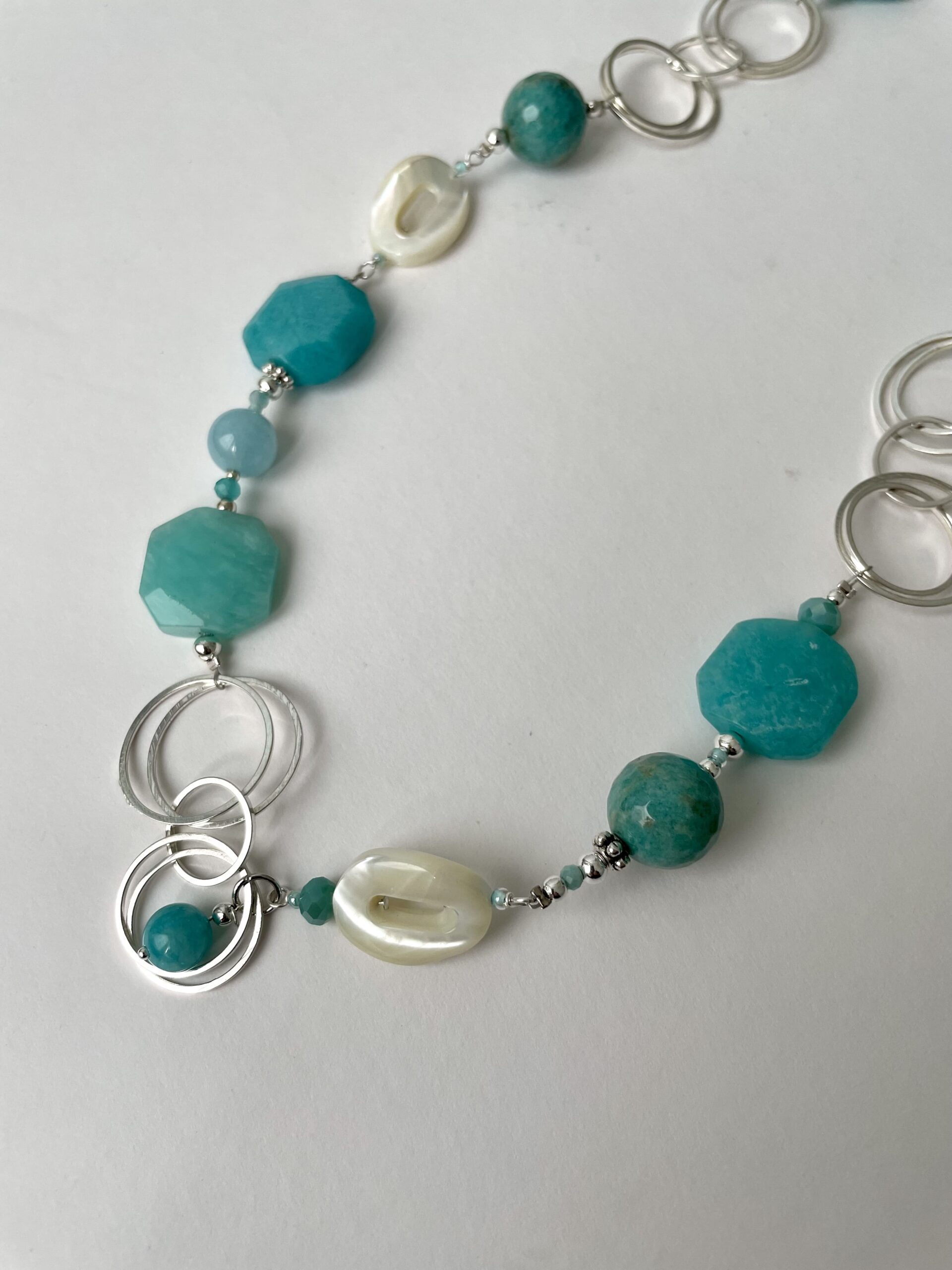 Fresca e luminosa, di un bel tono vivace di turchese, la collana Camogli è realizzata in amazzonite, una pregiata pietra dura. Troviamo anche lucente madreperla bianca e alcune palline di agata in tinta. Ad aggiungere dinamismo vi sono poi tratti di una briosa catena placcata argento, nickel free.
