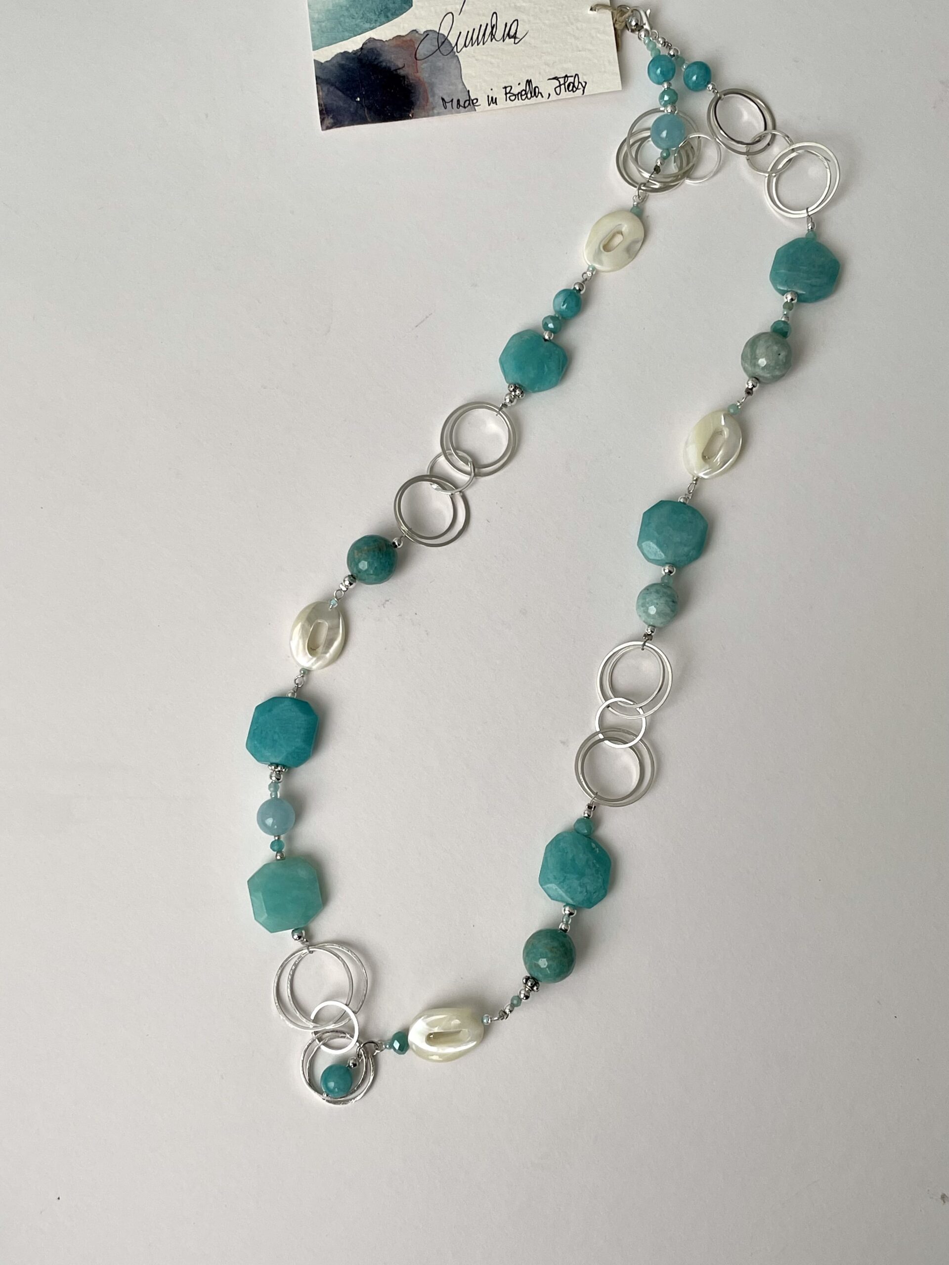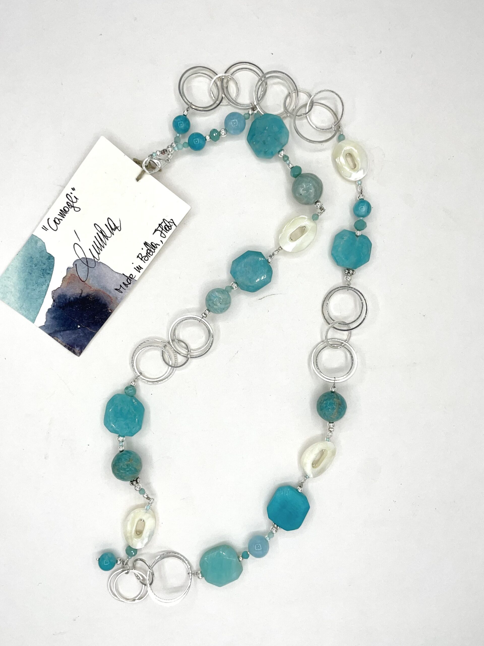 Camogli fa parte della collezione SERIE LIMITATA, infatti è disponibile solamente in tre esemplari! Ognuno di essi presenta qualche leggera variazione nei toni del colore perché quelle impiegate sono pietre naturali. La collana misura circa 77 centimetri.