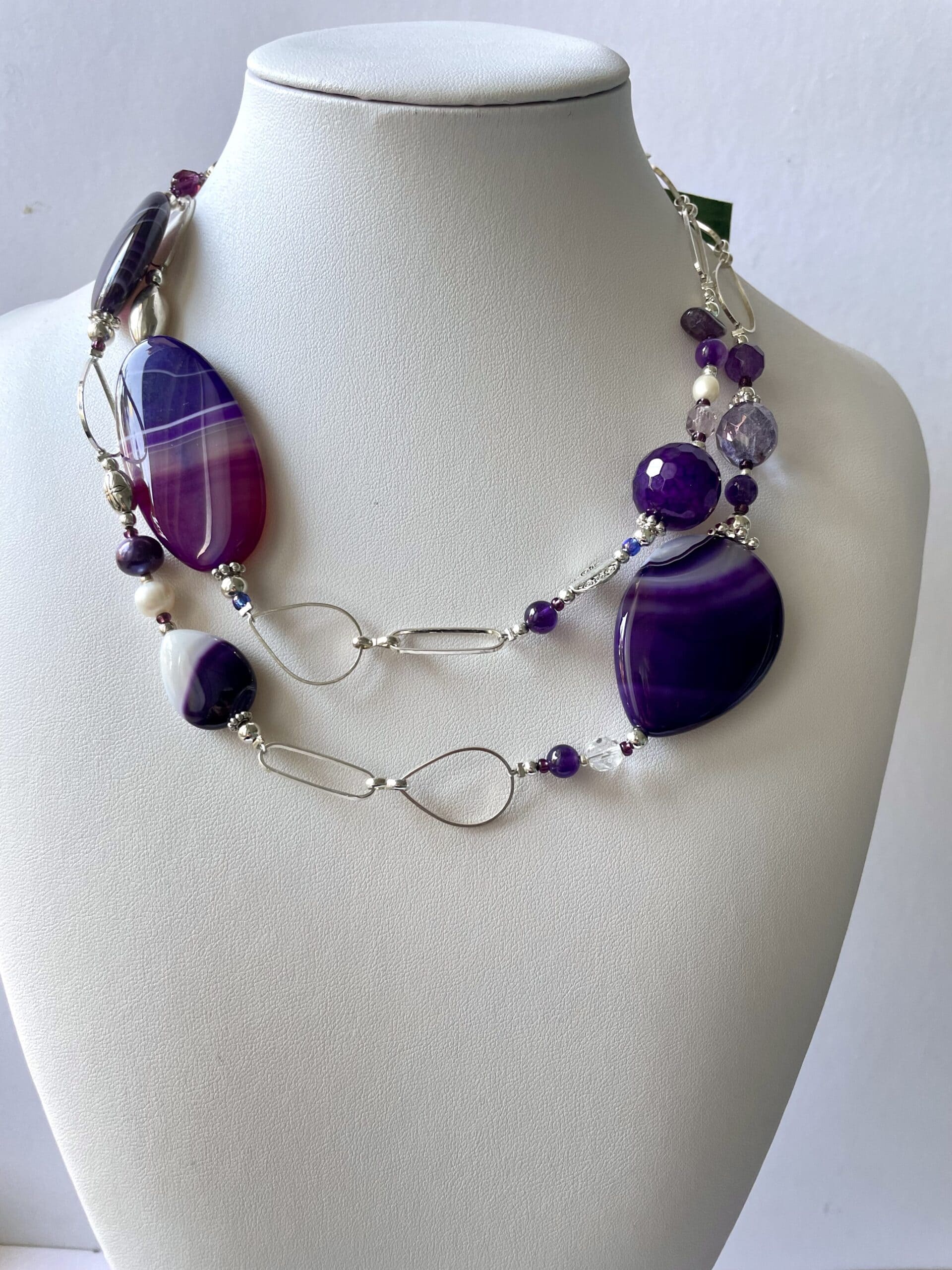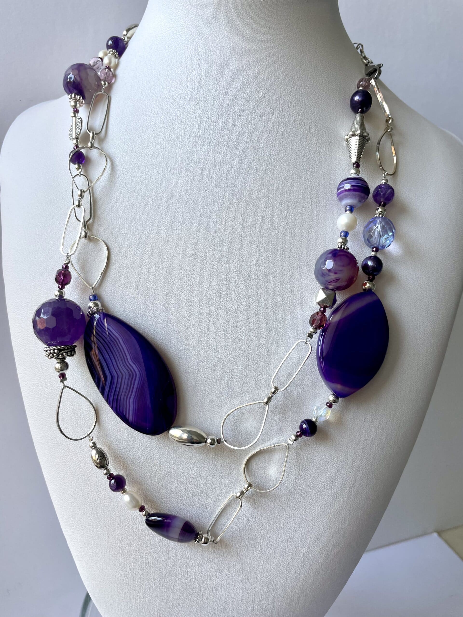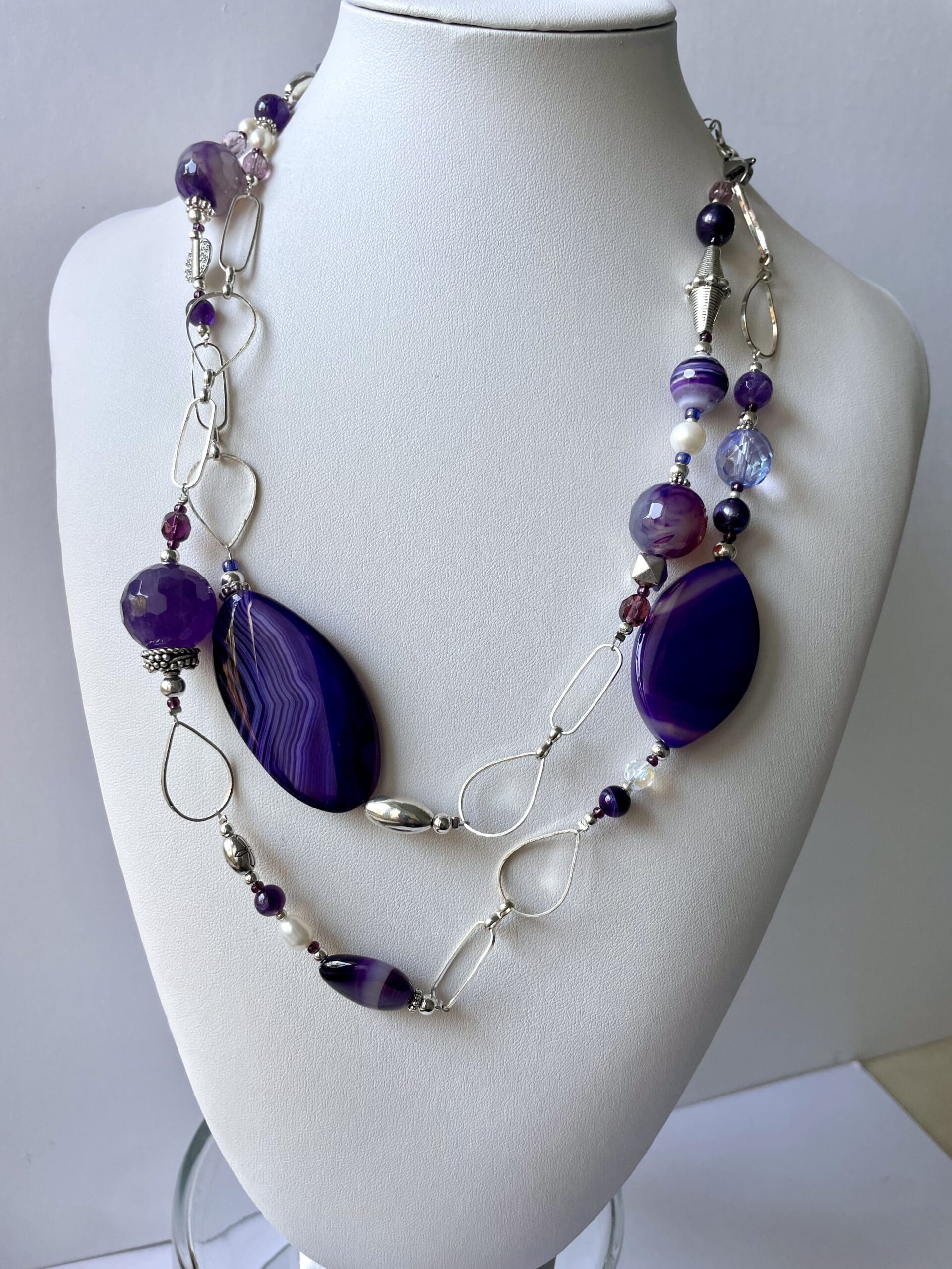 Un gioiello realizzato completamente a mano con pietre di agata viola dalle molteplici sfumature e luminosa ametista. Vi sono anche lucenti cristalli di Boemia, perle di fiume bianche e viola, pasta di vetro. Ogni esemplare presenta caratteristiche uniche che la differenziano dalle altre. Ciascuna pietra possiede sfumature e motivi diversi e caratteristici. E così garantito che ogni collana rappresenta davvero un pezzo unico ed inimitabile.