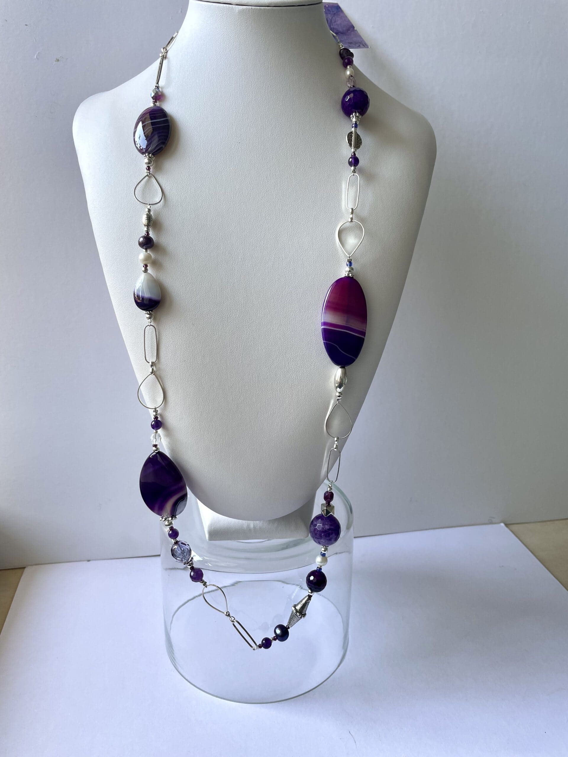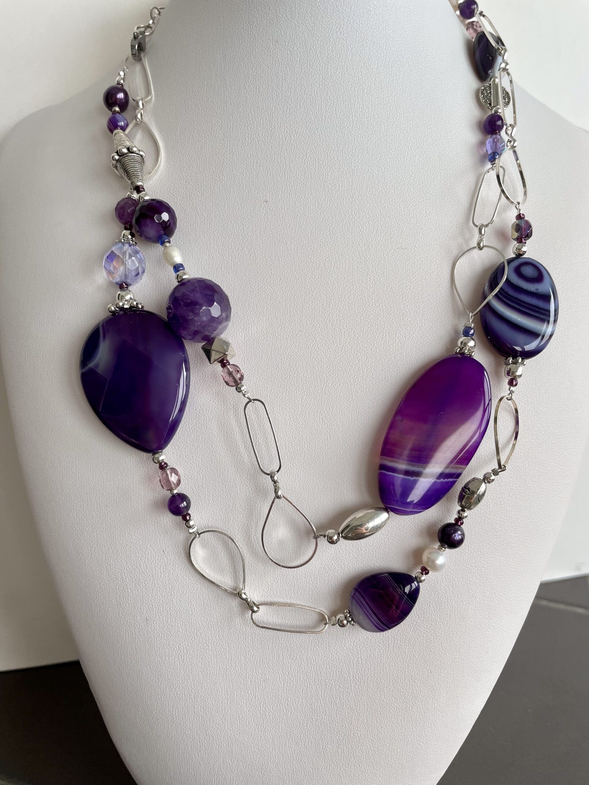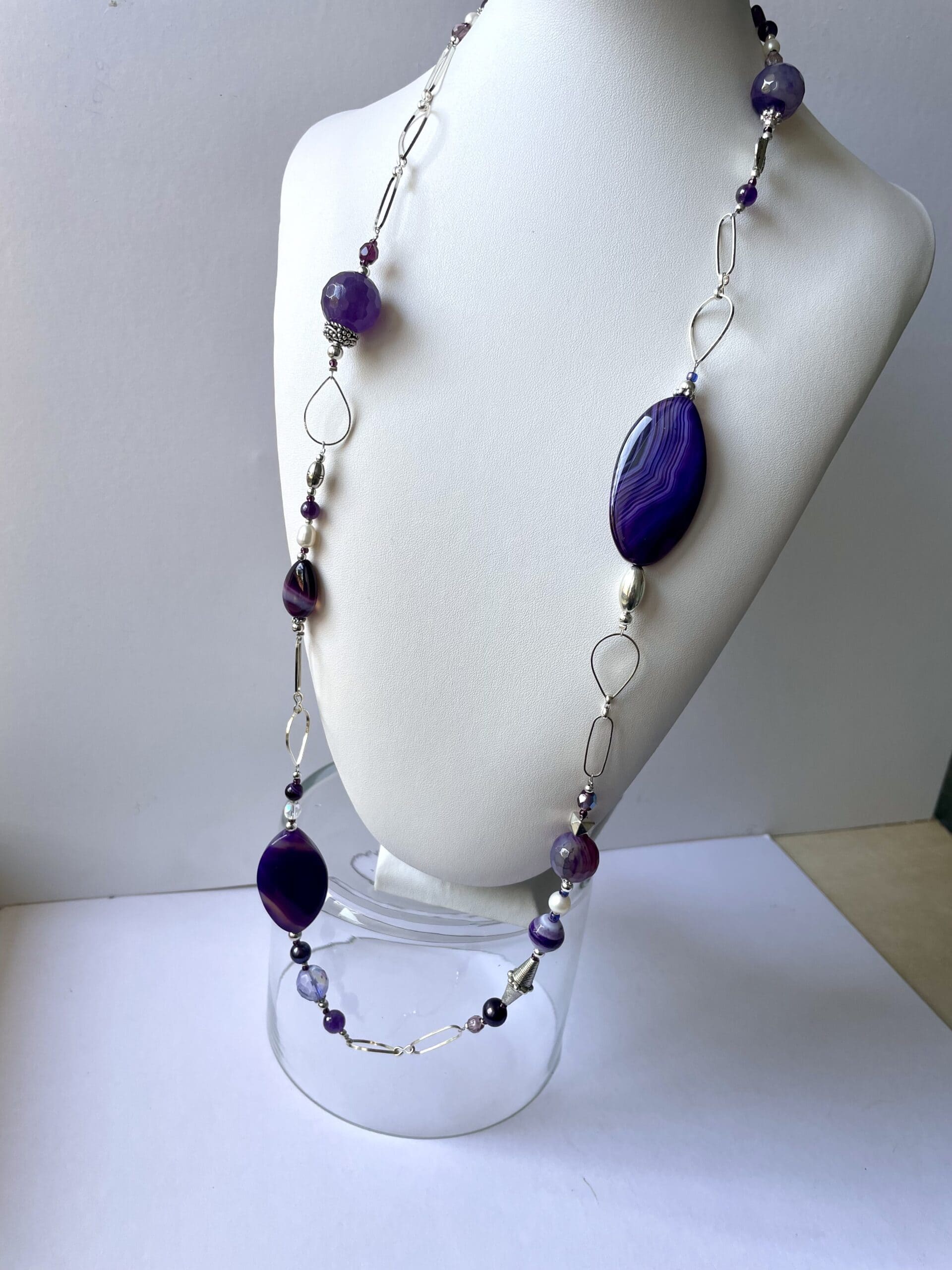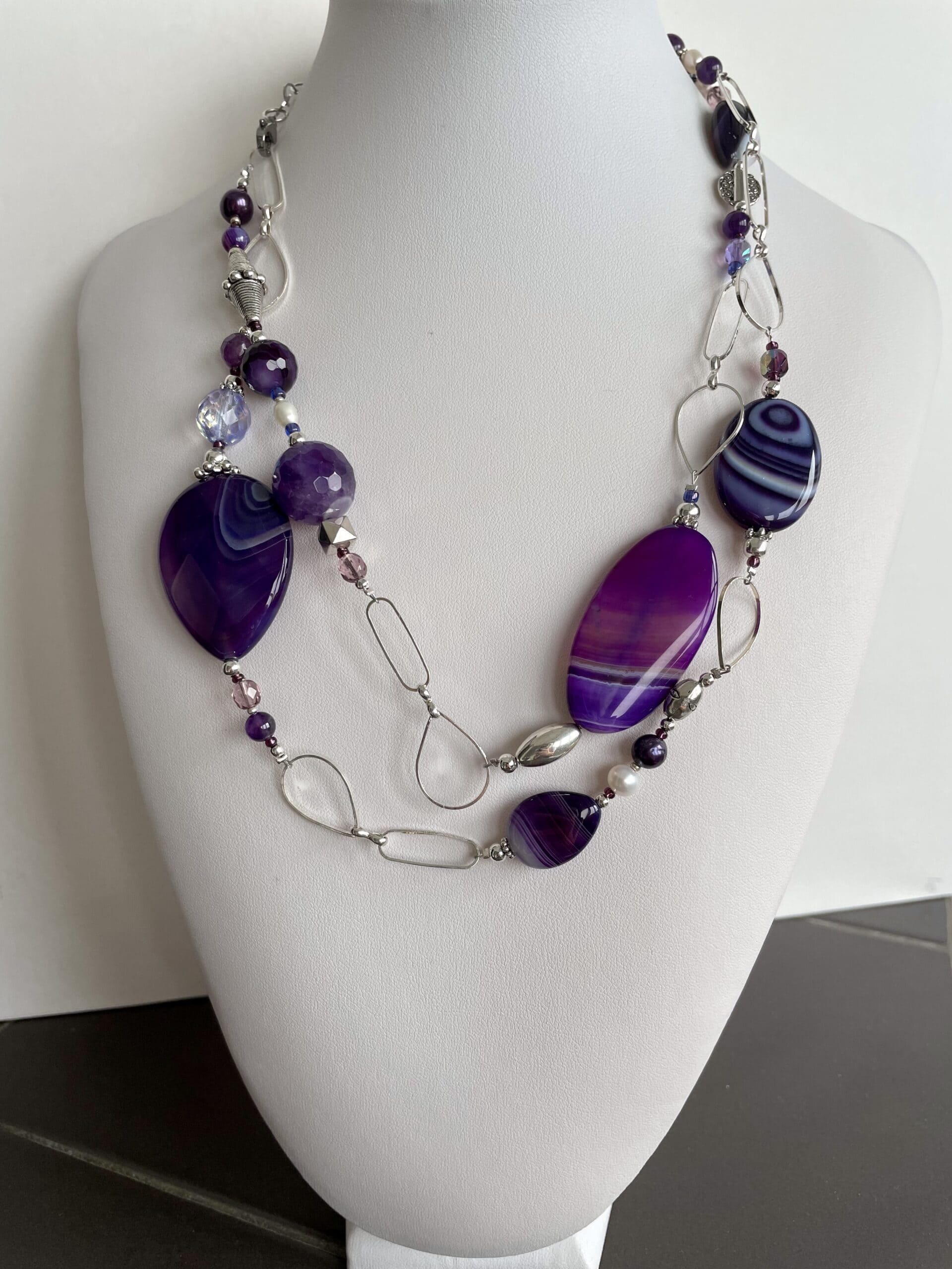Un gioiello realizzato completamente a mano con pietre di agata viola dalle molteplici sfumature e luminosa ametista. Vi sono anche lucenti cristalli di Boemia, perle di fiume bianche e viola, pasta di vetro. Ogni esemplare presenta caratteristiche uniche che la differenziano dalle altre. Ciascuna pietra possiede sfumature e motivi diversi e caratteristici. E così garantito che ogni collana rappresenta davvero un pezzo unico ed inimitabile.