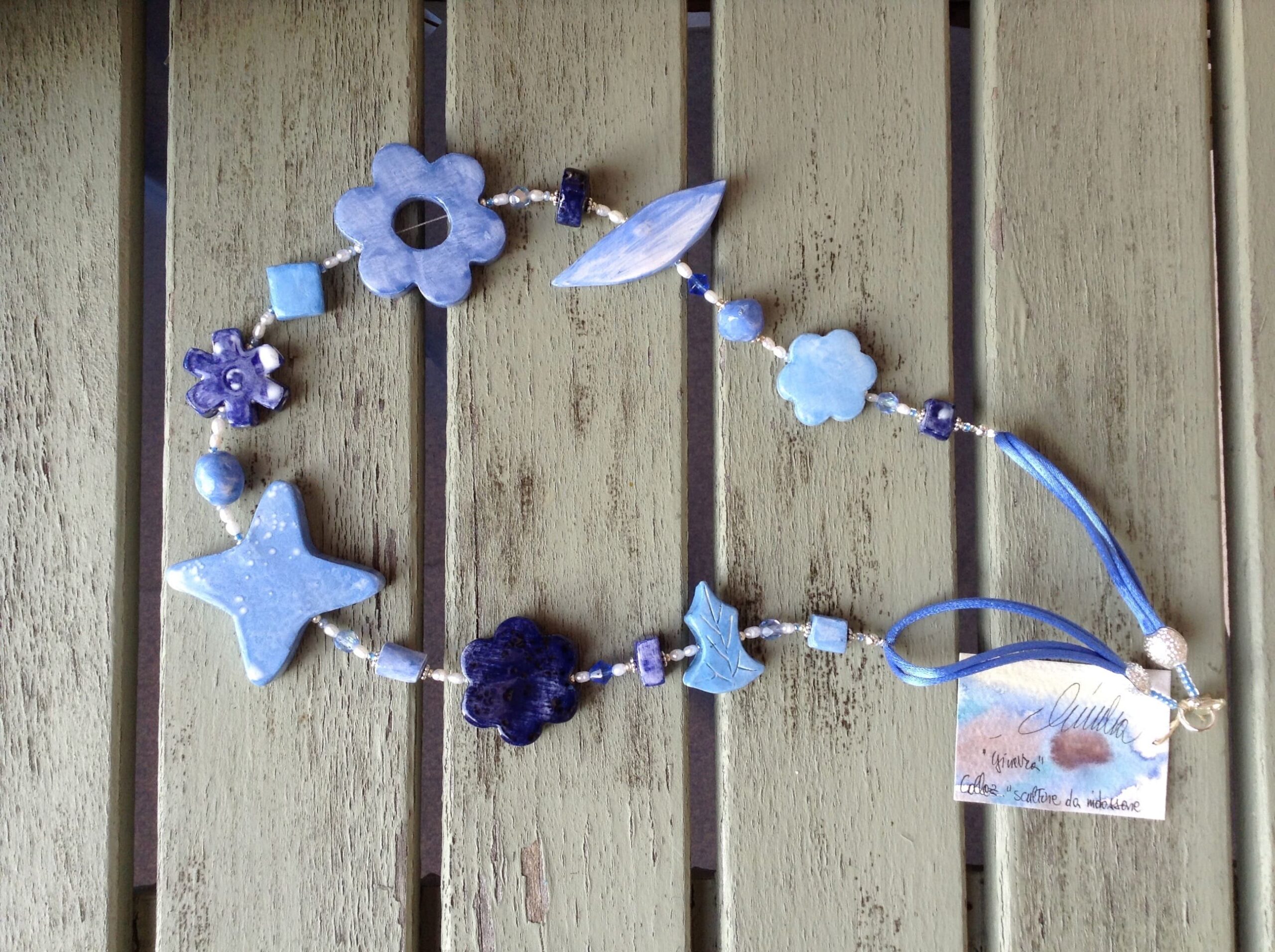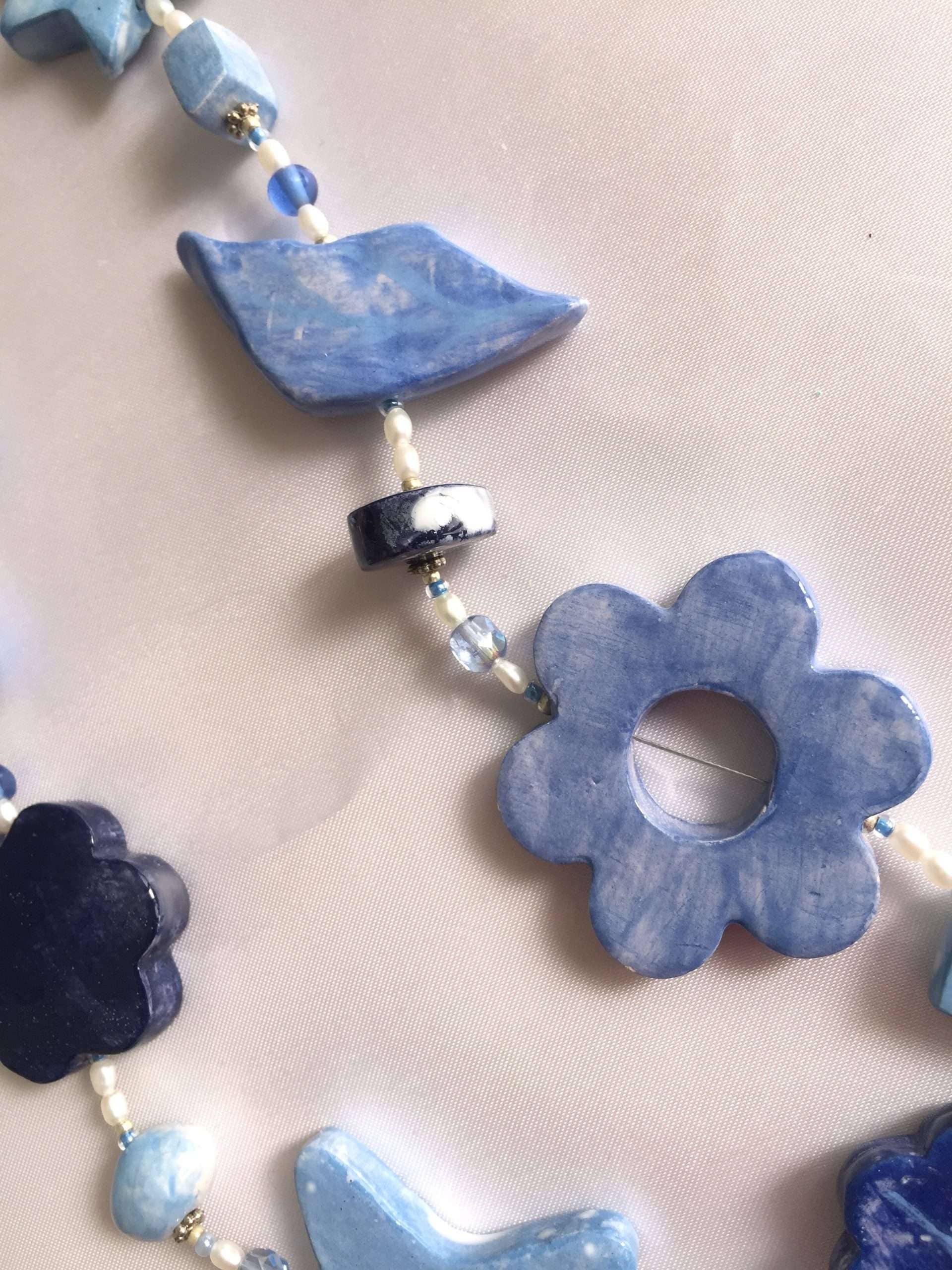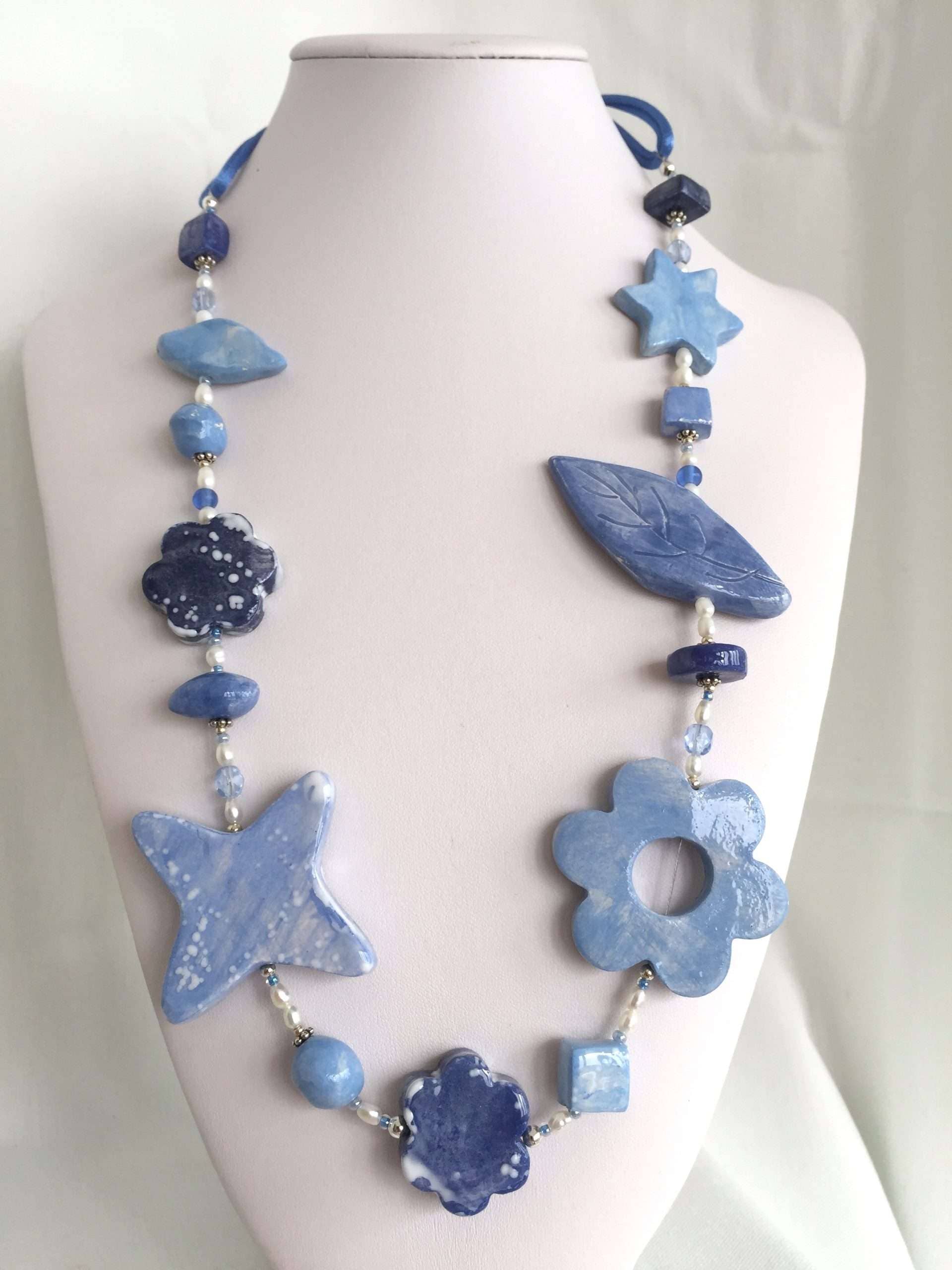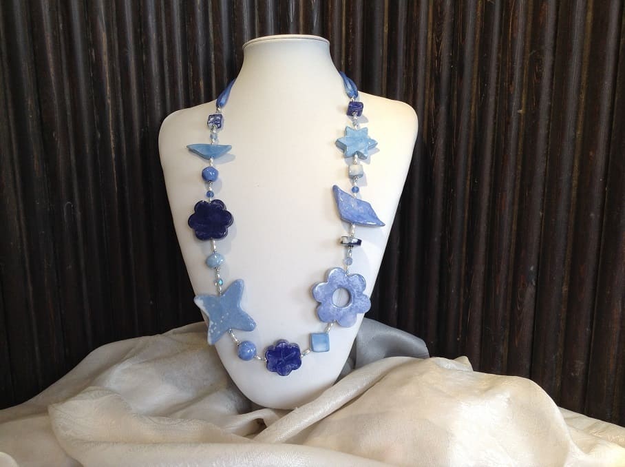 Fiori e foglie decorano questa originalissima collana in ceramica lavorata a mano. Azzurri e luminosi blu sono sfumati con maestria come in un quadro ad acquerello.