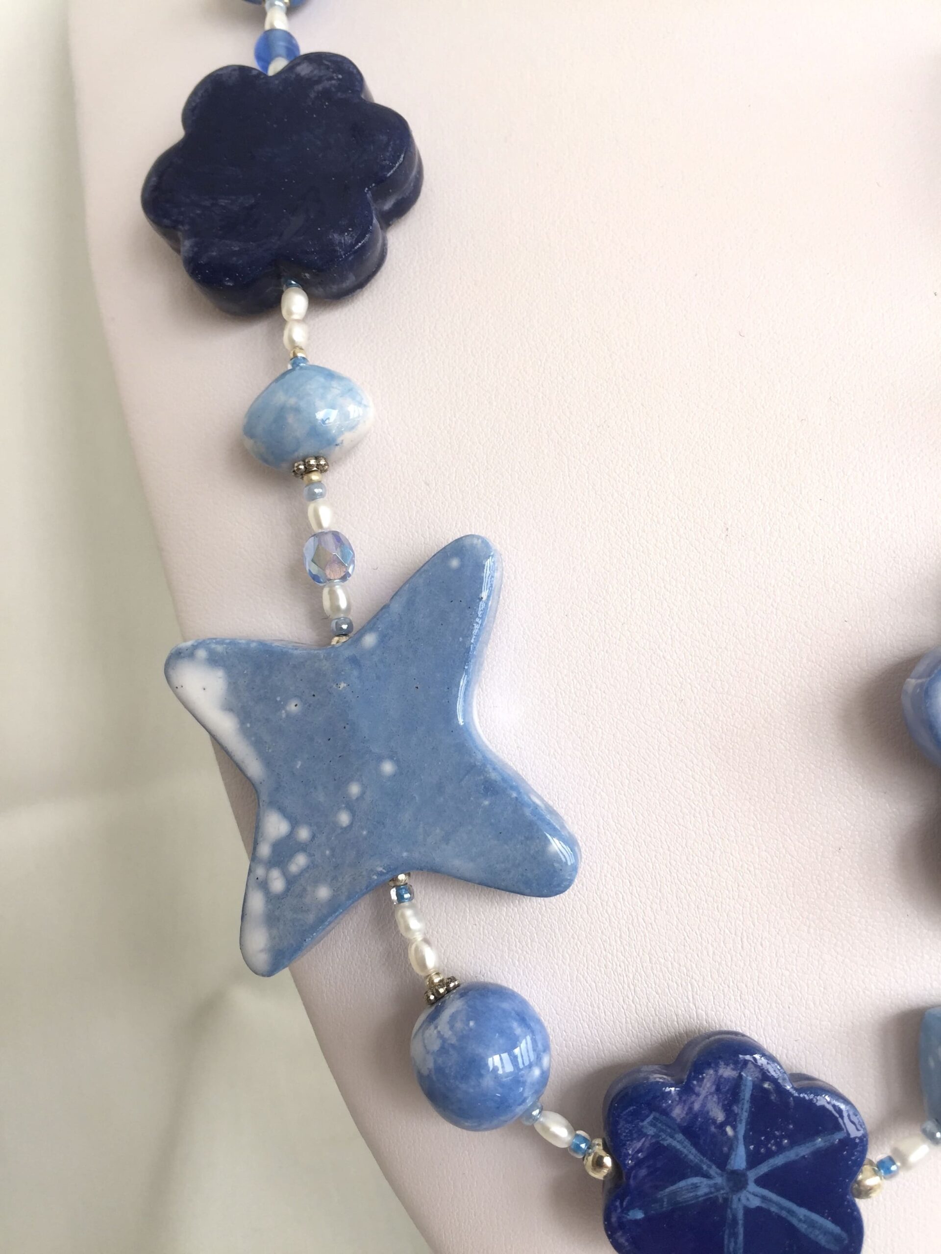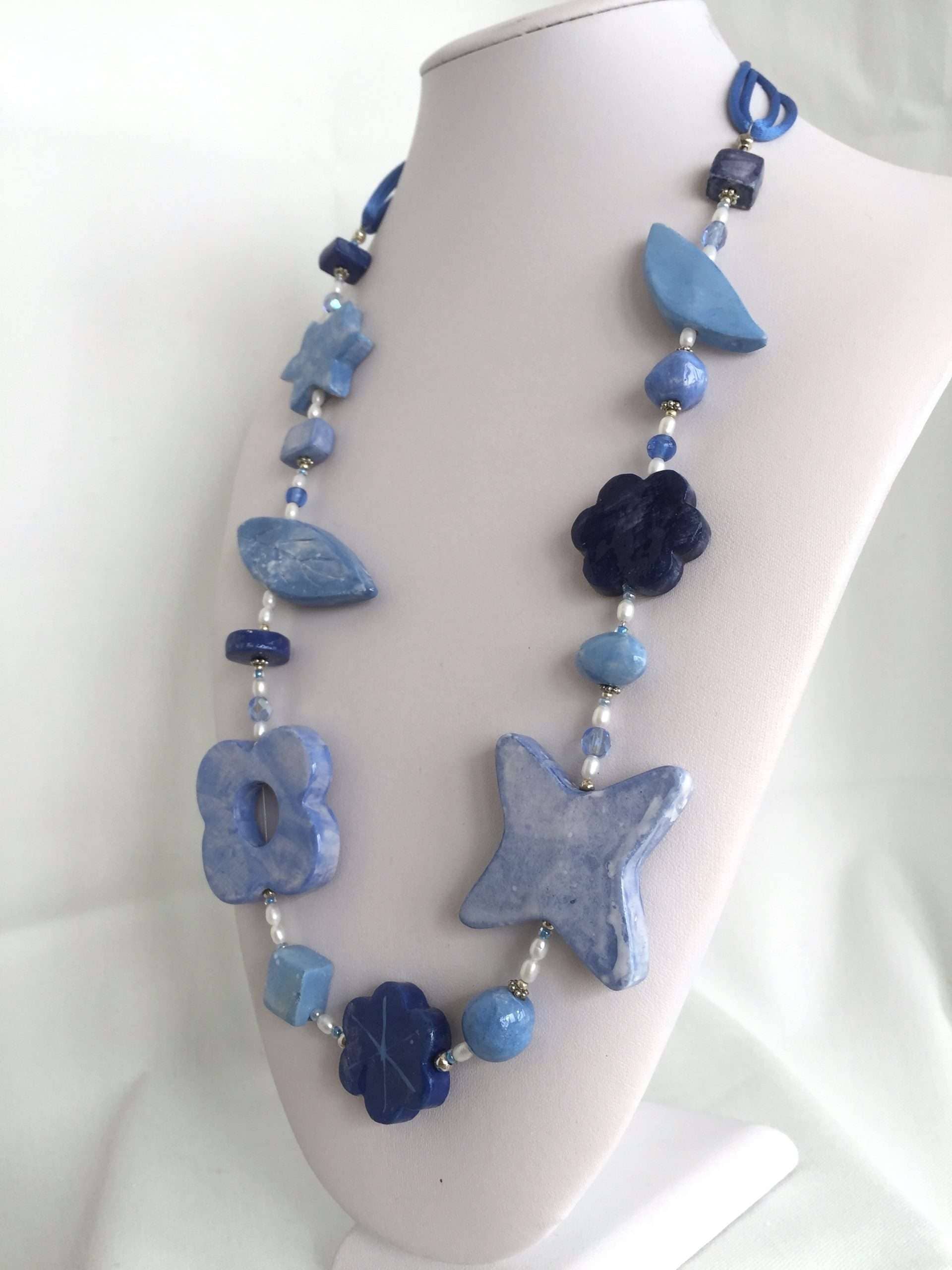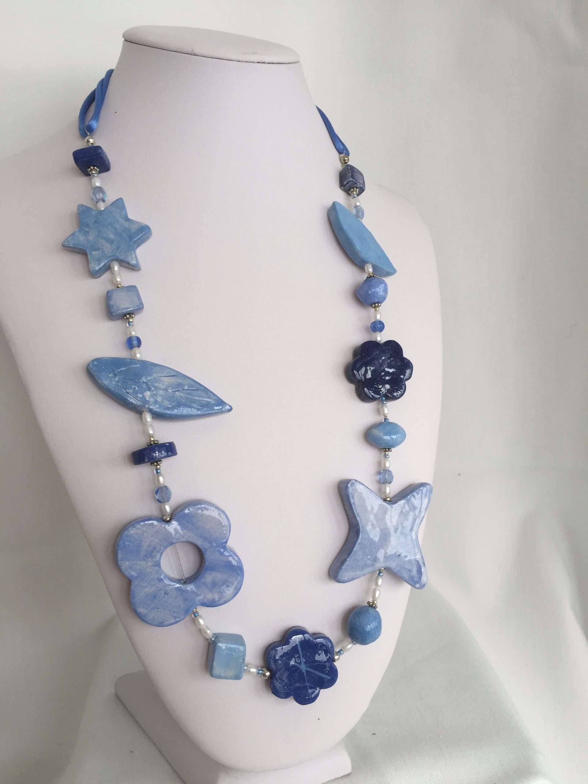 Fiori e foglie decorano questa originalissima collana in ceramica lavorata a mano. Azzurri e luminosi blu sono sfumati con maestria come in un quadro ad acquerello.