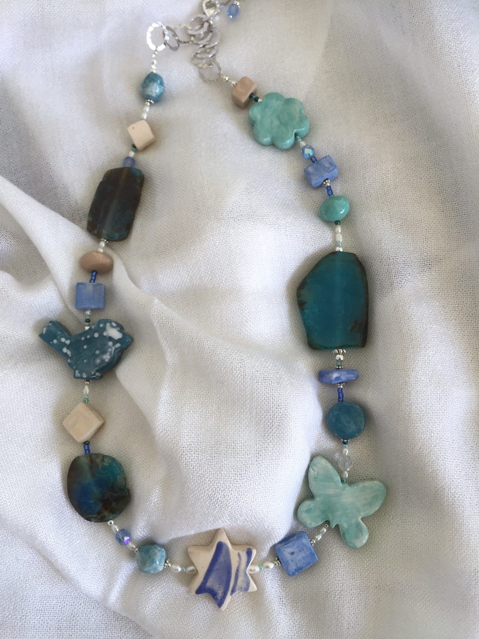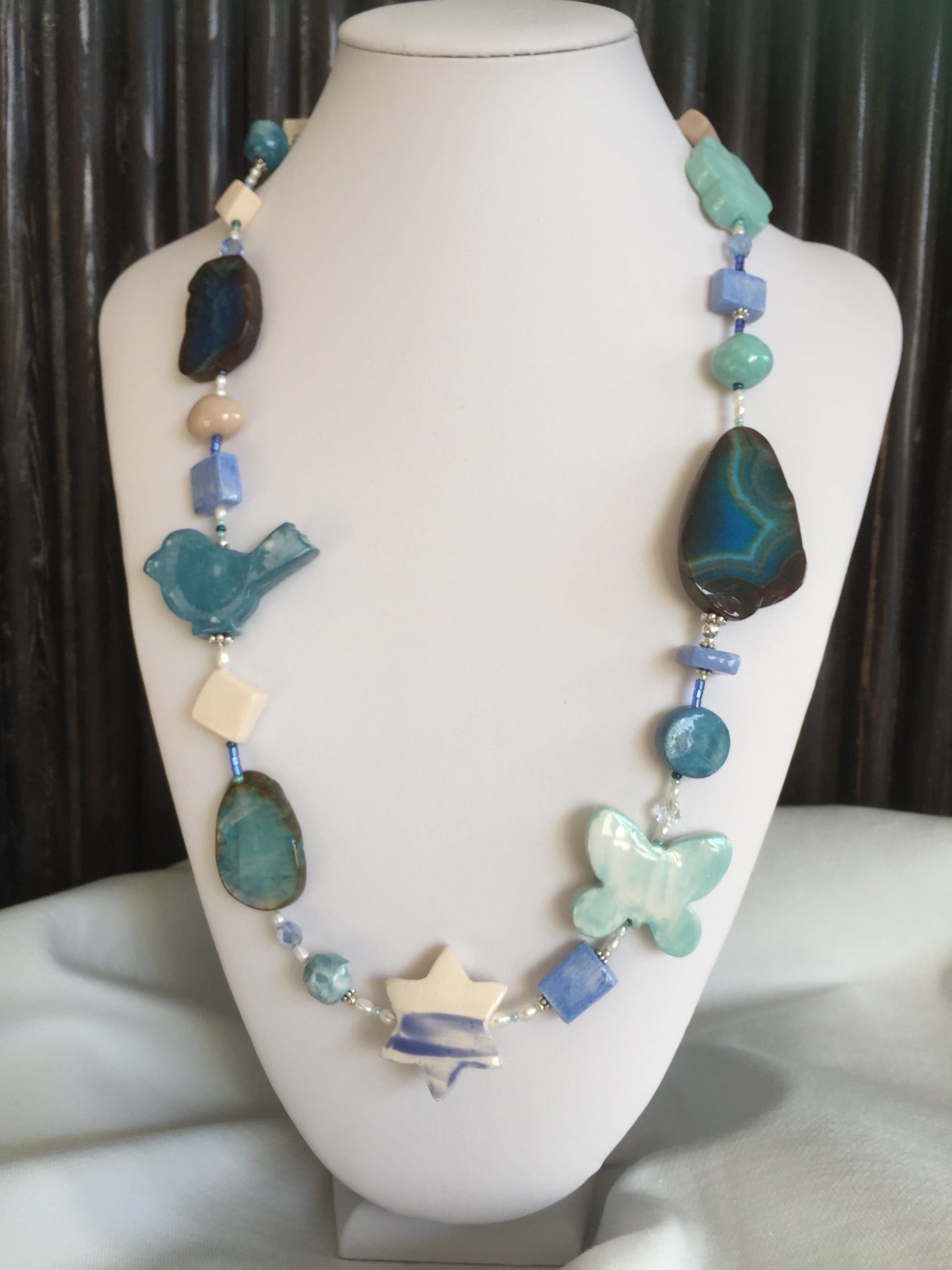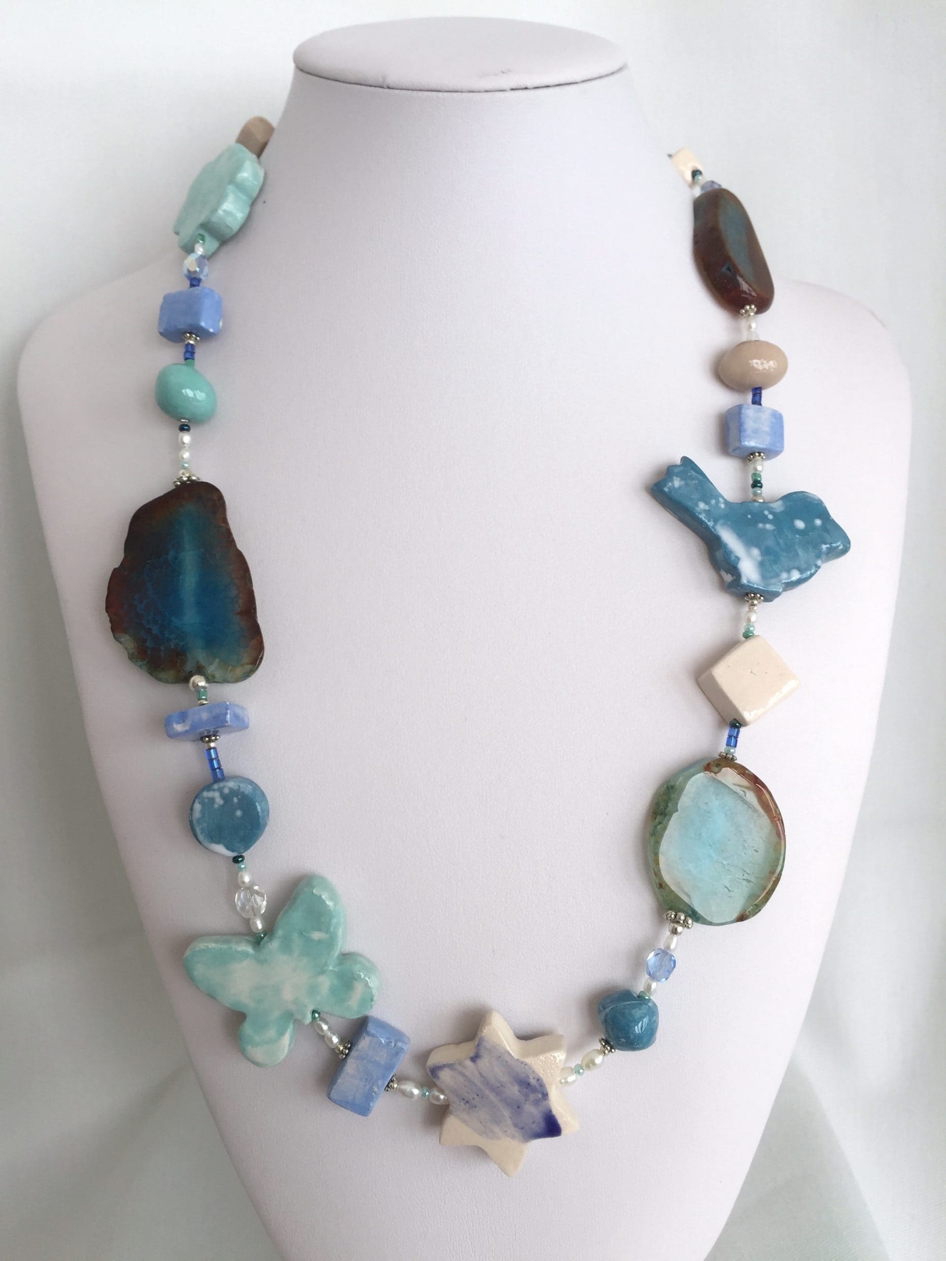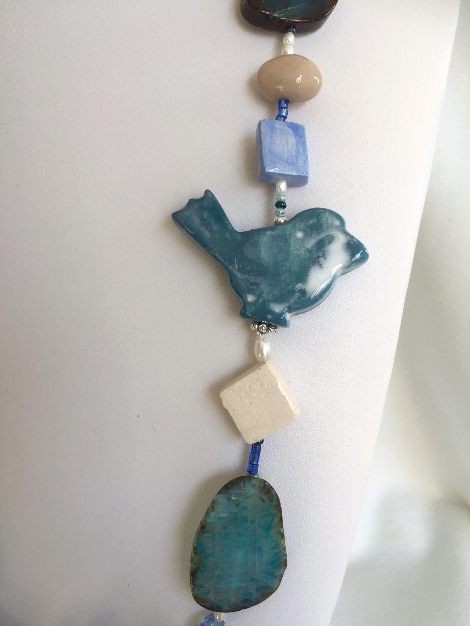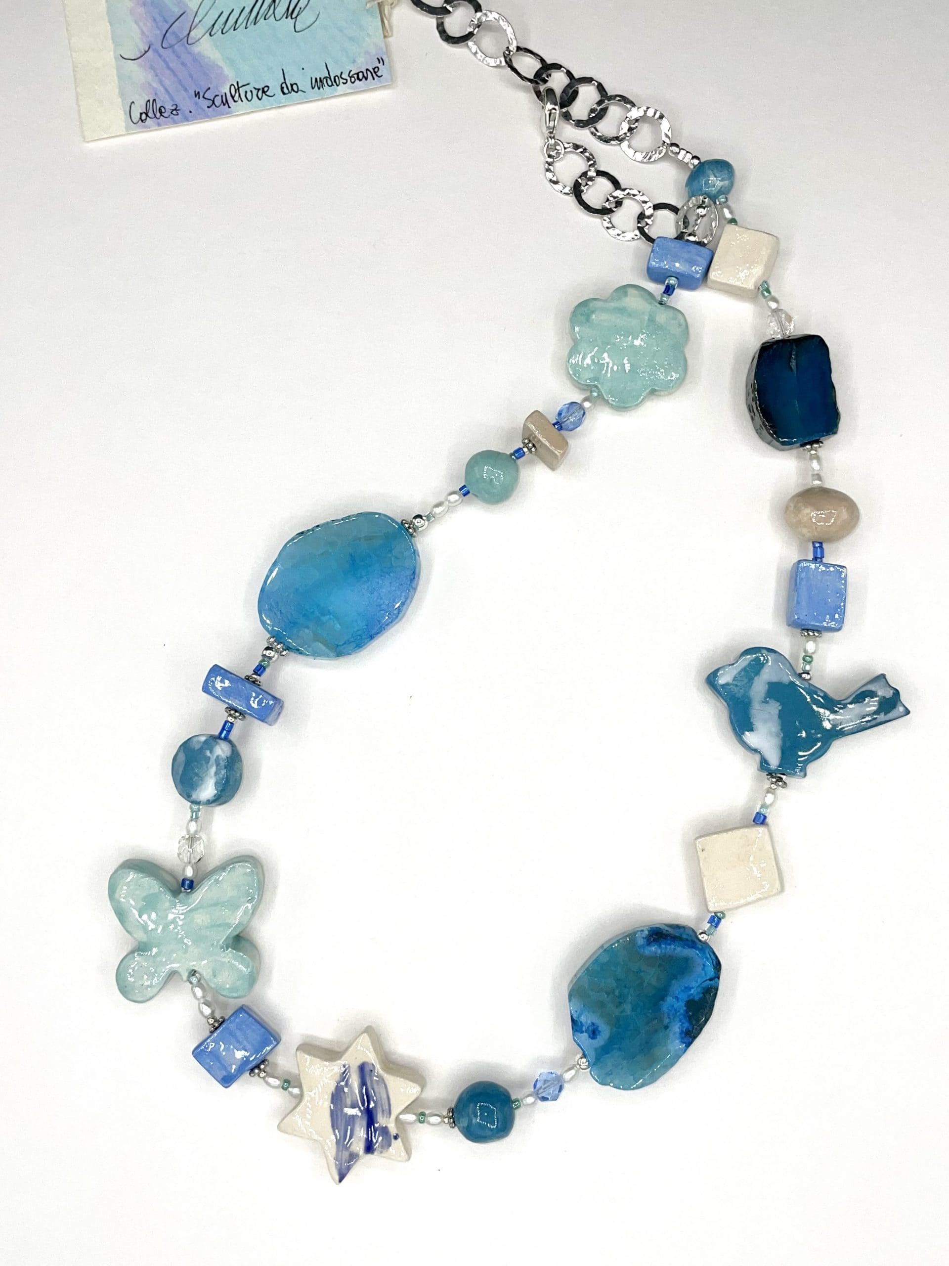 Gioiello molto particolare che unisce la raffinatezza dell’agata tranche turchese-verde all’originalità della ceramica. In più la preziosità della catena in argento italiano 925 battuto a mano.