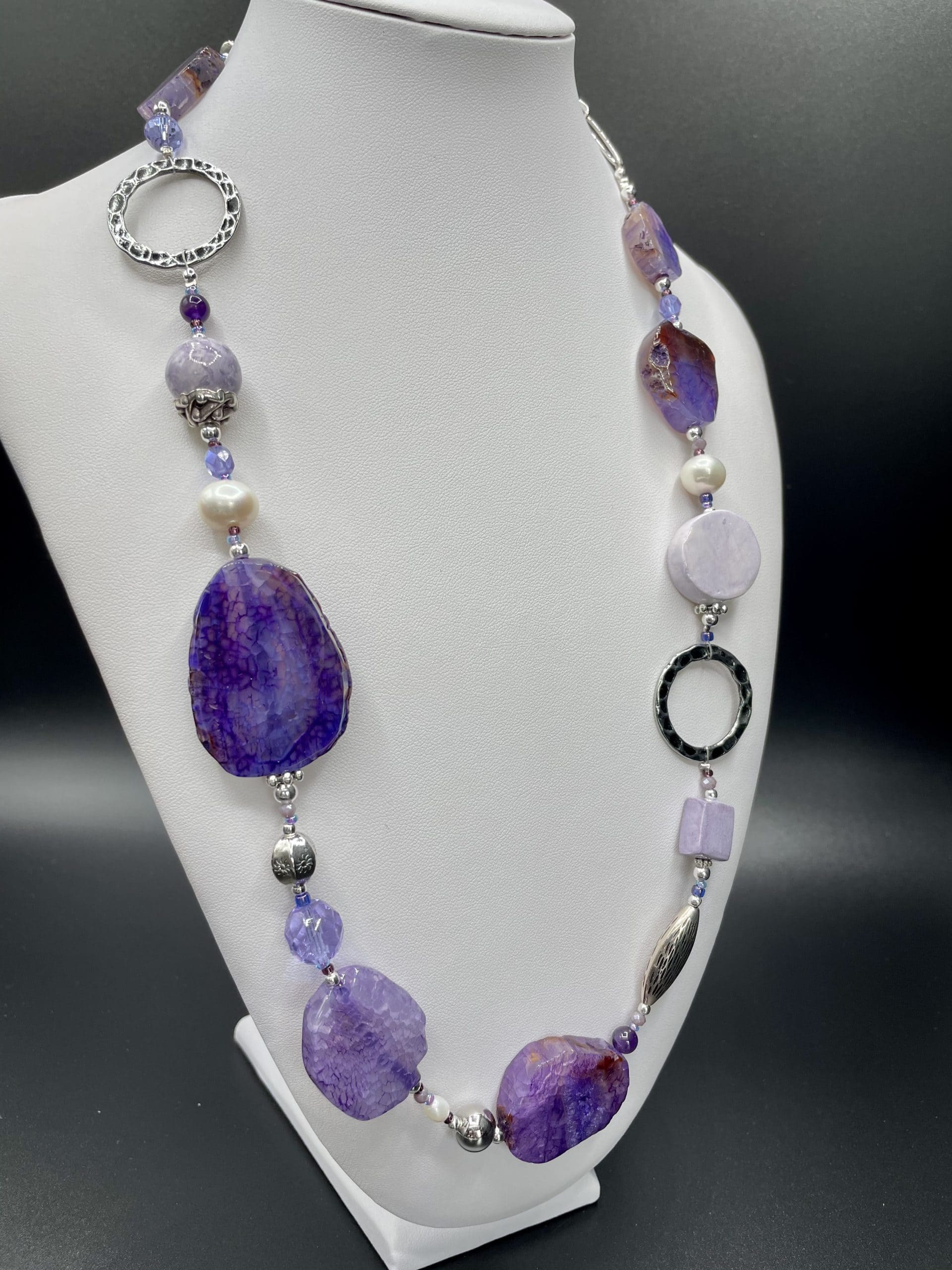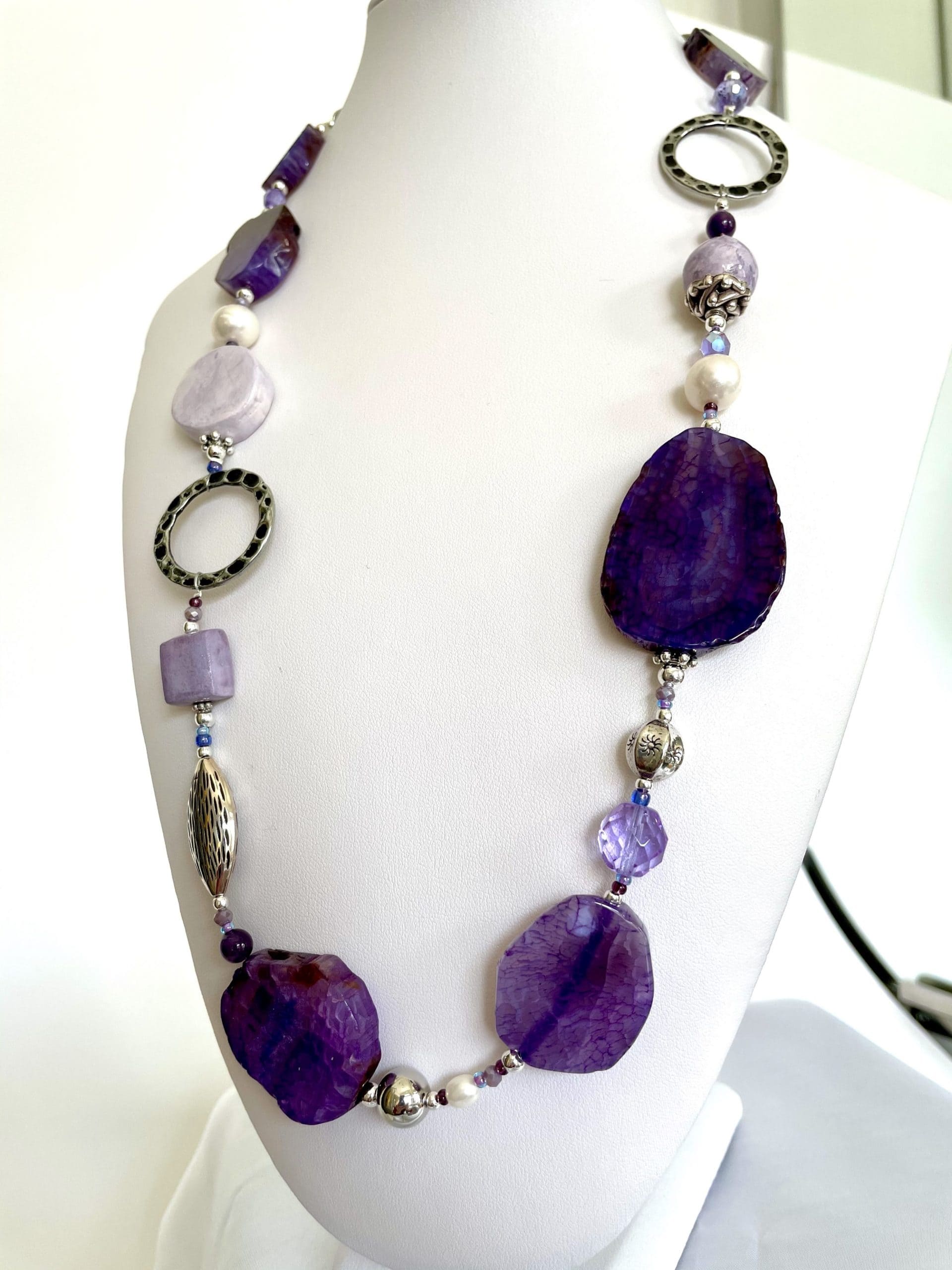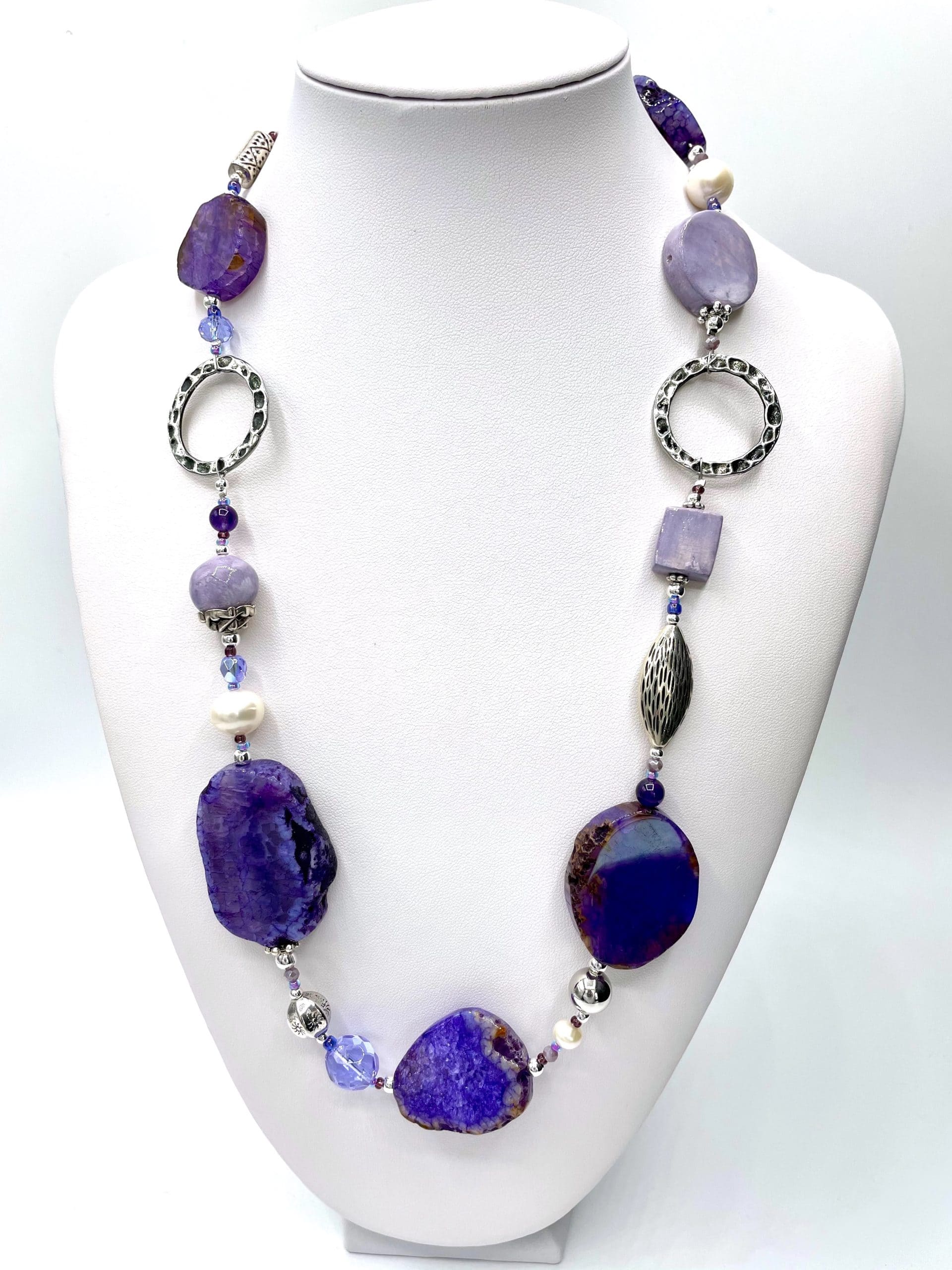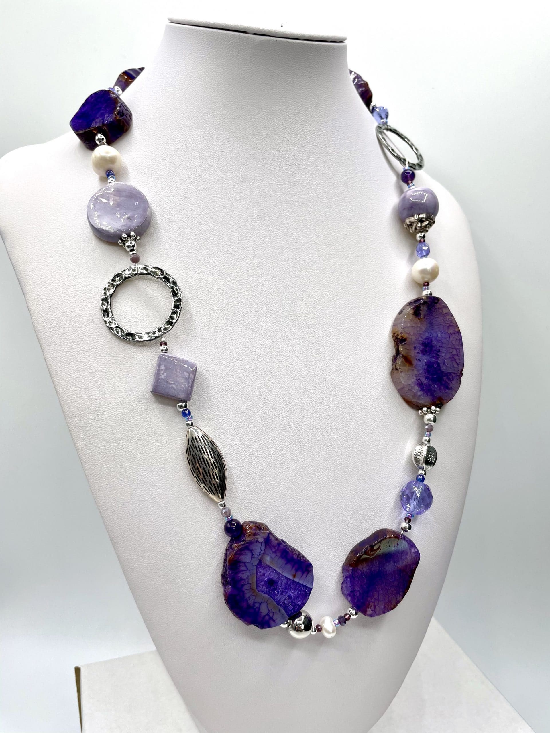 Una collana magica per la suggestione delle sfumature lilla e viola delle grandi pietre piatte. I colori risaltano ancora di più grazie agli elementi in ceramica lavorata a mano e ai cristalli di Boemia.