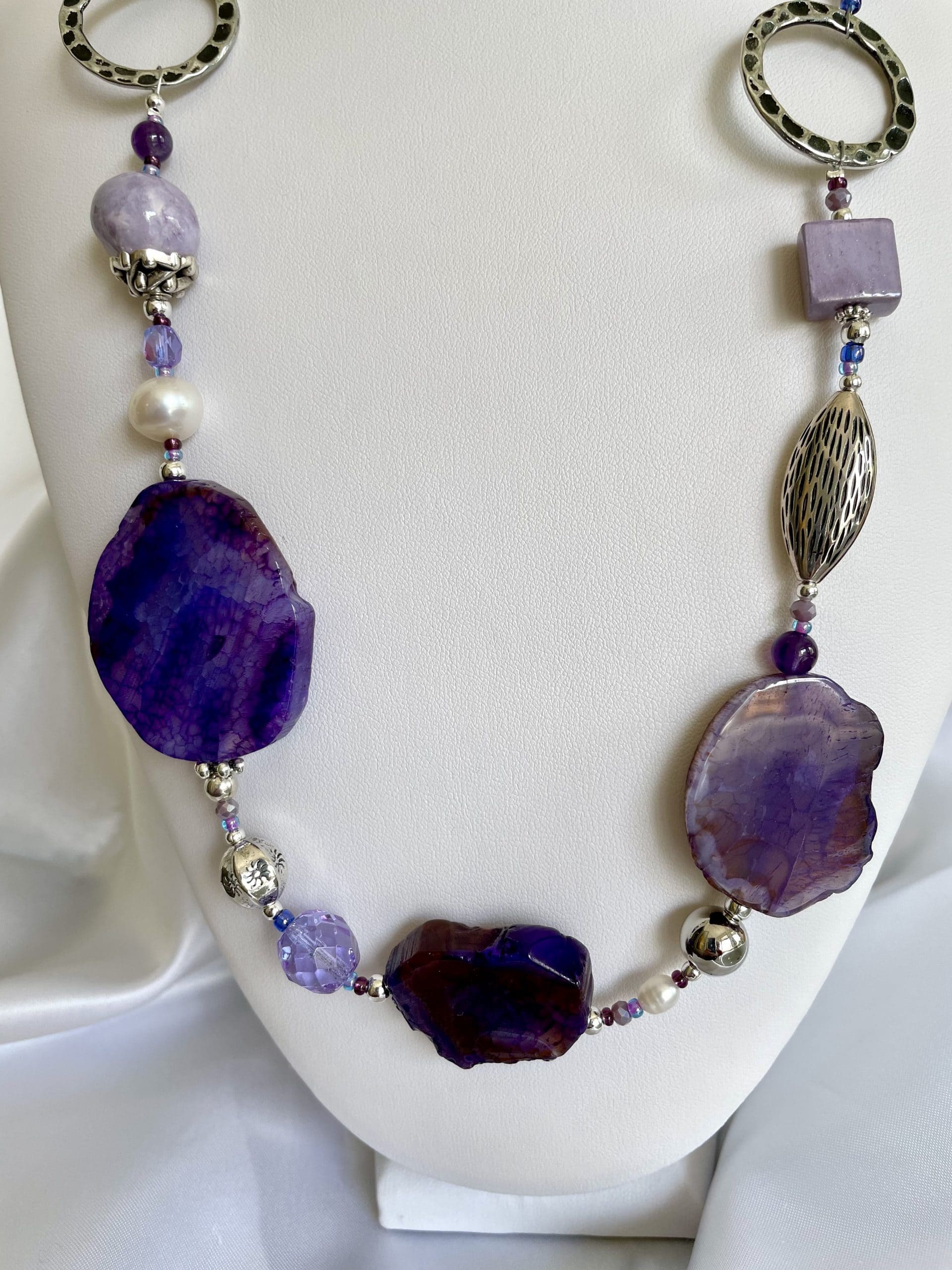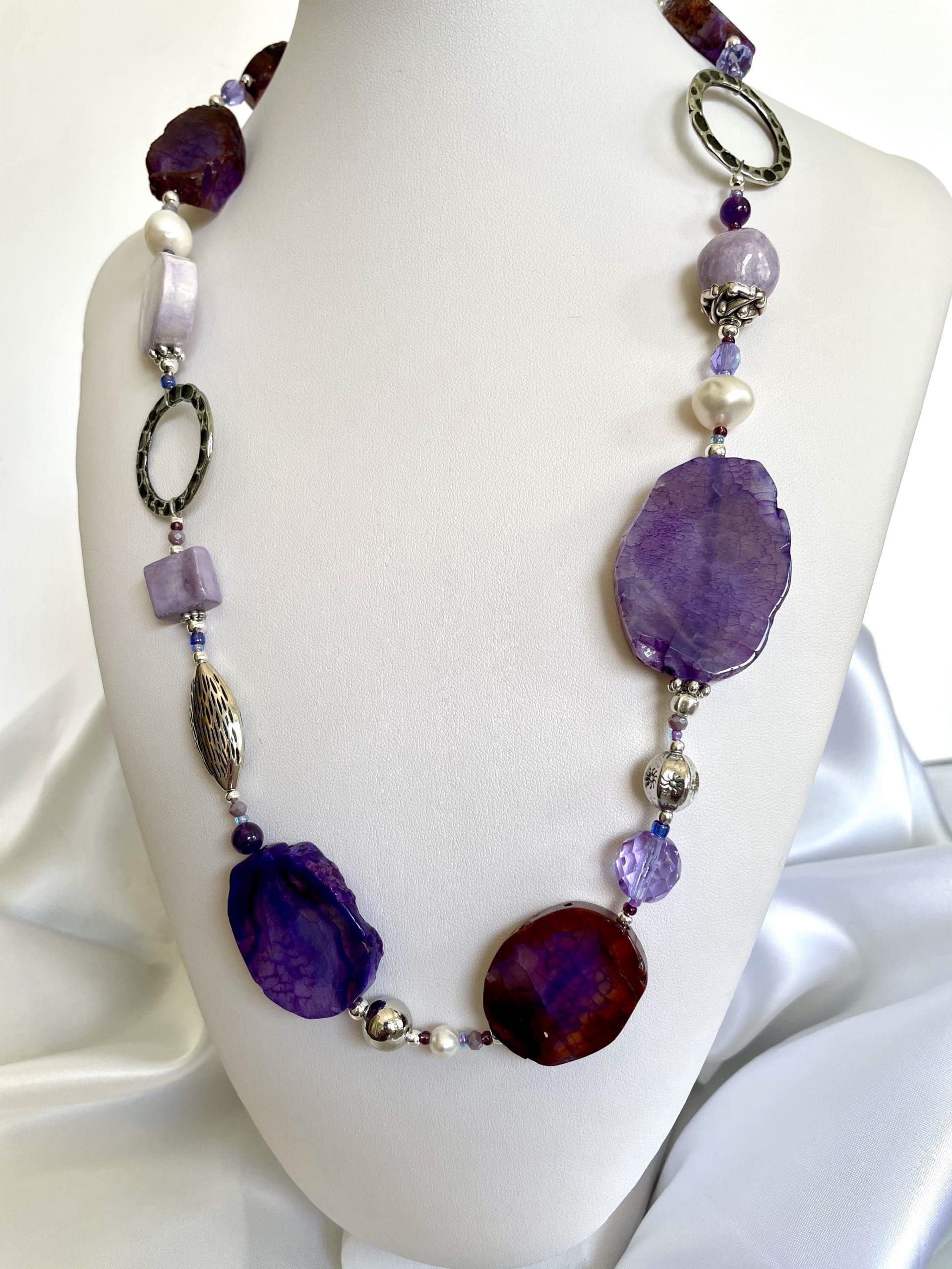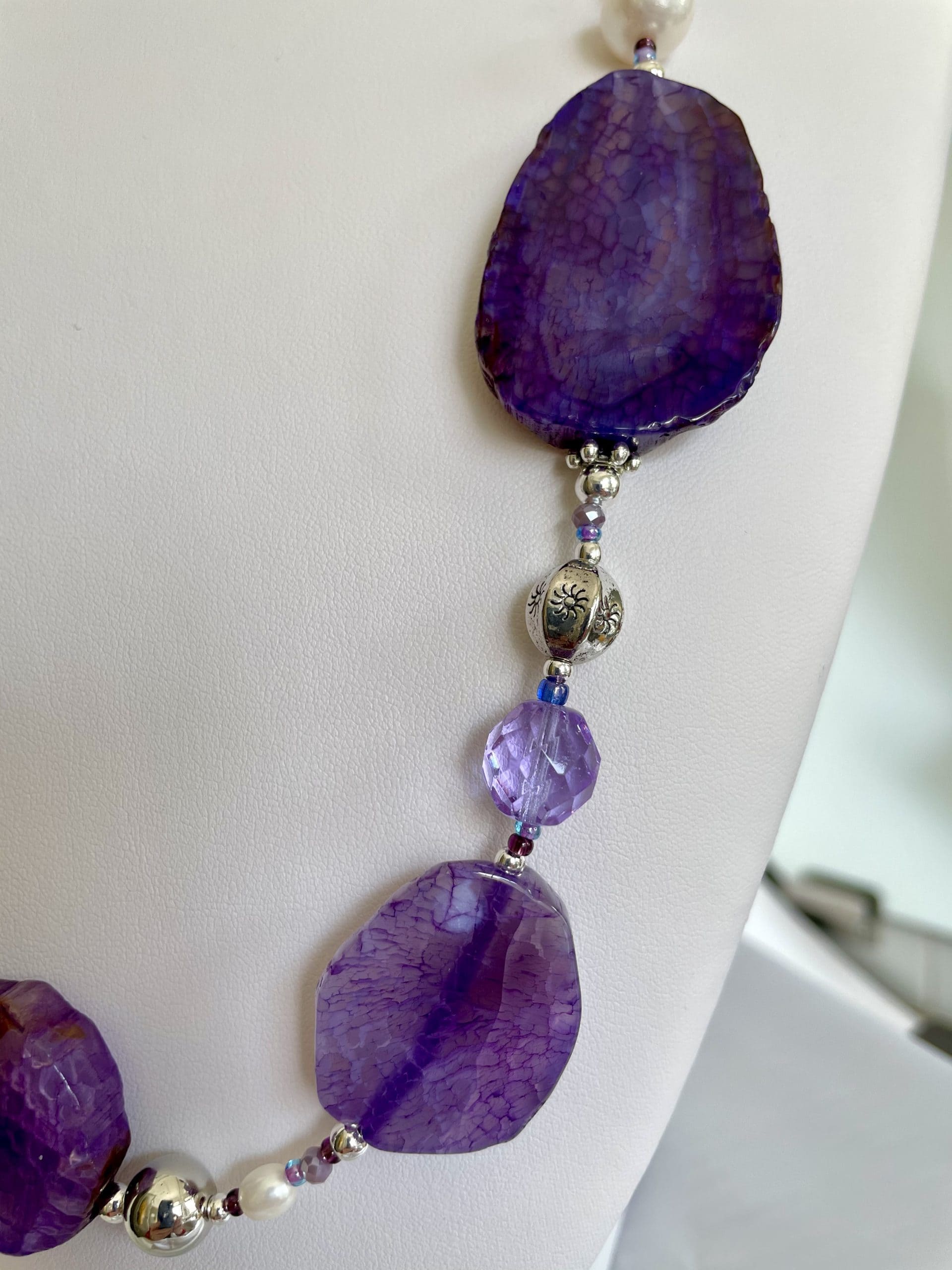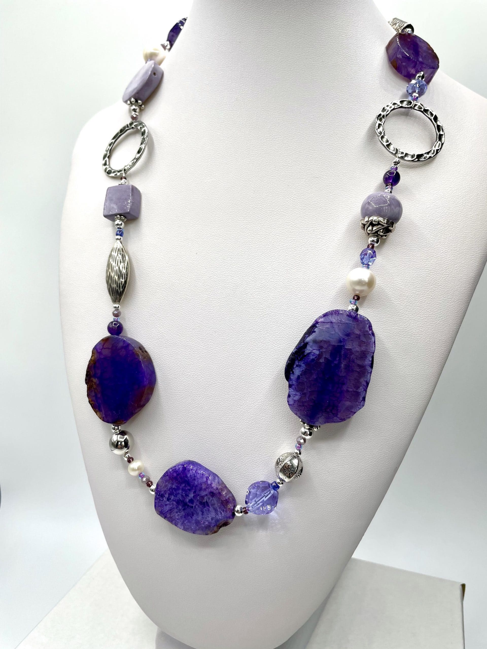 Una collana magica per la suggestione delle sfumature lilla e viola delle grandi pietre piatte. I colori risaltano ancora di più grazie agli elementi in ceramica lavorata a mano e ai cristalli di Boemia.