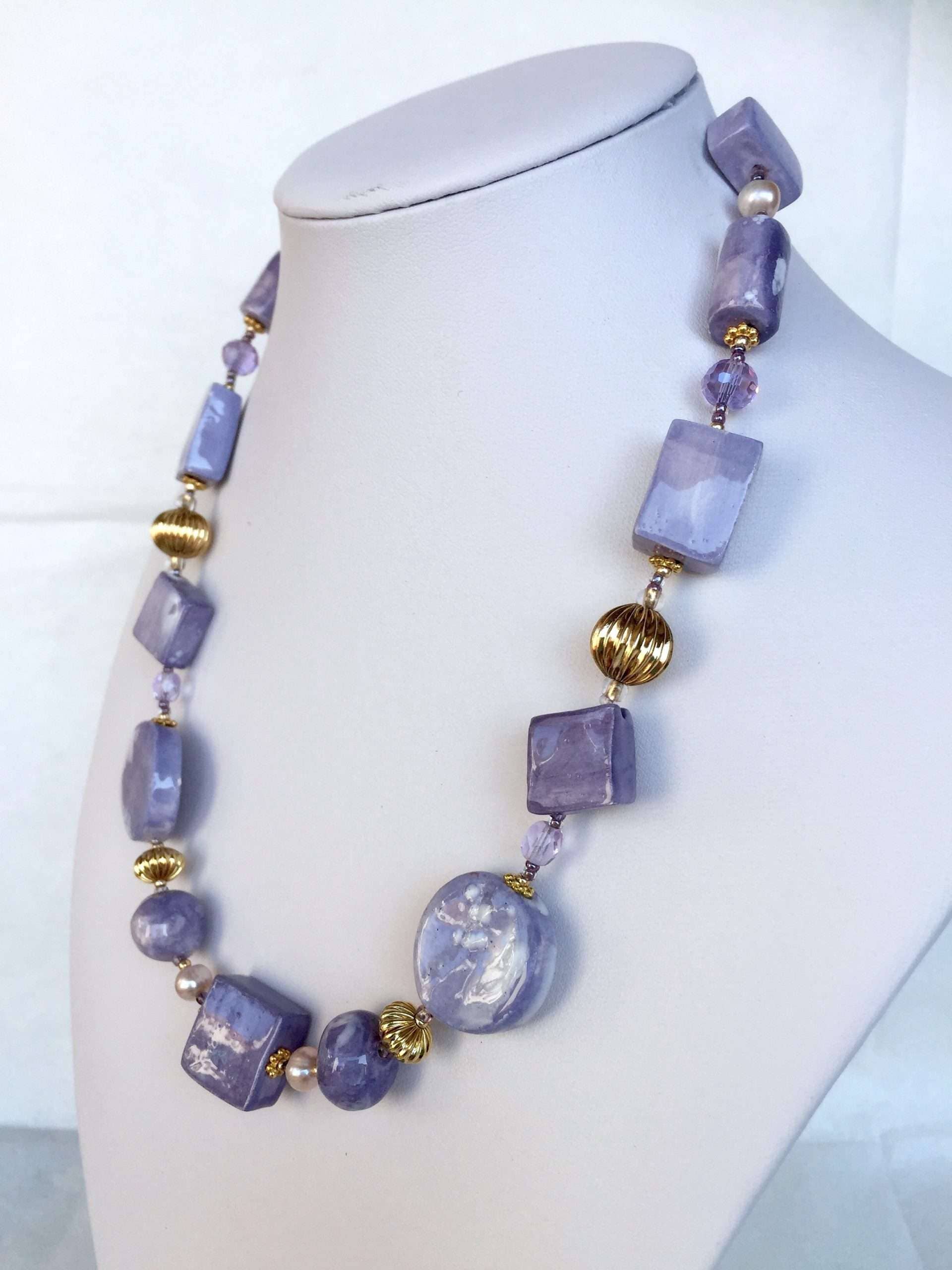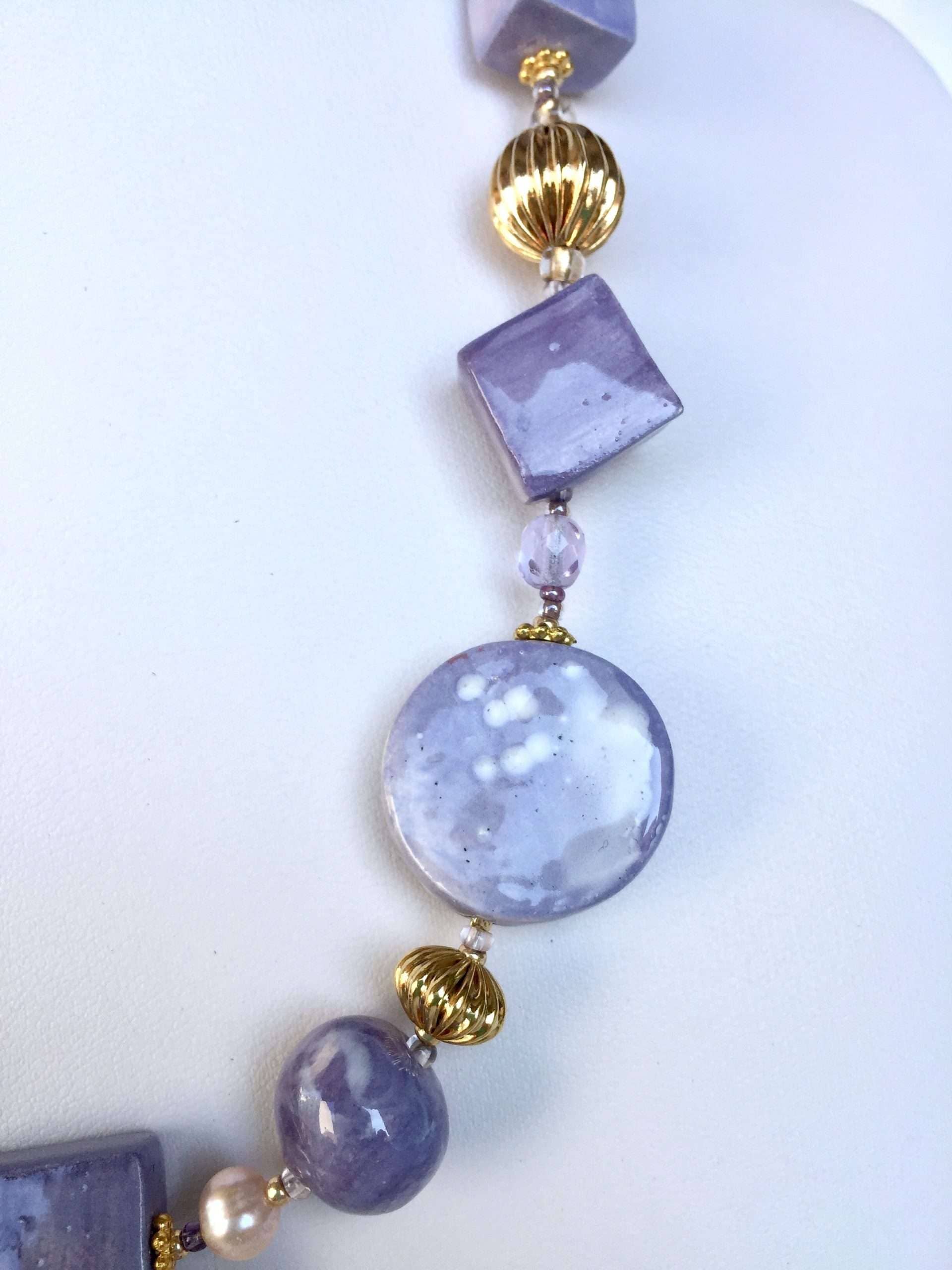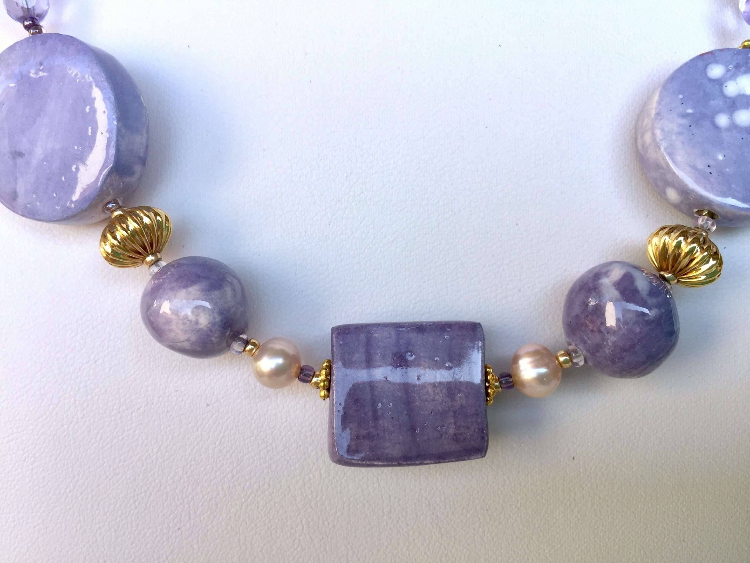 Tonalità lilla morbide e luminose caratterizzano COME VELLUTO, elegante girocollo in ceramica lavorata a mano.