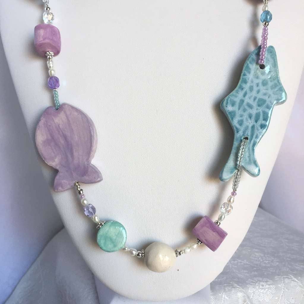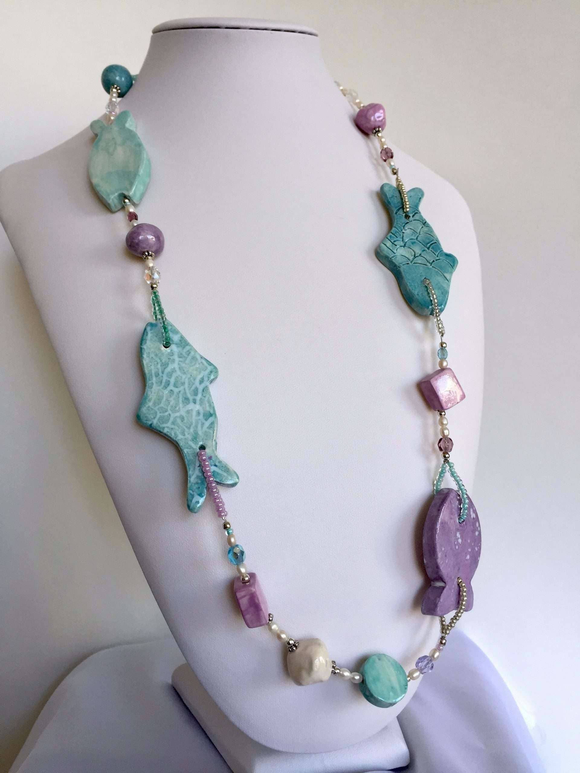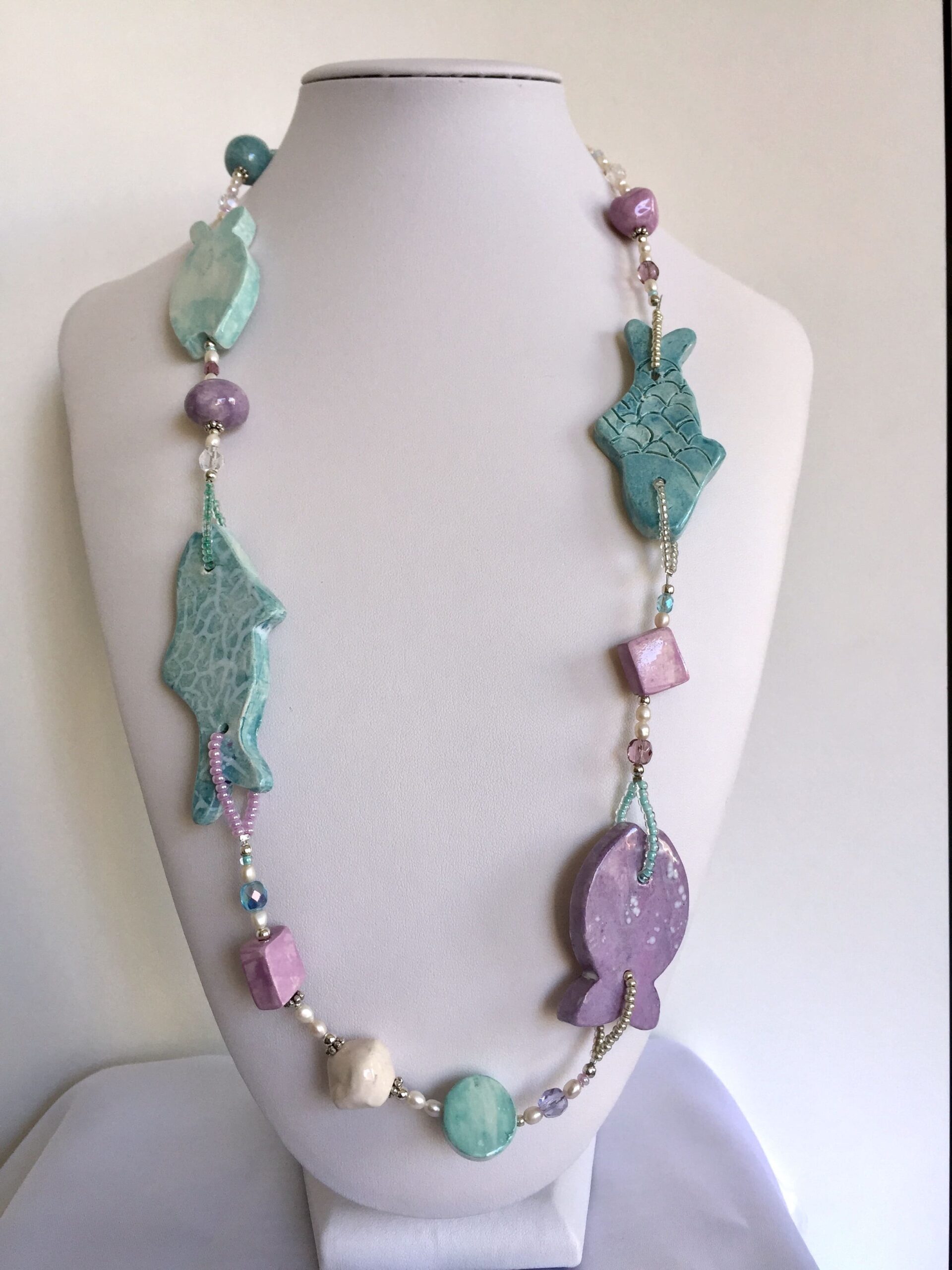 Collana PAPEETE turchese e lilla con pesci in ceramica.