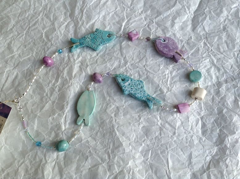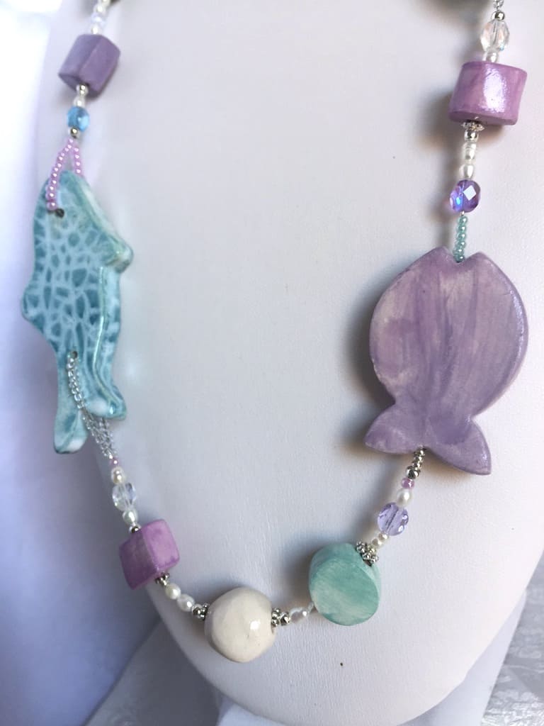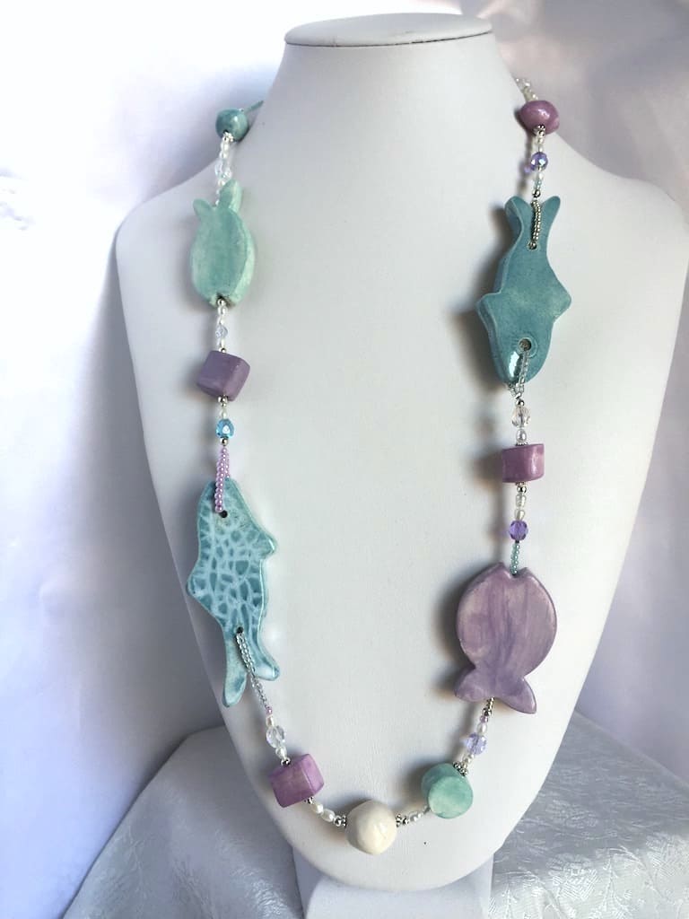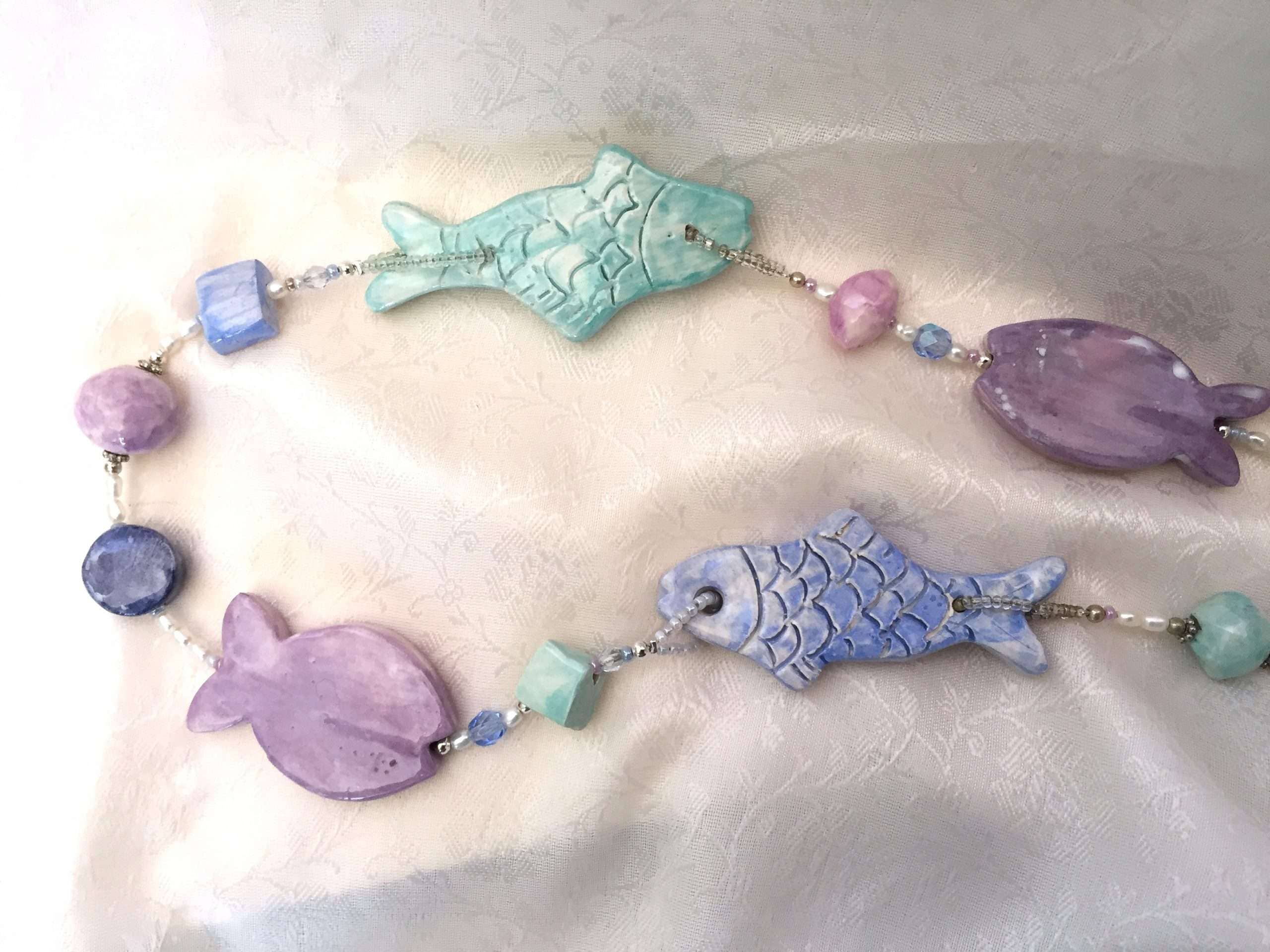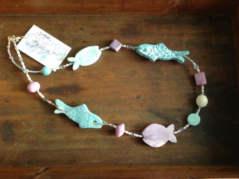 Collana PAPEETE turchese e lilla con pesci in ceramica.