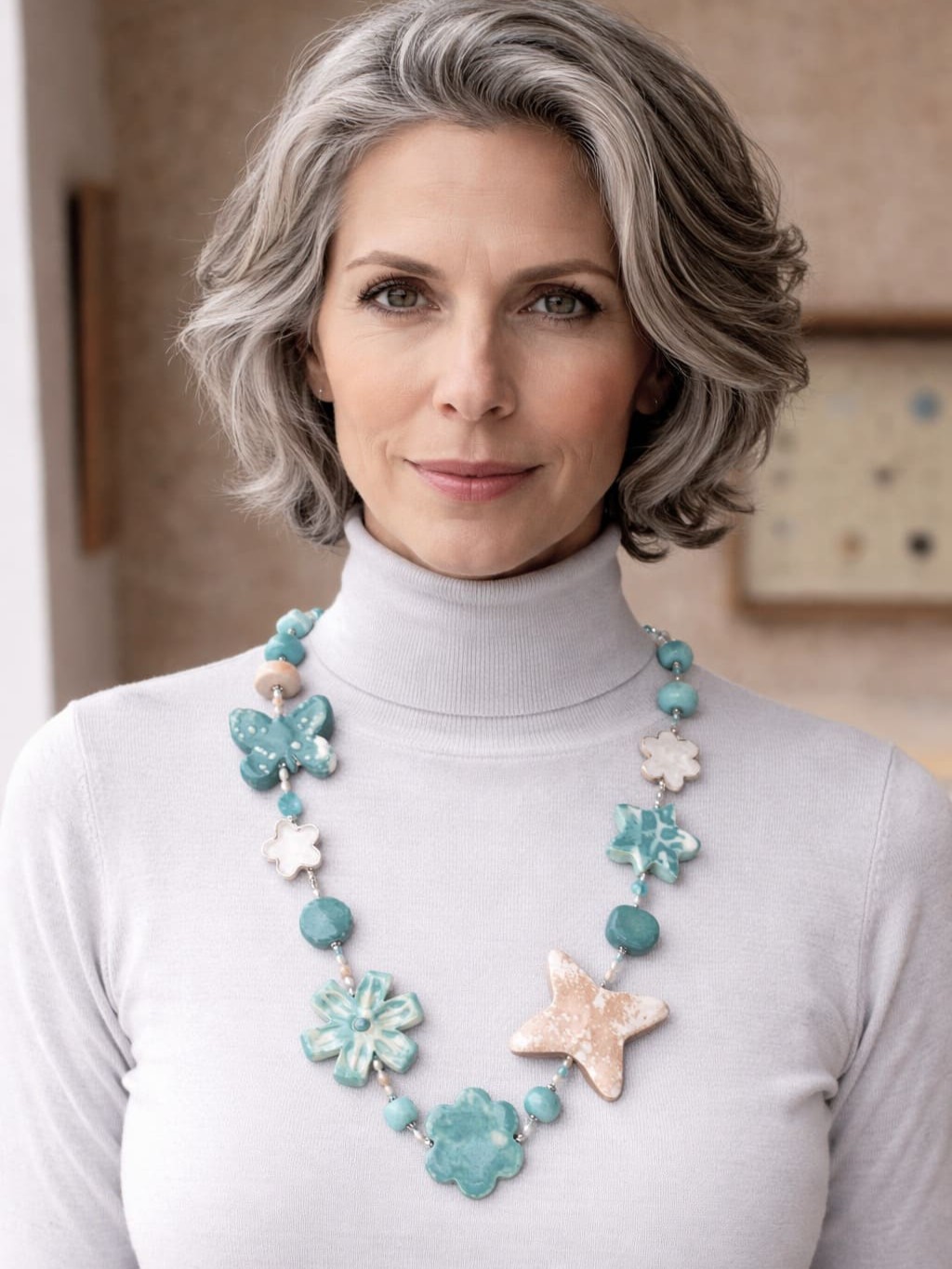 Si dice che Venere sia nata a Cipro, da acque trasparenti e turchesi come i delicati toni di questa collana, aggraziata e particolare nelle forme e nei colori. Anche una farfalla si è posata tra i fiori che la compongono e ne sottolinea il ritmo asimmetrico. Diverse smaltature conferiscono alla ceramica lavorata a mano quegli effetti che rendono unico ed esclusivo ogni esemplare.