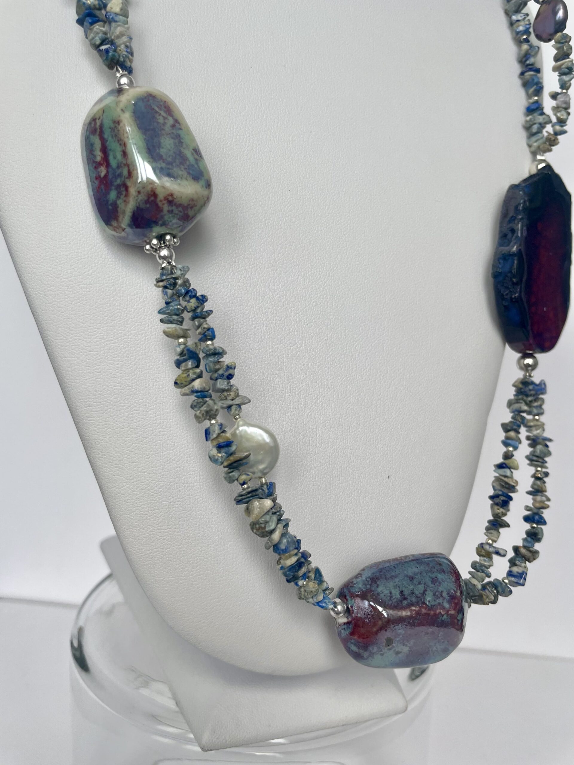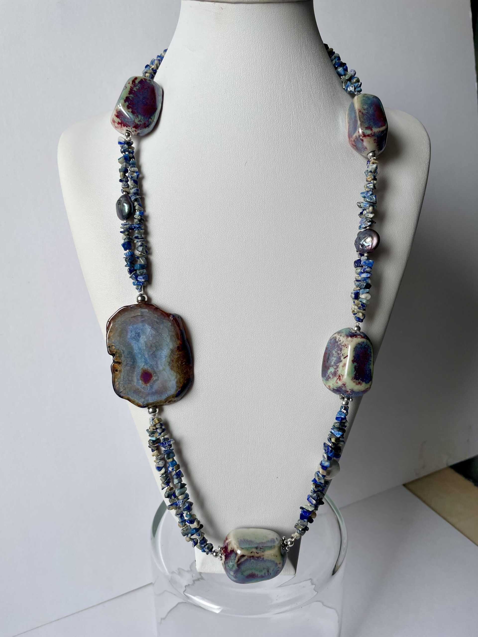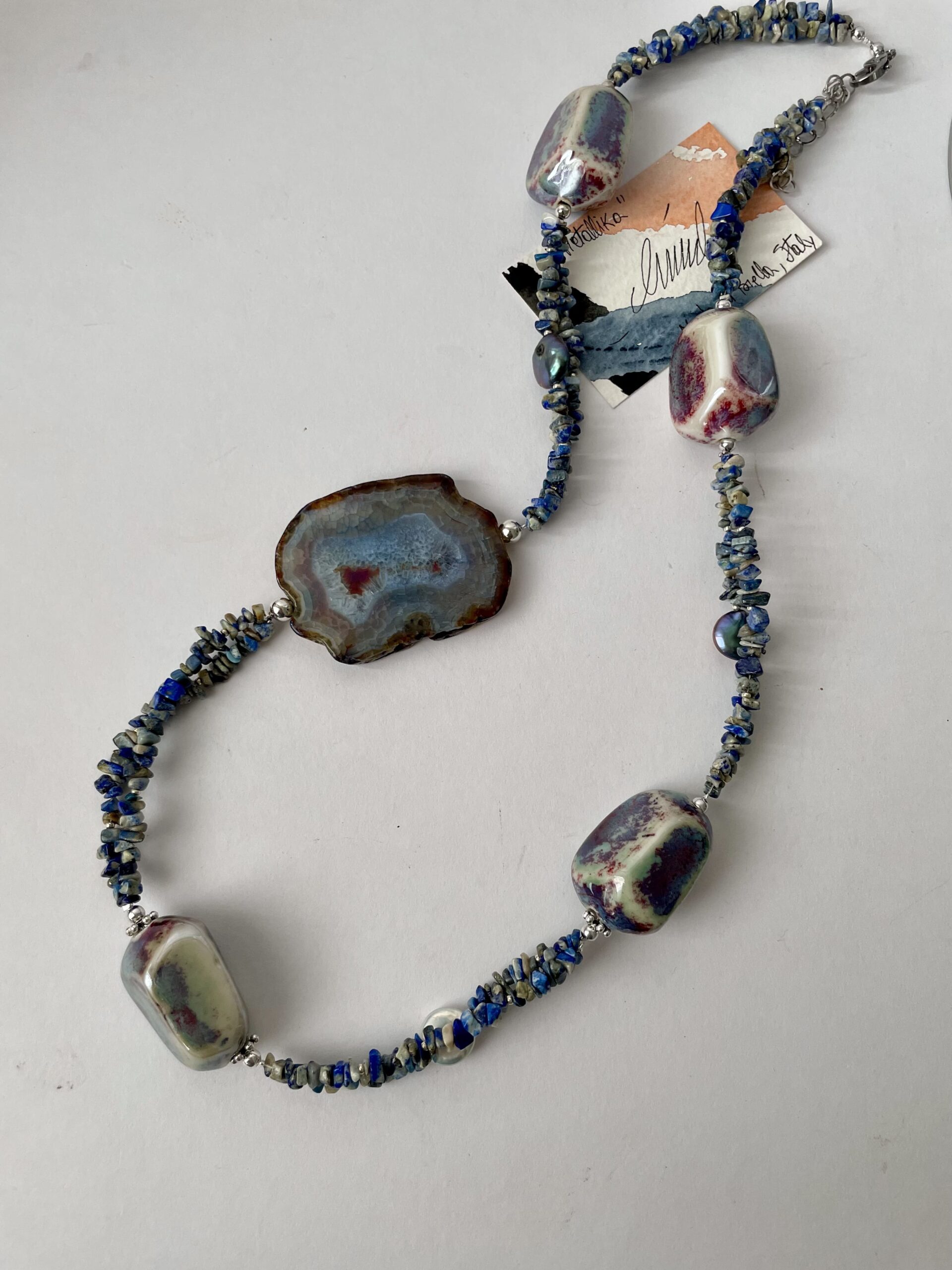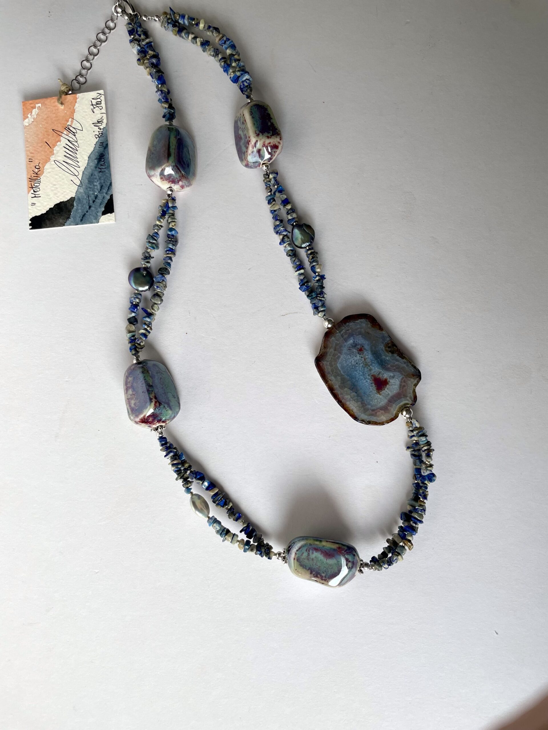 Metallika è composta da due fili di piccoli pezzi di lapis grezzo con perle a bottone grigie e bianche. Una grande agata tranche su un lato la caratterizza, insieme a quattro elementi in ceramica con lustri metallici.