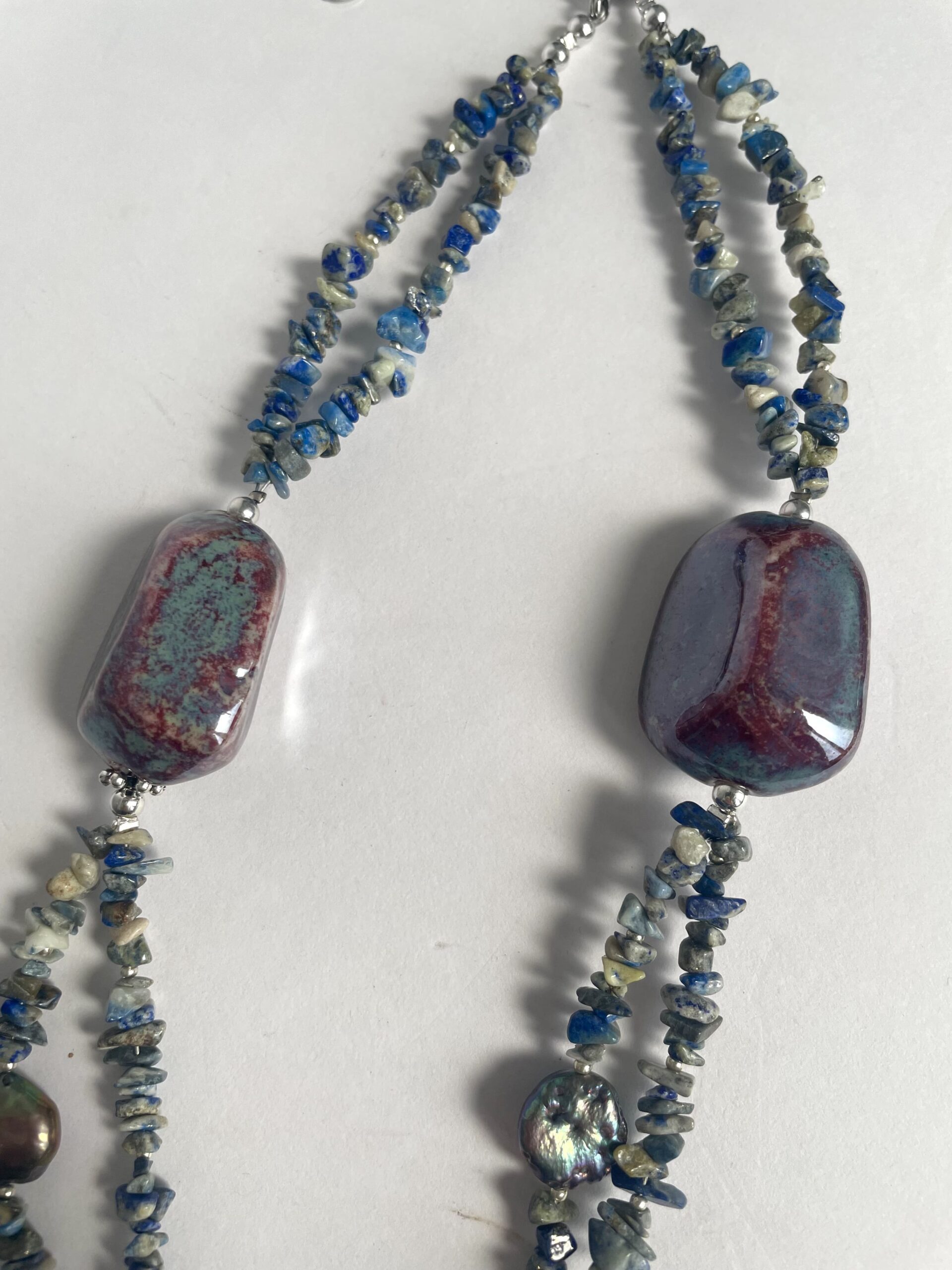 La pietra dura grande è sui toni dell’azzurro/violetto, e al suo interno ci sono suggestive sfumature di colore, come si vede dalle foto. Anche le parti in ceramica riprendono le stesse tonalità che vanno dagli azzurri ai violetti bordeaux.
