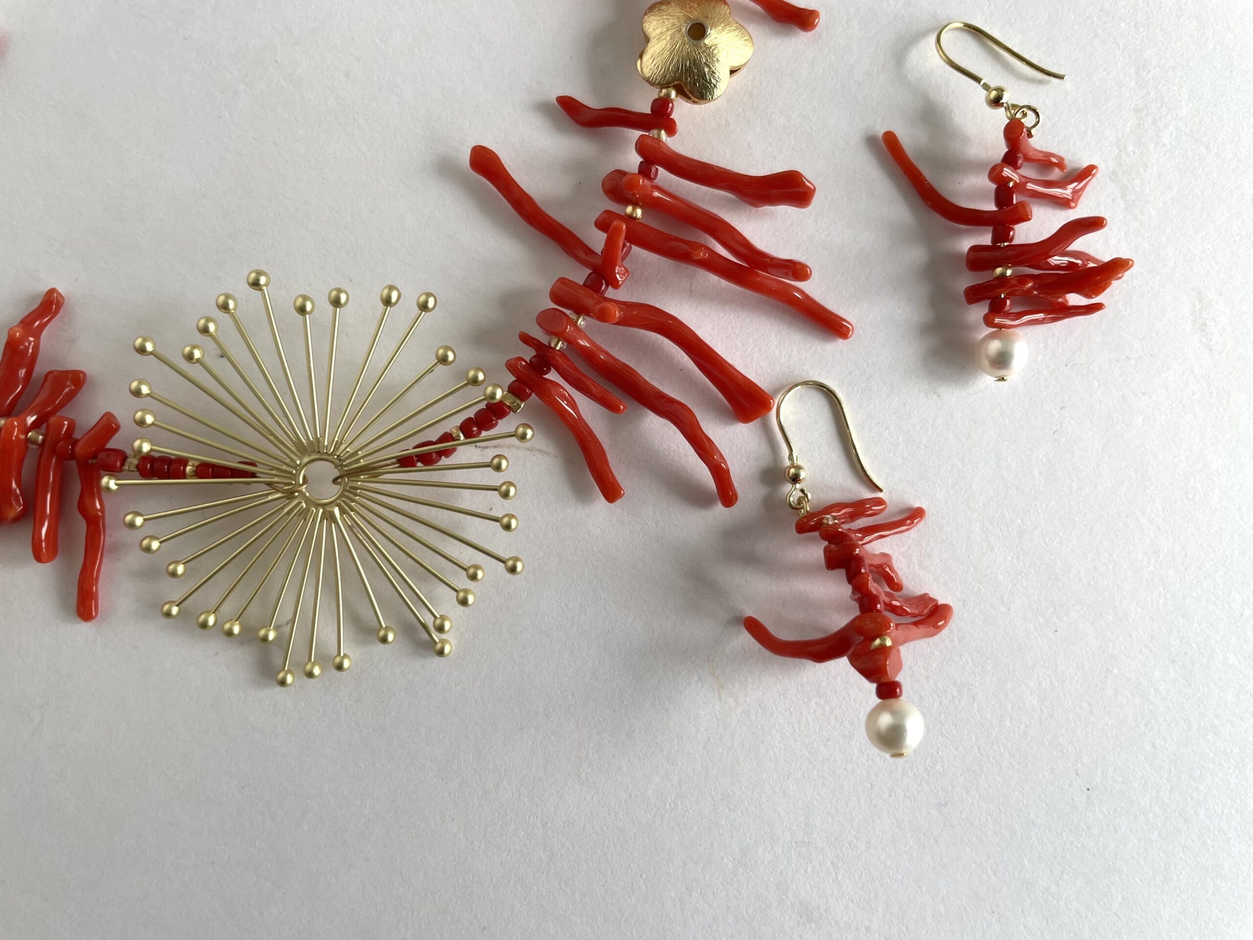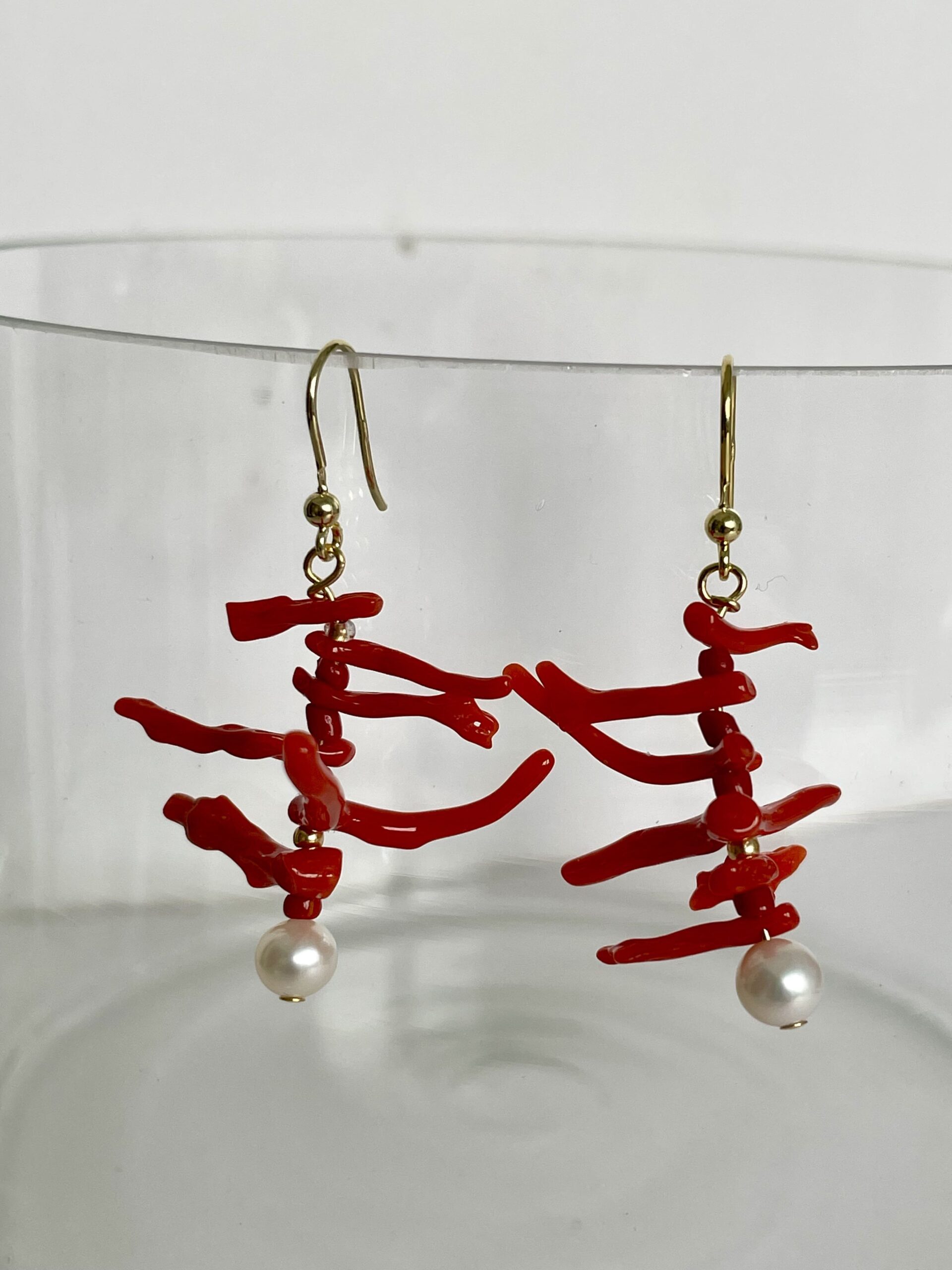 Sono realizzati in corallo rosso del Mediterraneo e perle bianche tonde. I ganci a monachella sono in argento 925 dorato. Misurano 3 centimetri di lunghezza più il gancio in argento.