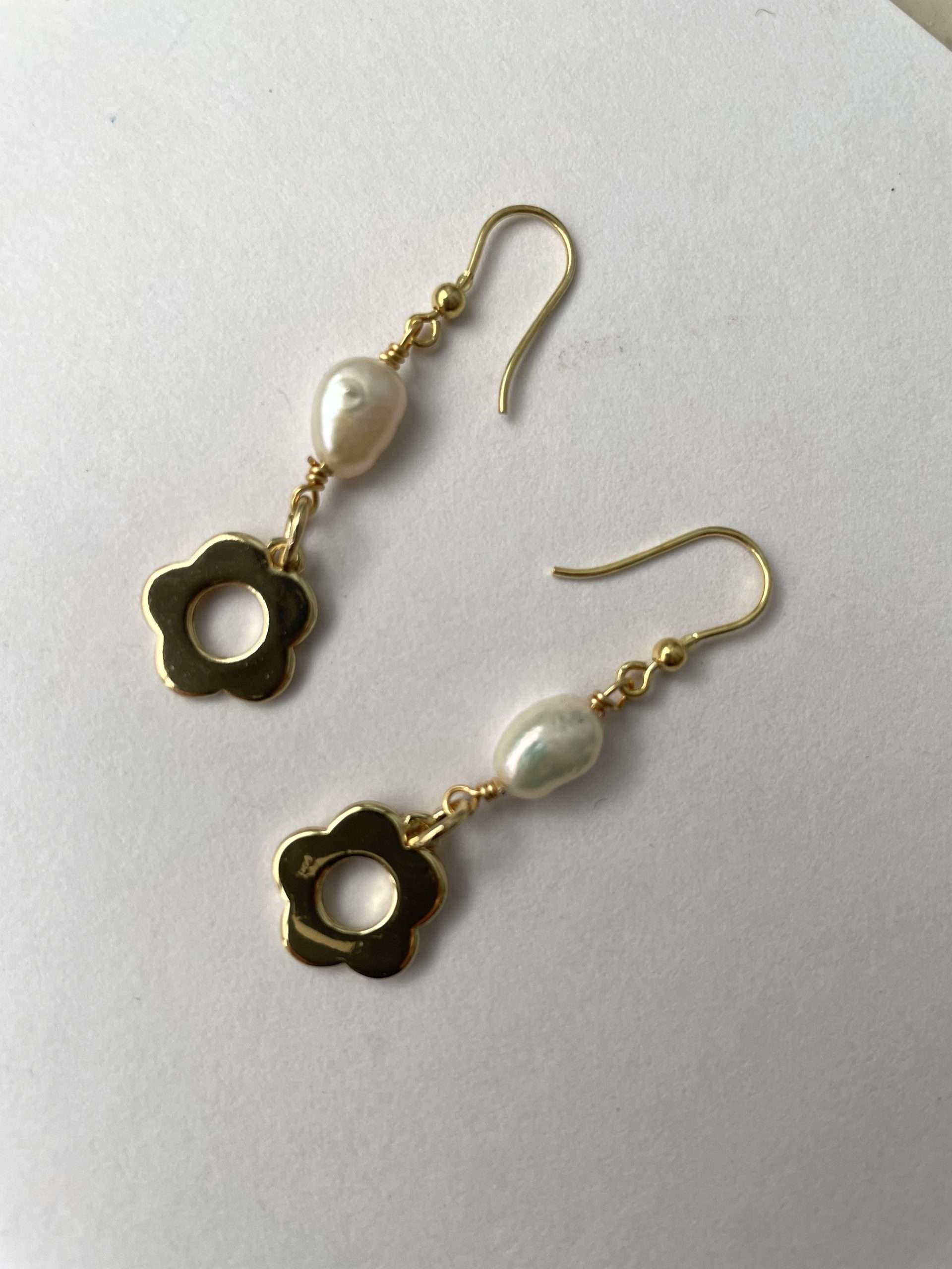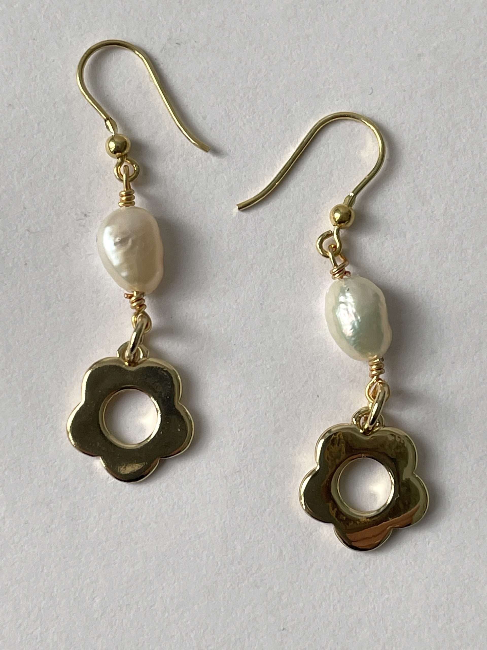 Perle di fiume bianche e fiore in metallo placcato oro 18K senza nichel per un orecchino assolutamente versatile. La forma delle perle dalla luce morbida è leggermente a goccia. Il fiore dorato rende romantico ed aggraziato questo semplice gioiello, che si abbina veramente a tutto.