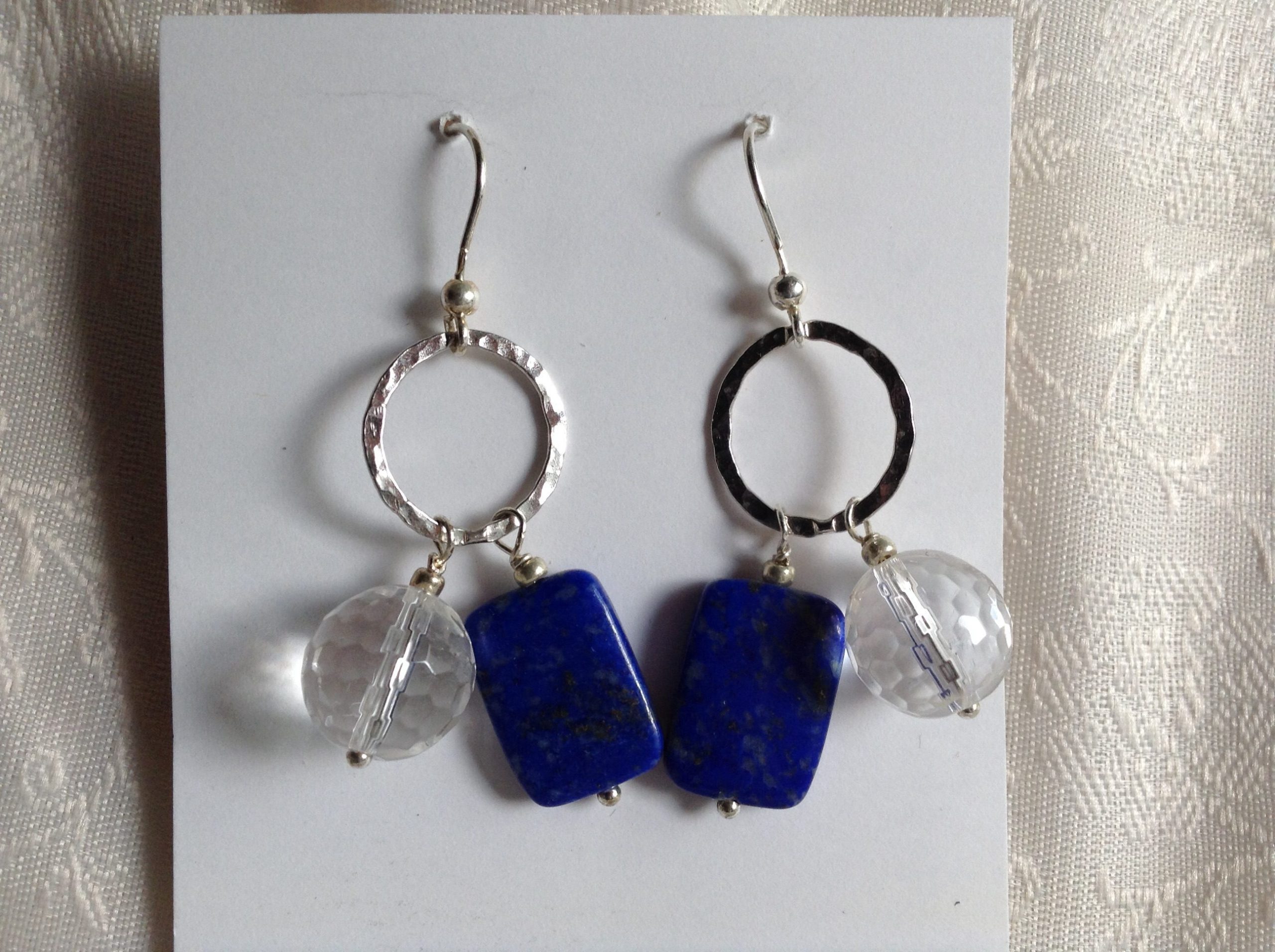 Cristallo di rocca sfaccettato e lapislazzuli per orecchini luminosi e briosi.