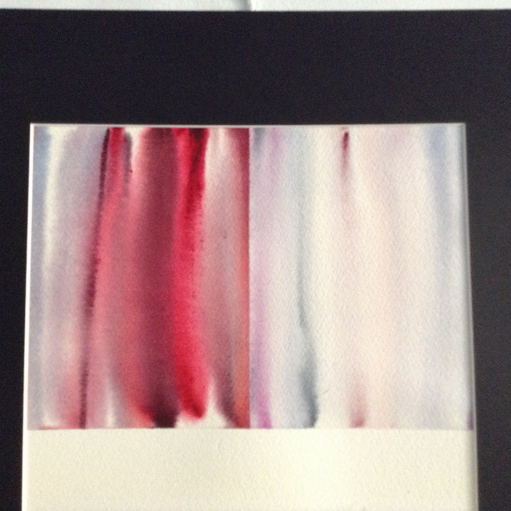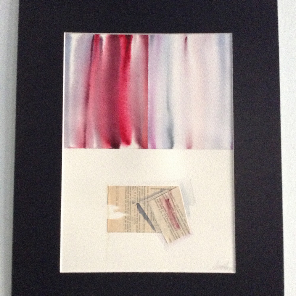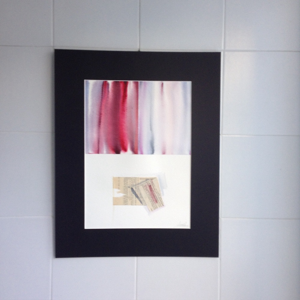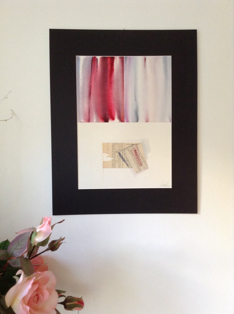 Acquerello e tecnica mista su carta, è il naturale complemento di “CON FERMEZZA”. I rossi sono qui leggermente più cupi e smorzati, molte le riflessioni con delicate sfumature. Nella parte inferiore del dipinto l’artista ha composto con cura, come fa spesso, il frammento di una vecchia tabella, ripiegandola e colorandola sottilmente, creando appunto una pausa d’attesa. Formato acquerello cm 25 x 35, finito con il passepartout in laminil nero cm 39 x 49. Euro 380,00.